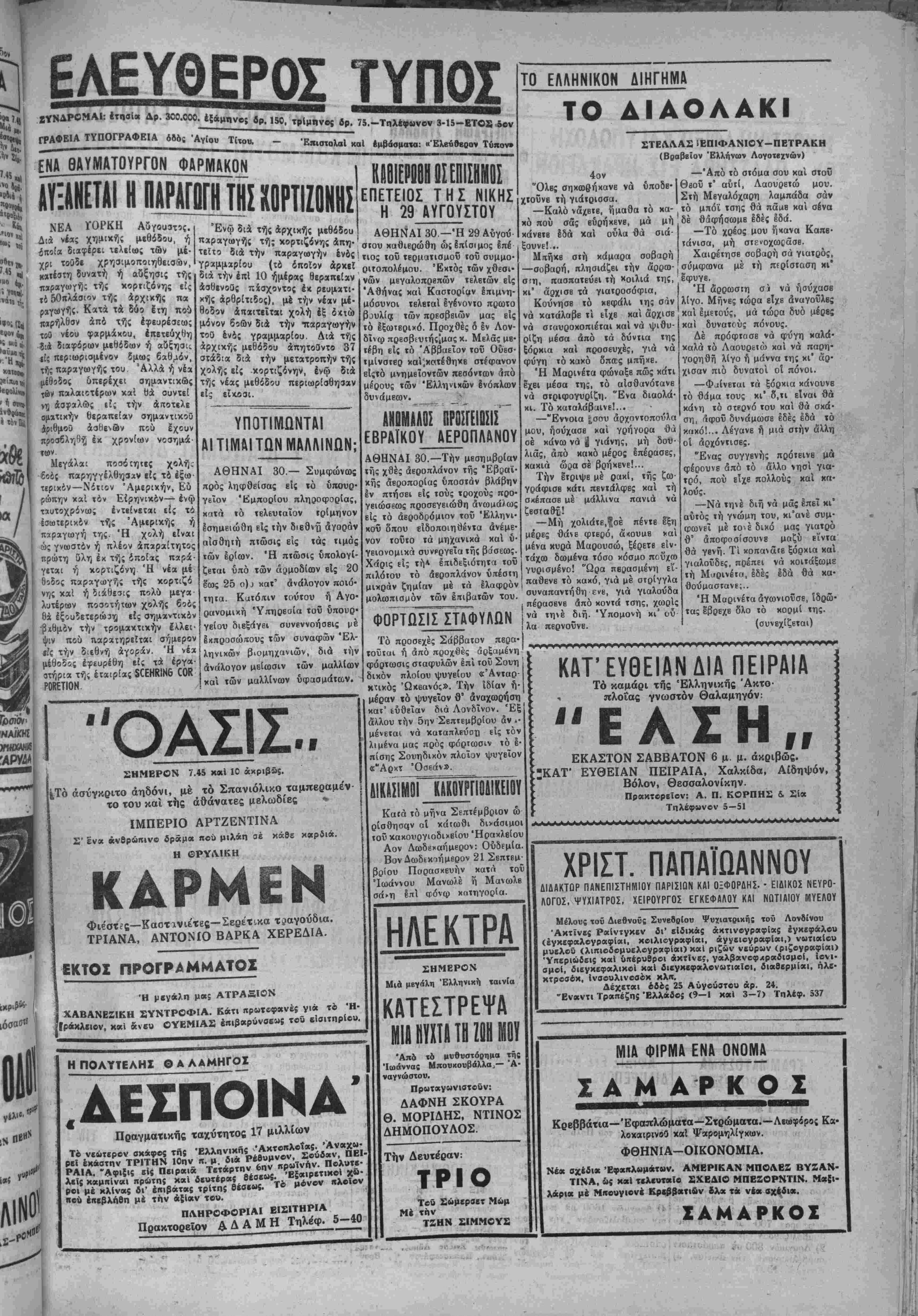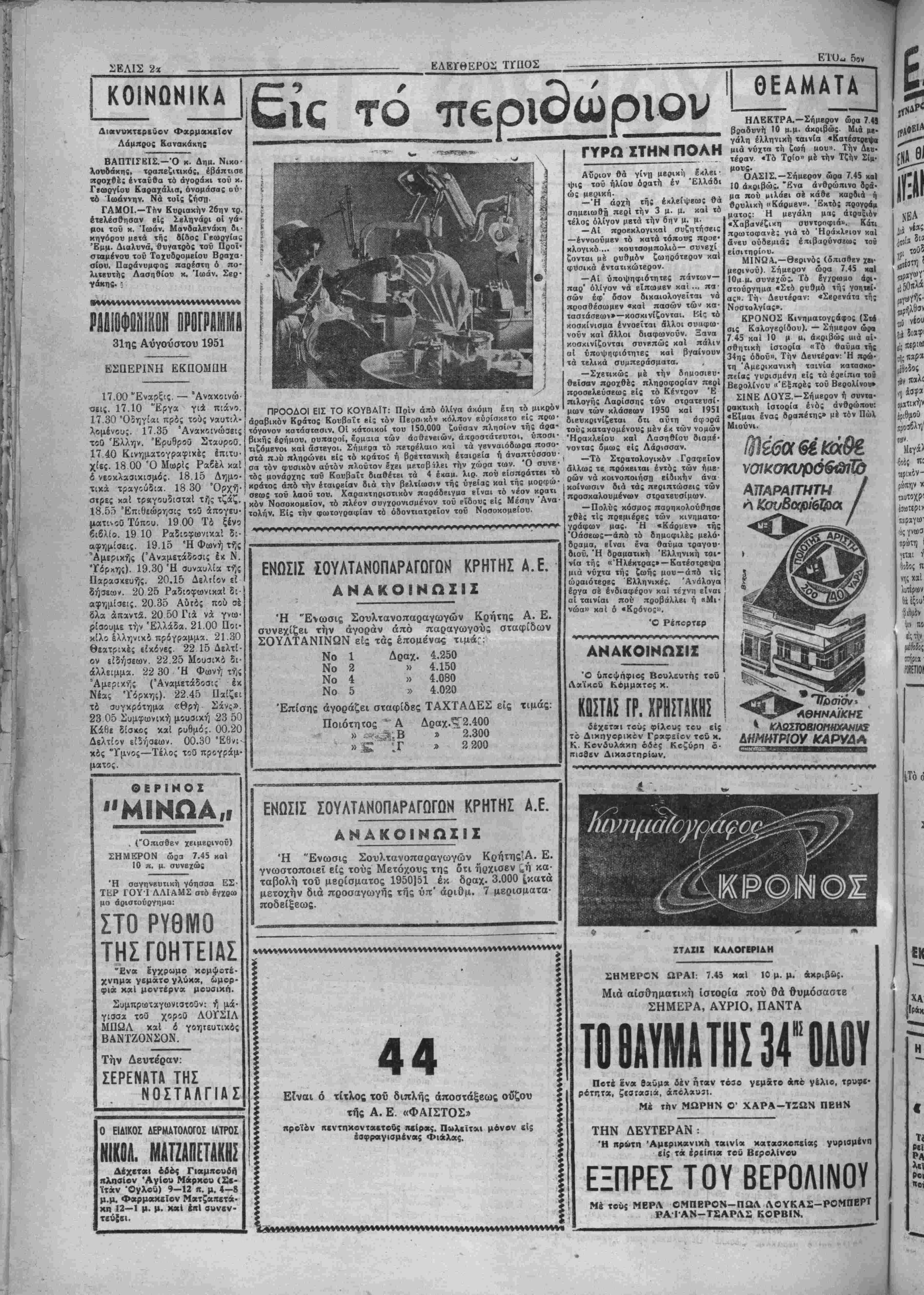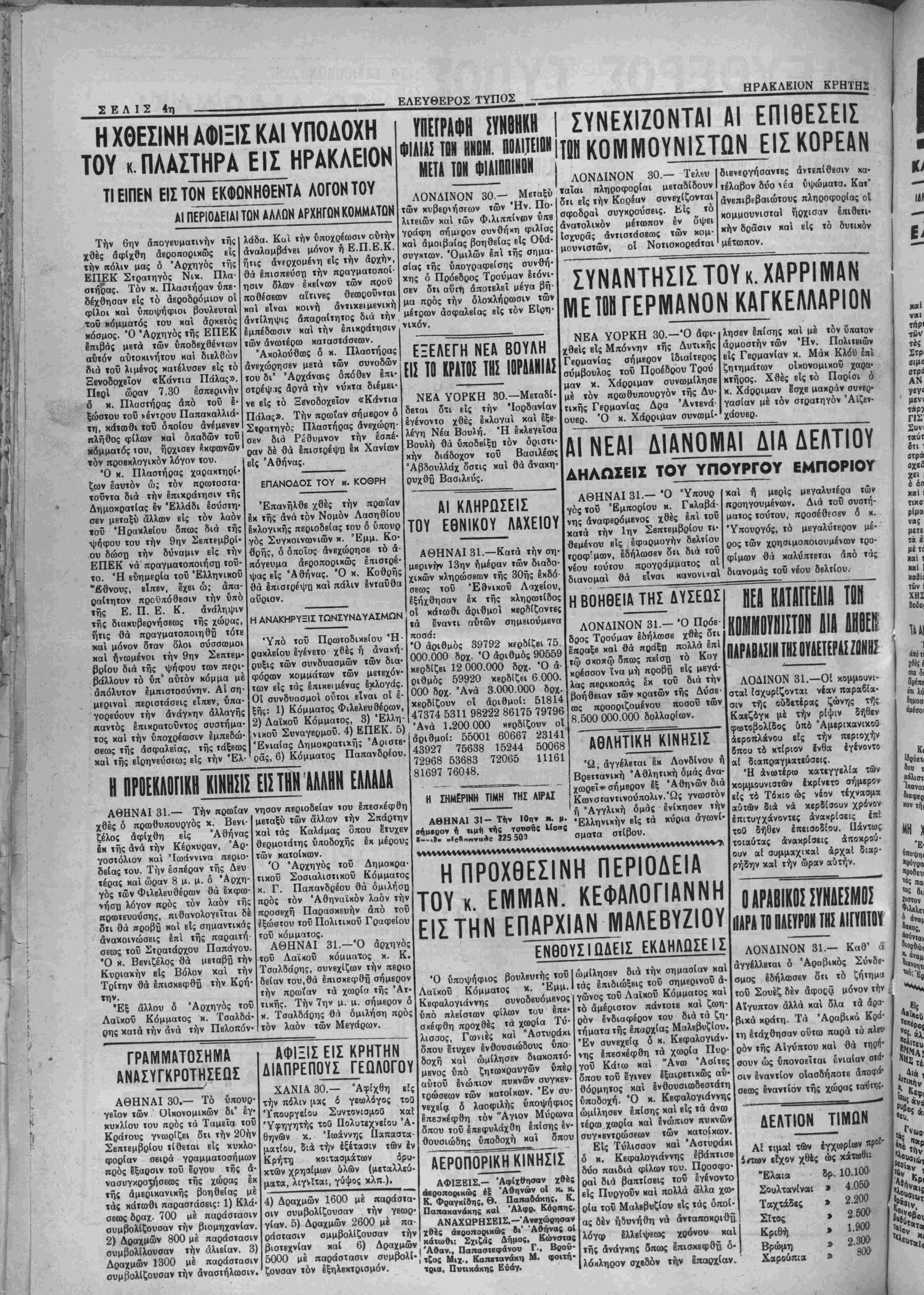 τροφ'μων, Ιδήλωσβν δ<ι διά τοϋ νέου τούτου προγρίμματος αί διανομαί θά είναι κανονιχαί χαί ή μερίς μεγαλυΐέρα των προηγούμενον. Διά τοΰ συστή- ματος τούτου, προσέθεσβν δ κ. 'Υπουργός, τό μεγαλύτερον μέ· ρος των χρησιμοποιουμένων τρο- φίμων θά χαλύπτεται άπό τάς διανομάς τοΰ νέου δελτίου. Η ΒΟΗΘΕΙΑ ΤΗΣ ΑΥΣΕΟ.Σ ΛΟΝΔΙΝΟΝ 31.— Ό Πρόε- δρος Τρούμαν εδήλωσε χθές δτι έπραξε καί θά πράξη πολλά επί τφ σκοΛόρ δπως πείση τό Κογ κρέσσον ίνα μή προβή είς μεγά¬ λας πβρικοπάς Ικ τοΰ διά την βοήθειαν των κρατών τής Δύσε ως προοριζομένου ποσοΰ των 8.500 ΟΟΟ.ΟΟΟ δολλαρΐων. ΑΘΗΝΑΙ 31- Την ΙΟην κ. μ. οήμβοον ή ιιμή τής τσ«στις Κοος Ι—.». .ι,:»οΒτ«Αε 225 509 ΑΘΛΗΤΙΚΗ ΚΙΝΗΣΙΣ 'Ω, αγγέλεται έκ Λονδίνου ί Βρεττανιχή 'Αθλητική ομάς άνα χωρεΐ· σήμερον εξ Αθηνών διά Κωνσ'αντινούπολιν.Ώς γνωστόν ή Αγγλικη ομάς ενίκησεν την Ελληνικήν είς τα κύρια άγωνί σματα στίβου. Η ΠΡΟΧΘΕΣΙΝΗ ΠΕΡΙΟΔΕΙΑ ΤΟΥ κ. ΕΝΙΜΑΝ. ΚΕΦΑΛΟΓΙΑΝΝΗ ΕΙΣΤΗΝ ΕΠΑΡΧΙΑΝ ΜΑΛΕΒΥΖΙΟΥ ΕΝΘΟΥΣΙΠΑΕΙΣ ΕΚΔΗΛΩΣΕΙΣ Ό ΰποψήφΐος βουλευτής τοΰ Ι ωμίλησεν διά την σημασίαν καί Λαϊκοΰ Κόμματός χ. Έμμ. Ι τάς εκιδιώξεις τοΰ σημερινον ά Κεφαλογιάννης συνοδευόμενος υπό πλείστων φΐλων τού σκεφθή προχθες τα χωρία επε- Τύ· λισαος, Γωνιές καί Άστυράκι δπου εΐυχεν Ινθουσιώδους υπο· δοχή καί ωμίλησεν διακοπτό- μενος υπό ζητωκραυγών υπέρ αΰτοΰ ενώπιον πυκνδν συγκεν- τρώσεων των κατοίκων. Έν ου- δ λαοφιλής ΰποψηφιος χ* φή επεσκέφθη τόν "Αγιον Μύρωνα δπου τοΰ επεφυλάχθη Ιπίσης έν- θουσιώδης ύποδοχή καί δπου ΑΦΙΞΕΙΣ.— Αφίχθησαν χθές άεροποοικώΐ έ£ Αθηνών οί κ, ν. Κ. Φραγκίδης, θ. Παπαδάκης, Κ. Παπακανάκης καί Άλφρ. Κόρπης. ΑΝΑΧΩΡΗΣΕ1Σ.-Άνβχώβτισαν χθές σβροπορικώς δι' Αθήνας οί «άτωθι: Σχιζάς Δήμος, Κώνοτας Αθαν., Παπαστεφανου Γ., Βροΰ- τζος Μιχ., Καπβτανάκτ) Μ. φοιτή- το>α, Πυτικάκης Εύαγ.