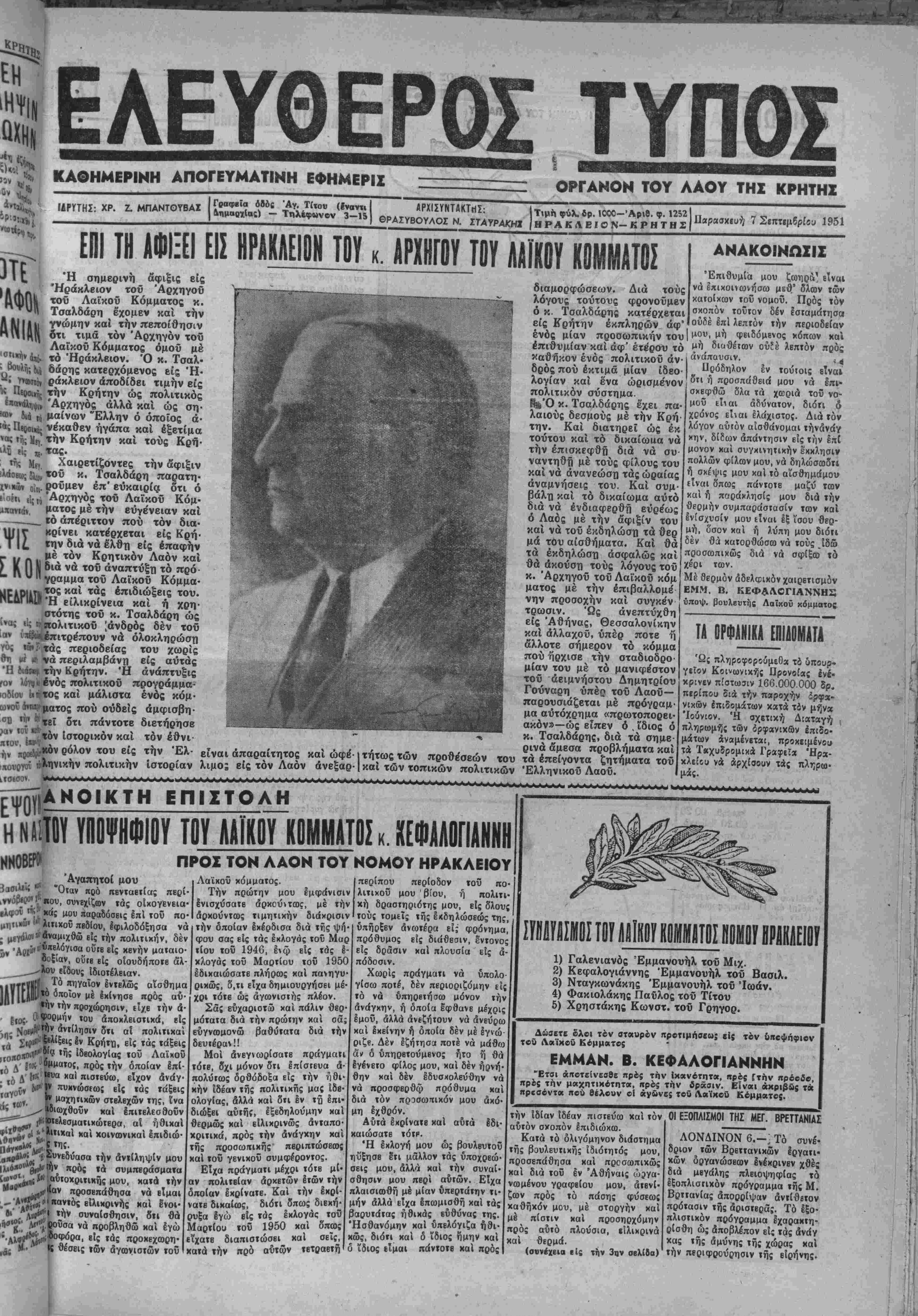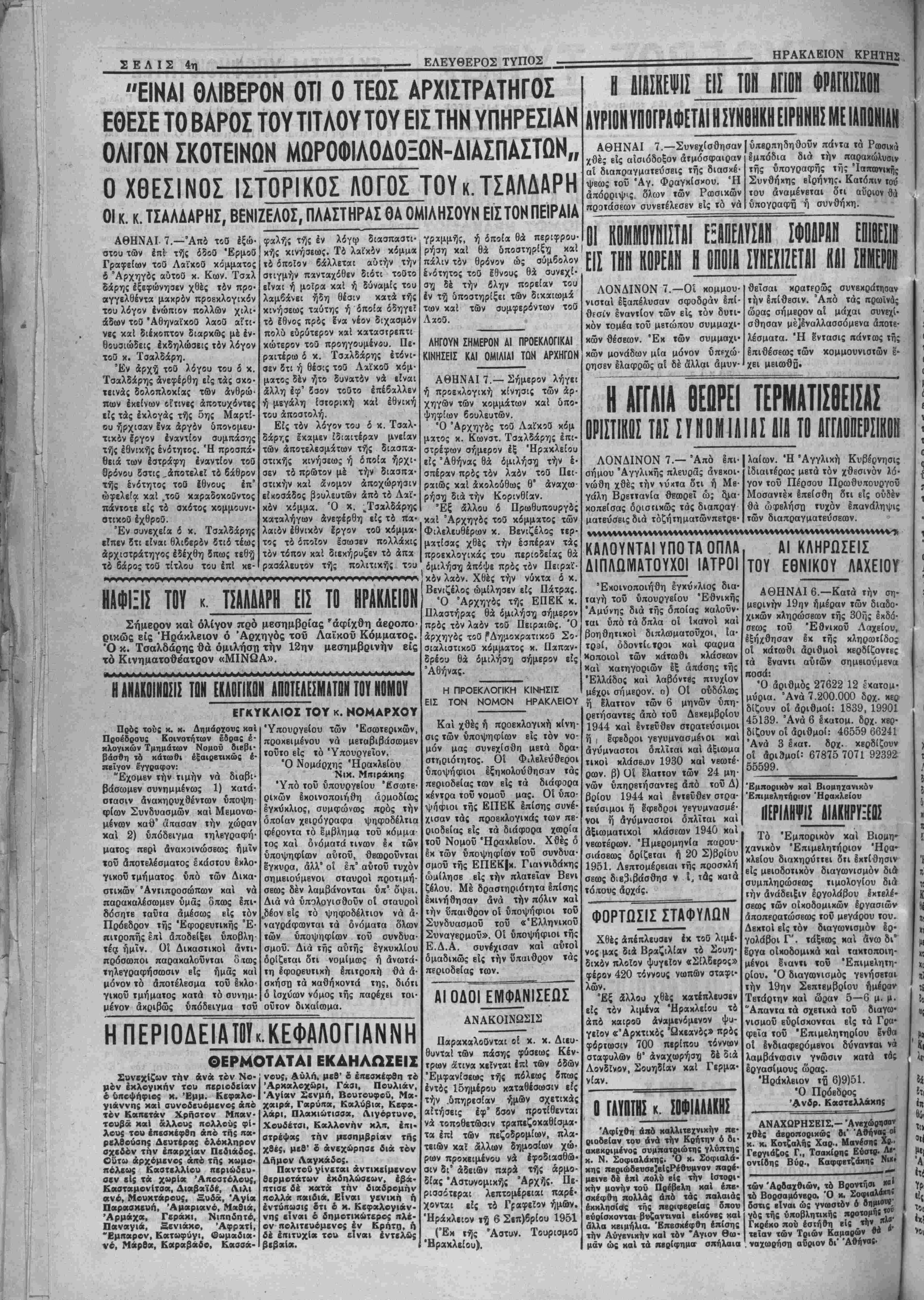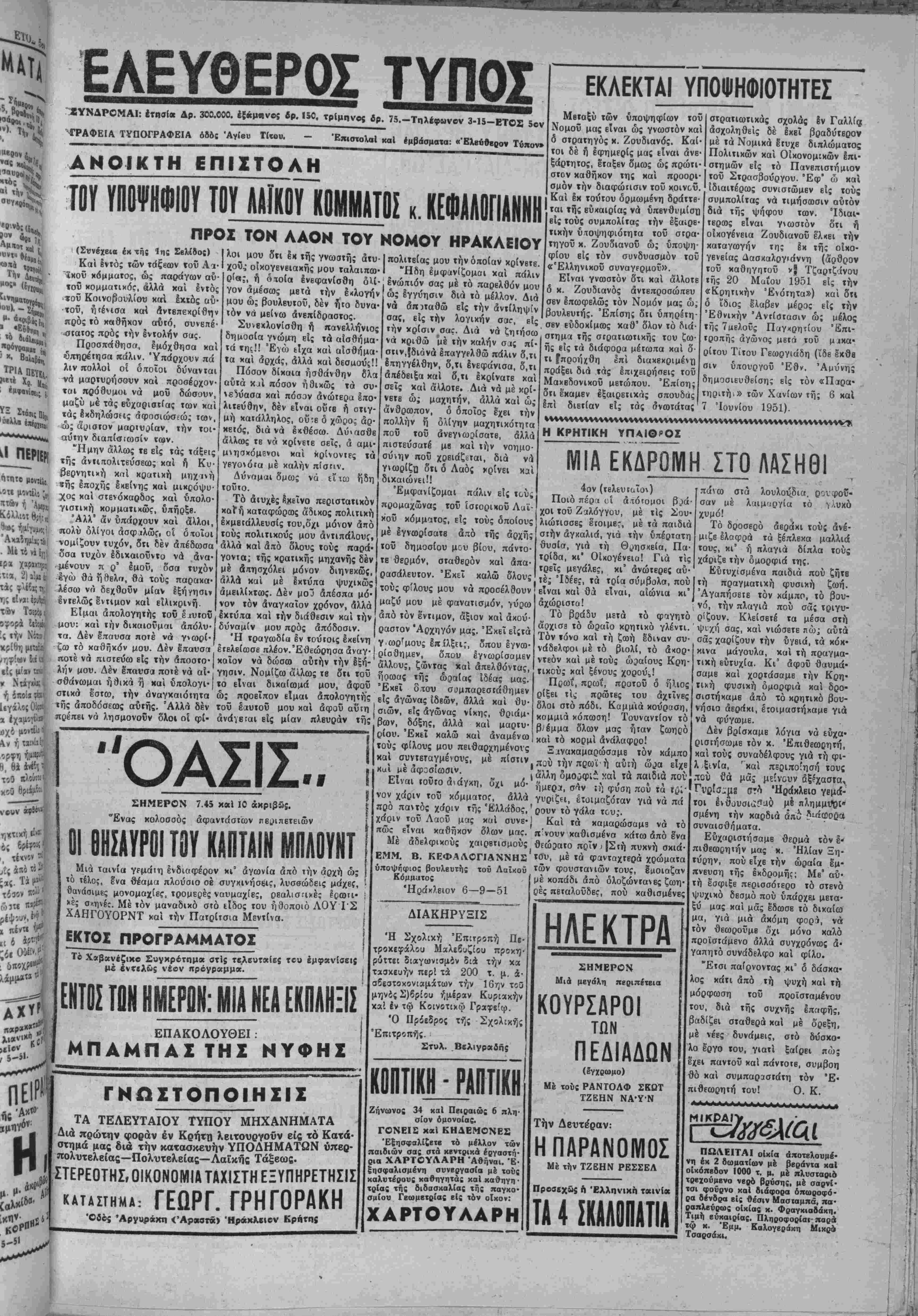 ^η. Νοί^ϊ 1<»ν δτι αί πολιτικαί τα Σ«ί^!?λίξε.ι' ^ν Κρήΐϊΐ, είς τάς τάξεις θΐΐ!"*!·* ιίΪ5 ΙδΒθλογΙας ιοΰ Λαΐχοΰ τοί. πρός την οποίαν επί Κα1 ιιστβύω, είχον δνάγ πυιινώσΕως είς τάς τάξβις στελεχών της, ίνα ^χ καί έπιτελεσβοΰν ΐϋ'Ρ'βλβσματικώτερα, αί ήθικαί ϊ.'^ΙιΧαί «αί κοινωνικαί επιδιώ- την αντίληψίν μου συμπεράσματα κατά την νά εΐμαι χαί ένοι· συναίσθησιν, 8τι θά νά προβληθώ χαι έγώ . είς τάς προχεχωρη· Ις θέσεις των άγωνισιών ιοΰ Λαϊκοΰ κόμματος. Την πρώτην μου εμφάνισιν ένισχύσαΐβ αρκούντως, μέ την αρκούντως τιμητικήν διάχρισιν την οποίαν έκέρδισα διά τής ψή φού σας εις τάς εκλογάς τοΰ Μα τίου ιοΰ 1946, έν ώ είς τάς ί κλογάς τοϋ Μαρτίου ιοΰ 195ι έδιχαιώσατε πλήρως χαί πανηγυ ρικώς, ο,τι είχα δημιουργήσει μέ χρι τότε ώς άγωνιστής πλέον. Σάς εύχαριοτώ χαί πάλιν θερ μότατα διά την πρώτην χαί σά εύγνοομονώ βαθύτατα διά την δευτέραν!! Μοί άνεγιωρίσατε πράγματ τόΐΒ, 5χι μόνον ότι επίστευα ά πολύιως δρθόδοξα εις την ήθι χήν Ιδέαν τής πολιτικάς μας ίδβ· ολογίας, άλλά χαί δτι έν τη επι· διώξει αύτίϊί, έξεδηλούμην χαί θερμώς χαί ειλικρινώς άνταπο ρ κριτικά, πρός την της προσωπικής' ανάγκην χαί ης ρής περιπτώσεως χαι τοϋ γενιχοΰ συμφέροντος. ΕΙχα πράγματι μέχρι τότβ μί¬ αν πολιτείαν άοκετών έτών την οποίαν εκρίνατε. Καί την εχρ(- νατε διχαίως, διότι όπως διεχή· Ιγώ βϊς τάς εκλογάς^ τοϋ 950 χαί όπως χ καΐ σεϊς, χατά την πρό αυτών ΐβτραβΐτ)1 ρξα γ ς Μαρτίου τοΰ 1950 ίΐχαΐΒ διαπιστώσβι ό υ περίπου περίοδον τοΰ πο· λιτικοϋ μου βίου, ή πολιτι· κή δραστηριότης μου, είς δλους τούς τομεΐς τής εκδηλώσεως της, υπήρξεν ανωτέρα εί; φρόνημα, πρόθυμος εις διάθεσιν, εντονος είς δρασιν χαί πλουσία είς α¬ πόδοσιν. Χωρίς πράγματι νά ΰπολο γίσω ποτέ, δέν περιοριζόμην εϊ; τό νά ύπηρβιήσω μόνον την ανάγκην, ή όποία εφθανε μέχρις Ιμοΰ, άλλά άνϊζήτουν νά άνεύρω χαί εκείνην ή όποία δέν μέ Ιγνώ ριζβ. Δέν έζήτησο ποτέ νά μάθω άν ό ύπηρβτούμΒνο; ήτο ή θά εγένετο φίλος μου, καί δέν ήρνή- θην χαί δέν έδυσχολεύθην νά νά προσφερθφ πρόθυμα χαί διά τόν προσωπικόν μου άκό· μη εχθρόν. Αύτά έχρίνατε χαί αύτά έδι· καιώσατε τογρ. Ή εχλογή μου ώ; βουλβυτοΰ ηύξησε έτι μάλλον τάς ύποχρεώ· σεις μου, άλλά χαί την συναί¬ σθησιν μου περί αυτών. ΕΙχα πλαισιωθή μέ μίαν υπερτάτην τι¬ μήν άλλά εϊχα επωμισθή καί τάς βαρυτάτας ηθικάς ευθύνας της. Ησθανόμην καί ύπελόγιζα ήθι· ώς, διότι καί δ ΐδιος ήμην καί ΐδιος είμαι πάντοτβ χαί πρός 1) Γαλενιανός Εμμανουήλ τοϋ Μιχ. 2) Κεφαλογιάννης Εμμανουήλ τοΰ Βασιλ. 3) Νταγκωνάκης Εμμανουήλ τοΰ Ιωάν. 4) Φακιολάκης Παΰλος τοΰ Τίτου 5) Χρηστάκης Κωνστ, τοΰ Γρηγορ. Δώσβτε δλοι τόν σταύρον προτιμήσβω; εί; τόν ΰηοφήςριον τβΰ Λαϊκοΰ Κομματβ; ΕΜΜΑΝ. Β. ΚΕΦΑΛΟΠΑΝΝΗΝ "Ετσι άποτείνεσθί πρός την Ικανότητα, κρός Γτήν προοίβ, πρ&ς την μαχητικότητα, κρός την δράσιν. Είναι ακριβώς τα ηρςσόντκ κου θέλουν ο! άγώνες τού ΛαΐχοΟ Κέμματο;. την Ιδίαν Ιδέαν πιστεύω καί τόν αυτόν σκοπόν έπιδιώχω. Κατά τό δλιγόμηνον διάστημα τής βουλευτικής ιδιότητος μου, προσεπάθησα χαί προσωπικώς χαί διά τοϋ έν Αθήναις ώργα- έ ί νωμένου γραφείου μου, άτενί ζων πρός τό πάσης φύσεως καθήκον μου, μέ στοργήν χαί μέ πίστιν καί προσηρχόμην πρός αύτό πλούσια, είλιχρινά καί θερμά. (συνέχεια είς την 3ην σβλίΒα) ΟΙ ΕΞΟΠΛΙΣΜΟΙ ΤΗΣ ΜΕΓ. ΒΡΕΤΤΑΝΙΑΣ ΛΟΝΔΙΝΟΝ 6.-^Τό συνέ- δριον των Βρεττανικών εργατι¬ κήν δργανώσΒων ενέκρινεν χθές διά μεγάλης πλειοψηφίας τό έξοπλιστικόν πρόγραμμα της Μ. ΒρττανΕας άπορρίψαν άντίθβτον πρότασιν τής άριστερας. Τό έξο- πλιστιχό