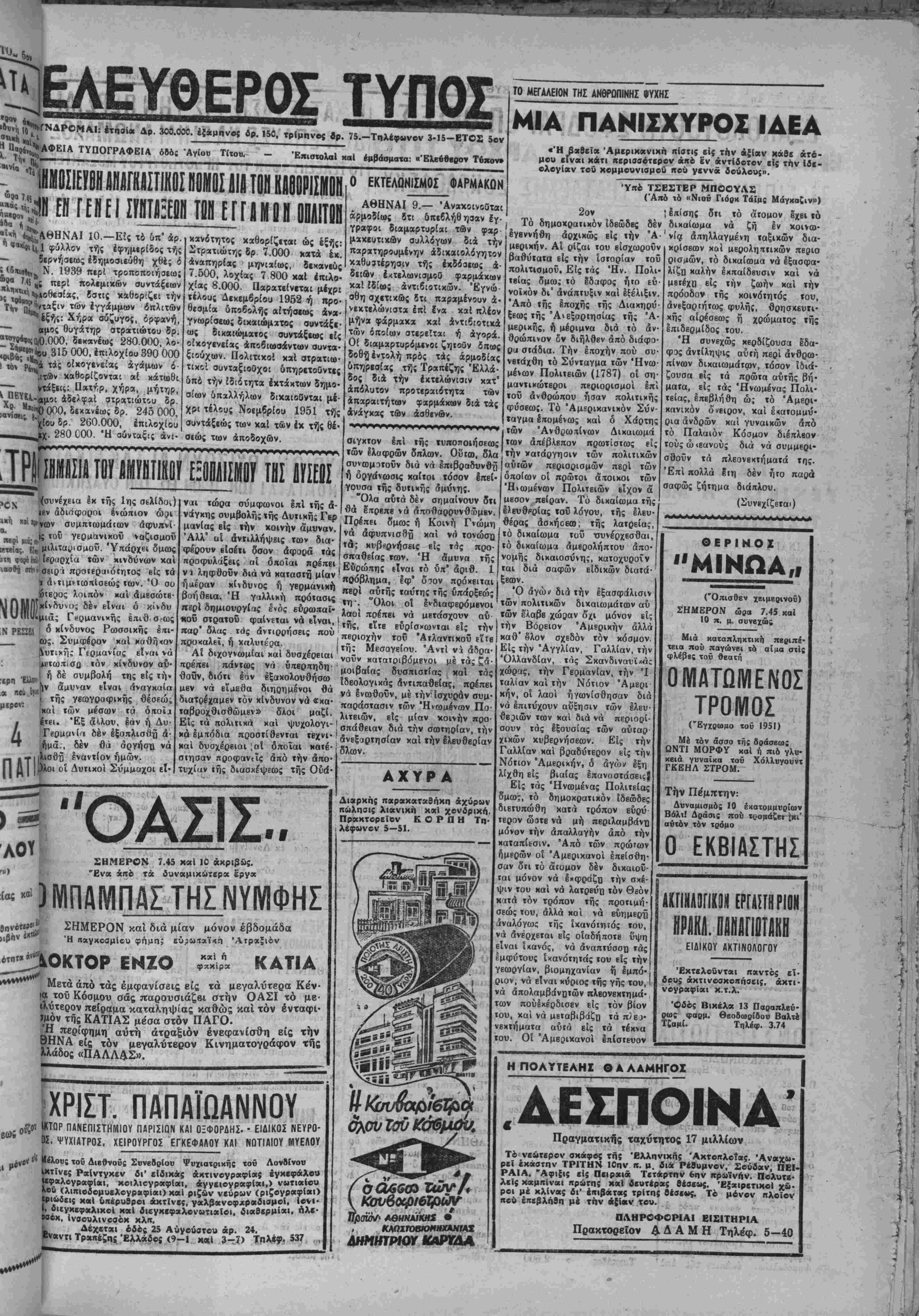 τα την 9ην Σβπτβμβρίου έ σχηματισμές Ισχυράς και βιωσίμου κυ< βερνήσβως. "Ηρχισε νά διαφαίνκται ηδη τό κακόν αΰτό καΐ αύ¬ την την φοράν άαφαλώς κουραστικόν) διά τόν λαόν καί αποκαρ¬ διωτικόν καί καταστρεπτικόν διά τόν τόπον έπακολούβημα. Άλλ' άς ελπίσωμεν δτι τα πράγματα θά έξβλιχβοϋν ομαλώς διά νά μή δεινοπαθήση πάλιν η χώρα. Είναι πολΰ μά την αλήθειαν νά δϊΐνοπαθό έπ' άπειρον διότι τής τό επιβάλλει σήμερον ή μί« κ«1 αυριον ή άλλπ κολιτική κατάστασις. ΕΠΑΙΝΟΣ Δέν είναι ωρισμέναι; άσκοπος ή άπονομή ενός έπαίνου— δικαίου άλλως τβ—πρός τάς αρμοδίας αρ¬ χάς καί τα δργανα τού νόμον διά την παρατηρηθεϊσαν κατά τάς Ι τή! & προχθεσινάς εκλογάς απόλυτον »ι τάξιν καί ησυχίαν. Πρός τούς έκλο· '~ έπεδείχθη πνεϋμα βιευκολύν- Α61 ιών Ν σεως(χαΙ έτηρήθη καΐ είς τα έκλο- γικά τμήματα καί αλλαχού άγαθή χρόθβο.^ χαΐ ομαλότης ϊηλευτή. Έπεισόβια βέν εσημειώθησαν πλήν ενός ασημάντου καί γενικώς δλα όλοχληρώθησαν χβρίς οιανδήποτε ανησυχίαν καί χωρΐς βιαταραχήν καί χαθυστέρησιν. ΦΑΡΣΕΡ! Συνεπεία, των έκλογικών άποτε· λβσμάτων ωρισμέναι «φαρσέρ» χρη¬ σιμοποιών τό τηλέφωνον διά νά με ταβώσουν ουγχαρητήρια ή συλλυ- πητήρια κατά την περίστασιν.Πάν¬ τως καλόν είναι οί «πνβυματώβεις» αύτοΐ φαρσέρ νά μή γίνωνται καί άνόητοι τηλβφωνοϋντες πράγματα κουτά είς άνθρώπους ποϋ ουδεμί¬ αν σχέσιν 6χοι>ν οΰιβ δύνανται νά