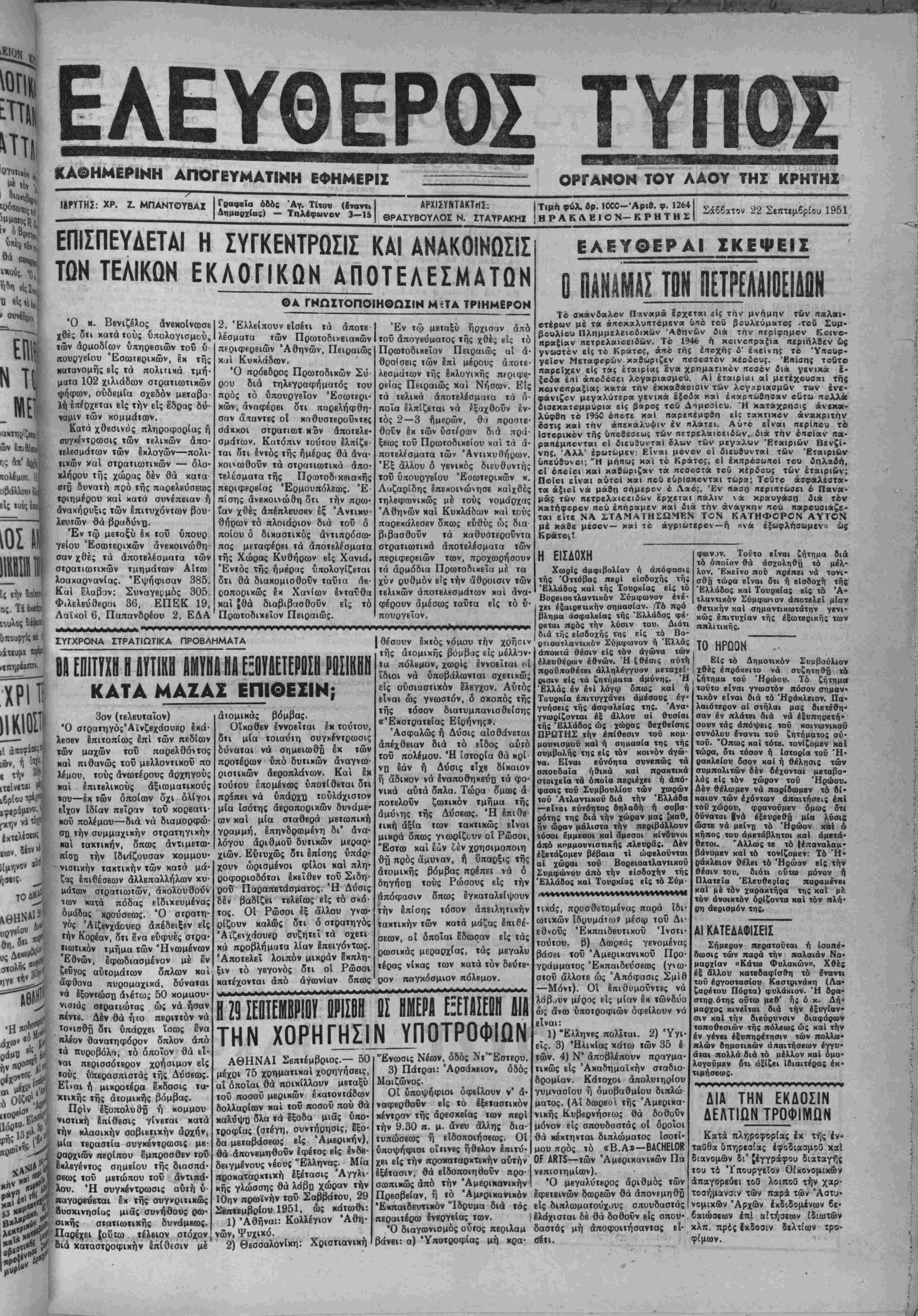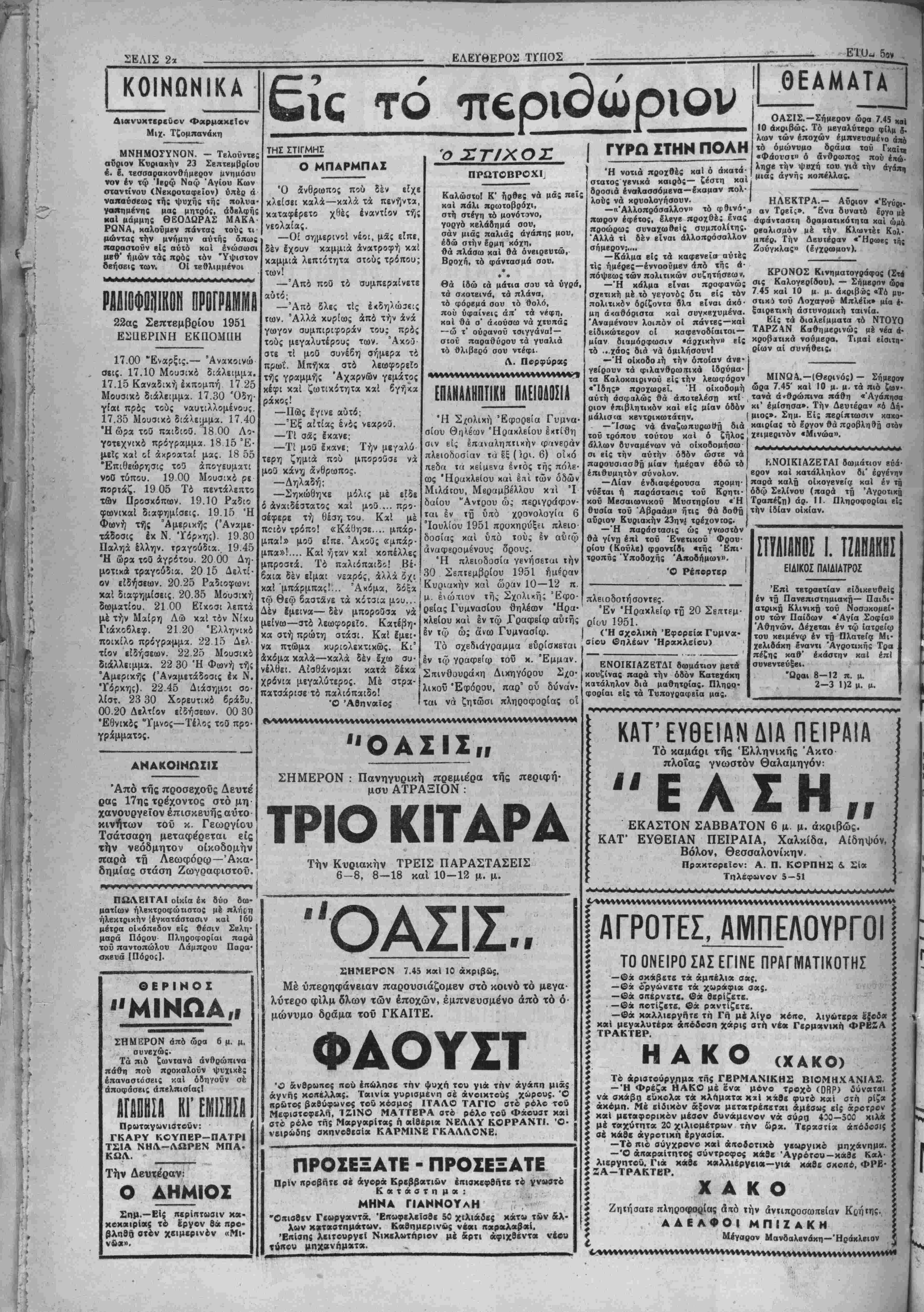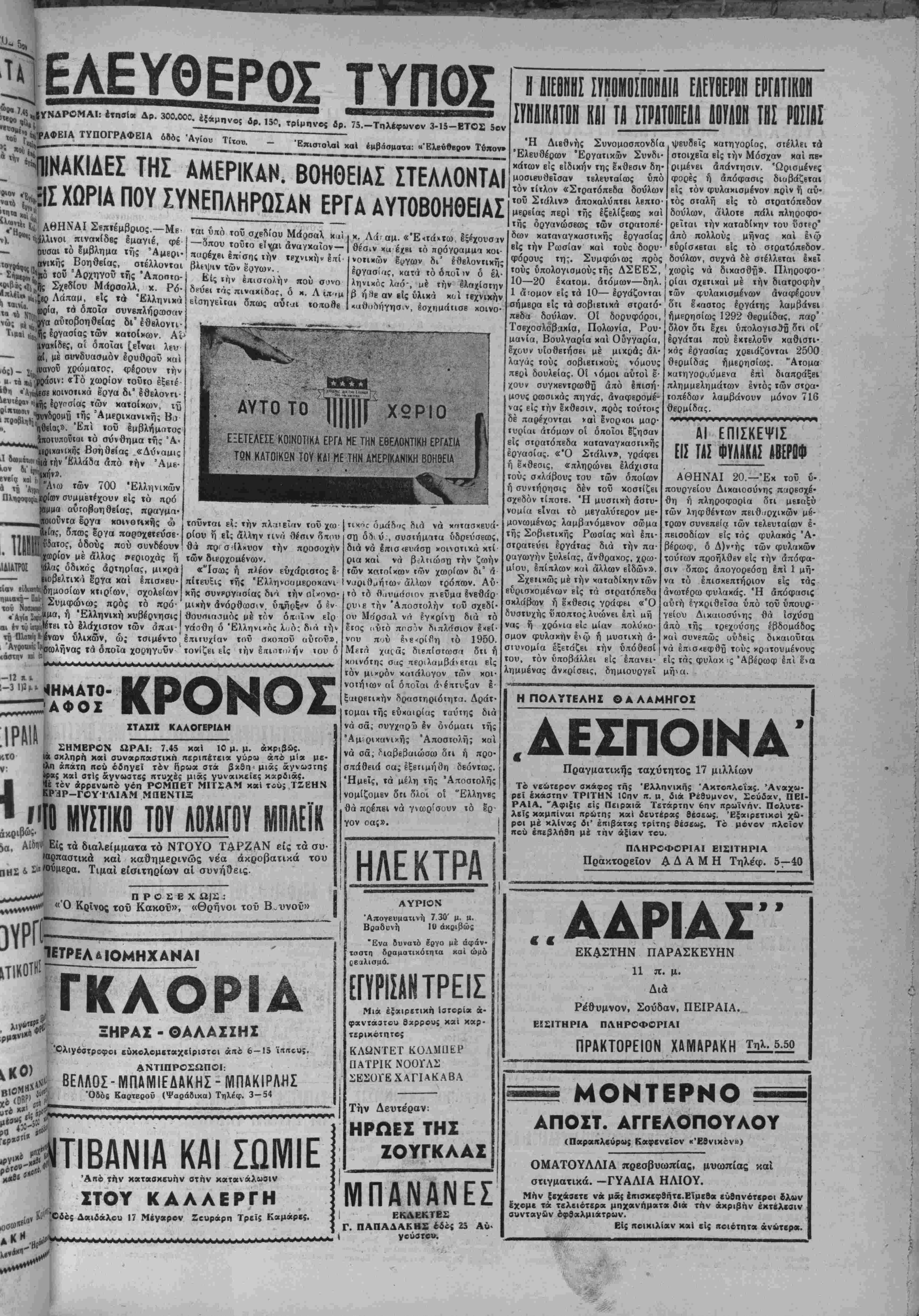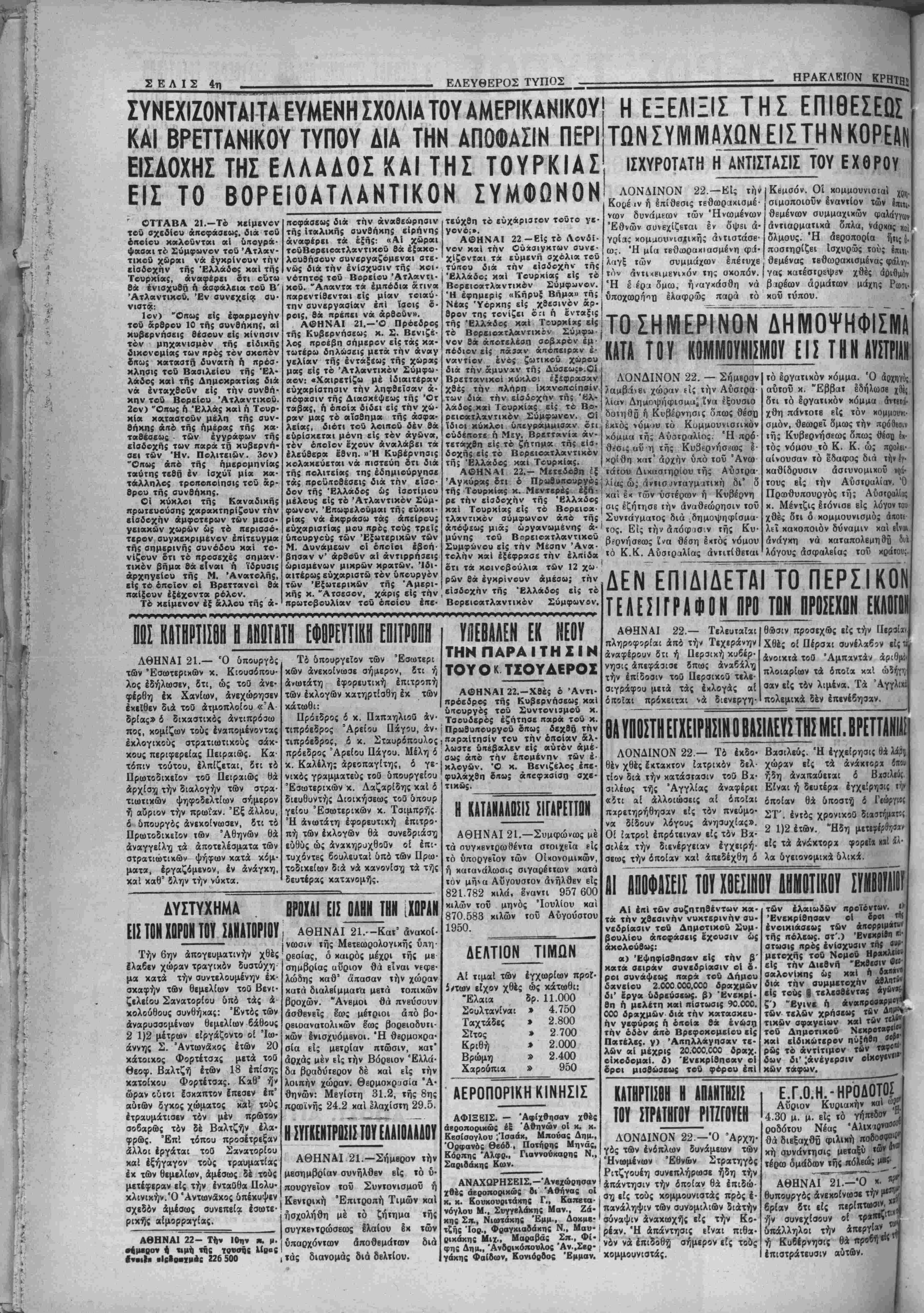 ·<μ·0ον τί τιμή τάς τονσής Ιν.ιΙι «ΙςΙοειχΜΑς 126 500 ήσχοληθη μέ τό ζητημα της συγκβγτρώσεως ελαίου έκ των υπαρχ6ντων δποθβμάτων διά ι τας διανομας δια δελτίον. Η ΚΑΤΑΝΑΛΩΣΙΣ ΣΙΓΑΡΕΤΤΟΝ ΑΘΗΝΑΙ 21.—Συμφώνως μέ τα ουγχβντρωίίέντα στοιχεΐα είς τό ύποργβΐον των Οικονομικήν, ή κατανάλωσις σιγαρέττων κατά τόν μή*α Α5νουστον ανήλθεν είς 821.782 χιλά. έναντι 957 600 κιλών τοΰ μηνός Ιουλίου καί 870.583 κιλών τοΰ Αύγούστου 1950. ΔΕΛΤΙΟΝ ΤΙΜΩΝ Αί τιμαί των εγχωρίων προΓ· ί«ων είχον χθές ώς κάτωθι: "Ελαια δρ. 11.000 Σουλτανίναι Ταχτάδες Σϊτος Κριθή Βρώμη Χαρούπια 4.750 2.800 2700 2.000 2.400 950 ΑΕΡ0Π0Ρ1ΚΗ ΚΙΝΗΣΙΣ ΑΦΙΞΕΙΣ. - Ά«|ΐ(χ«ησαν χθές άβροπορικώς έξ Αθηνών οί κ. χ. Κβσίσογλου ;Ίσαάκ, Μπούας Δημ., Όρφανός θεόβ , Ποτήρης Μηνάς, Κόρπης Άλφρ., Γιαννοΰκαρης Ν., Σαριδάκης Κων. ΔΕΝ ΕΠΙΔ1ΔΕΤΑΙ ΤΟ ΠΕΡΣΙΚΟΝ) ΤΕΛΕΣΙΓΡΑΦΟΝ ΠΡΟ ΤΟΗ ΠΡΟΣΕΧΟΝ ΕΚΑ0Π1 ΑΘΗΝΑΙ 22.— Τελευταίαι πληροφορίαι άπό την Τεχιράνην άναφέρουν δτι ή Περσική κυβέρ¬ νησις απεφάσισε δπως αναβάλη την επίδοσιν τοθ ΠερσιχοΟ τελε- σιγράφου μετά τάς εκλογάς αί οποίαι πρόκειται νά διενΐργη- θώσιν προσεχώς είς την Περαίχι Χθέ; οί Πίρσχι συνέλαβον είς τί άνοικτά τοθ Άμπαντάν άριθμίι πλοιαρίων τα οποίαι καΐ ώδήγη σαν είς τόν λιμένα. Τα Άγγλιχί πολεμικά δέν έπενέβησαν. ΙΙΙΙΙΙΙΙίΙΙΙΙίΠΙΜΙίΙΙίΚΙΙϋΙΙΙ.ΙίίΠΙϋ ΛΟΝΔΙΝΟΝ 22.— Τό έχδο· Βασιλΐύς. Ή εγχείρισις Θ4 Μ}ι θέν χθές έκτακτον ιατρικόν δελ- χώραν είς τα άνάχτορχ ίπου τίον διά την κατάστασιν τοθ Βχ· ήδη άναπαύΐΐαι δ Βχβίλΐ6(. σιλέως τής Αγγλίας άναφέρει Είναι ή δευτέρα έγχείρηΐι; την «5τι αί άλλοιώσεις αί οποίαι δποίαν θά υποστή δ Γεώργιος παρετηρήθησαν είς τόν πνεύμο- Σγ |νϊά ν[χο(. να δίδουν λδγους ανησυχίας». . , «α» Οί ίατροΐ έπρότειναν είς τδν Βα- 2 V2 έί6ν· Ηδγ3 σιλέα την διενέργειαν έγχειρή- «ί« τα άνάχτορχ φορεΐα «Ι ί*· σεως την δποίαν καΐ απεδέχθη δ λα δγειονομικά υλικά. II ίΙΦΛΙΕΙί ΤΟΥ ΚΒΕΣΙΗΟΥ ΑΗΜΟΤΙΚΟΤΙΥΙΙ1ΗΙΙΤ ΑΙ επί των συζητηθίντων κα Τά την χθεσινήν νυκτερινήν συ νεδρίασιν τοΰ Δημοτικοϋ Συμ βουλίου άιτοωάσεις έχουσιν ώς ακολούθως: α) 'Εψηφίσθησαν είς την β' κατά σειράν συνεδρίασιν οί δ ροι αυνάψεως παρά τοΰ Δήμου δανείου 2.ΟΟΟ ΟΟΟ.ΟΟΟ δραχμων δι' έργα. υδρεύσεως, β) Ενεκρί¬ θη ή μελέτη και πίστωσις 9Ο.ΟΟΟ. ΟΟΟ δραχμών διά την κατασκευ¬ ήν γεφύρας ή όποΐα βά ένώβτι την οδόν άπό Βρβφοκομείβυ είς Πατέλες. ν) 'Απηλλάγησ«ν τε- λών αί μέχρις 2Ο.ΟΟΟ.ΟΟΟ δραχ. οίκοδομαί. δ) Ένεκρίθηοαν οί δροι μισθώσεως τοΰ φβρου επί των έλαιωδών προϊόντων. »>|