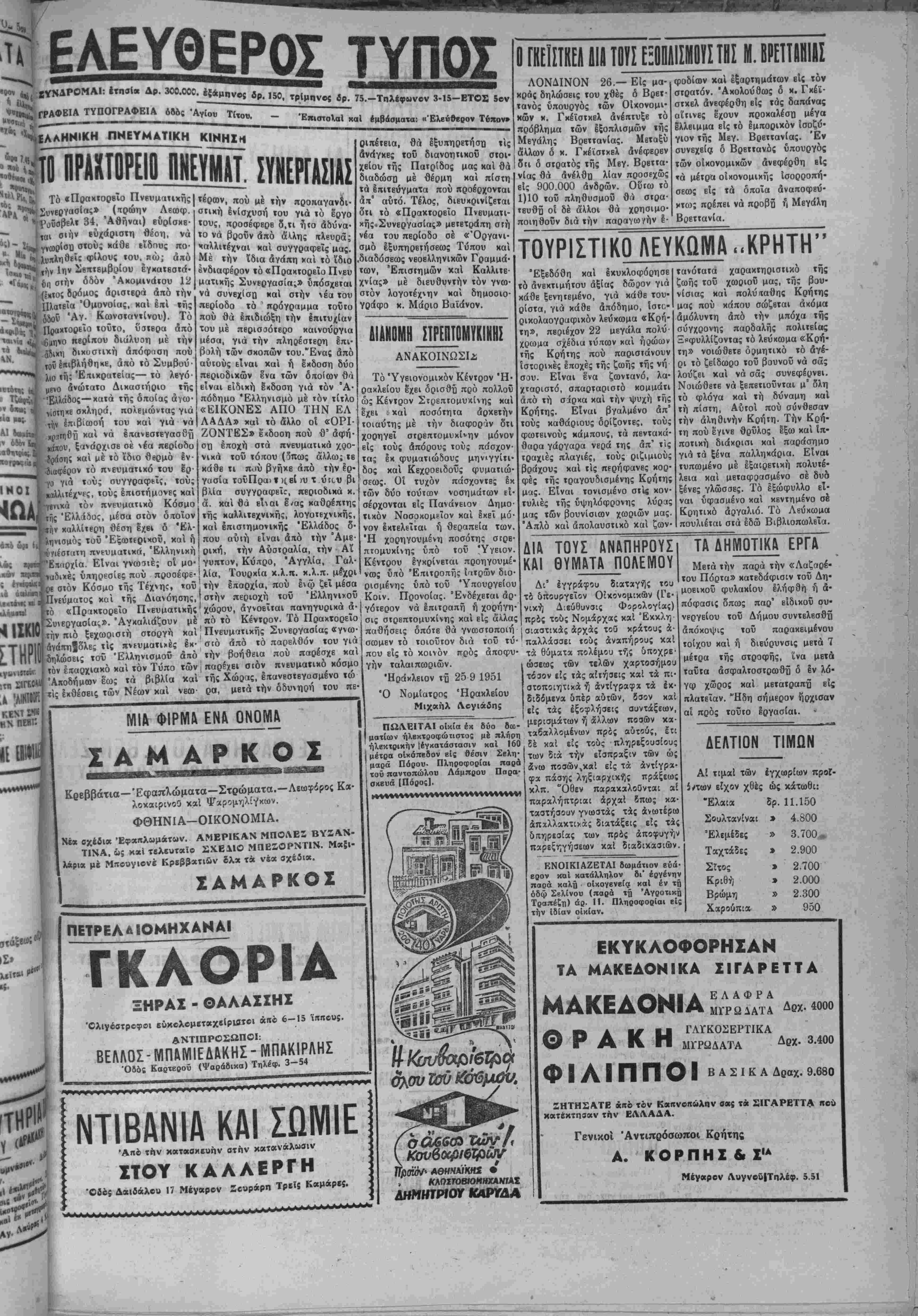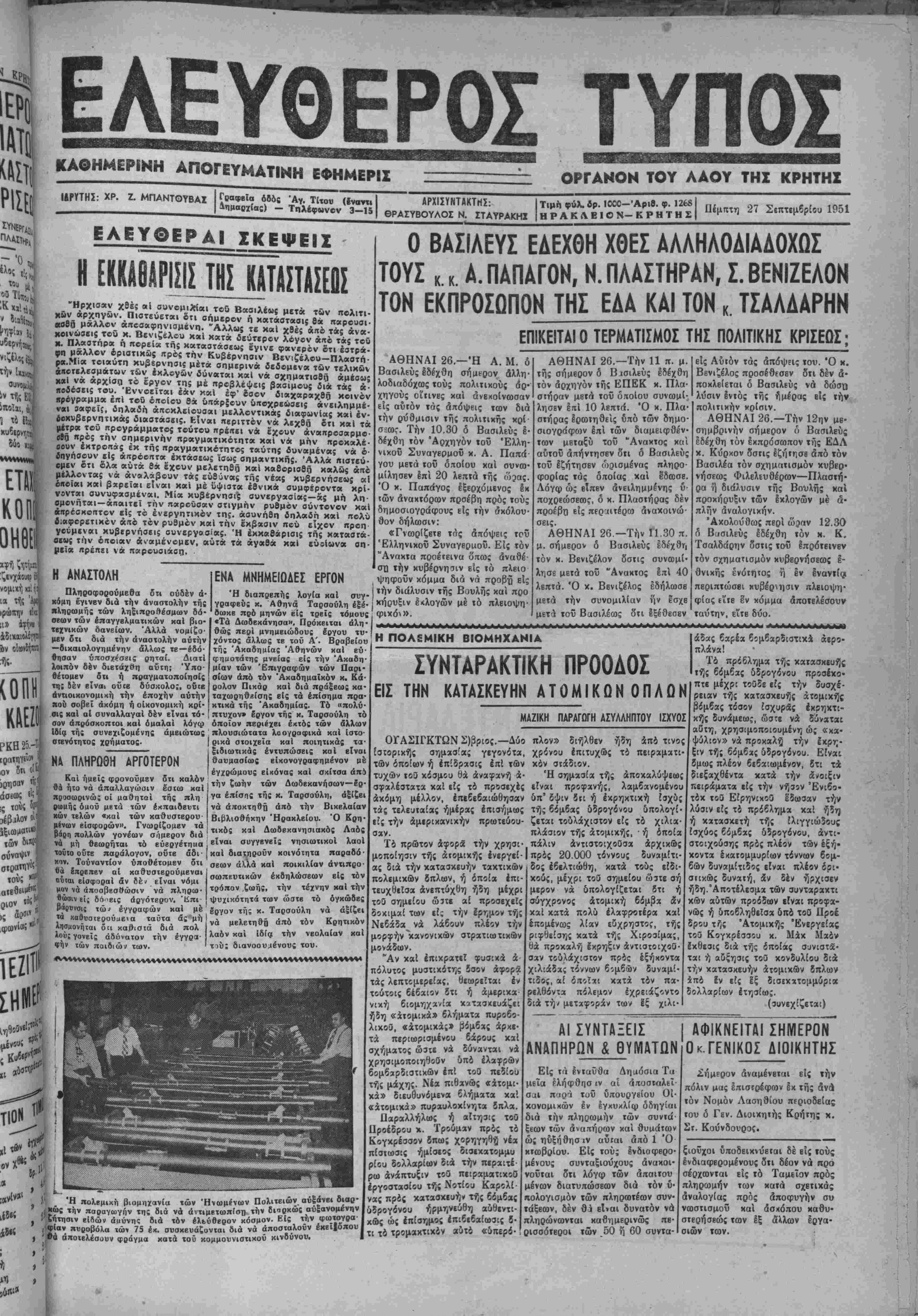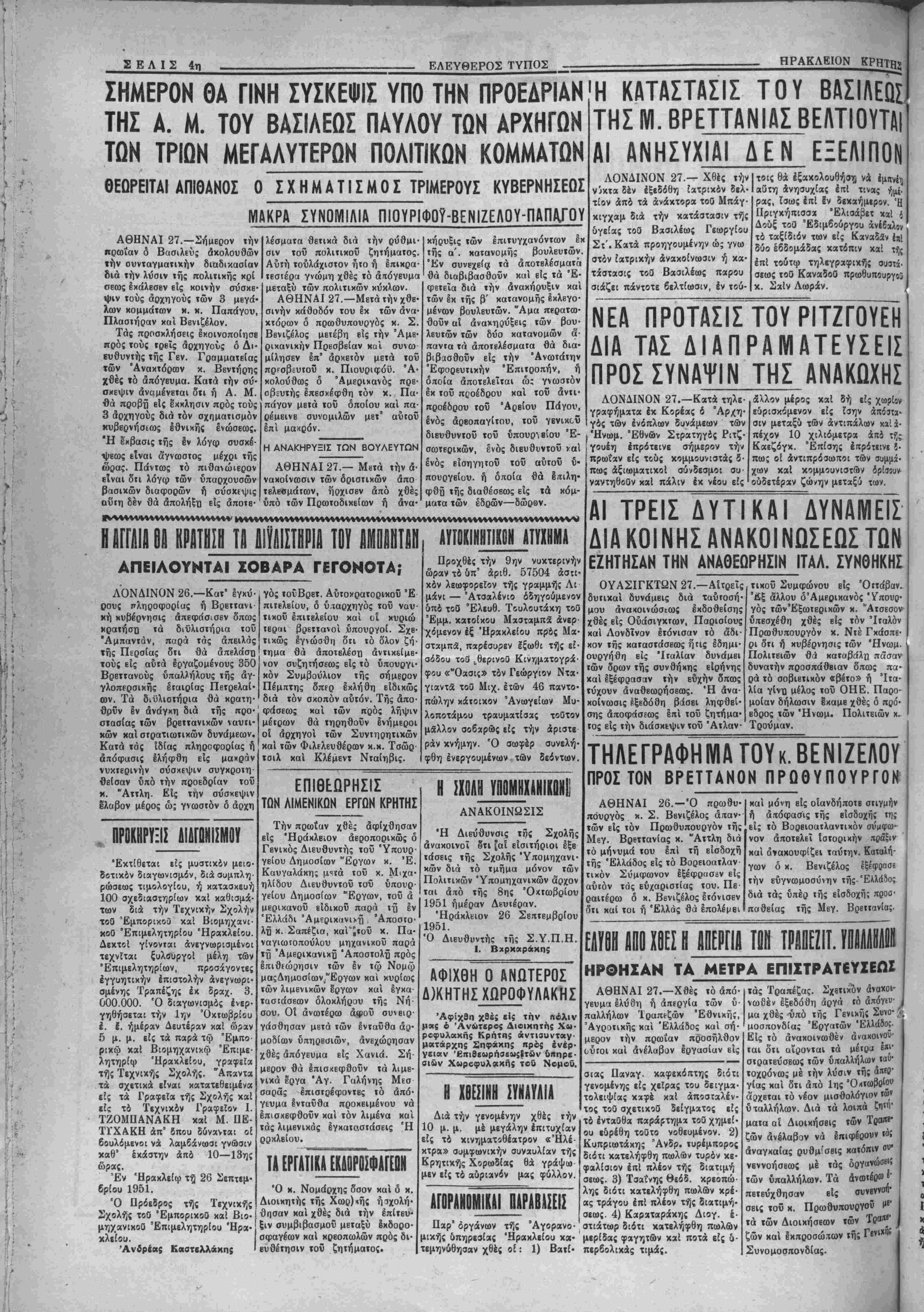 κήρυξιν έ<λογών μέ ιό πλειοψη- ΑΘΗΝΑΙ 26.—Την 11 π. μ. τής σήμερον δ Β^ιλεύς εδέχθη τόν αρχηγόν τής ΕΠΕΚ κ. Πλα- στήραν μβτά τοΰ όποΐου συνωμί· λησβν επί 10 λβπτά. Ό κ. Πλα¬ στήρας ερωτηθείς υπό των δημο- σιογράςχον επί των διαμειφθέν- των μεταξύ τοϋ "Αναχτος καί αυτού απήντησεν δΐι ό Βασιλεύς τοΰ εζήτησεν ωρισμένας πληρο¬ φορίας τάς οποίας καί έδοοσε. Λόγω ώς βΐπβν άνειλημμένης υ¬ ποχρεώσεως, δ κ. Πλαστήρας δεν προέβη είς περαιτέρω άναχοινώ· σεις. ΑΘΗΝΑΙ 26—Την Π.30 π. μ. σήμερον δ Βασιλεύς εδέχθη ΐόν κ. Βενιζέλον όστις συνωμί· λησε μετά ΐοΰ "Ανακτος Ιπί 40 λβπτά. Ό κ. Βενιζέλος έδήλωσβ μετά την συνομιλίαν ήν έσχε μετά τοΰ Βασιλέως ότι Ιξέθεσεν είς Αύιόν τάς άπόψΕΐς τού. Ό χ. Ββνιζέλος προσέθεσεν δτι δέν δ- ποχλείεται ό Βασιλεύς νά ύ έ ς υ λύσιν έντός τής ημέρας είς την πολιτικήν κρίσιν. ΑΘΗΝΑΙ 26.—Την 12ην μβ· σημβρινήν σήμερον ό Βασιλεύς εδέχθη τόν έκπρόσωπσν τής ΕΔΑ χ. Κύρχον δσπς έζήιησβ άπό τόν Βασιλέα τόν σχηματισμόν κυβερ¬ νήσεως Φιλελευθέρας—Πλασιή- ρα η διάλυσιν τής Βονλής και προκήρυξιν των ϊκλογών μέ α¬ πλήν άναλογικήν. "Ακολούθως περί ώ^αν 12.30 ο Β^σιλεύς εδέχθη τόν κ. Κ. Τσαλδάρην όστις τοΰ επρότεινεν τόν σχηματισμόν κυβεονησεως έ- θνικής ένότητος ή εν έναντΐςι περιπτώσει χυβέρησιν πλειοψη- φίας εΐΐΒ έν κόμμα άποτελέσουν ταύτην, είτε δύο. ΝΑ ΠΛΗΡΩΘΗ ΑΡΓΟΤΕΡΟΝ Καί ημείς φρονούμεν ότι καλόν θ& ήτο νά άπαλλαγώσιν έστω καί προσωρινώς οί μαθηταί τή: πλη βωιιηϊ όΐΛθϋ μετά των έκπαιδευτι κων τελών ««αί των καθυσΐβρου μίνων είαφοβών». Γνωρίζομεν τα βάβπ πολλών γονέων σημερον δια νά μή θεωρήται τό εύεργέτηιια τουτο οδτε παράλογον, οΰΐε άδι¬ κον. Τουναντίον υποθέτομεν ότι Οά ίηρεπεν αί καθυστερούμεναι ούται είσφηραΐ άν οέ» είναι νόμι ν>ον νά άποοβεσθώσιν νά πληρω-