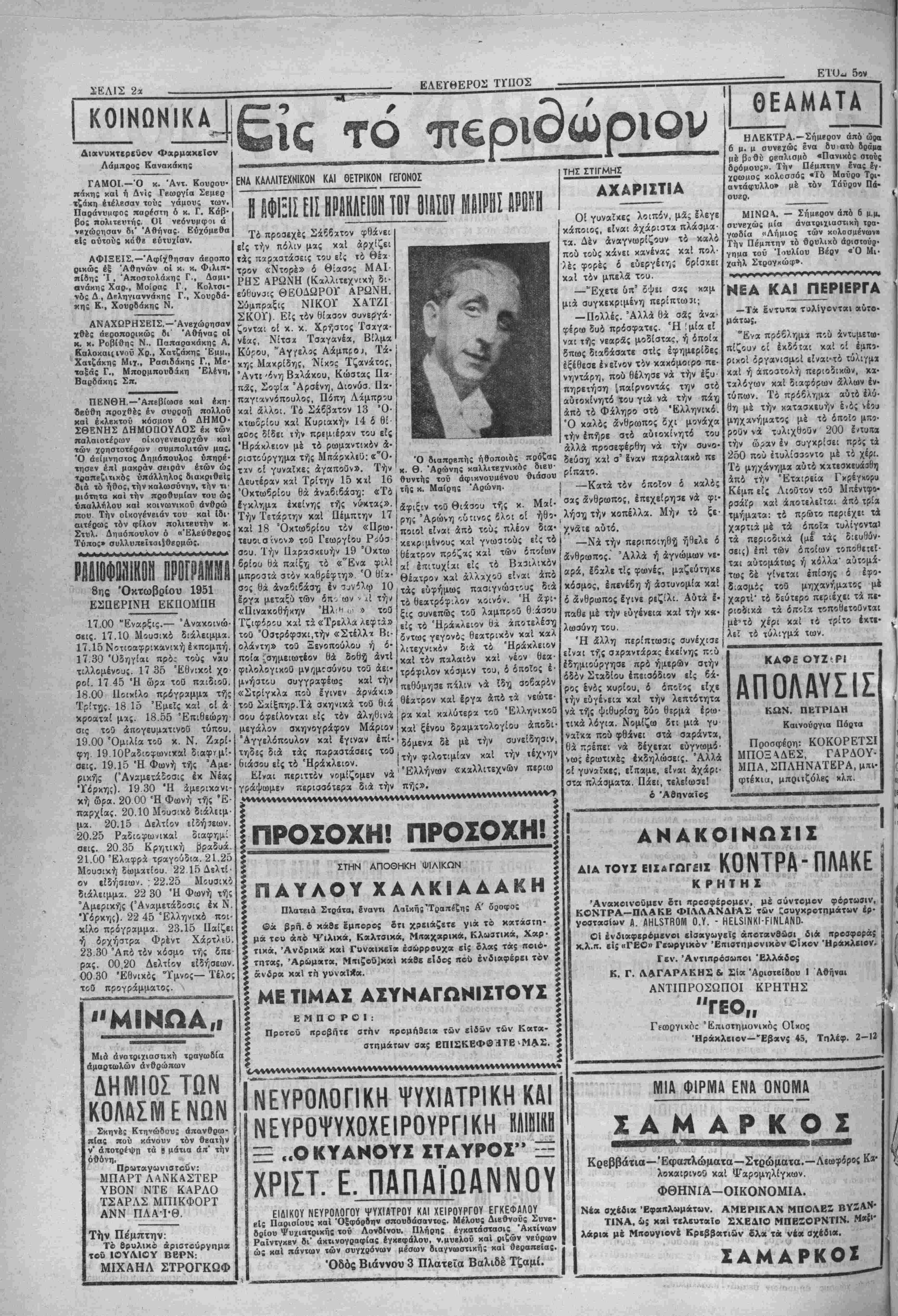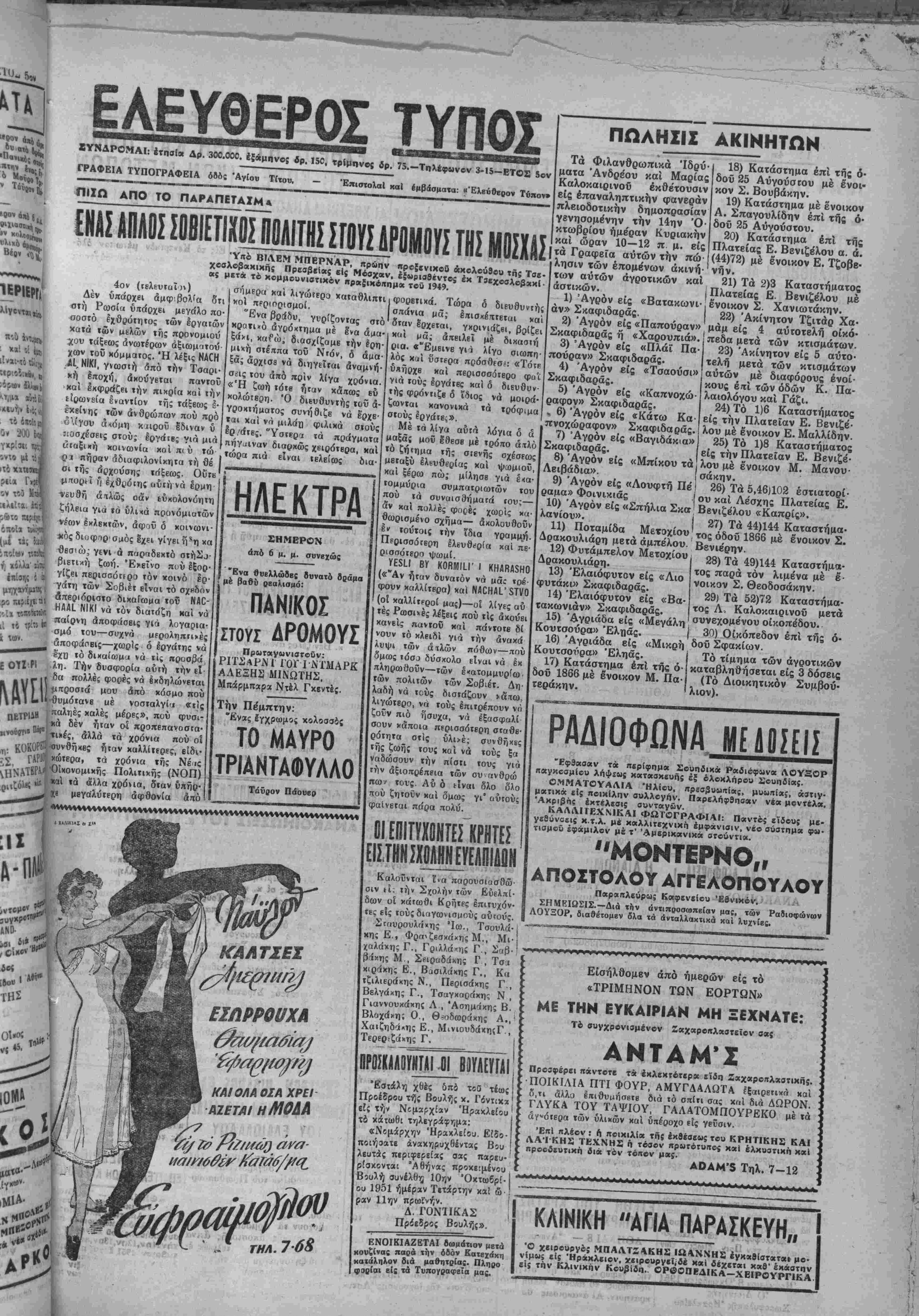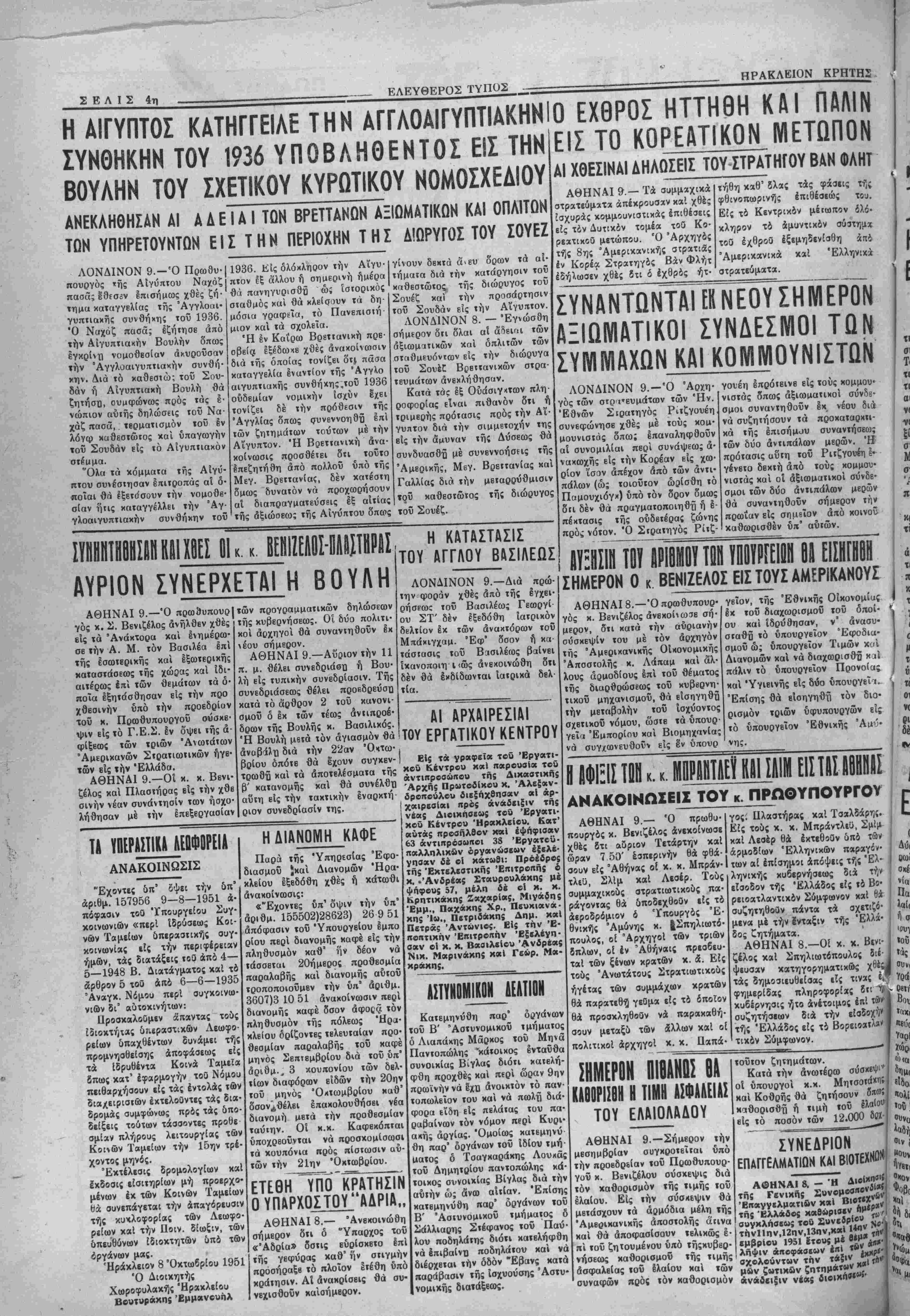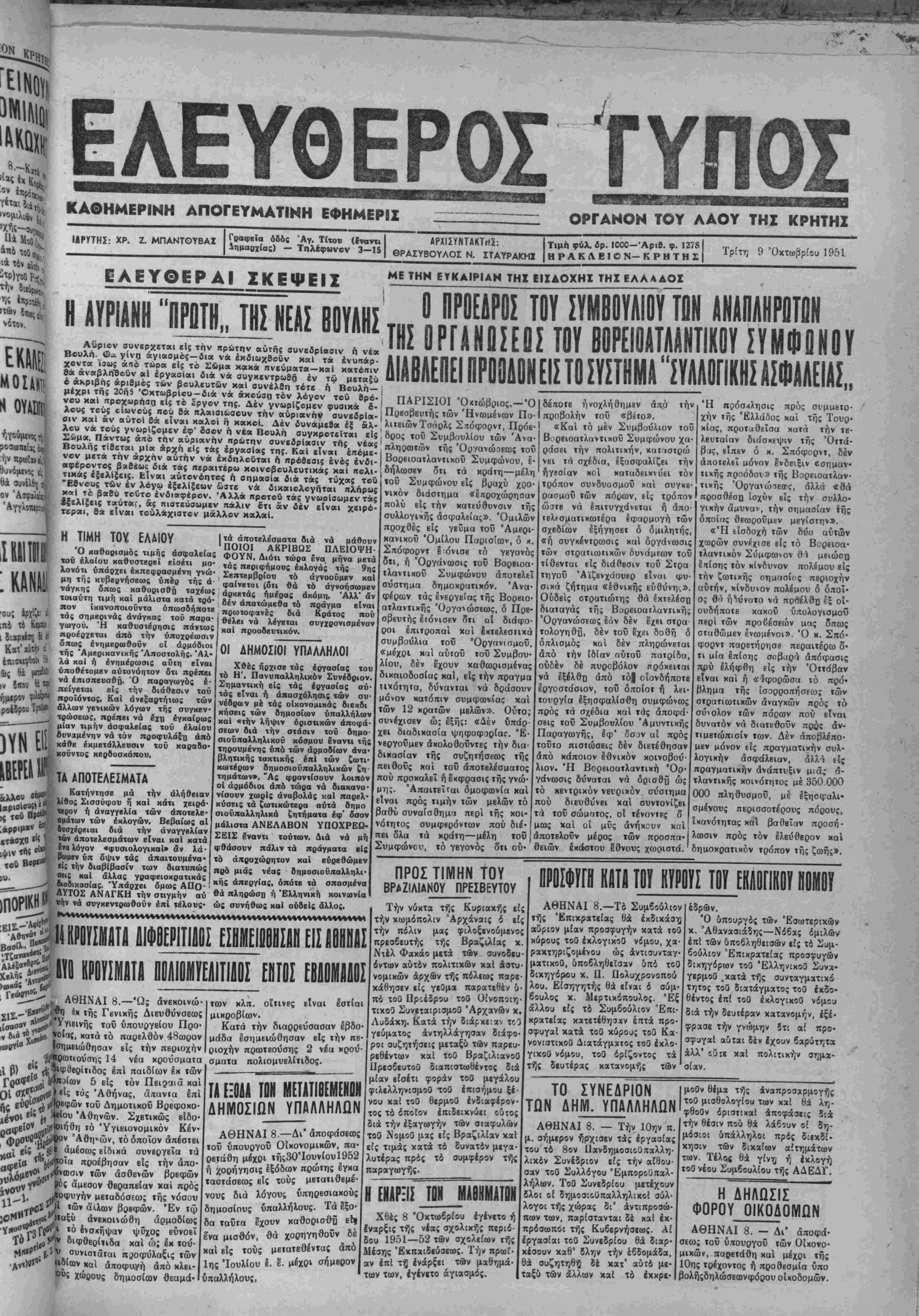 <*-, ΕΛΕΥΘΕΡΟΣ ΓΥΠΟΣ ΚΑΘΗΜΕΡΙΝΗ ΑΠΟΓΕΥΜΑΤΙΝΗ ΕΦΗΜΕΡΙΣ ΟΡΓΑΝΟΝ ΤΟΥ ΛΑΟΥ ΤΗΣ ΚΡΗΤΗΣ ΙπΡίΤΗΣ: ΧΡ. Ζ. ΜΠΑΝΤΟΥΒΑ! Γραφεία όδός Αγ. Τίτου (έναντι | Ιημαρχ(ας) — Τηλέφωνον 3—151 ΛΡΧΙΣΥΝΤΑΚΤΗΣ: ΘΡΑΣΥΒΟΥΛΟΣ Ν. ΣΤΑΥΡΑΚΗ! Τιμπ φύλ. δρ. ΙΟΟΟ-Άριθ. φ. 1278 ΗΡΑΚΛΕΙΟΝ-ΚΡΗΤΗΣ Τρίτη 9 ΌχτωβρΕου 1951 ΕΛΕΥΟΕΡΑΙ ΣΚΕΨΕΙΣ ιι αυριανη 'Έηπ—_η_κιΐ Αυριον συνβρχεται βΐς την πρώτην αυτής συνεδρίασιν ή νέα Βουλη. ©λ γίνη αγιασμβς—δια νά έκδιωχβοϋν καΐ τα ένυπάρ- χοντα ιαβ»; απο τώρα είς τό Σώμα κακα πνβύματα-και κατόπιν βα αναβληΒοΰν αι εργασίαι διά νά συγκβντρωθή έν τώ μβταΕύ ο ακριβης άριθμος των βουλβυτών χαΐ συνέλθη 'τβτβ ή' Ββυλη— 1 .________________________ μέχρι τής 20ήί Όκτωβρίβυ-διά νά ακούση τόν λόνον τοϋ θοό· ΠΑθτνΐηΐ τ ό ·ηι*' » ι»α » - νού καΐ προχωρήαη είς τό έργον της. Δέν γνωρίζομεν φυοικάβ- ' τ, ΙΙΑΡΙΣΙ01 Ο«ωβριος.— Ο δεηοιε ηνοχληθημίν απθ λους τοΰς οΐωνούς «ού Βά πλαισιώσουν την αυριανήν συνεδρια- Πρεοβευτης των Ηνωμένων Πο· Ι προβολήν τοΰ «ββτο». σιν καί «ν αύτοΐ βά είναι καλβί γϊ καχοί. Δέν δυνάμββα έξ άλ· λιτειώνΤσάρλς Σΐτόφορντ, Πρόε-' '" ' -1 ν ^.-*π *ύί Υν£ΡΙζΤν έ·Φ> 8α*ν ή νί" Ββυλίι ο-νκρβτεϊται είς 1 δρος τού Συμβουλίου των Άνα·