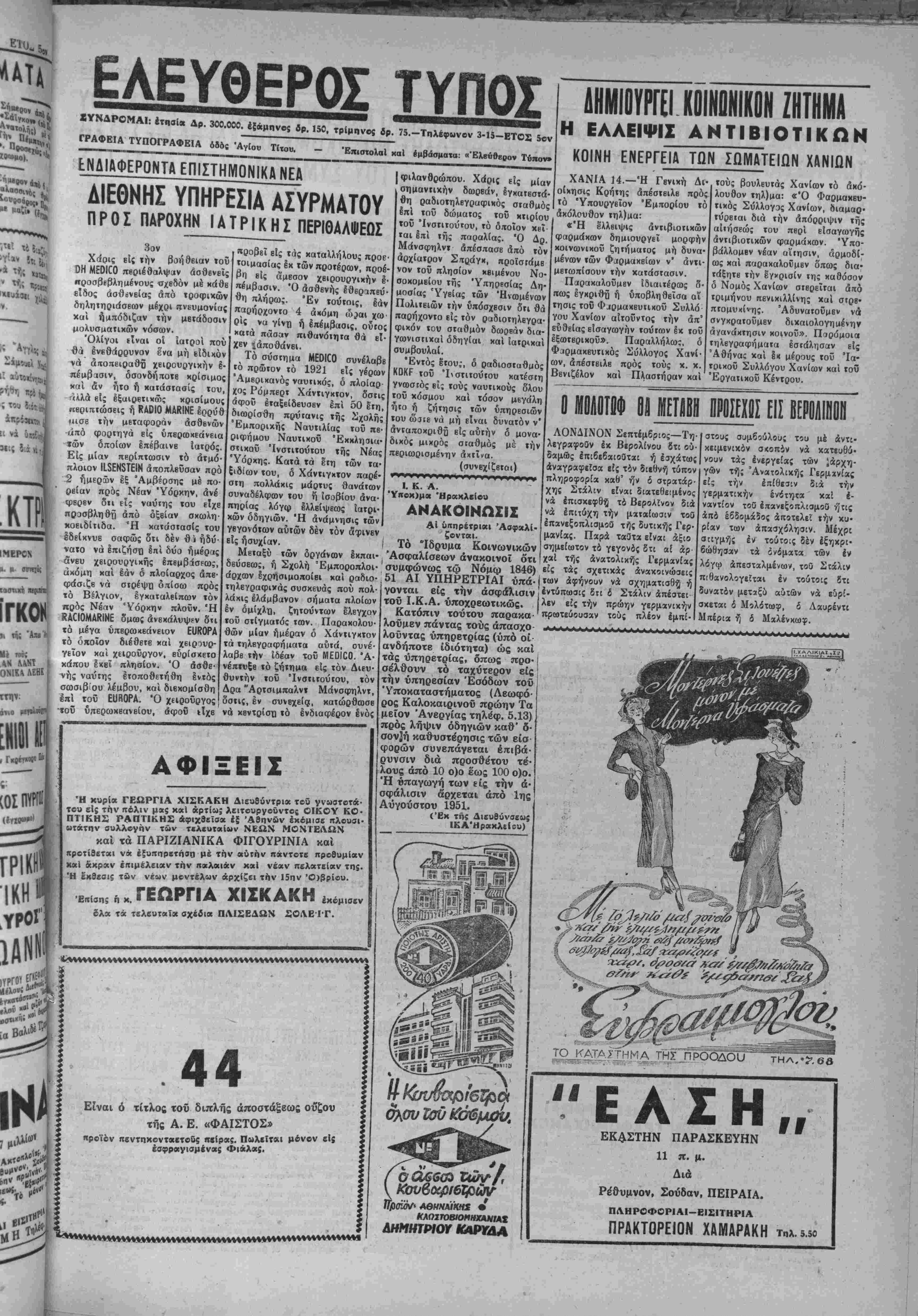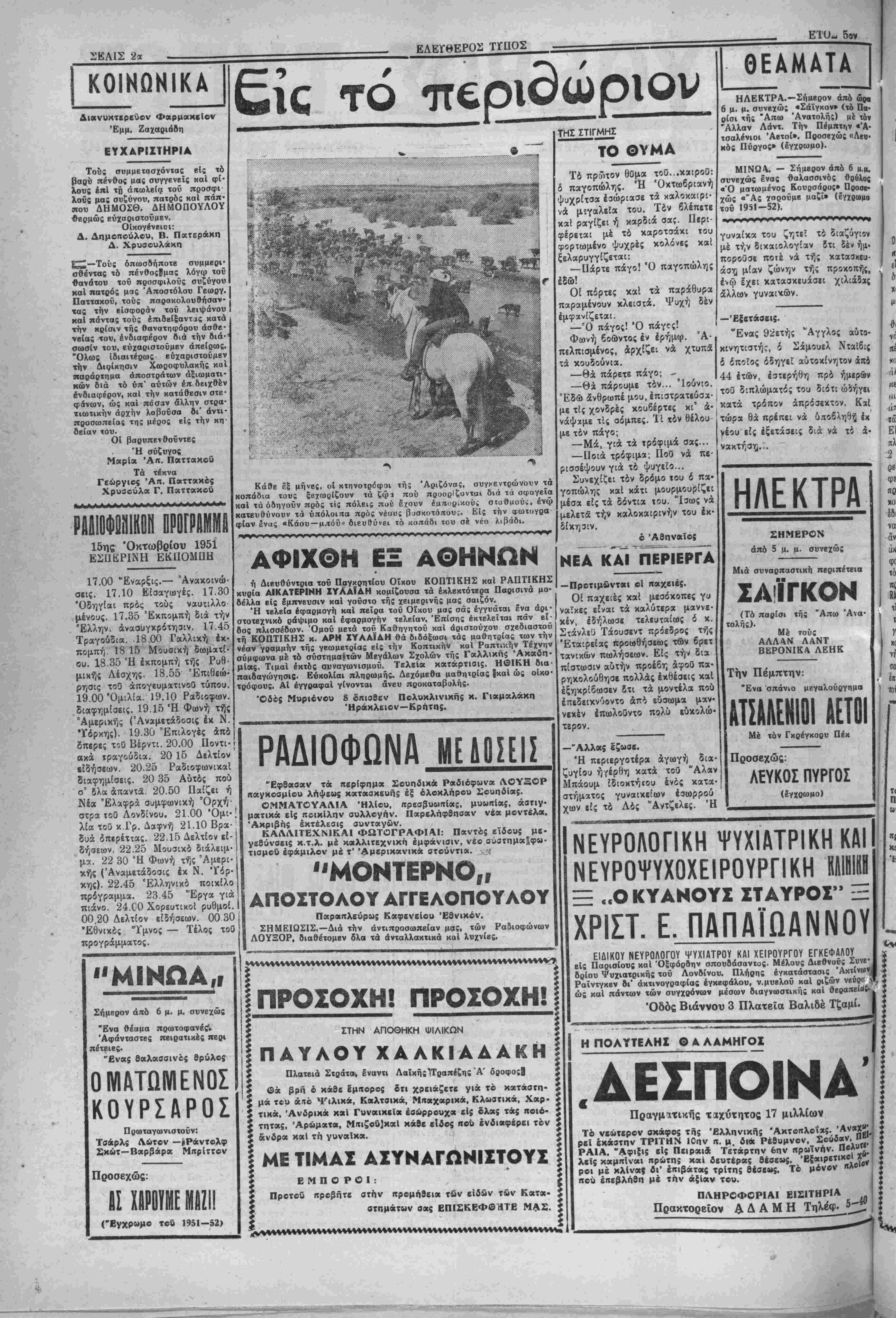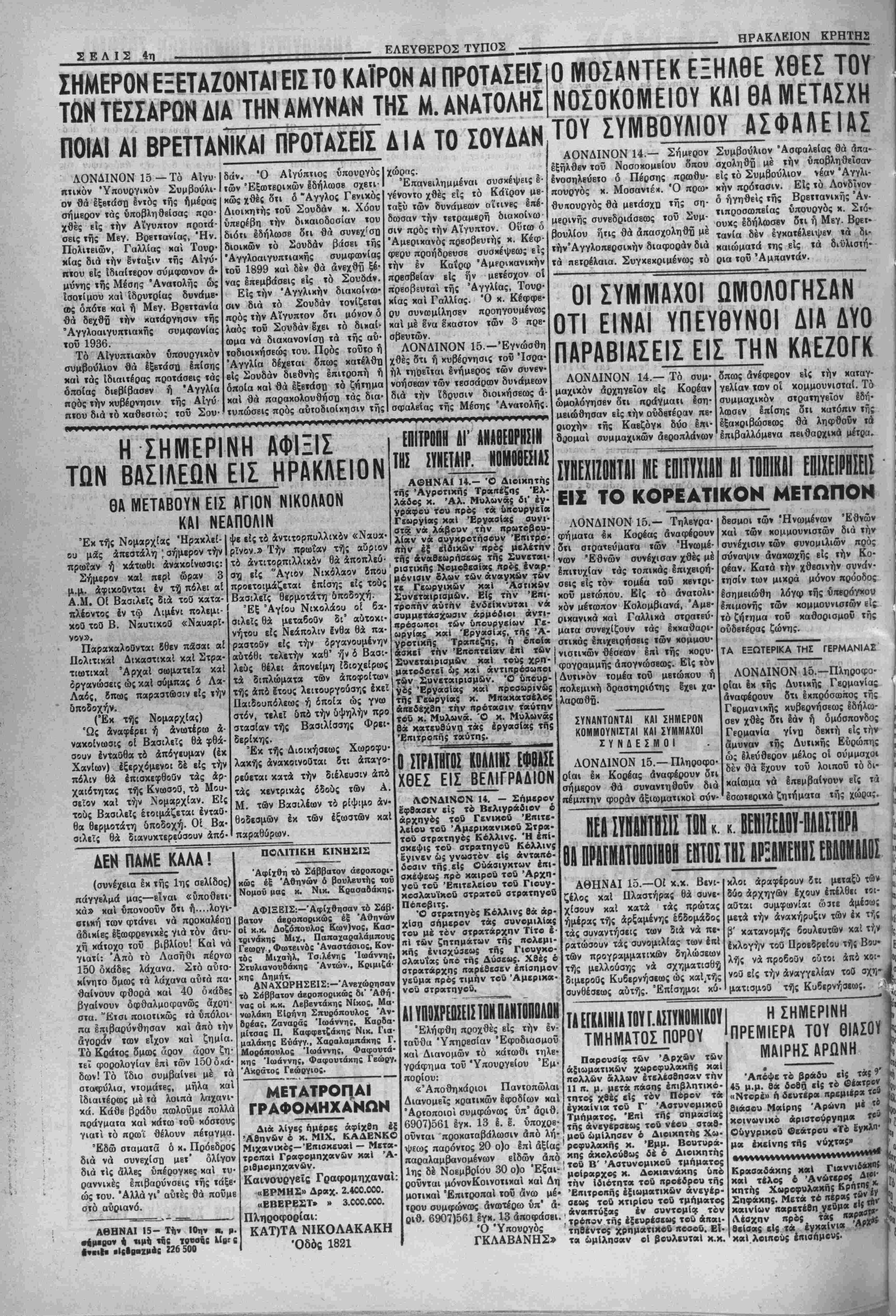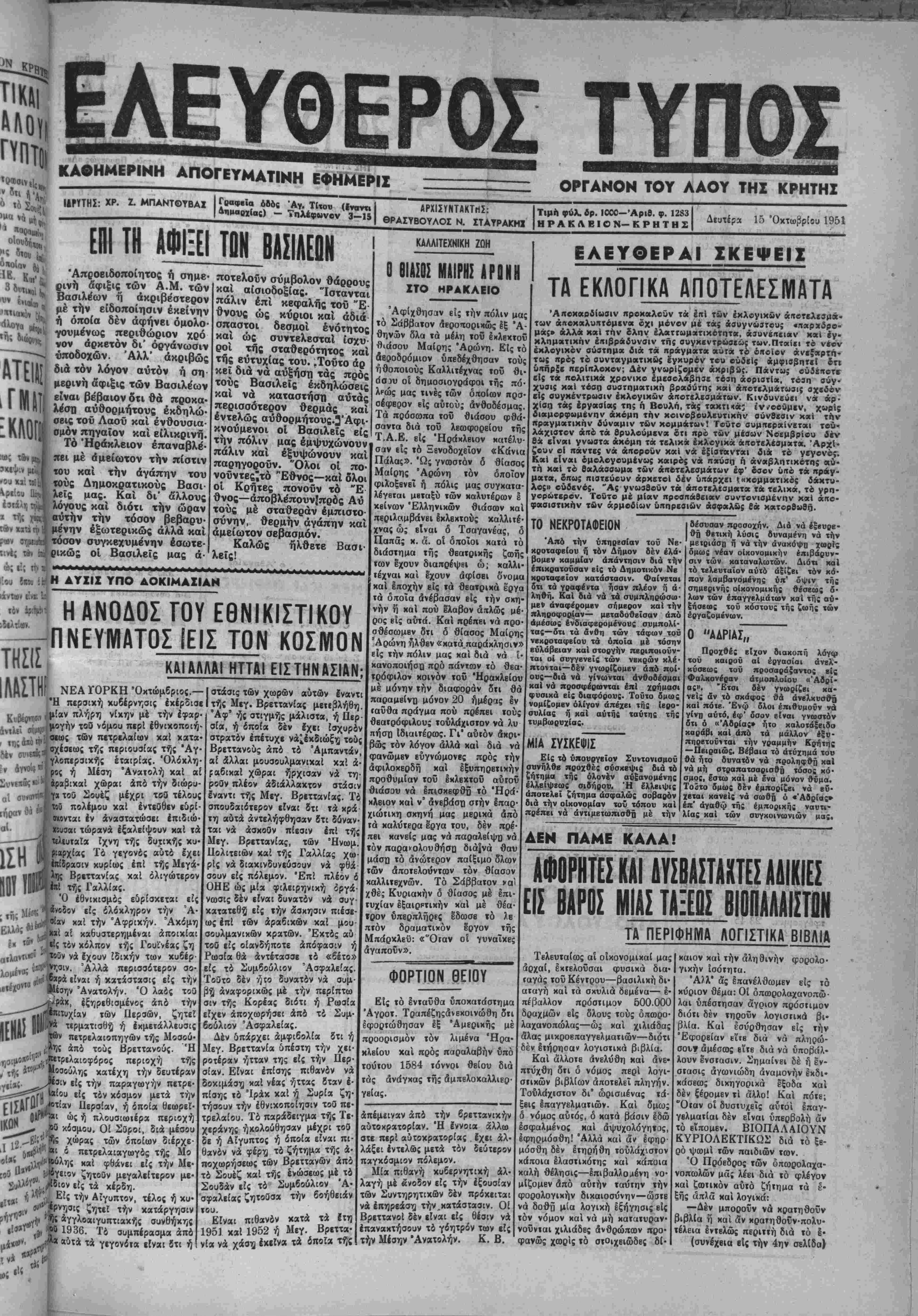 τ?τί**"0Ό <*—*« ΑΡΧΙΣίΝΤΑΚΤΗΣ: Ι^-βΧ.ας) -Τηλέφωνον 3-151 ΘΡΑΙνΒΟΥΛΟΣ Ν. ΣΤΑΥΡΑΚΗ! ΕΠΙ ΤΗ ΑΦΒ]ίΝ_ΒΑΣΙΑΕΩΝ Άπβοβιδοποίητος ή σημε. ποτελοΰν σύμβολον θάρρους ινή άφιξις των Α.Μ. των καί η!η,η^'η, ι ":.__6 Τιμπ φύλ. δρ. ΙΟΟΟ-Άριθ. φ. 1283 ΗΡΑΚΛΕΙΟΝ-ΚΡΗΤΗΣ Δευτέρα 15 ΌχτωβρΕου 1951 Ι ρινή άφιξις Βασιλέων ή των άκριβέστβρον "Ι; . έ την ειδοποίησιν εκείνην ή όποία δέν άφήνει όμολο· γουμένως περιθώριον χρό νόν αρκετόν δι* οργάνωσιν •ύποδοχών. Άλλ' ακριβώς διά τόν λόγον αυτόν ή ση μερινή άφιξις των Βασιλε'ων είναι βέβαιον δτι θά προκα¬ λέση αΰθορμήτους έκδηλώ· σεις τού Λαοΰ καί ενθουσια¬ σμόν πηγαίον «αί εΐλικρινή. Τό Ηράκλειον έπαναβλέ- πβι μέ αμείωτον την πίστιν «αί την αγάπην τού ς Δημοκρατικούς Βασι μας. Καί δι' άλλους υς «αί διότι την ώραν ΐν την τόσον βεβαρυ· ην εξωτερικώς άλλά καί συγκεχυμένην έσωτε- θί Βασιλείς μας ά- «αι αίσιοδοξίας. "Ιστανται πάλιν επί κεφαλής τοΰ "Ε θνους ώς κύριοι καί άδιά σπαστοι δεσμοί ένότητος καί ώς συντβλεσταί ίοχυ- ροί τής σταθερότητος καί τής βύτυχίας τού. .Τουτο άρ «βί διά νά αυξήση τάς πρός τους Βασιλείς έκδηλώσεις καί νά καταστήση αύτάς περισσότερον θερμάς «αί εντελώς αΰθορμήτους.3'Αφι· κνούμενοι οί Βασιλείς είς την πόλιν μας έμψυχώνουνι πάλιν καί έξυψώνουν καί παρηγοροΰν. "Ολοι οί πο· νοΰντβς^τό "Εθνος—καί δλοι οί Κρήτες πονοΰν τό "Ε θνος—άποβλέπουν}πρός Αΰ τούς μέ σταθεράν εμπιστο¬ σύνην, θερμήν αγάπην καί αμείωτον σεβασμόν. λείς! Καλώς ήλθετε Βασι· ΔΥΣΙΣ ΥΠΟ ΔΟΚΙΜΑΣΙΑΝ ΚΑΛΛΙΤΕΧΝΙΚΗ ΖΟΗ Ο ΟΙΑΣΟΣ ΜΑΙΡΗΣ ΑΡΟΝΗ ΖΤΟ ΗΡΑΚΛΕΙΟ Αφίχθησαν είς την πόλιν μας τό Σάββατον άεροπορικώς έξ Α¬ θηνών δλα τα μέλη τού έκλεκτοΰ θιάσου Μαίρης 'Αρώνη. Είς τό άβοοδρόμιον ύπβδέχθησαν τούς ήθοποιούς Καλλιτέχνας ιοΰ θι· άσιν οί δημοσιογοάφοι τής πό¬ λεώς μας τινές των οποίων προ¬ σεφέρον είς αύιού; άνθοδέσμας. Τα πςόσωπα τοϋ θιάσου φθά- σαντα διά τοΰ λβωφορείου τής Τ.Α.Ε. εις Ηράκλειον κατέλυ- σαν είς τό Ξθνοδοχεΐον «Κάνια Πάλας». Ώς γνα>στόν δ θίασος