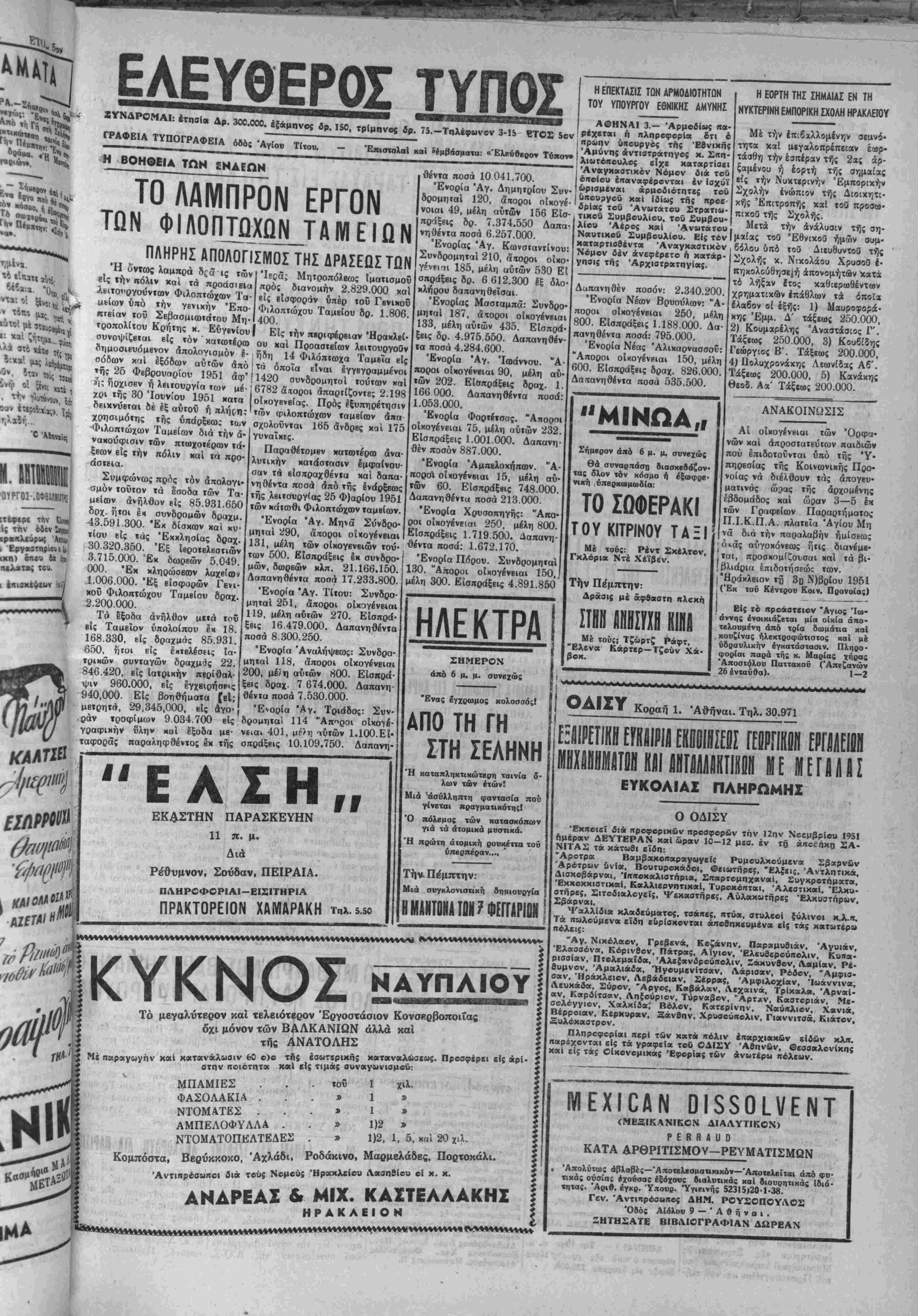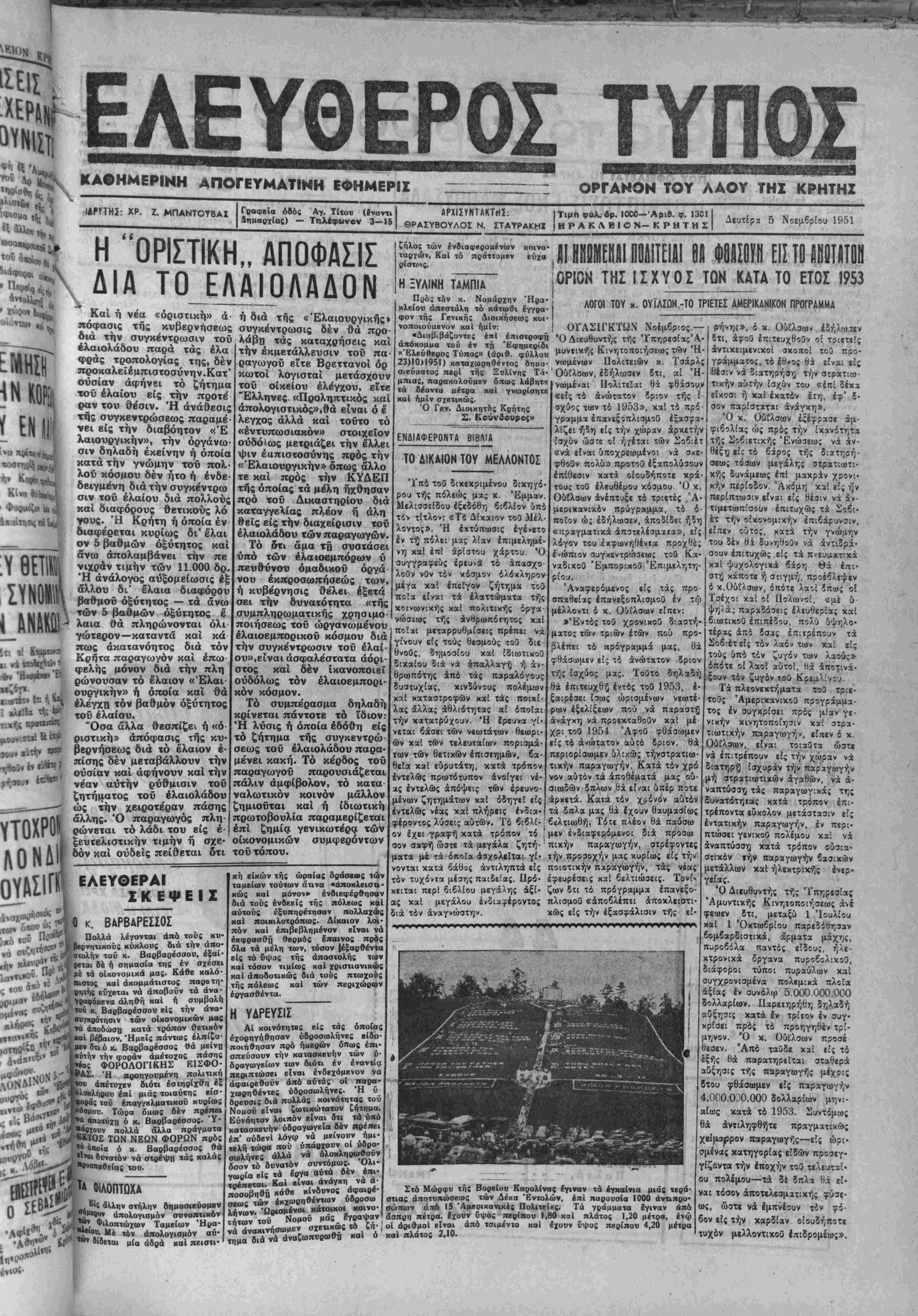 <ρράς τροπολογίας της, δέν προκαλεΐέμπιστοσύνην.Κατ' θυσίαν άφήνει τό ζήτημα τοΰ ελαίου είς την προτέ ραν τού θέσιν. Ή ανάθεσις τής συγκεντρώσεως παραμέ νει είς την διαβόητον «Έ λαιουργικήν», τή ν οργάνω¬ σιν δηλαδή εκείνην ή όποία χατά την γνώμην τοΰ πολ- λοΰ κόσμου δέν ήτο ή ένδε· δειγμένη διά την συγκέντρω σιν τοϋ ελαίου διά πολλοΰς καί διαφόρους θετικούς λό γους. Ή Κρήτη ή όποία έν διαφέρεται κυρίως δι' έλαι όν 5 βαθμών οξύτητος καί άνω άπολαμβάνει την πε νιχράν τιμήν των 11.000 δρ. Ή άνάλογος αύξομείωσις έξ άλλου δι* ελαια διαφόρου βαθμοϋ οξύτητος — τα άνω των 5 βαθμών οξύτητος έ λαια θά πληρώνονται όλι γώτερον—καταντά καί κά πως άκατανόητος διά τόν Κρήτα παραγωγόν καί έπω φελής μόνον διά την πλη ρώνουσαν τό έλαιον «Έλαι¬ ουργικήν» ή όποία καί θά ελέγχη τόν βαθμόν οξύτητος τοΰ ελαίου. "Οσα άλλα θεσπίζει ή «ο¬ ριστικήν απόφασις τής κυ¬ βερνήσεως διά τό έλαιον έ- πίσης δέν μεταβάλλουν την θυσίαν καί άφήνουν καί την νέαν αυτήν ρύθμισιν τοΰ ζητήματος τοΰ έλαιολάδου ώς την χειροτέραν πάσης άλλης. Ό παραγωγός πλη ρώνεται τό λάδι τού είς έ- λάβη τάς ^ καταχρήσεις καί την εκμετάλλευσιν τοΰ πα¬ ραγωγόν είτε Βρεττανοί όρ κωτοί λογισται μετάσχουν τοΰ οίκείου έλβγχου, είτε Έλληνες. «Προληπτικός καί άπολογιστικός»,θά είναι ό έ λεγχος άλλά καί τούτο τό «έντυπωσιακόν» στοιχείον ουδόλως μετριάζβι την έλλει ■ψιν έαπιστοσύνης πρός την «Έλαιουργικήν» όπως άλλο τε καί πρός την ΚΥΔΕΠ τής οποίας τα μέλη ήχθησαν πρό τού Δικαστηρίου διά καταγγελίας πλέον ή άλη #εϊς είς την διαχείρισιν τοΰ έλαιολάδου των παραγωγών. Τό δτι αμα τή συστάσει υπό των έλαιοεμπόρων ύ πευθύνου όμαδικοΰ όργά νού έκπροσωπήσεώς των, ή κυβέρνησις θέλει έξετά σει την δυνατότητα «τής συμπληρωματικής χρησιμο Η ΞΥΛΙΝΗ ΤΑΜΠΙΑ Πρό; τδν κ. Νομάρχην Ήρα- χλείον άπβστάλη τό κάτωθι έγγρα¬ φον τής Γενικής Διοικήσεως χοι· νοποιούακνον χαί ημίν: ΑΙ ΗΗΟΜΕΠΑΙΠΟΑΙΤΕΙΒΙΒΑ ΦΒβΣΟΥΠ ΕΙΣ ΤΟ ΑΗαΤλΤΟΙΙ ΟΡΙΟΝ ΤΗΣ ΙΣΧΥΟΣ ΤΟΝ ΚΑΤΑ ΤΟ ΕΤΟΣ 1953 ΑΟΓΟΙ ΤΟΥ κ. ΟΥΙΛΣΟΝ.-ΤΟ ΤΡΙΕΤΕΣ ΑΜΕΡΙΚΑΝΙΚΟΝ ΠΡΟΓΡΑΜΜΑ ΟΥΑΣΙΓΚΤΩΝ Νοέμβριος.- «Διαβιβάζοντες έ*1 έπιστροφή «Ο Διευθυντάς τής 'Γπηριοίας'Α- λιι « ΐιυντικίϊς Κίνητοποιήσεω; των Η- 23)10)1951) χαταχωρτιθέντος δηιιο- νωμενων Πολιτειων κ. Ισαρλς σιεύ»ατο: περί τής Ξυλίνης Τ<ί· Όϋίλσων, εδήλωσεν δτι, αί Ή- μπιας, παρακαλούμεν όπως λάβητε * " ' τα δέοντα μέτρα χαί γνωρίσητε χοί ημίν σχετικώς. Ό Γ«ν. Διοικήται ς Κρήτης Σ. Κούνδουρος» ΕΝΔΙΑΦΕΡΟΝ ΒΙΒΛΙΑ ΤΟ ΔΙΚΑΙΟΝ ΤΟΥ ΜΕΛΛΟΝΤΟΣ Υπό τού δικεκριμένου δικηγό ροιι τής πόλεώς μας κ. Έμμαν. Μελίοσείδου εξεδόθη βιβλίον υπό τον τίτλον: «Τό Δίκαιον τού Μέλ· λοντος». Ή έχτύπωσις εγένετο έν τή πόλει μας λίαν έπΐμελημέ νη καί επί αρίστου χάρτου 'Ο συγγραφεύς έρεανά τό άπασχο- λοθν νυν τόν κόσμον ολόκληρον έ μέγα χά! ζήτγ;μα τοθ ξευϊβλιστικήν τιμήν ή σχε·' οικονομικήν συμφβρόντων δόν καί ουδείς πείθβται δτι τοΰ τόπου. ΕΛΕΥΘΕΡΑ! ΣΚΕΨΕΙΣ κ. ΒΑΡΒΑΡΕΣΣΟΣ Πολλά λέγονται άπό τοίς χυ- ινητιχού: κύχλους διά την άπο- ιτολήν τού χ- Βαρβαρέσσου, έςαι- αι δέ ή σημασία της έν σχέσει τα οϊχονομιχά μας. Κάθβ χαλό- χαί άκομμάτιστος παροτη- εϋχβται νά άποβοΰν τα άντ»· γραφόμενα αληθή καί ή συμβολή *οΟ χ, Βαρβαρέσσου εί: την ανα- τών οίκονομικών μας κατά τρόπον θειϊκόν αποδώση κατά τρόπο ι βέβαιον. Ημείς πάντως έλπιζο- ότι ό κ. Βαρβαβέσσος θά μείνη ά άέ πάσης ιύτήν την φοοάν άμέτοχος πάσης ΦΟΡΟΛΟΓΙΚΗΣ ΕΙΣΦΟ- Ή προηγονμένη πολιτιχη απέτυχεν διότι έσιηρίχθπ,βε .οχλήρου επί μιάς τοια