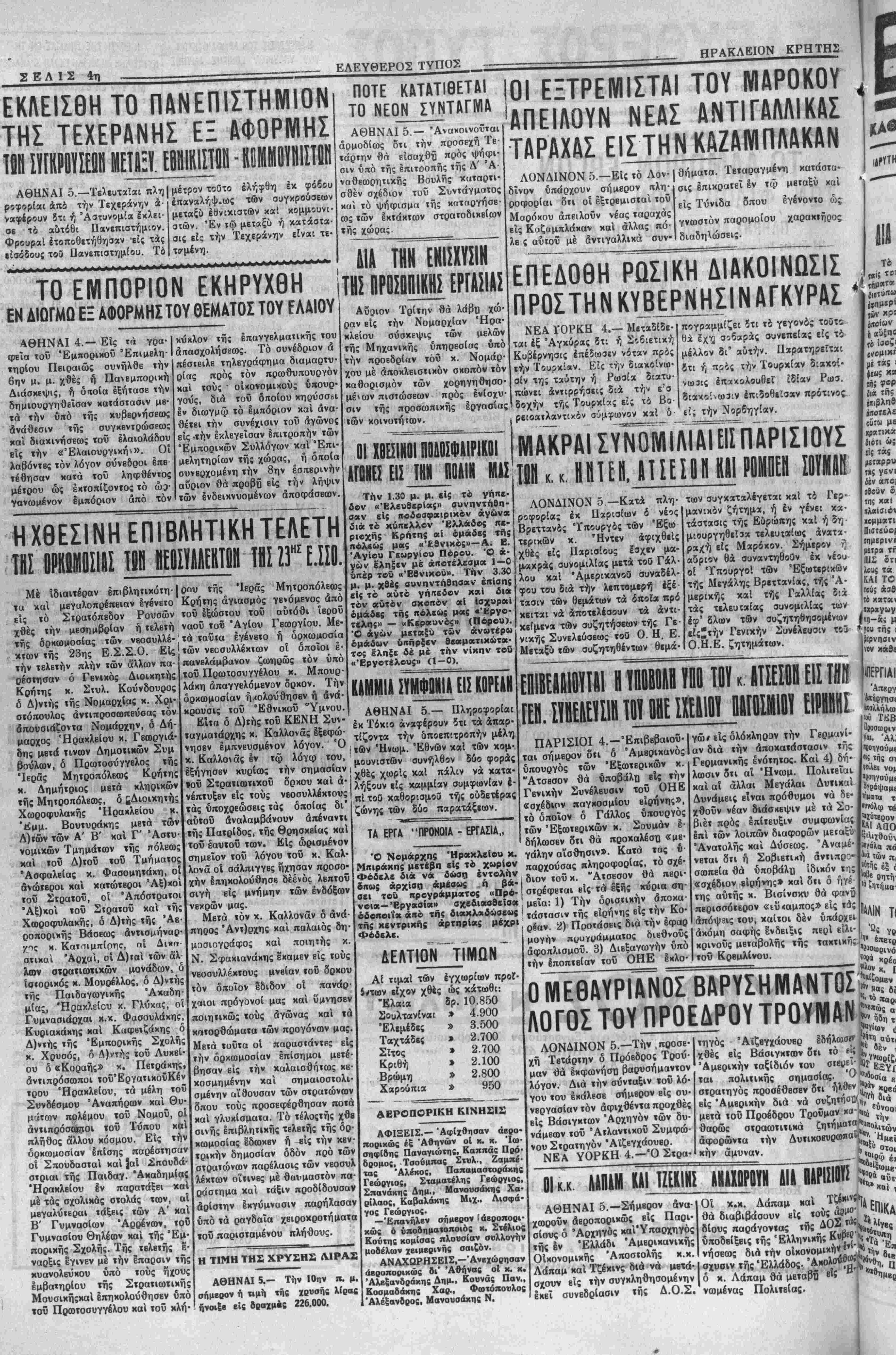 ?β» της < Μρνηβιν νόν χαδί 1ΡΓΙΑ! Άηεργ Ό Νομάρχης Ηρακλείου κ. Νπιράκης μετέβη είς τό χωρίον Φόδελβ δια νκ δοάση εντολήν δπως αρχίση άμβσως ή β«- οβι τοϋ προγράμματος «Πρό· νοια—Έργααίοι» βχεΔιααβεΐσκ έδοηοιΐκ άπό τής δι«κλ«δώα8«ις τής κκντρικής αρτηρίκς μέχρι Φόδαλβ. ΔΕΛΤΙΟΝ ΤΙΜΗΝ" Αί τιμαί των εγχωρίων προί· ίντων είχον χθές ώς κάτωθι: "Ελαια δρ. 10.850 Σουλτανίναι ^ 4.900 Ελεμέδες » 3.500 Ταχτάδες » 2.700 Σΐτος » 2.700 Κριθή » 2.100 Βρώμη » 2.800 Χαρούπια » 950 ΠΑΡΙΣΙΟΙ 4.—Επιβεβαιοί)· ται σήμερον διι δ Άμερικανός ύπουργός των "Εξωτερικών χ. Άτσβσον θά υποβάλη- είς την Γενικήν Συνέλευσιν τοΰ ΟΗΕ «σχέδιον παγκοσμίου βΐρήνης», τό δποΐον δ Γάλλος ύπουργός των "Εξωτερικών κ. Σούμαν ε¬ δήλωσεν διι θά προκαλέση «με¬ γάλην αίσθησιν». Κατά τας υ¬ παρχούσας πληροφορίας, τό σχέ¬ διον τοΰ κ. Άτσβσον θά περι· στρέφβται είς τα εξής κύρια ση· ( μεια: 1) Την οριστικήν <5ποκα· ! τάστασιν τής είρήνης είς τήν^Κο- ρίαν. 2) Ποοτάσβις διά την εφαρ μογήν πρυγράμματος διεθνοΰς άφοπλισμοΰ. 3) Διεξανωγήν υπό την εποπτείαν ΐοΰ ΟΗΕ Ικλο- αεροπορικη κινησισ; ΑΦΙΞΕΙΣ.— Αφίχθησαν άερο- πορικώς έξ Αθηνών οί χ. κ. Ιω- σηφίδης Παναγιώτης. Καππάς Πρό- δρομος, Τσούμπας Στυλ., Ζαμπέ- τας Άλέκος, Παπαμαστοοάχης Γεώργιος, Σταματέλης Γεώργιος, Σπανάκης Δημ., Μανουσάκης Χα· οίλαος, Καβαλάχης Μιχ., Λισφά- γος Γεώργιος. —'Επανήλεν σήμερον Ιάεροπορι- κώς ό ύποδηματοποιός κ. Στέλιος Κούτης κομίσας πλουσίαν συλλογήν μοδέλων χειμβρινής σαιζόν. ΑΝΑΧΟΡΗΣΕΙΣ,-Άνβχώρησαν άεροπορικώ; δι' Αθήνας οί χ. χ. Αλεξανδράκης Δημ., Κουνάς Παν.. Κοσμαδάχης Χαρ., Φωτόπουλος Άλέξανδρος, Μανουσάκης Ν. |γώ< ίίς ολόκληρον την Γερμανί- I αν διά την αποκατάστασιν τή; Γερμανικής ένότητος. Καί 4) δή· λωσιν διι αί Ήνωμ. Πολιτειαι καί αί άλλαι Μεγάλαι Δυτικαί Δυνάμεις είναι πρόθυμοι νά δε· χθουν νέαν διάσκεψιν μέ τα Σο¬ βιέτ πρός επίτευξιν συμφωνίας επί των λοιπών διαφόρων μεταξΰ "Ανατολής καί Δύσεως. Άναμέ- νεται 8τι ή Σοβιετΐκή άντιπρο- σωπεία θά ΰποβάλγι Ιδικόν της «σχέδιον εΐρήνης» χαί δτι δ ήγέ- της αΐιτής κ. Βισίνσχυ θά φανϋ περισσότερον «ιΰ<αμπος» είς τα; άπόψ^ις τού, καίτοι δέ ν ύπάρχει άκόμη σαφή^ς ένδειξις περί είλι- κρινοΰς μεταβολής τής τακτικης. τοϋ Κρεμλίνου. η •«■λλήλω «ό ΤΚΒ 0{οσωοιν Ι1». Άλ, «ίοτιγούμ. "! 'Πς σι βι νο^ ,'Ρθηγούμΐ Εά Ίΐμβτα «των Λ| Ι! έξ ( βτΐτή ΐ)τήμβ1 ΛΙΜ ΤΙ Υβ '^οαα,ρ^νό «. Ι η ού Ο ΝΙΕΘΑΥΡΙΑΝΟΣ ΒΑΡΥΣΗΜΑΝΤΟΣΐ'ίΓ. ΛΟΓΟΙ ΤΟΥ ΠΡΟΕΔΡΟΥ ΤΡΟΥΜΑΝ^ ΛΟΝΔΙΝΟΝ 5.—Την .προσέ¬ χη Τετάρτην δ Πρόβδρος Τρού· μαν θά Ικφωνήσπ βαρνσήμαντον λόγον. Διά την σύνταξιν τοϋ λό· γου τού εκάλεσε σήμερον βίς συ¬ νεργασίαν τόν αφιχθέντα προχθές βίς Βάσιγκτων Αρχηγόν των δυ· νάμεων τοΰ Ατλαντικόν Σύμφω¬ νον Στρατηγόν "Αϊζεγχάουβρ. ΝΕΑ ΥΟΡΚΗ 4.—Ό Στρα- τηγός Άίζβγχάονβρ Ιδήλωσί» χθές βίς Βάσιγκτων δτι τό ί'ι? 'Αμβρικήν ταξίδιόν τον σΐβ^εΐ- ., ται πολιτιχής σημασίας. Ό "υδο στρατηγός προσέθεσεν δτι ήλθεν *>ϊ<«ν Κ((ε είς Αμερικήν διά νά συζητήσα^διά μετά τοΰ Πρόεδρον Τροδμαν κα¬ θαρώς στραωτιτικά ζητήματι» αφορώντα την ΔυτιχοβυρωηθΗ^· ' κήν άμυναν. ΟΙ κ.κ ΛΑΠΑΜ (ΑΙ ΤΖΕΚ1ΗΙ ΑίΑΙΪΡίϊ» ΑΙΑ «ΑΡΙΣΙΠΙ «» ΑΘΗΝΑΙ δ.—Σήμβρον άνα- χωροΰν άεροπορικώς είς Παρι¬ σίους δ "Αρχηγός καί'Υπαρχηγός τής 6ν "Ελλάδι Άμερικανιχής ΟΙκονομικής Άτιοστολής χ.χ. Λάπαμ καί Τζέχινς διά νά μβτά- σχουν εις την συγκληθησομένην έκεΐ συνεδρίασιν τής Δ.Ο.Σ. Οί χ.χ. Λάπαμ καί θά διαβιβάαουν είς τούς δίονς παράγοντος ττ)ς ΔθΣ ΰποδβίξεις τής 'Ελληνίκης Κ«1 νήσεως δια την οίχονομιχίΐ* *^ σχυσιν τής "Ελλάδος, 