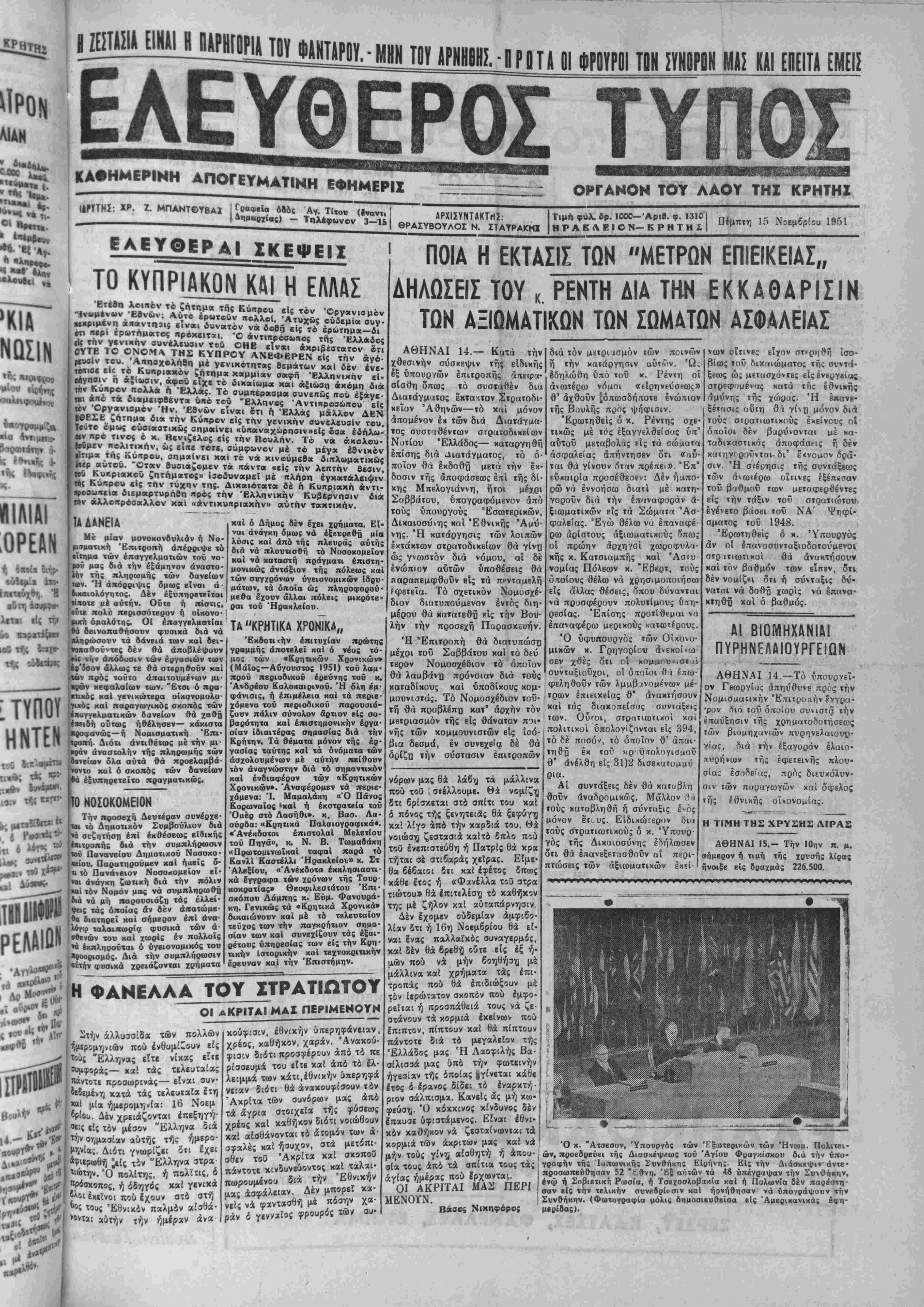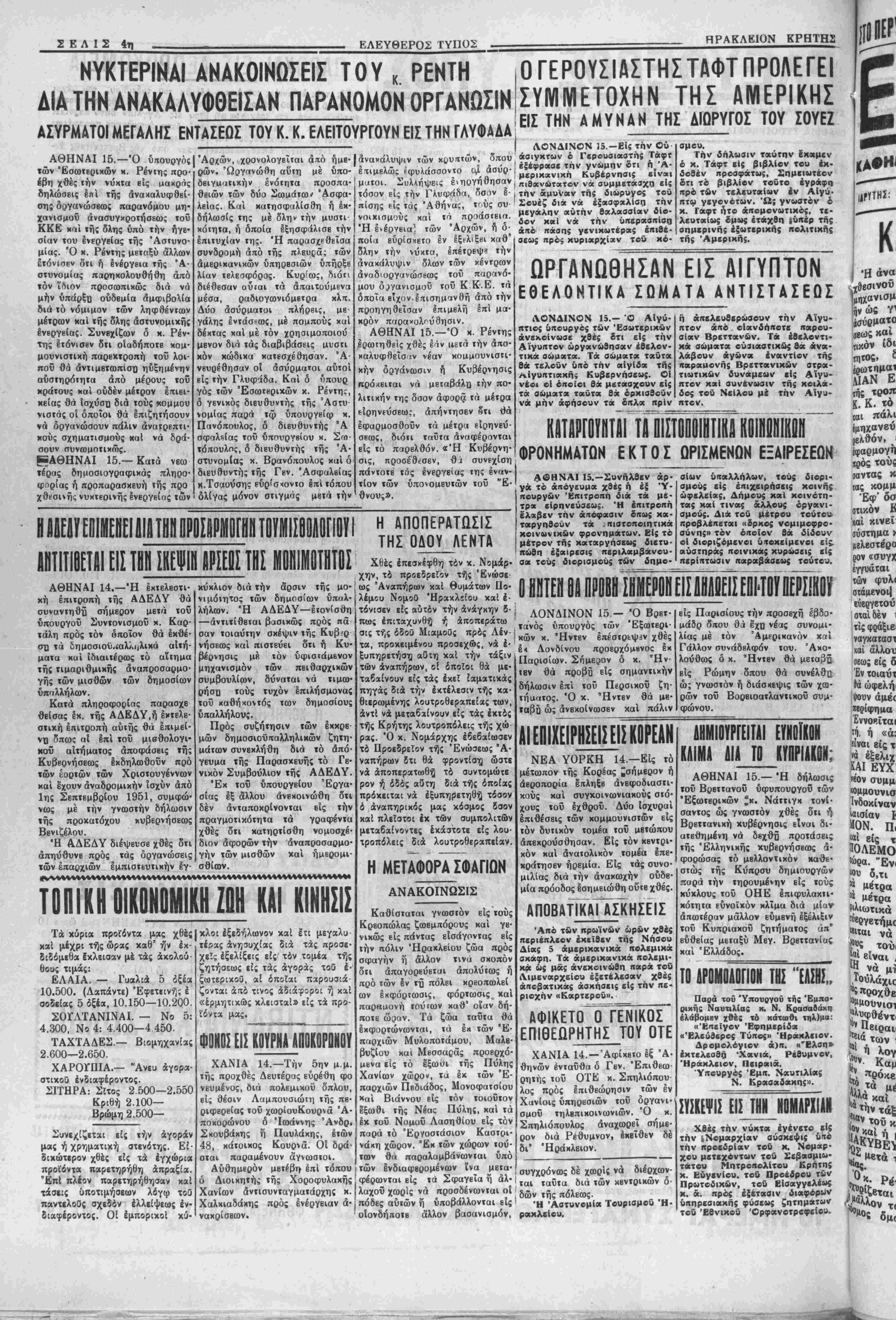 πρό><ειται νά μεταβάλη την πο¬ λιτικήν της όσον άφορά" τα μέτρα είρηνεύσεως, απήντησεν θϊι <)ά εφαρμοσθούν τα μέτρα εΐρηνεύ- σεεος, διότι ταυτα άναφέρονται είς τό παρελθόν. «Ή Κυβέρνη¬ σις, προσέθεσεν, 9 λ συνεχίση πάντοτε τάς ενεργείας της εναν¬ τίον των ύπονομβυτών τοϋ "Ε- ΰνους». ΛΟΝΔΙΝΟΝ 15.—Είς την Ού άσιγκτων β Γερουσιαατής Τάφτ εξέφρασε την γνώμην ότι ή Ά- μβρικανική Κυβέρνησις είναι πιθανώτατον να συμμετάσχη είς την άμυναν τής διωρυγος τού Σοοέζ διά νά εξασφαλίση την μεγάλην αυτήν θαλασσίαν δίο- ώον κκΐ νά την υπερασπίση άπό πάσης γενικοτέρας έπιθέ- σεως πρός κυριαρχίαν τοΰ κό- ομού. ~ ' * Την δήλωσιν ταύτην Εκαμεν ο κ. Τάφτ εις βιβλίον τού εκ¬ δοθέν πρόσφατος, Σημειωτέον δτι το βιβλίον τούτο έγράφη προ των τελευταίαν έν ΑΙγΰ· πτω γβγονότων. Ώ; γνωστόν ό κ. Γοτφτ ήτο άπομονωτιχός, τε- λίυταίως ομ«ς έτάχθη ίΰπέρ της οημερινης έξωτκρικής «ολιτιχής τής Αμερικήν ΩΡΓΛΝΩΘΗΣΛΝ ΕΙΣ ΑΙΓΥΠΤΟΝ ΕΘΕΛΟΝΤΙΚΑ ΣΟΜΑΤΑ ΑΚΤΙΣΤΑΣΕΟΣ ΛΟΝΔΙΝΟΝ 15.- Ό ΑΙγύ- τττιος ύπουργός των Έσωτερικων ανεκοίνωσε χβές δτι είς την Αίγυπτον ώργανώθησαν έθελον- τικά σώματα. Τα δώματα ταυτα βά τελοΰν υπό την αΐγίδα τής Αιγυπτιακάς Κυβερνήσεως. ΟΙ νέοι ο! οποϊοι 8ά μετάσχουν είς τα αώματα ταυτα θά ορκιαθοΰν νά μην άφήσβυν τα οπλα ηρΐν ή άκβλευθερώαουν την Αίγυ¬ πτον άπό βίανδήιτοτε παρου¬ σίαν Βρεττανών. Τα έθβλοντι- κά σώματα ούσιαστικώς θα άνοτ- λάβουν αγώνος εναντίον τής παρααονής Βρεττοτνικών στρα¬ τιωτικών δυναμεων είς Αίγυ¬ πτον καί συνένωσιν τής κοιλά¬ δος τοϋ Νίίλου μέ την Αίγυ¬ πτον. τα πΐΣΤοηοιιιτΐϊί κοιι ΦΡΟΝΗΜΑΤΟΝ Ε Κ Τ Ο Σ ΩΡΙΣΜΕΝΟΝ ΕΞΑΙΡΕΣΕΟΝ «ΙΤΠΙΟΕΤΑΙΕΙΙ ΤΗΝ ΠΗ ΑΡΣΕΙΙΣ ΤΗΣ ΙΗΙΙΙΤιΊΚ ΑΘΗΝΑΙ 14.—Ή εκτελβστι- έπιτροπή της ΑΔΕΔΥ θά ηθΉ σήμερον μετά τοΰ ΰπουργοϋ Συντονισμοϋ μ. Καρ- τάλη πρός τόν βποϊον Οά έκθέ· ου τα δημοσίου.£αλλΐ|λικά α'ιτή- ματα και ιδιαιτέρως τό αΐΐημα τής τιμαριθμικής άναπροσαρμο- γής των μισθών των δημοσίων ύπαλλήλων. Κατά πληροφορίας παρασχε Οείσας εκ. τής ΑΔΕΔΥ,ή εκτελε· στική έπιτροπή αύιής θά επιμεί¬ νη όπως αί §πί τοϋ μιβθολογι· κου αίτήματος άποφάσεις τή; ΚυβΒρνήσεω; έκδηλωθοϋν πρό των εορτών των Χριστουγέννων «αί εχουν άναδρομικήν Ισχύν άπό 1ης Σεπτεμβρίου 1951, συμφώ¬ νως μέ την γνωστήν δήλωσιν τής προκατόχου κυβερνήσεως Βενιζέλου. Ή ΑΔΕΔΥ διέψευσβ χθες ότι απηύθυνε πρός τάς δργανώσεις των επαςιχιών εμπιστευτικήν εγ¬ κύκλιον διά την άρσιν τής μο· νιμόιητος των δημοσίων ΰπαλ- λήλων. Ή ΑΔΕΔΥ—ετονίσθη —άντιτίθεται βασικώς πρός πά σαν τοιαύτην σκέψιν τής Κυβ=ρ νήσεως καί πιστεύει δτι ή Κυ¬ βέρνησις μέ τόν ύφισΐάμενον μηχανισμόν των πειθαρχικών συμβουλίων, δύναται νά τιμω- ρήσχ) τούς τυχόν Ιπιλήσμονας τοϋ καθήχοντός των δημοσίου; ύπαλλήλους. Πρός συζήτησιν των Ικκρε- μών δημοσιοϋιταλληλικών ζητη- μάτων συνεκλήθη διά τό άπό- γευμα τής Παρασχευής τό Γε¬ νικόν Συμβούλιον τής ΑΔΕΔΥ. Έκ τοΰ ύπουργείου Εργα¬ σίας εξ άλλου ανεκοινώθη δτι δέν άνταποκρίνονται είς την πραγμοτικότητα τα γραφέντα χθές ότι κατηρτίσθη νομοσχέ¬ διον αφορών την άναπροσαρμο· γήν των μισθών καί ήμερομι- σθίων. ΤΟΠΙΚΗ 0ΙΚ0Ν0ΜΙΚΗ ΖΟΗ ΚΑΙ ΚΙΝΗΣΙΣ Τ ά κύρια προΐόντα μας χθές| χαί μέχρι τής ώρας καθ5 ή έκ- διδόμεθα εχλεισαν μέ τάς άχολού· θους τιμάς: ΕΛΑΙΑ. — Γυαλιά 5 δξέα 10.500. (Λαπάντε) Έφετεινή; έ σοδείας 5 δξέα, 10.150—10.200. ΣΟΓΑΤΑΝΙΝΑΙ. — Νο 5: 4.300, Νο 4: 4.400—4 450. ΤΑΧΤΑΔΕΣ.— Βιομηχανίας 2.600—2.650. ΧΑΡΟΠΉΑ.— Άνευ άγορα- στικοθ ένδιαφέροντος. ΣΙΤΗΡΑ: Σΐτος 2.500—2.δδΟ Κριθή 2.100— Βρώμη 2.500— Συνε