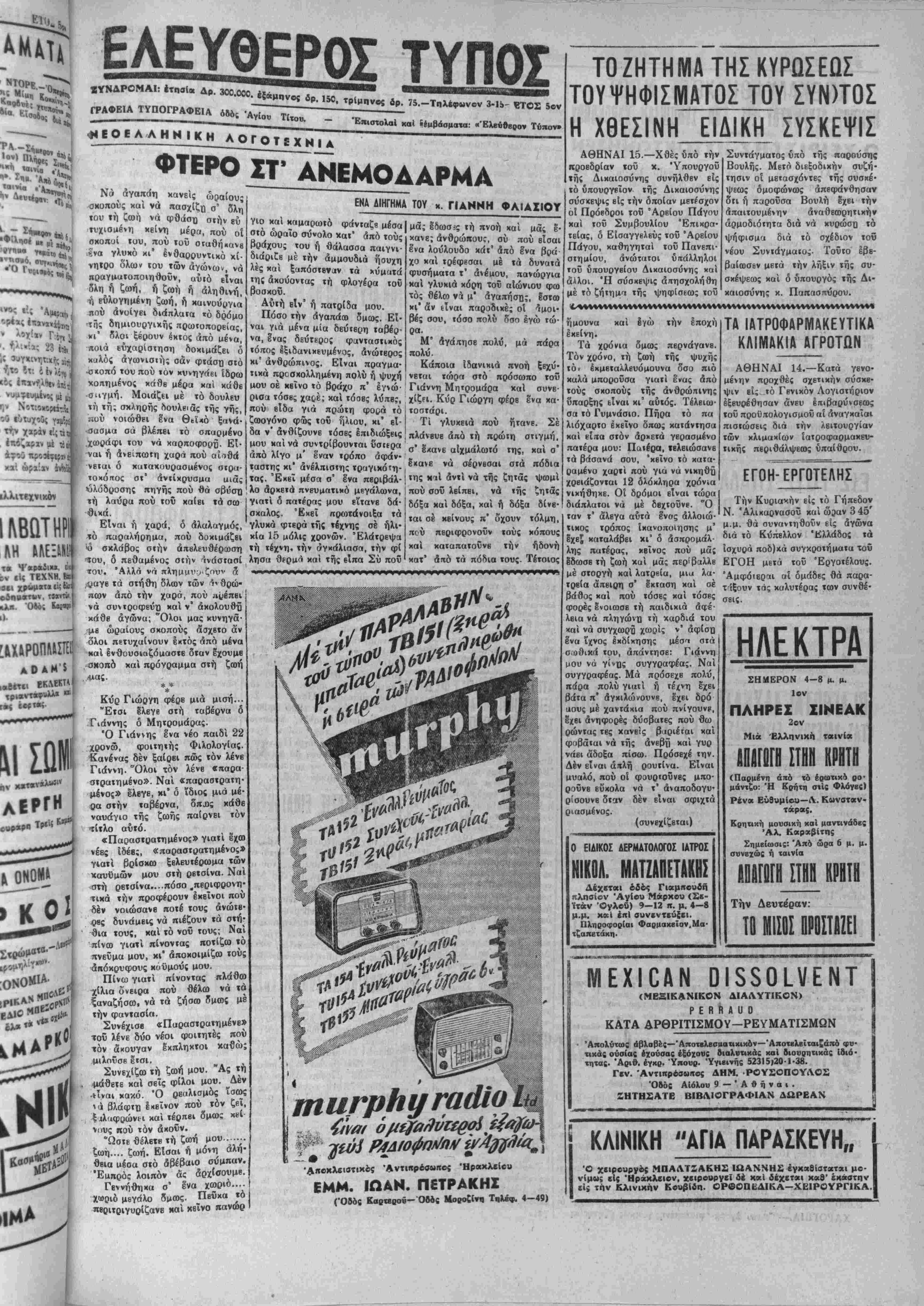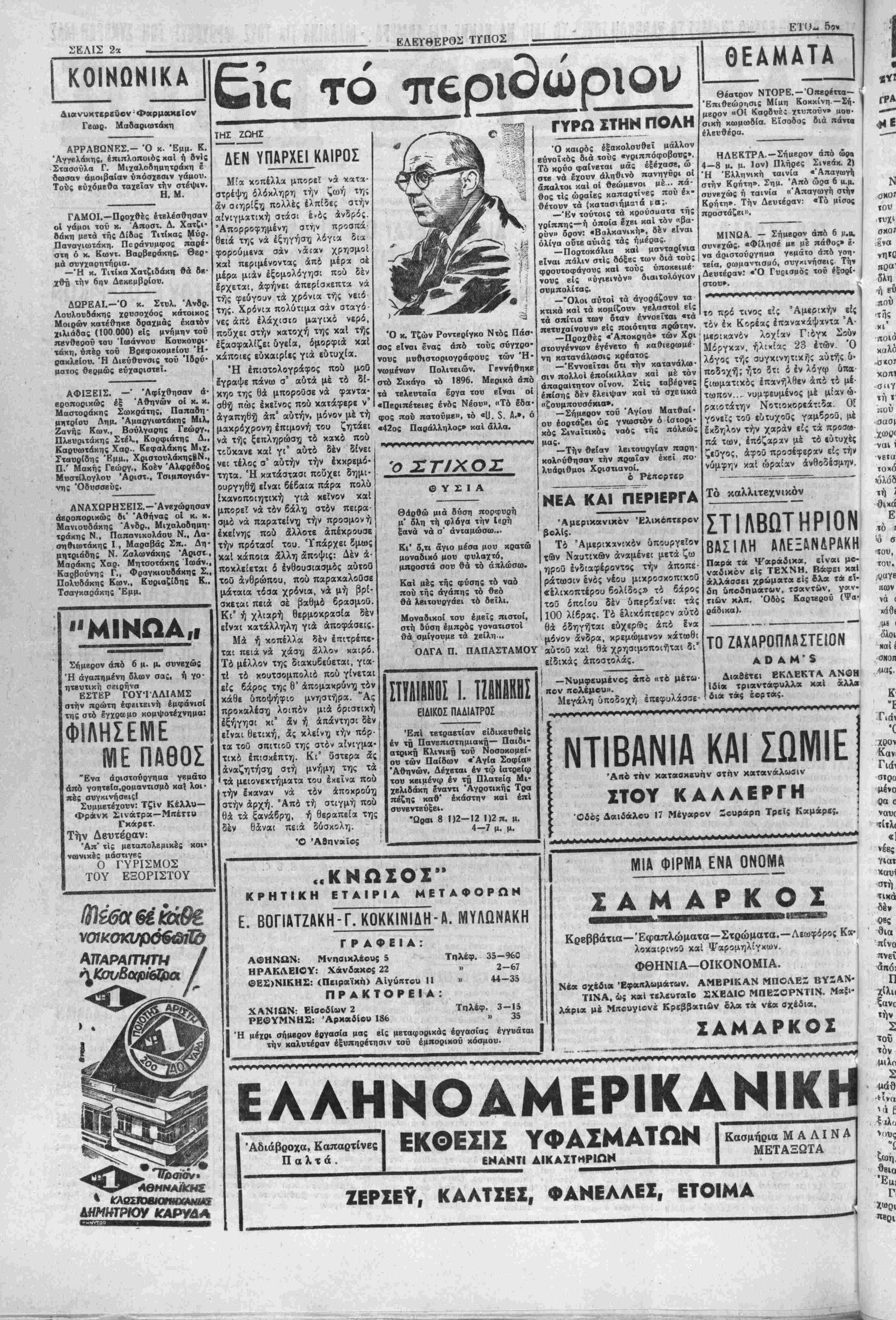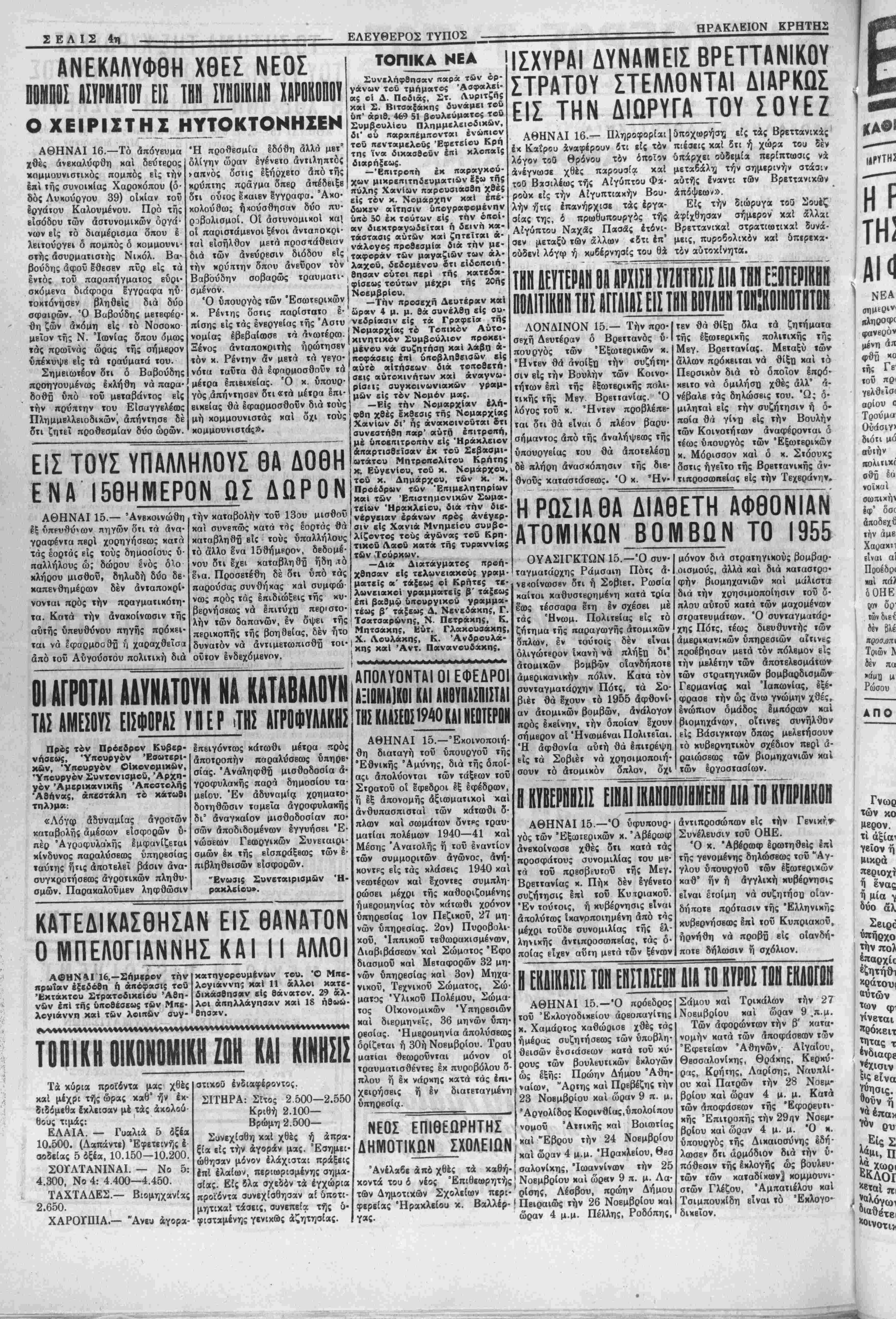 ματεϊς <*.' τάξεως οί Κρήτες τε λωνειακοί γραμματεΐς β' τάξεως επί βαθμω ' Δ. Νενεδακης, Γ. ΑΘΗΝΑΙ 16.— Πληροφορίαι |δποχωρήσΐΒ είς τάς Βρεχτανικάς' έκ Καίρου χναφέρουν δτι είς τόν πιέσεις καί δτι ή χωρ» τού δέν λόγον τοθ θρόνου τον οποίον δπάρχει οδδεμία περίπτωσις νχ άνέγνωσε χθές παρουσία καί μεταδάλιτ] την σημερινήν στάοι* τοθ Βασιλέως τής Αιγυπτου Φα· αύτί)ς ϊνανχι των Βρεττανικόν ρούκ είς την ΑΕγυπτιακήν Βου· άπόψεων». λήν ήτις έπανήρχισε τάς έργα- Είς την διώρυγα τοθ ΣουΙζ οίας της, ό πρωθυπουργος τής αφίχθησαν αίιμιρον' καί δλλαι Αιγυπτου Ναχάς Πασάς έτόνι- ΒρεττανικαΙ στρατιωτικαί δυνά- σεν μεταξύ των άλλων «δτι επ9 μεις, πυροβολικόν καί δπερεχα- οοδενί λόγφ ή κυβέρνησις τού ΘΑ τον αύτοκίνητα. ΤΗιΊ ΙΕΥΤΕΡΙΗ 01ΠΡΧΙΙΗ ΣΥΖΗΤΗΣΙΣ ΔΙΑ ΤΗΙΙ ΕΞϋΤΕΡΙΚΗΓί ΠΟΛΙΤΙΚπΙΙ ΤΗΣ ΕΓΓΛΙΑΣ ΕΙΣ ΤΗΗ ΒΟΥΑΗιΊ ΤΟπίΚΟΙΗΟΤΗΤίϊίΊ ΛΟΝΔΙΝΟΝ 15.— Την προ- σεχή Δευτέραν δ Βρεττανός υ- πουργός των Εξωτερικών κ. 'Ηντεν θά άνοίξϊΐ την συζήτη¬ σιν είς την Βουλήν των Κοινο- ΐήΐων επί τής εξωτερικάς πολι- τικής τής Μεγ Βρεττανίας. Ό λόγος τοΰ κ. Ήντβν προβλέπβ- ται δτι θά είναι δ πλέον βαρυ* σημαντος άπο τής άναλήψεως τής ύπουργείας τού θά άποΐβλέσΉ δέ πλήρη άνασκόπησιν τής διβ· θνοΰς καταστάσεως. Ό κ. Ήν· τβν θά θίξη δλα τα ζητήματα τής έξωΐερικίίς πολιτική; τη; Μεγ. Βρεττανίας. Μβταξύ «ών άλλων ποόκειται νά -θίξχι καί τα Περσικόν διά τό οποίον επρό¬ κειτο νά ομιλήση χθές άλλ' «- νέβαλβ τάς δηλώσβις τού. Ώ; δ- μιληταί είς την συζήτησιν ή δ- ποία θά γίνη είς την Βουλήν των Κοινοτήτων άναφέρονται δ τέως ύΐιουργός των Εξωτερικών κ. Μόρισσον καί δ κ. Στόουκς δστις ήγεΐτο τής Βρβττανικής άν· τιπροσωπείας είς την Τεχεράνην. Η ΡΩΣΙΑ8Α ΔΙΑΘΕΤΗ ΑΦΘΟΝΙΑΝ ΑΤΟΜΙΚΩΝ ΒΟΜΒΩΝ ΤΟ 1955 δυνατόν νά άντιμετωπισθη τοι· άπο ιοϋ Αΰγοΰστου πολιτική διά οϋτον Ινδεχόμενον. ΟΙ ΑΓΡΟΤΑΙ ΑΑΥΝΑΤΟΥΝ ΝΑ ΚΑΤΑΒΑΑΟΥΝ ΤΑ! ΑΜΕΙΟΐ! ΕΙΣΦΟΡΑΣ ΥΠΕΡ .ΤΗΣ ΑΓΡΟΦΥΑΑΚΗΣ Πρός τον Πρόεδρον Κυβερ- Ιπειγόντως κάτωθι μέτρα πρό Χ. Λουλάκης, Κ. Άνδρουλα- κης καί Άντ. Πανανουΰακης. νήοενς, Ύπουρνόν Έσωτερι- κων, 'Υηουργόν Οικονομικήν, Υπουργόν Συντονισμού, Αρχη¬ γόν Άμερικανικής Άιτοστολής Αθήνας, απεστάλη τό κάτωθι τηλ)μα: «Λόγφ δδυναμίας αγροτών καταβολής άμέσων εισφορών υ- πέρ Άγρΰφυλακής εμφανίζεΐαΐ κίνδυνος παραλύσεως υπηρεσίας ταύτης ήτις αποτελεί βάσιν ανα¬ συγκροτήσεως άγροτιχών πληθυ- σμών. Παρακαλούμεν ληφθώσιν αποτροπήν παραλΰοεως ύαηρε οίας. Άναληφθί μισθοδοσία ά· γροφυλακής παρά δημοσίου τα μείου. Έν άδυναμίςι χρηματο δοτηθώσιν τυμεΐα άγροφυλακήι δι° δναγκαίον μισΰοδοσίαν πό σών άποδιδομένων ΙγγυήΌει *Ε νώσεων Γεωργικών Συνεταιρι σμών έκ τής βίσπράξεως των ε πιβληθεισών εισφορών. "Ενωσις Συνεταιρισμών ρακλείου». Ή- ΚΑΤΕΔΙΚΑΣΘΗΣΑΝ ΕΙΣ ΘΑΝΑΤΟΝ 0 ΜΠΕΛΟΠΑΝΝΗΣ ΚΑΙ II ΑΛΛΟΙ ΑΟΗΝΜ 16.-Σήμερον την πρωΐαν εξεδόθη ή απόφασις τοΰ Έκτακτου Στρατοδικβίου Αθη¬ νών επί της ΰποθέσϊως των Μπκ- λογιάννη καί των λοιπών συγ- κατηγβρουμένων τού. Ό Μπβ- λογιαννης καί 11 άλλοι κατε- δικάαθηααν βΐς θάνατον. 29 άλ¬ λαι απηλλάγησαν και 18 ήθωω- θησαν. Τ0Π1ΚΗ ΟΙΚΟΝΟΜΙΚΗ ΖΟΗ ΚΑΙ ΚΙΝΗΣΙΣ Τα κύρια ηροΐ'όντα μας χθές χαί μέχρι τής ώρας καθ ήν έκ- διδόμΐθα ίκλεισαν μέ τας άκολού- θους τιμάς: ΕΛΑΙΑ. — Γυαλιά 5 δξέα 10.500. (Λαπάντε) Έφετεινής έ αοδείας 5 δξέα, 10.150—10.200. ΣΟΓΛΤΑΝΙΝΑΙ. — Νο 4.300, Νο 4: 4.400—4.450. 5: ΤΑΧΤΑΔΕΣ.— Βιομηχανίας 2.650. ΧΑΡΟΪΠΙΑ.— Άνε« αγορα- στικοϋ ένοΊαφέροντος. ΣΙΤΗΡΑ: Σϊτος 2 500—2.550 Κριθή 2.100— *-« Βρώμη2.5ΟΟ— Συνεχισθή καί χθές ή άπρα· ξία είς την αγο