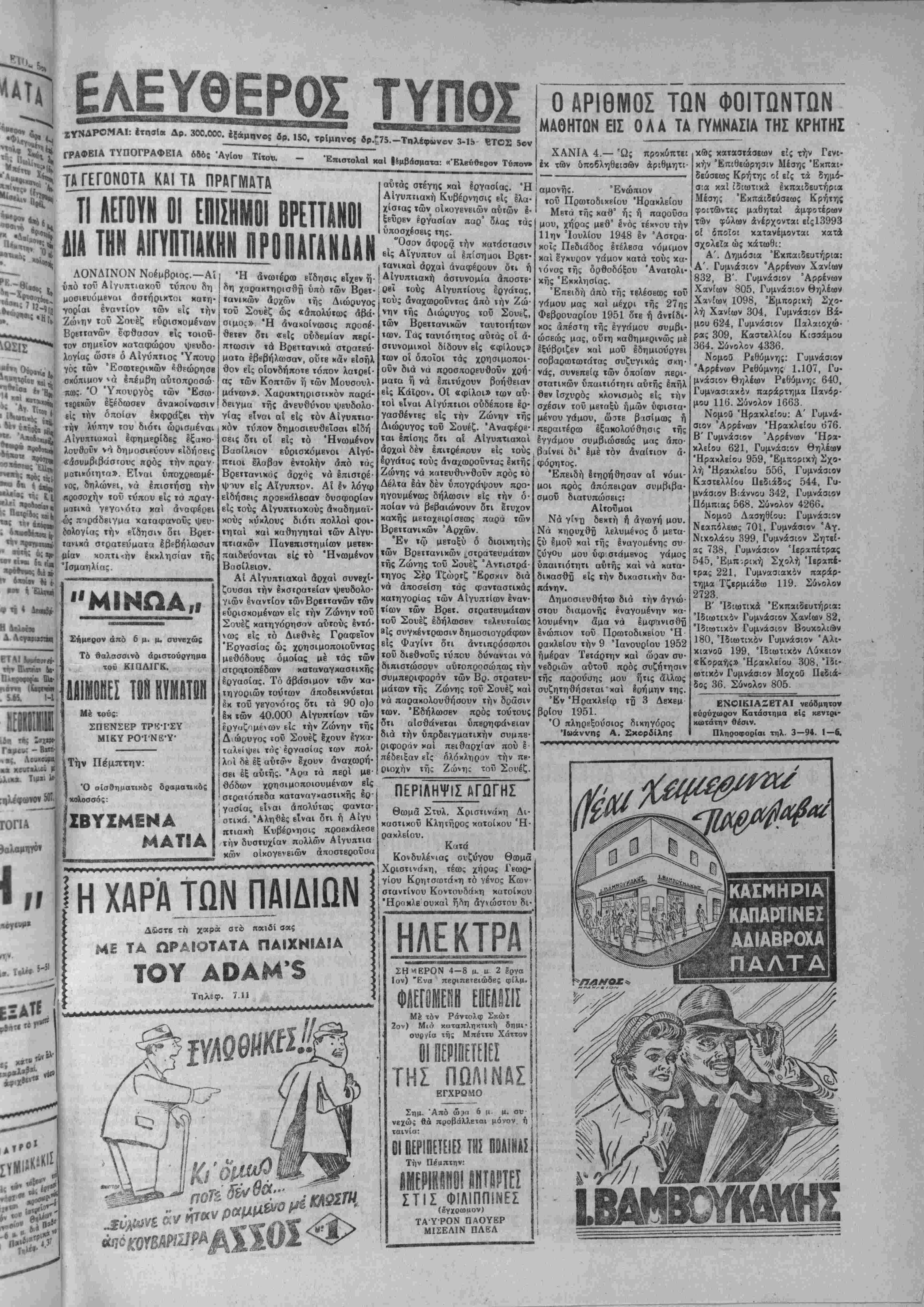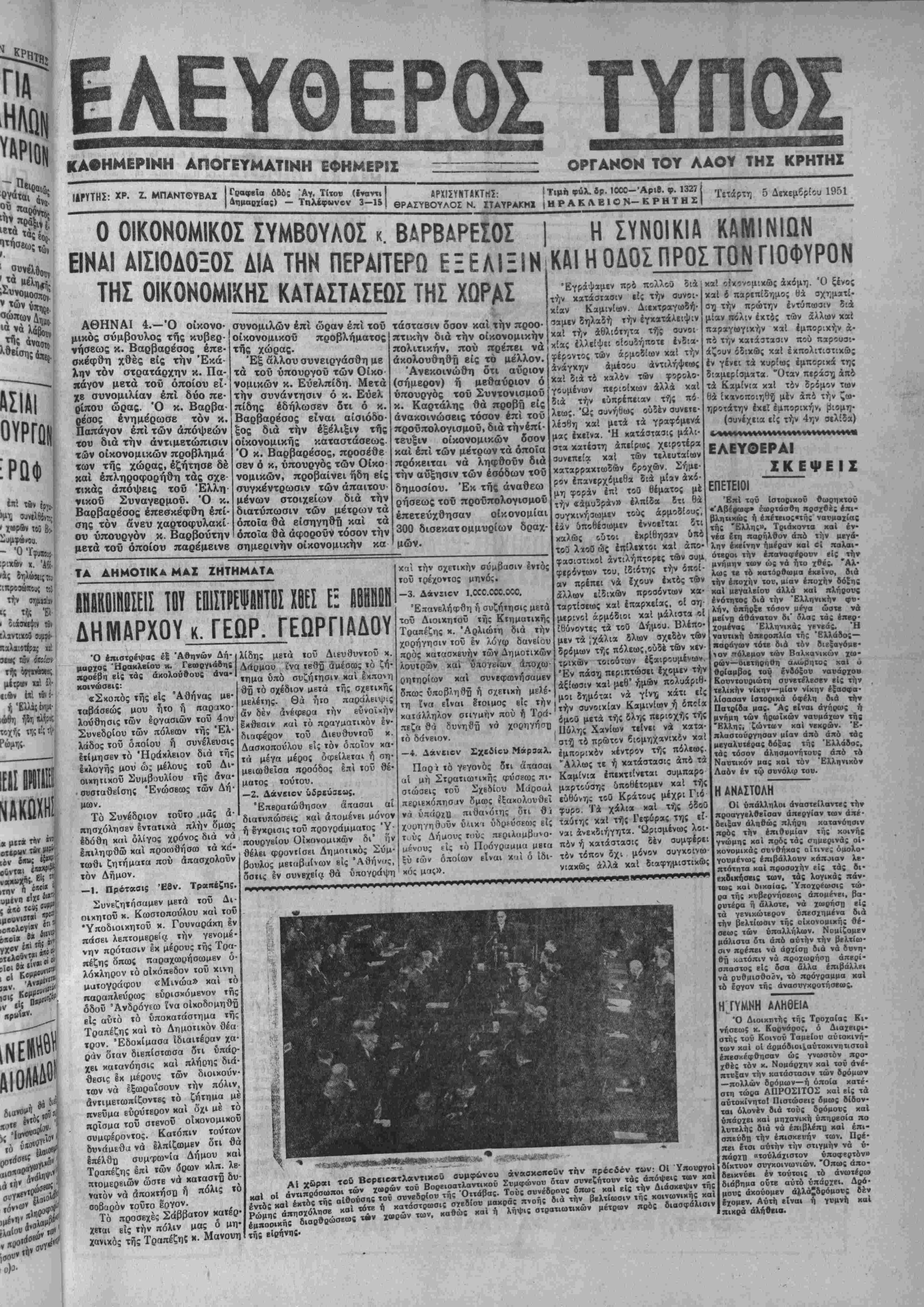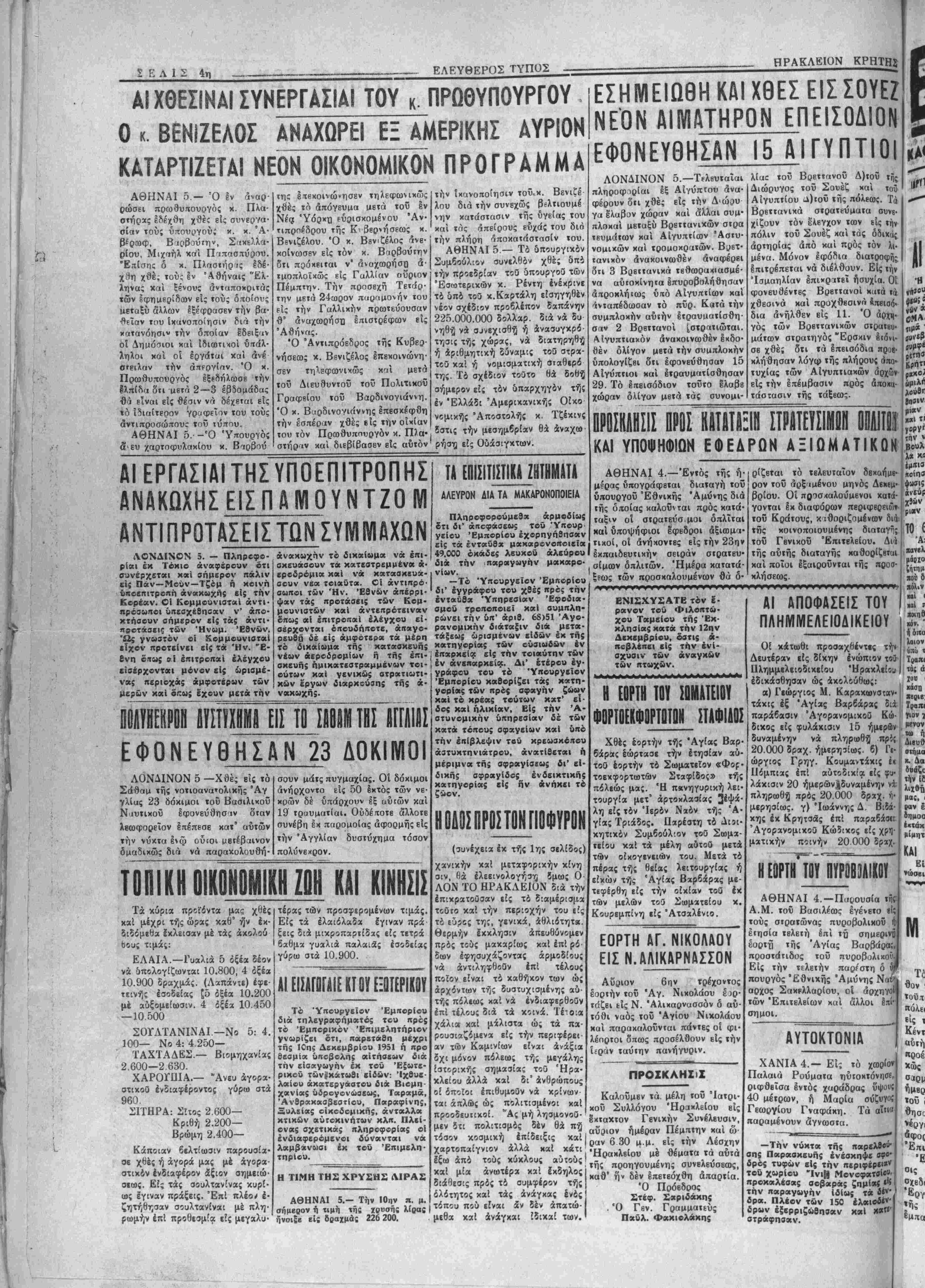 £τ<φ. Σαριδάκης . Ό Γεν. Γραμματεύς Παδλ. Φακιολάκης ώργιος Γρηγ. Κουμαντίκις Ιΐόμπιας επί αύτοδικία είς φυ¬ λάκισιν 20 ήμερων|δυναμένην νέ λθ 20 μενον 1 ιω ή Διευθ στήμα κ. Δα βνάζε την ί£ λ μη πρός 20.000 δραχ. ή μερησΕως. γ) Ιωάννης Δ. Βιίά κης έκ Κρητσάς επί παραβάοι ΆγορανομικοΟ Κώ5ικος είς χρτ) ματικήν ποινήν 20 000 δρζχ, ΒΕΒΡΤΗ ΤΒΥ ΒΤΡ0Β3ΑΙΚΒΪ ΑΘΗΝΑΙ 4.—Παςιουσία τί Α.Μ. τοΰ Βασιλέως εγένετο ί τούς στρατώνας πυροβολικοΰ ετησία τβλεΐή επί τή σημερινι έορτί) της Άγίας Βαρβάραι προστάτιδος τοΰ πυροβολικοθ Είς την τιλεΐήν παρέστη δ πουργός Έθνιχής Αμύνης Να^ αρχος Σακίλλαρίου, οί άρχηγο των 'Επιτκλβίων «αί αλλοι 1πί· σημοι. μοί, ι ραν έ Οημοα έκτάκ μίμητ ΚΑΙ Εί νώσβι ΑΥΤΟΚΤΟΝΙΑ ΧΑΝΙΑ 4.— Εις τό Παλαιά Ρούματα ριφθβΐσα εντός χ«ράδρας ΰψους 40 μειρων, ή Μαρία σύζυγοί Γεωργίου Γναφάκη. Τα αϊ»« παραμένουν άγνωστα. —Την νύκτα τής ηαρϊλββώ· ής Παρασκευής ενέσκηψε β?β' ιρό; τοφών ε($ την περιφερε·*ν βϋ χωρίου -Ινι|§ ΜονοφατβίβΜ. τροκαλβσιχς σοβαρά; ζημίαι||$ εην παραγωγήν ιδίως τα ίίν ρα. Πλέον των 150 έλαιοδίν δρο»ν έξβρριςώβποαν καί οτράφηοαν. Μ Τί θον τοϋ,τ ηόλει βίς ι Κέντ αύτη προέ Χώς ρμ ήμβρ τοϋ ι θησο 'έργι φ( "Επι Έ σις «μπα