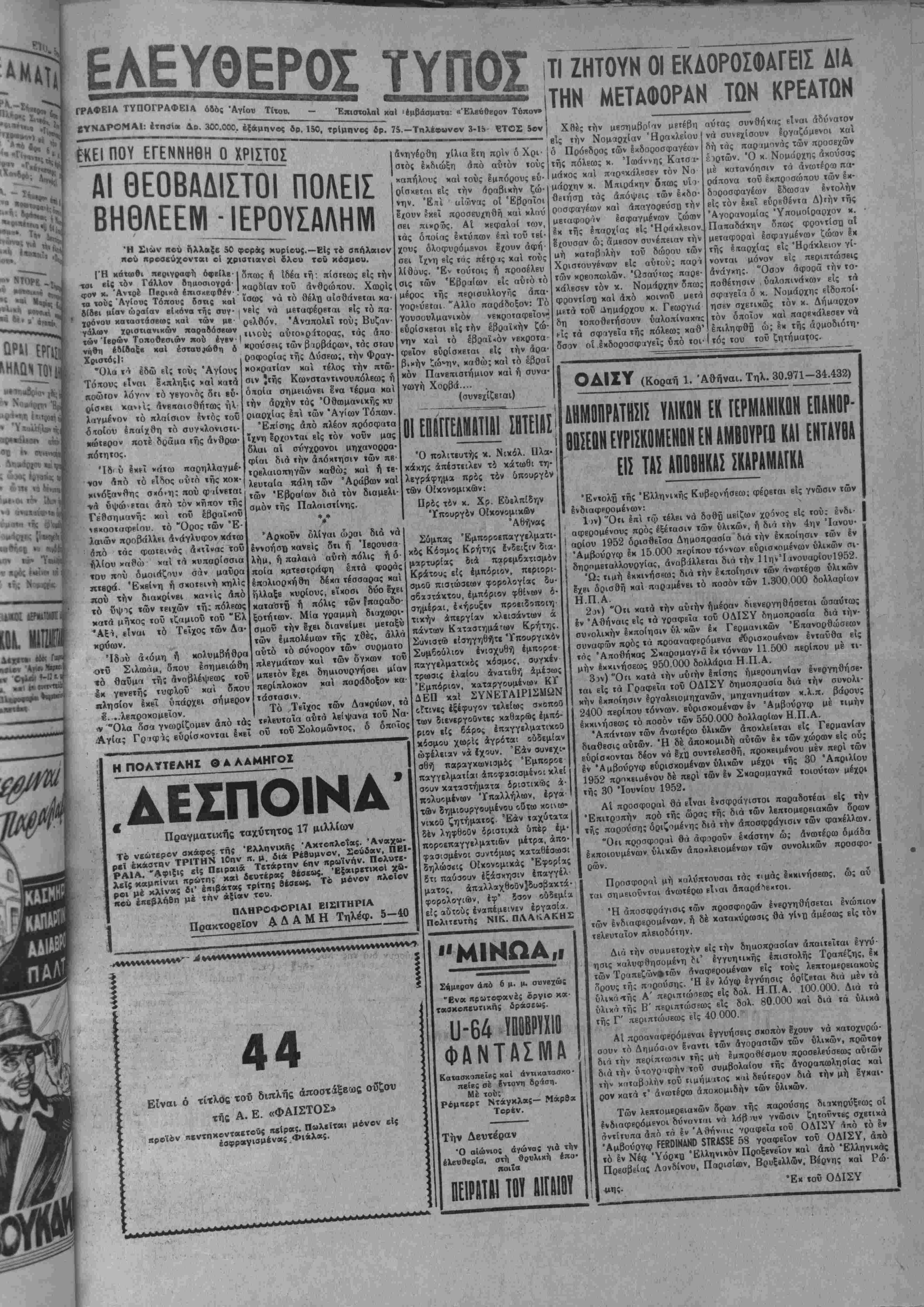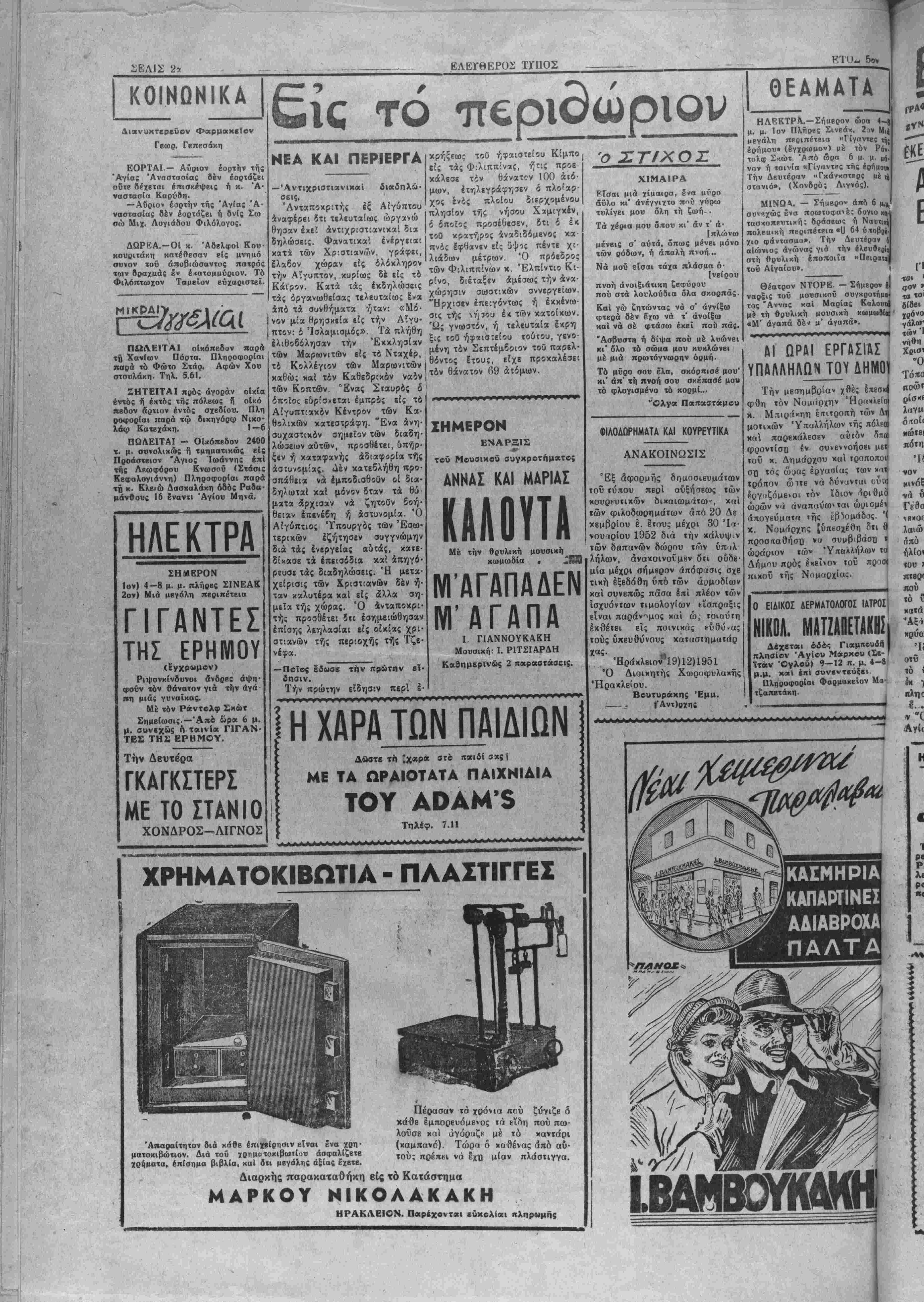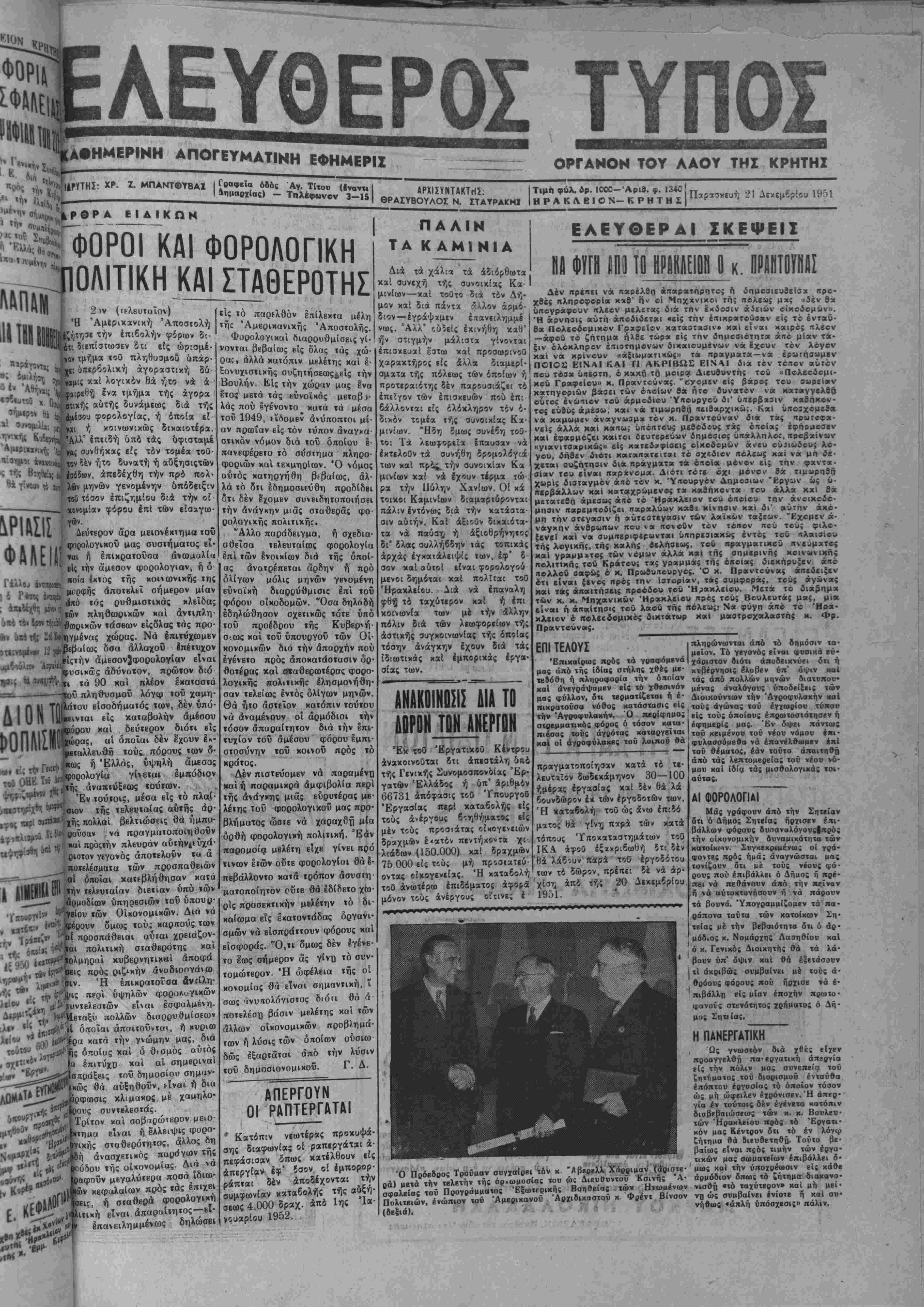 ηου τόσκ ΰηεβτη, ό κ»χή τή μοιρα Διευθυντάς τού ι<Πολβοδομι· κου Γραφΐίου» χ. Πραντοΰνας. " έχομε ν βϊς βαρος τού σωρείαν κατηγορίαν βαοει των οποίων 8α ήτο δυνατόν να Ματχγνελθτ) ούτος ενώπιον τού άρμοδιου Ύκοΐιργοϋ δι' ΰιτβρβχσιν καθηκον- τος ευθύς άμκοω, χαι ά τιμυρηθή «ίΐθχρχικω;. Και ΰπαχομείχ να κάμωμεν άναγνωαμ* τον κ. Πραντούνιχν δια τα; τρωτεφχ- νΐϊ; άλλα και κααω; ϋποιττους μεθβδου; τχς οιτοίας έςρηρμοββν καί έφιχρμοζβι κοιίτοι ίευτερεΰνίν δημόβιος ΰπβλλπλοο, προβαίνων ιιγιβνιτσαρικϊΐί" εί: κχτ«δ?φΐοβις οΐκοδομϊιν ανευ οΰιιωδου; λο· γου, δηθεν διότι κκταηχτειται τό αχεδιον ηόλεως καί να μπ ύε· χΐται ουζήτησιν δια ηρκγμκτκ τα οηοϊα μόνον εί; την φχντχ- βιχν τού ί'ιναι ιτχρχνομα. Διότι τότβ όχι μόνον 9α τιμνρηβό χωρίς διβταγμόν άηό τον κ. Υπουργόν Αημοοιυν Έργων ώ; ύ· (Γϊρβάλλων και καταχρκμβνος τα καθήχοντα τού άλλα χχΙ θχ μετατεθή άμεακς άτο το Ηρκκλκιον τού όποίου την άνοικοδό· μηβιν ηαρεμιτούιζει πχραλύυν χαβΐ κίνησιν κχι δι' αύτην άχο- μη την βτεγασιν ή αύτοστϊγααιν των λαϊκών τ«{εων. Έχομεν α¬ νάγκην άνβρωπων κου α ιτονοΰν τον τοκον πευ τού; φΐλο- ξενιϊ καί να αυμηιριφίρωντχι ΰχηρεαιακίι; έντό; τού πλαιαιου τος λογιχής, τής καλης ίιλησιω}, τού κρκγματικοΰ πνεύμχτος καί γραμμχτος των νομων άλλα χαι τής σημερινάς κοινήνικης ηολιτιχή; τού Κράτους τας γραμμάς τή; έκοιας διβκήρυ{εν άηό ηολλοϋ οαφώς ό χ. Πρωβυιουργος. Ό κ. Πραντούνας απέδειξεν ότι ιΐναι ξενος πρός την ίβτορίαν, τας αυμφορά;, τού; αγώνας και τα; άπαιτηαεις προοδου τού "Ηρακλείου. Μετα το διχβημχ των κ. κ. Μηχανικόν Ηρακλείου ηρβς τού; Βουλευτάς μα;, μιχ είναι ή άπαίτποις τού λαοΰ τής πόλεω;: Ν» φύγη άηό τό Ηρα¬ κλειον ό πολεςδομικος δικτάτωρ και μαβτροχαλαβτπς κ. Φρ. Πραντοΰνας. ΕΠΙΤΕΛΟΥΣ Έπιχαίοως πρός τα γραφόμενα μας άπό τής ιδίας στήλης χθές με- τεϊόθη ή πληροφορία την οποίαν χαΐ άνεγράψαμεν είς τό ϊθεσινόν μας φύλλον, ότι τερματίζετοι ή έ- πιχρατούσα νόθο; χατάοταοις είς την Άγοοφυλαχήν. Ο πεοίφημο;! στρεμματιχός φόρος ό τόσον χατα· Πιέσας τούς αγρότας χαταργεϊται χαί οί αγροφύλακος τού λοιπού θά πραγματοποίησαν κατά ΐό τε¬ λευταίον διοδεχάμηνον 30—100 ημέρας εργασίας καί δέν θά λα βουνδώρον έχ των έργοδοτών των. Ή καταδολή · τοθ ώς ίνιο έπιδό ματος θά γίνη παρά των κατά τόπους 'Υποκαταατημάτων τοθ ΙΚΑ άφοθ έξΐχριβωθή !τι δέν θά λάβουν Λάρα τοθ έργοδότου των το δώρον, πρέκει δέ νά άρ· χίοη απί τής 20 Δεκεμβριού 1951. πληρώνωνται άπό τό δημόσιν τα· μιίον. Τό γεγονός είναι φνσικά εύ· χάοιστον διότι άποδειχνύει ότι ή κυβέρνησις έλαβεν ύπ' όψιν καϊ τάς άπό πολλών μηνών διατυπου· μένας άναλόγους ϋποδίίξβι; των Διοιχούντων την Άγροφυλαχήν χαί τούς αγώνας τού έγΐωοίου τύποο είς τού; όποίους έπρωτοστάτησεν ή εφημερίς μας. Έν όψει πάντως τού κειμένου τοΰ νέου νόμου επι· Φΐιλαοσόμεθα νά επανέλθωμεν επί τοϋ θέματος, εάν τούτο άπαιτηθή άπό τάς λβπτομερείαί τού νέου νό¬ μου χαϊ ιδία τάς μισθολογικάς τοι¬ αύτας. ΑΙ ΦΟΡΟΛΟΠαΪ Μάς γράφουν άπό την Σητείαν ότι ό Δήμος Σητείας ήρχισεν επι¬ βάλλων φόρους 8υσαναλόγους|πρό: την οικονομικήν ουναμιχότητα των κάτοικον. Συγκεκριμένως οί γρά¬ φοντες πρός ήμά; αναγνώσται μας τονίζουν ότι μ έ τούς νέου; φό¬ ρους πού επιβάλλει ό Δήμο; ή πρέ- πει νά πεθάνουν άπό την πείναν ή νά αύΐοχτονήσουν ή νά πάρουν τα βουνά. Ύπογραμμίζομεν τα πα- ράπονα ταυτα των χατοίχων Ση¬ τείας μέ την βεβαιότητα ότι ό άρ· μόβιος χ. Νομάρχης Λασηθίου χαί ό χ. Γενιχός Διοιχητής θά τα λά
