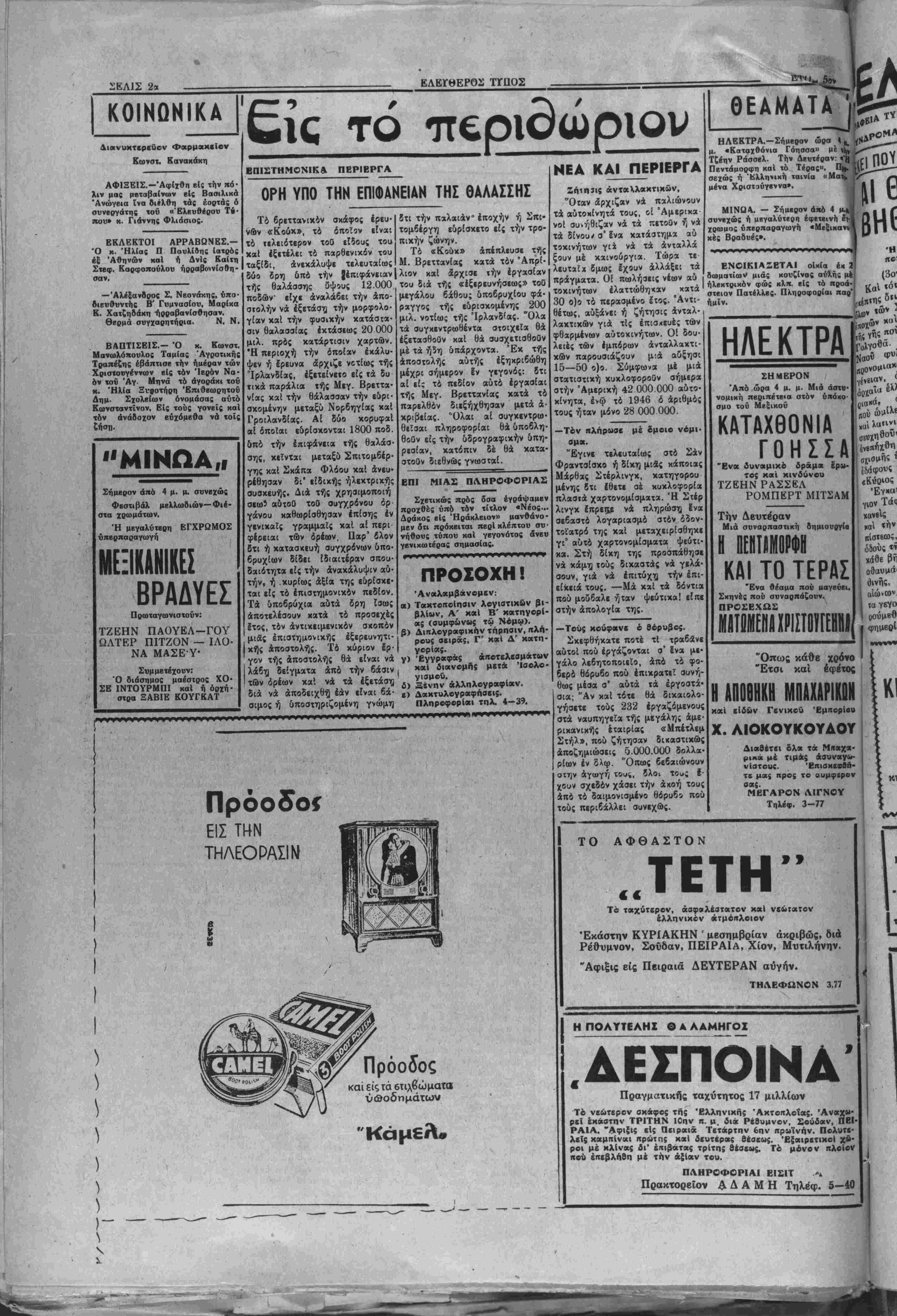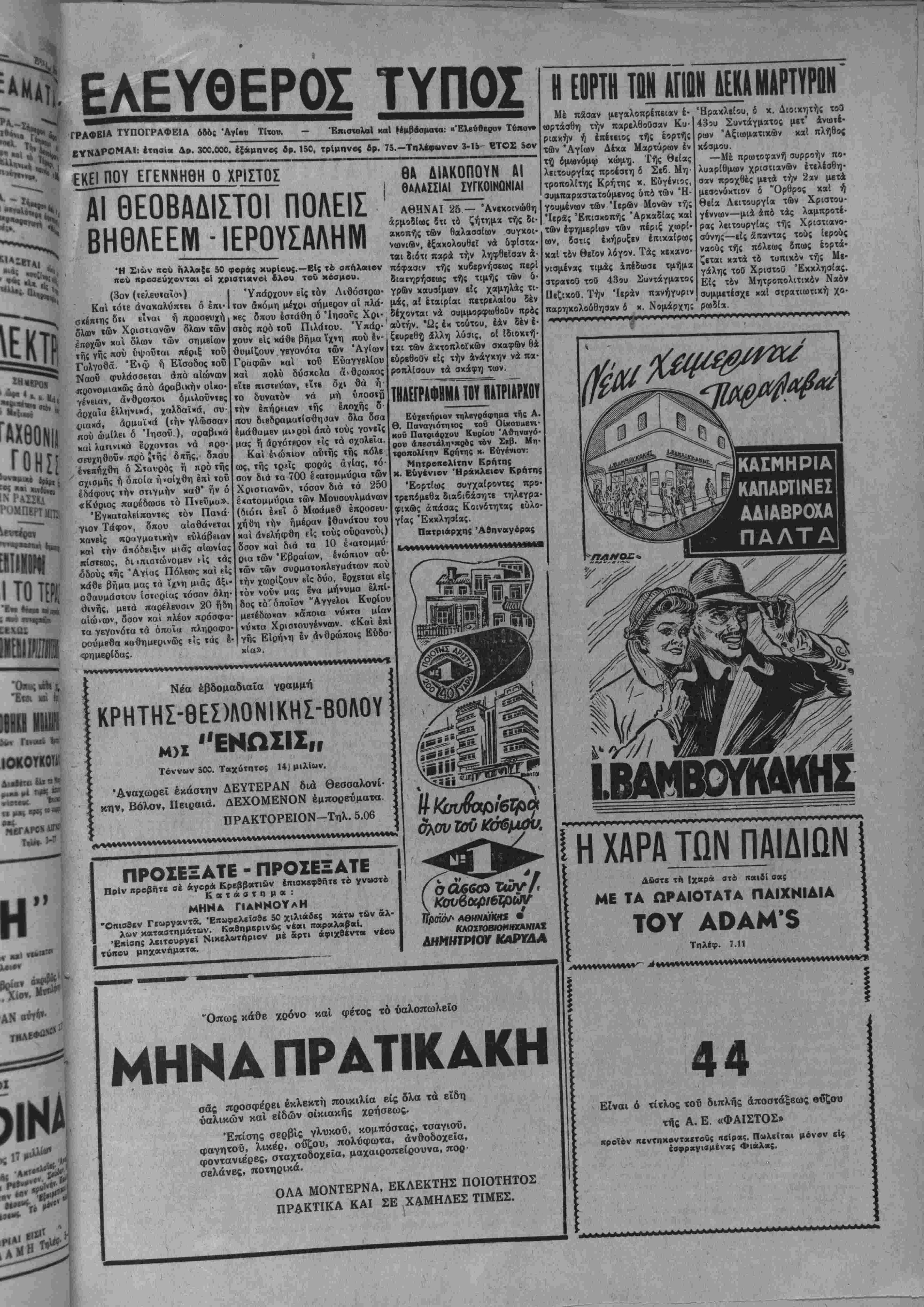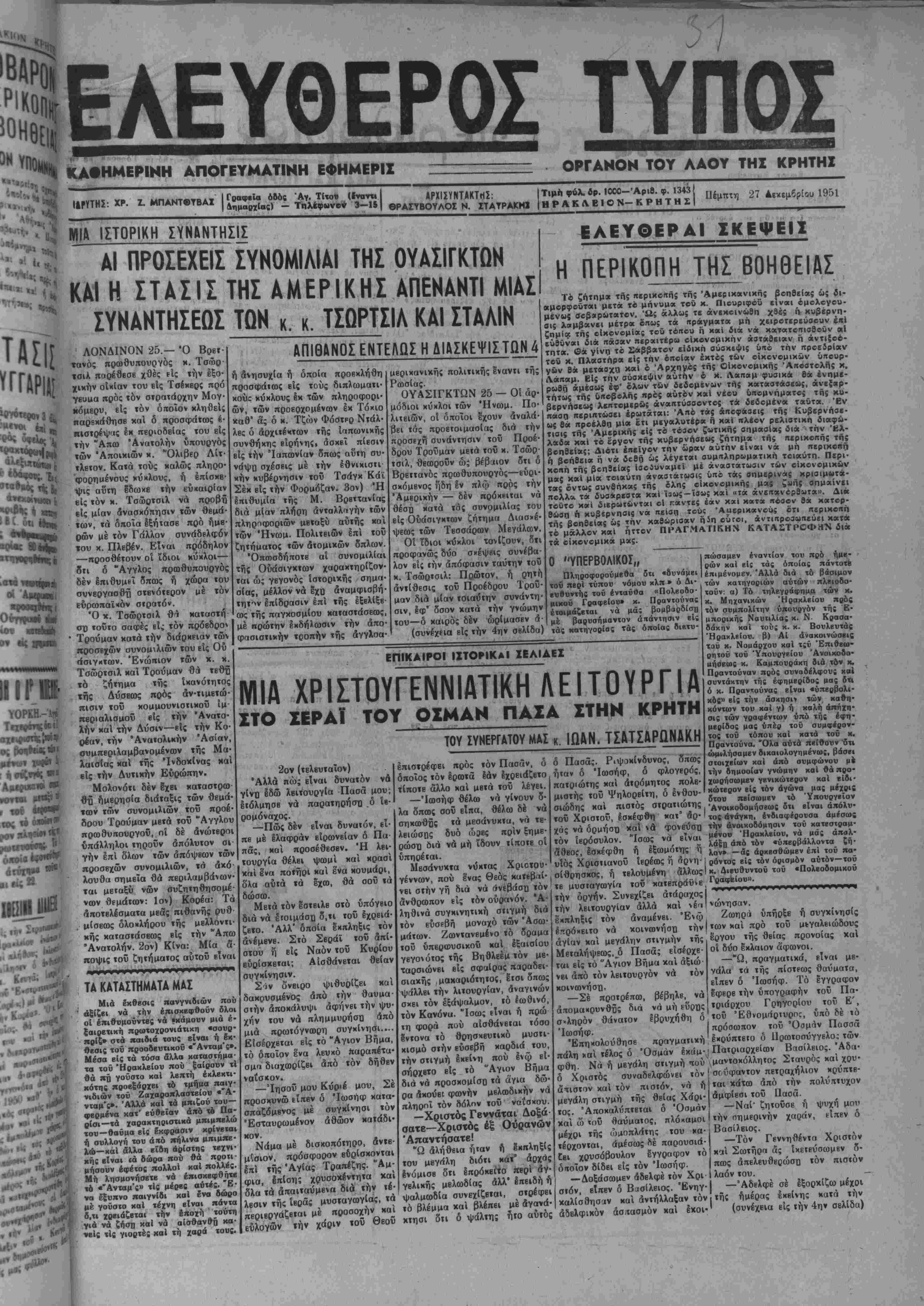 χηγο< ποστι ση «ι δέν ΑΘΗΝΑΙ 27.- Ή Άμβρι- κανική Κυβέρνησις διαβλέπου- σα ότι ήτο αδύνατον νά υπο γραφτΐ έντός τής ταχθβίσης άρ χικώς προθεσμίας ή άνακωχή βϊς την Κορέαν Ιξουσιοδότησι χθές τόν Αρχηγόν των Δυνά μεων των Ήνωμένων "Εθνών εις Άπω "Ανατολήν άντιστρά ΕΓΕΝΟΝΤΟΣΥΛΛΗΨΕΙΣ ΥΠΟΠΤΩΝ ——·ν—————————————————————————·*—————————-———_—_ ■■— ΧΑΝΙΑ 1ί5"—Αί άναχρίσεις ι σαν, είναι δέ έκ των προσχειμέ ^ ιί'ΧίβνοίνηΠ ν ίΤ/νπητ,-ΜΐΊυνη,ι Ι υι.«νι ■ ?/· τλυ ν»ι^«ΤΎί ηιηίίλν Κ λ τοθ πρός ανακάλυψιν των δρασχών τής διαπραχθείσης την νύκτα τής προχθές θρασυτάτης χλοπής, είς Κολυμβάρι Κισσάμου, είς 6ά έ ΟίνοποιητικοΟ Συ- μ συνεχίζονται μέ ρυθμόν, έλπίζεται δ" δτι έντός των ημερών ή δλη υπόθε¬ σις θά έχη διαλευχανθη". Τό κλα- πέν ποσόν εξηκριβώθη δτι είναι 158 έχατομμύρια ]6ΟΟ χιλιάδες ρος τοθ έχεΐ εταιρισμοθ, θ καρτερική προσμονή τής άπολυ· δραχμαί, σοβαραί δέ υπόνοιαι τρώσεως, ώ; δτου ή ελευθερία εγείρονται κατά τρίτον πρόσω ;αναγΰρισε στόν λαό αΰτό πού πιον, χά δποΐχ καί συνελήφθη- νων είς Κο· λυμβαρίου. Ή χλοτϊή διεπράχθη χατά πάσαν πιθανότητα δι9 άν- τικλεΐδος χωρίς οί ϊράιτχι νά άφήσουν δαχτυλιχά άποτυπώμα- τα. Τα χλοπιμαΐα μέχρι τής στΐγμής δέν ανευρέθησαν ΰκαριϊ ται δμως βέβαιον δτι οί δράσται θά άναγχασθοθν τελιχώς νά τα παραδώσουν, διότι δέν είναι δυ¬ νατόν νά τα εχουν χρησιμοποιή- ση χαί ή περαιτέρω ίπόχρυψίς των θά είναι άδύνατος. ίΐάνΐως ή θρασύτης των χλεπτών προε- ΐηγον Ριΐζγουέη δπως παρατεί¬ νη την ώ; άνω προθεσμίαν επί 30 είσέτι ημέρας. Έν τφ μβτα- ξύ οί γενόμεναι καί χΰές δια* πραγματβυσεις μβταξύ των ανΐι« προσώπων των Ήνωμένων Ε¬ θνών χαί των κομμουνισταί ου¬ δεμίαν πρόοδον Εσημείωσαν. ΛΟΝΔΙΝΟΝ 27.— Νεώτβραι πληροφορίαι άναφέρουν δτι ή- κατ' έξουσιοδότησιν τής Άμιρι- κανιχής κυβερνήσεως πρός τόν στρατηγόν Ριτζγουέη παράτασις τής αρχικώς ταχθείσης προθβ- σμίας διά την σύναψιν άναηω- χής είς την Κορέαν 8ά πραγμα· τοποιηθη έφ' δοον θά διαπιστω¬ θη δτι ΰπάρχουν ελπίδΒς συμφω¬ νίας μειαξύ των δύο παρατάξε- ων Ιντός τή; παρατάσεως ταύτης. άλλ' τούς κάλι κριΰ θείο προ1 τερ< «ίπι ναι ούς εί ν ι διά ναι μά< ή ρη ρ χάλεσεν έκπληξιν χαί χρατεΐ έν στερήση,. ζωηρά άγαναχτήσει τάν πληθυ¬ σμόν τής έτιαρχίοις Κισσάμου, έ· φίσον έΐΐρόχειτ» περί χρημάτων τα οποίαι θά εχρησιμοποιούντο διά την συγκέντρωσιν ΐοθ ελαίου άπό το&ς παραγωγούς, ή δΐϊοί» σήμερον είναι φιισιχό,ν νά χαθιι* αει κο τί αι οί μι ν π έ κ 31 Χ