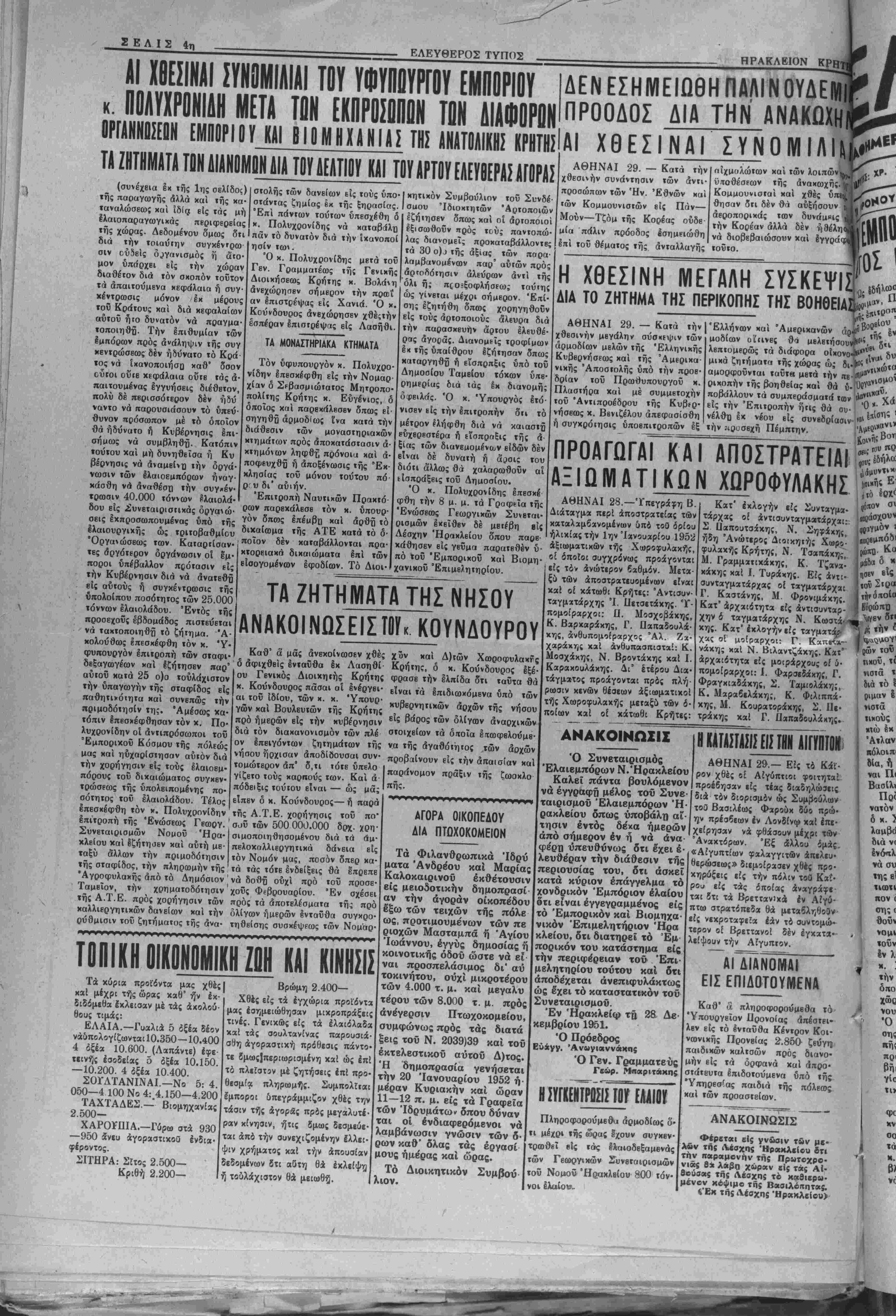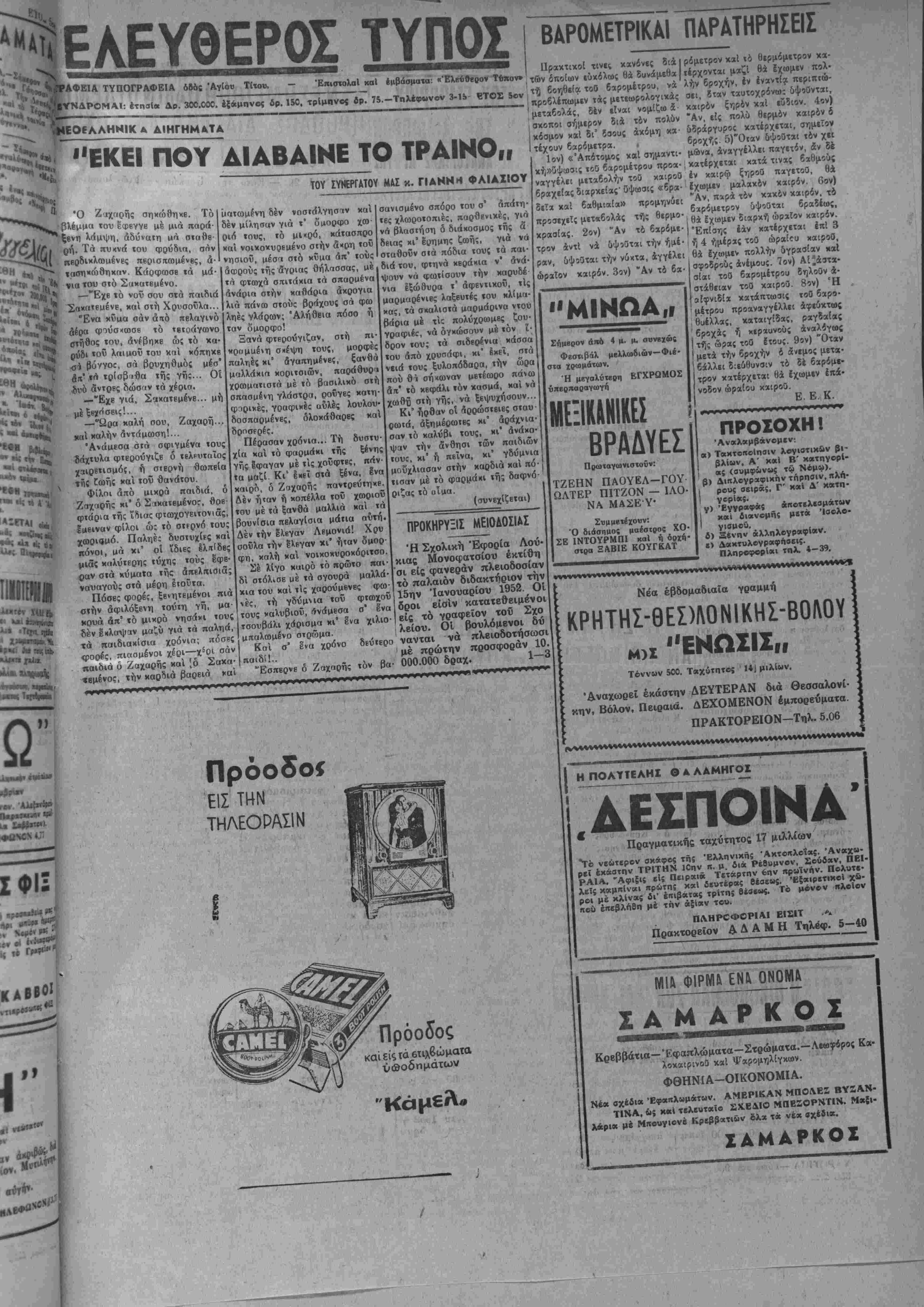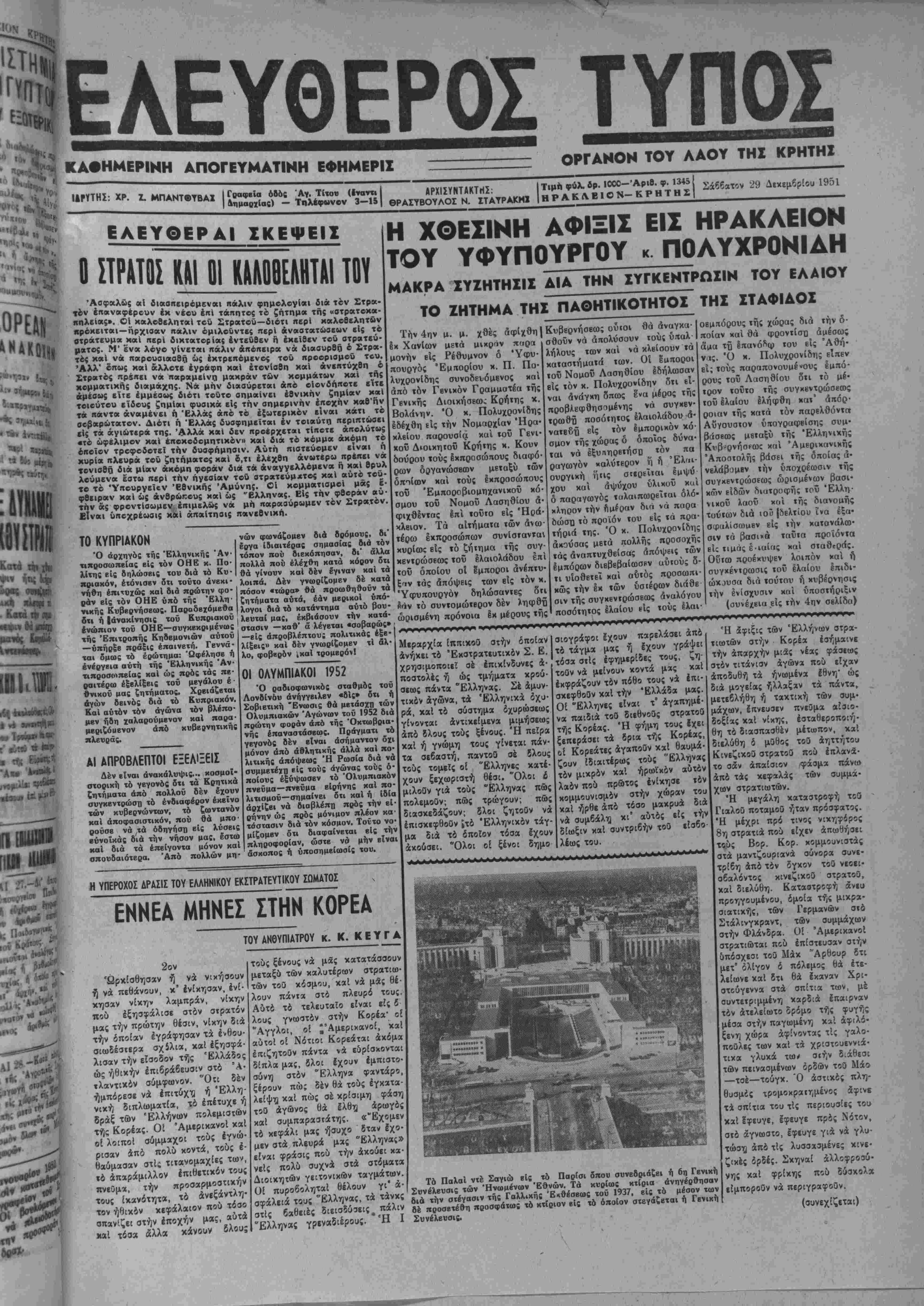 < . : είς την σημερινήν εποχήν καθ'ην - { ~**άς άπό τό εξωτερικόν β'ιναι κάτι τό , Αιοτι η Ελλάς δυσφημεϊται έν τοιαύτη περιπτώσει ϊ15 τα αγιωτερα της. Άλλά καί δεν προερχβτβι τίποτβ απολύτως •το ωφέλιμον καί ίποκοδομητικόν» καί δια τό χόμμα άκομη τό οποίον τροφοδοτεϊ την βυσφήμησιν. Αύτη πιστεύομεν είναι ή κυρια πλβυρα τού ζητήματος καί δ,τι ελέχθη ανωτέρω πρβπβι νά τονισθή δια μίαν άχόμη φοράν δια τα άναγγβλλόμβνα η χαί βρυλ λουμενα έστω περί την ήγεαίαν τβΰ στρατεύμχτος καί αύτό τού¬ το τό Υπουργείω Έθνικής Αμύνης. Οί κομματισμοί μάς ί· φβειραν καί ως άνβρώκβυς χαί ώς "Ελληνας. Είς την φβοραν αύ¬ την άς φροντίσωμεν έπιμϊλ&ς να μη παραβύρωμεν τόν Στρατόν Είναι υηοχρέωβις χαί άπαίτηβις νβι ΤΟ ΚΥΠΡΙΑΚΟΝ Ό άρχηγός τής Έλληνικής Άν τιπροσωΠΕία; βΐς τόν ΟΗΕ κ. Πο¬ λίτης είς δηλώσβις τού διά τό Κυ· χριακόν, ετόνισεν δτι τούτο άνβχι- νήθη επιτυχώς χαί διά πρώτην φο¬ ράν βίς τόν ΟΗΕ υπό τής Έλλη· νίκης Κυβερνήσεως. Παραδεχόμεθα δτι ή Ιάνακίνησις τοΰ Κυπριαχοΰ ενώπιον τού ΟΗΕ—συγκεκριμένως τής Έπιτροπής Κηδεμονιών αυτού —ύπήρξβ πράξις έπαινβτή. Γεννά¬ ται δμως τό έρώτημα: Ωφέλησε ή ενεργεια αύτη τής Έλληνικής Άν- τιπροσονπβίας χαί ώς πρός τάς πε¬ ραιτέρω εξελίξεως τού μεγάλου έ Θνιχοϋ μας ζητήματος, αγών δεινός διά τό Καί αυτόν τόν αγών α μβν ήδη χαλαρούμενον μβριζόυβνον άπό χλευράς. ΑΙ ΑΠΡΟΒΑΕΠΤΟΙ ΕΞΕΑΙΞΕΙΣ Δέν είναι ανακάλυψιν·, χοομοϊ- στοριχή τό γεγονός δτι τα Κρητιχά ζητήματα άπό πολλοΰ δέν έχουν συγκεντρώση τό ενδιαφέρον έκβϊνο των κυβερνώντας, τό ζωντανόν καί άποφασιστιχόν, ποϋ θά μπο- ρούσβ νά τα οδηγήση είς λύσεις βύνοϊχάς διά την νήσον μας, έστω καί διά τα έπείγοντα μόνον καί σπουδαιότερα. Άπό πολλών μη· μγ Χοειάζβχαι Κυποιακόν. τόν βλέπο¬ χαί παρα- νών φωνάζομεν διά δρόμους, δι' έργα ιδιαιτέρας οημασίας διά τόν τόπον πού διεκόπησαν, δι' άλλα πολλά πού ελέχθη κατά χορόν δτι θά γίνουν χαί δέν έγιναν χαί τα λοιπά. Δέν γνωρίζομεν δέ χατά πόσον «κάρα» Θά προωθηθοΰν τα ζητήματα αύτά, εάν μεριχοί υπό· λογοι διά τό χατάντημα ούτδ βου· λευταί μας, έχβιάσουν την κατά¬ στασιν —χαθ' ά λέγεται «σοβαρώς" —Είς άπροβλέπτου; πολιτικάς έξβ λίξεις» καί δέν γνωρίζομεν τί άλ λο, φοβερόν ,χαί τρομερόν! ΟΙ ΟΑΥΜΠΙΑΚΟΙ 1952 Ό ραδιοφωνικός σταθμόΐ τού ΛονΒίν&υ ανήγγειλεν «δίς» δτι ή Σοβιετική Ένωσις θά μετάσχη τώ θλυμπιακών Άγώνων τοΰ 1952 διά πρώτην φοράν άπό τής Όχτωβρια νής έπαναστάσεως. Πράγματι τό γεγονός δέν είναι ασήμαντον άχι μόνον άπό άθλητικής άλλά χαί πό λιτιχής απόψεως Ή Ρωσία διά νά συμμετέϊπ είς τού: αγώνας τούς ό ποίους έξύψωσεν τό Όλυμπιακό' πνεΰμα—πνεϋμα εΐρήνης χαί πό λιτισμοΰ—σημαίνει δτι χαί ή Ιδία άρχίζβι νά Βιοβλέπχι πρός την εί ρήνην ώς πρός μόνιμον πλέον κα τόστασιν διά τόν κόσμον. Τοΐτο νο μίζομβν ότι διαφαίνεται είς την πληροφορίαν, ώστε νά μην βί,να ασχοπος ή ύποσημείωοίς τού. Η ΥΠΕΡΟΧΟΣ ΔΡΑΣΙΣ ΤΟΥ ΕΛΑΗΜΙΚΟΥ ΕΚΣΤΡΑΤΕΥΤΙΚΟΥ ΣΟΜΑΤΟΣ ΕΝΚΕΑ ΜΗΝΕΣ ΣΤΗΝ ΚΟΡΕΑ ΤΟΥ ΑΚ6ΥΠ1ΑΤΡ0Υ κ. Κ. Κ Ε Υ Γ Α 2ον Ώρκίοθησαν ή νά νιχήσουν ή νά πεθάνουν, κ' ένίκησαν, ένί· κησαν νίκην λαμπράν, νίκην πού εξησφάλισε στόν στρατόν μας την πρώτην θέσιν, νίκην διά την όποιαν εγράφησαν τα ένθου σιωδέστερα σχίλια, καί έξησφά λισαν την είσοδον τής Ελλάδος ώς ηθικήν έπιβράδευσιν στό Α¬ τλαντικόν σύμφωνον. Ότι δέν ήμπόρεσε νά επιτύχη ή Έλλη- νική διπλωματία, τό επέτυχε ή δράξ των Έλλήνων πολεμιστών τής Κορέας. Οί ΆμερικανοΙ καί οί λοιποί σύμμαχοι τούς έγνώ- ρισαν άπό πολύ κοντά, τούς 