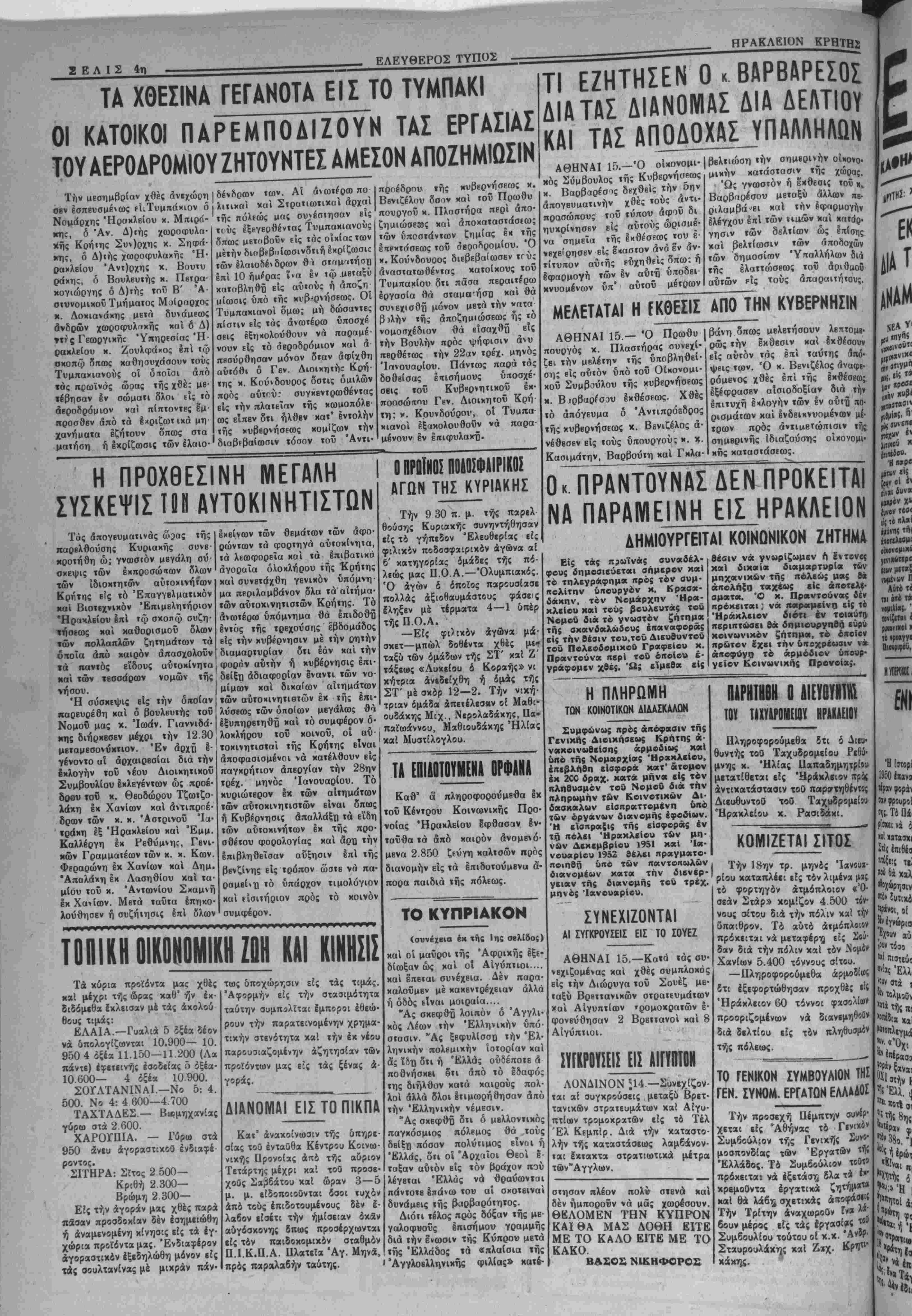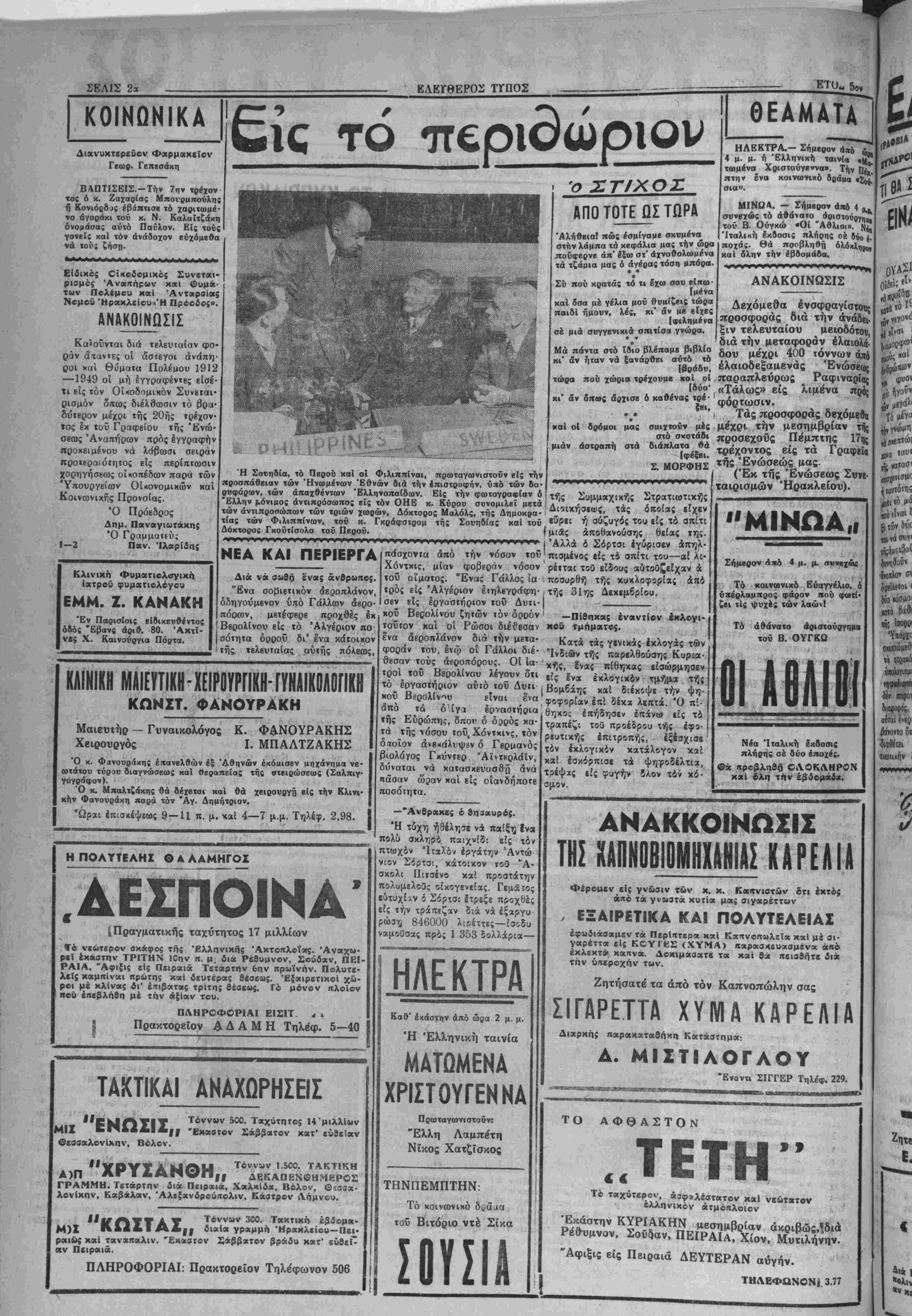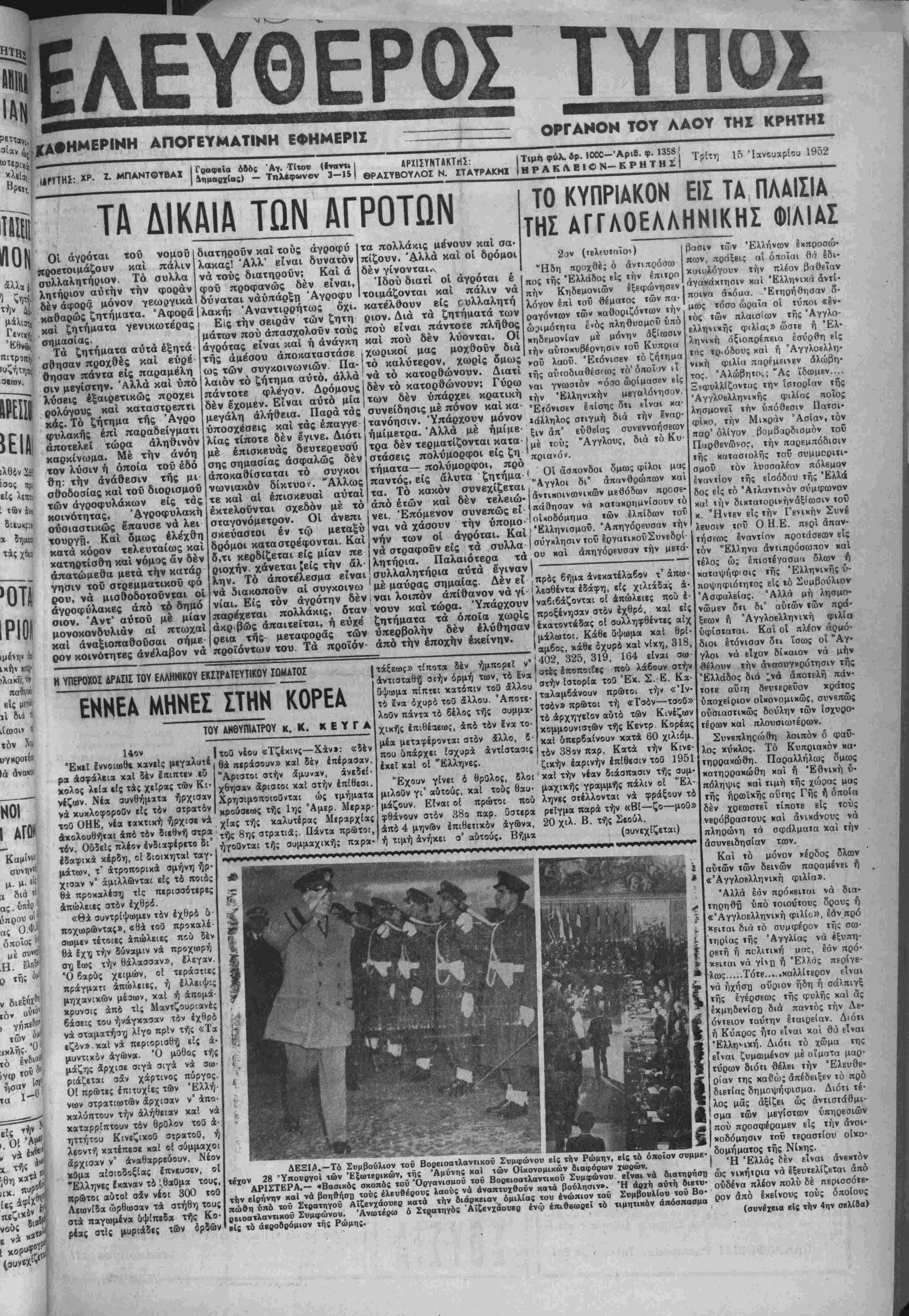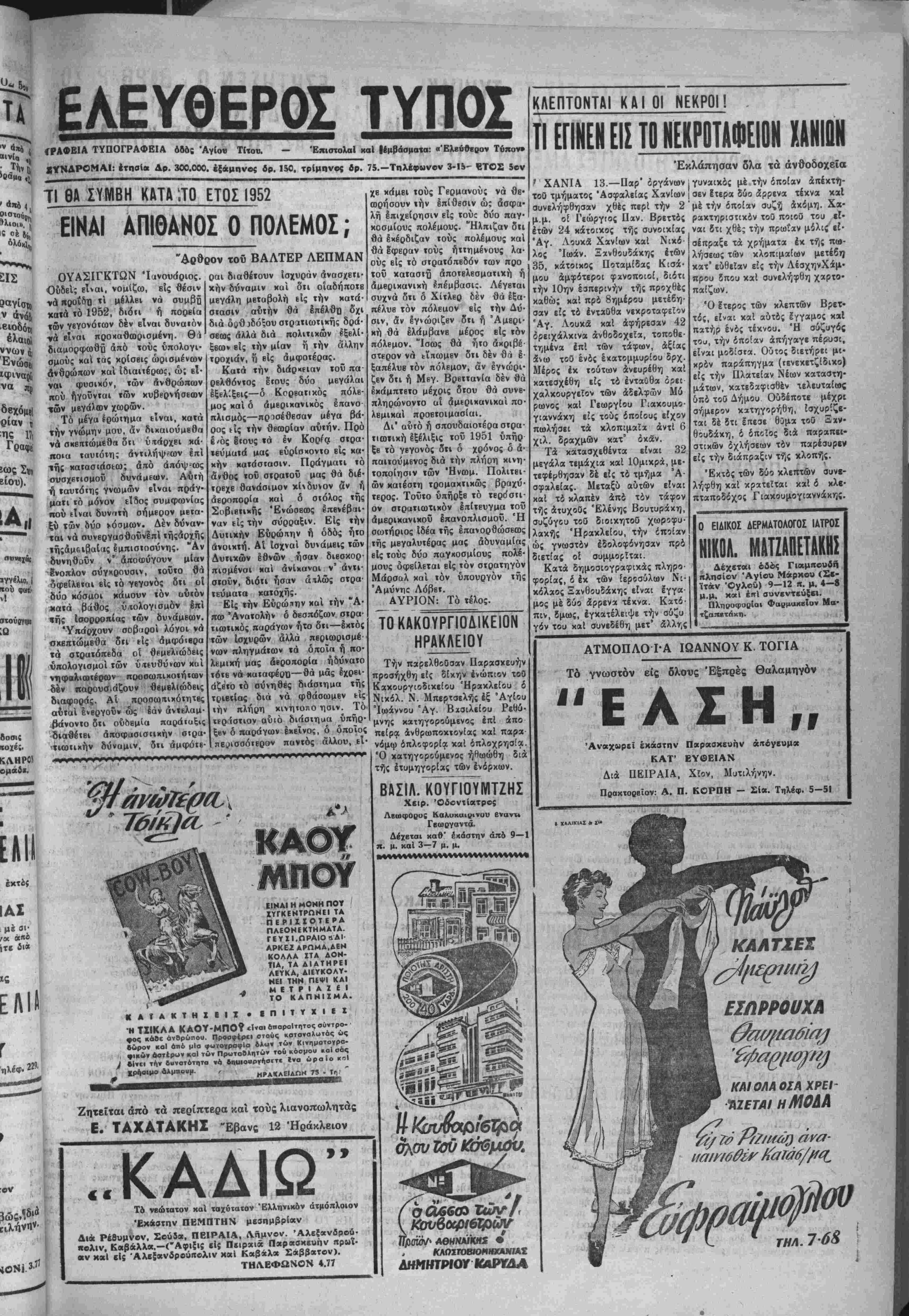 Πληροφορούμεθα δτι έ Λιευ< θυντής τοθ Ταχυδρομείοι» Ρεθύ¬ μνης κ. Ηλίας Γΐαπαο'ημητρίοι* μετατΐθεται είς Ηράκλειον πράς αντικατάστασιν τοϋ ΔιεοθυντοΟ τοθ χρ Ηρακλείου κ. Ρασιδάκι. ηνιζιται ί πληρωμήν των Κοινοτικόν Δι δκσκοιλων εΐβπραττομβνη υπό των όργανων ύιανομής έφοίίων. Ή είσπραξις της βίσφοράς έν τή πολΐι Ηρακλείου των μη- νων Δΐχιμβρίου 1951 καΐ Ία· νουαρίου 1952 Θέλβι πραγματο¬ ποιηθή υπο των παντοηωλών θιανομεων κκτα την διενίρ-ι , - · - γ«ι«ν της οιανομής τού τρέχ. Ρ'ου Χαϊ*πλέει είς τόν λιμένα μας μηνός Ίανουβιρίβυ. τό φορτηγόν ατμόπλοιον «Ό- σεάν Στάρ» κομίζον 4 500 τόν· νους σίτου διά την πόλιν χ»1 την ΚΟΜΙΖΕΤΑΙ Ί Τή" !8ην τρ. μηνός Ίανβυι»· ΣΥΝΕΧΙΖΟΝΤΑΙ ΑΙ ΣΥΓΚΡΟΥΣΕΙΣ ΕΙΣ ΤΟ ΣΟΥΕΖ ΑΘΗΝΑΙ 15.—Κατά τάς συ νβχιζομένας καί χθές συμπλοκαί είς την Διώρυγα τού Σονέζ με ταξύ Βρβττανικών στρατευμάτων ί Αίγυπτίων 'ρομοκρατών ε φονεύθησαν 2 Βηβιτανοί καί 8 Α'ιγύ ϊ ίοτορί 1950 ίηιν3 »«ν φρουροΐ «Κ. Τ4 Πά ρίσχει νά ι »! «ίΐϊσχι Σιΐ; επιθέα 45 υπτιοι. ΣΥΓΚΡΡΥΣΕΙΣ ΕΙΣ ΑΙΓΥίΤΤΟΚ ΛΟΝΔΙΝΟΝ ;ΐ4 — ΣυνεχΙζον- ται αί ουγκρουσεις μεταξΰ Βρετ- τανικων στραΐευματων καΐ ΑΕγιι- πτίιον τρομοκρατών είς τό Τέλ Έλ Κεμπίρ. Διά την καταστο¬ λήν τής καταστάσεως λαμβανον- ιαι έκτακτα οτρατιωτικά μέτρα :6»νΆγγλων. τησαν πλέον πολν στενά καί δέν ήιιποροΰν νά μδς χωρίσουν ΘΕΛΟΜΕΝ ΤΗΝ ΚΥΠΡΟΝ ΚΑΙΘΑ ΜΑΣ ΔΟΘΗ ΕΙΤΕ ΜΕ ΤΟ ΚΑΛΟ ΕΙΤΕ ΜΕ ΤΟ £ΑΚΟ. ΒΛΣΟΣ ΝΙΚΗΦΟΡΟΝ η η ύπαιθρον. Τό αύτό ατμόπλοιον πρόκειται νά μεταφέρη είς 2βά· δαν διά την πόλιν καί τδν Νο Χανίων 5.400 τόννους σίτου. —Πληροφορούμεθα ¥νοι, οί ^ έγνώρια δτι έξεφορτώθησαν προχθές είς Ηράκλειον 60 τόννοι φαοολίων- προοριζομένων νά διανεμηθούν διά δελτίου είς τον πληθασμίν τής πόλεως. τεύϊ ·">! Έλλ
