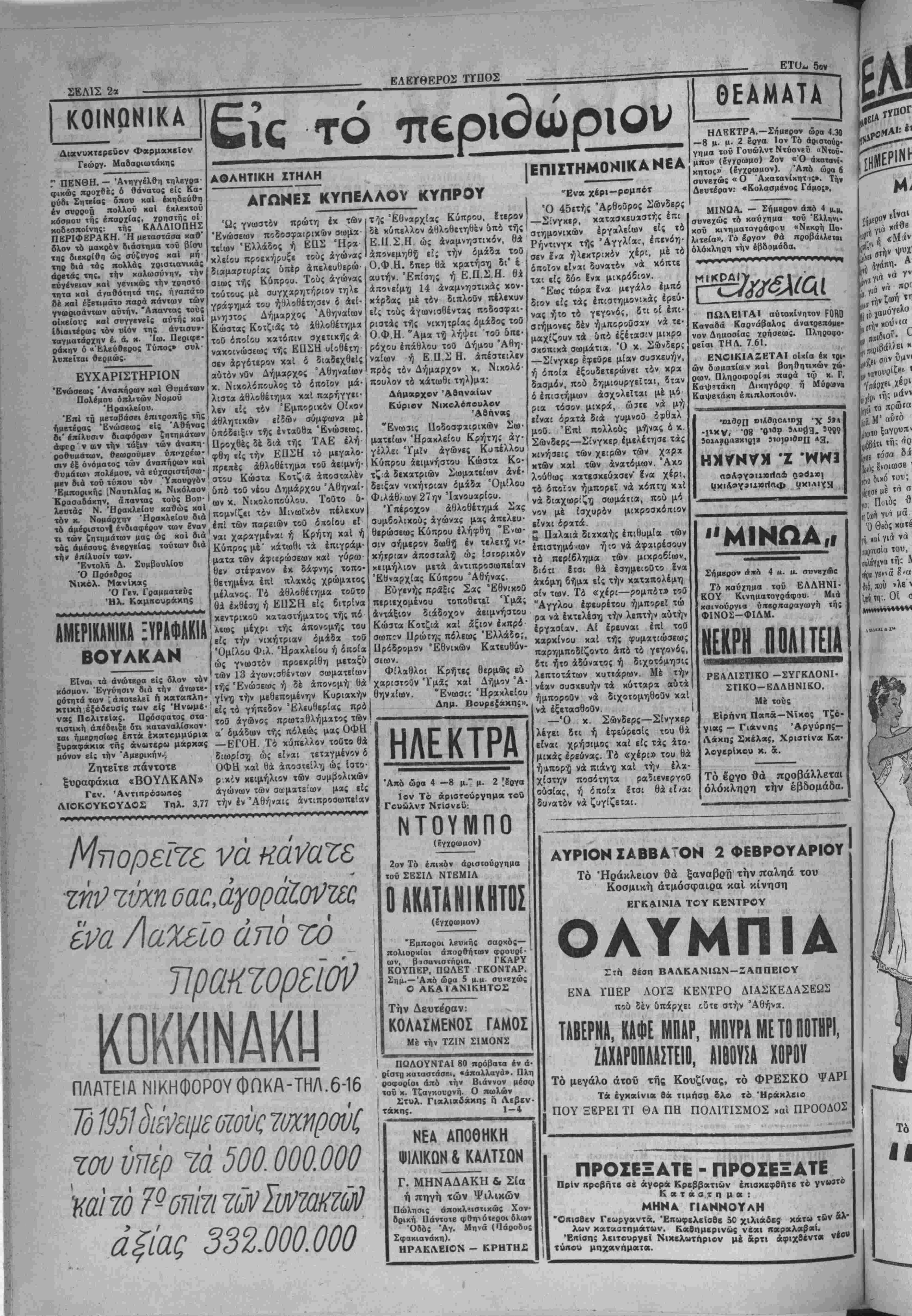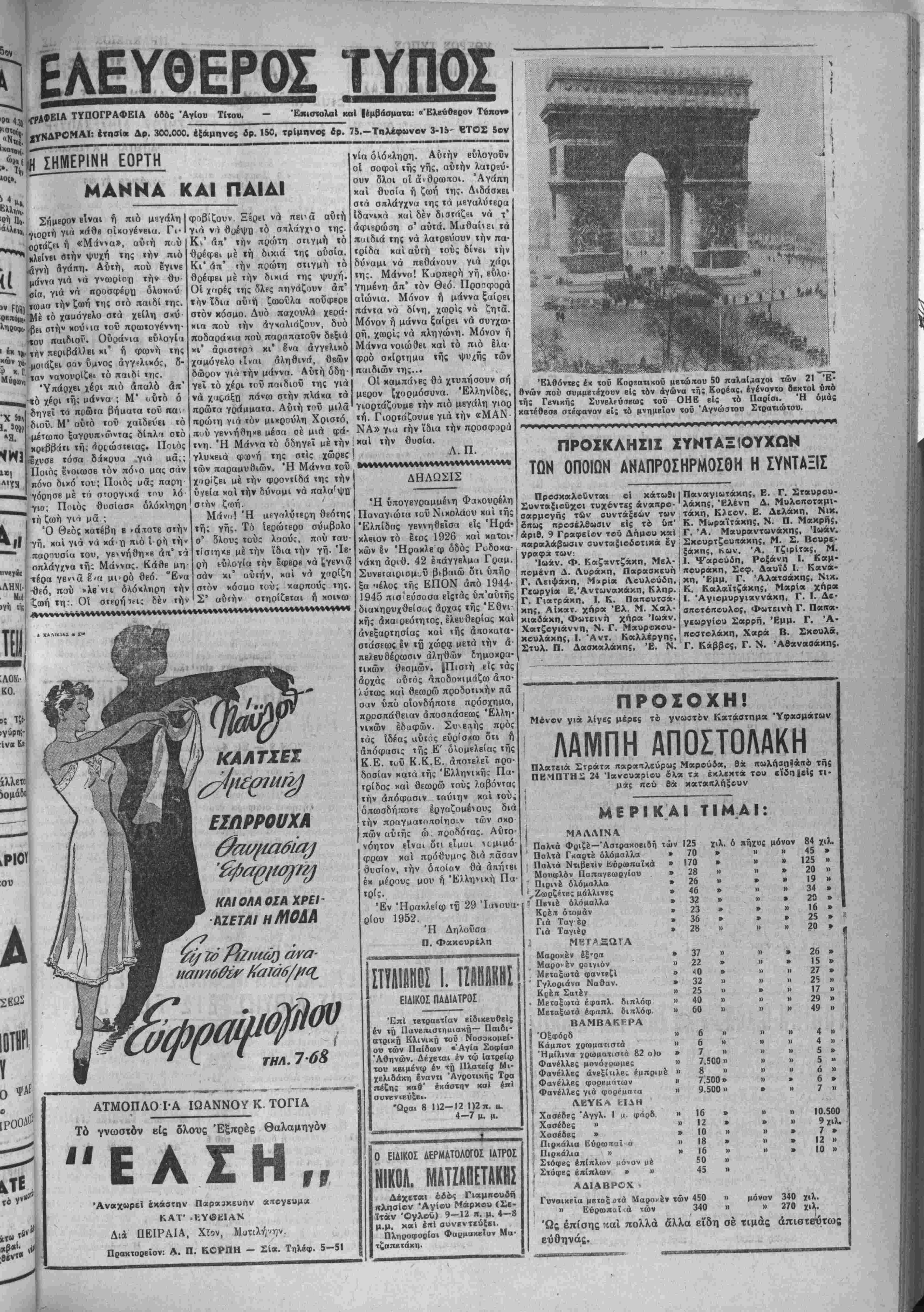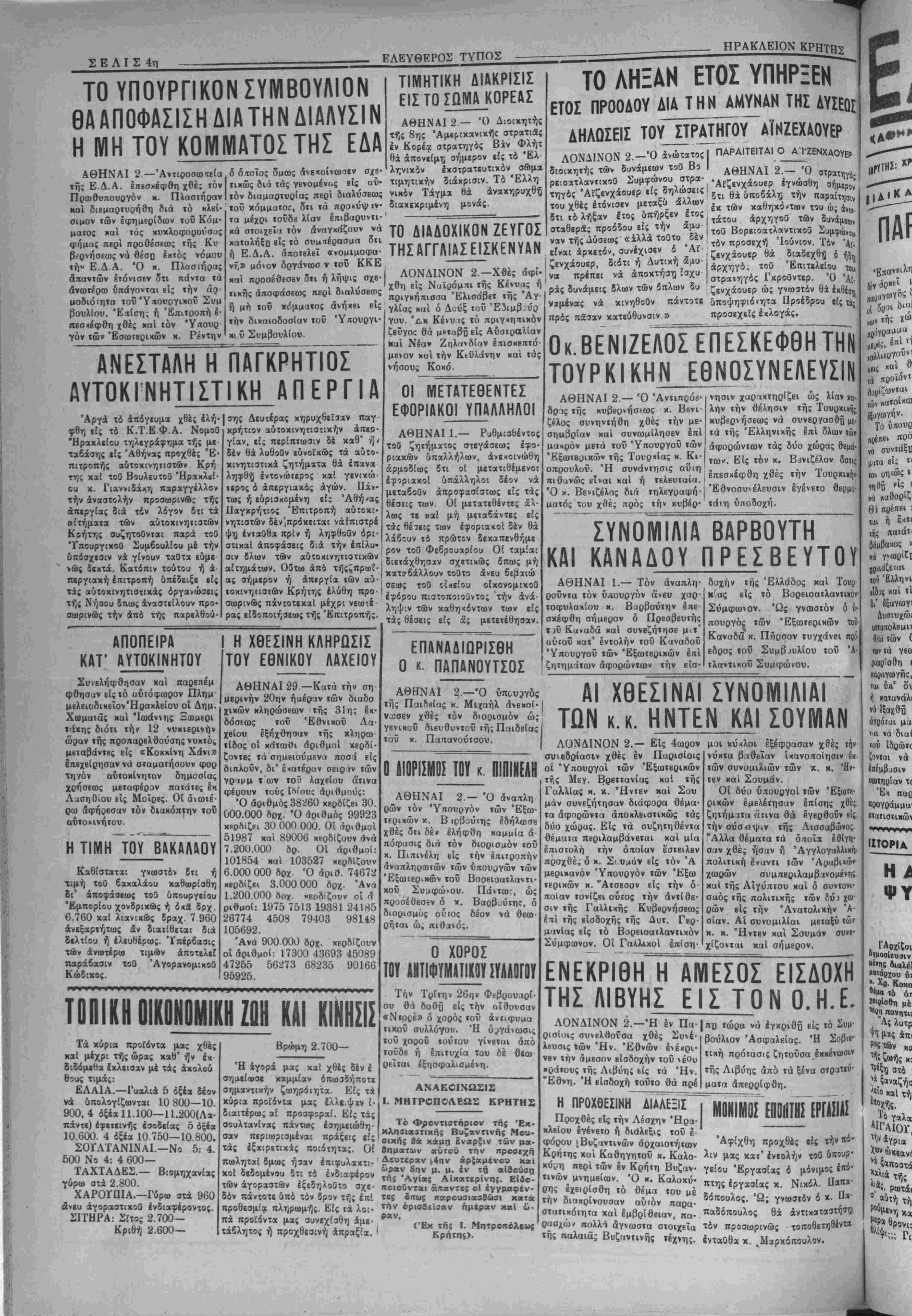 σίαν. Αί συνομιλίαι μειαξύ <ώ' κ. χ. Ήντεν χαί Σούμαν συνβ· χίζονται καί σήμβρον. ΕΝΕΚΡΙΘΗ Η ΑΜΕΣΟΣ ΕΙΣΔΟΧΗ ΤΗΣ ΛΙΒΥΗΣ ΕΙΣ ΤΟΝ Ο.Η.Ε. ΛΟΝΔΙΝΟΝ 2.—Ή έν Πα¬ ρισίοις συνελθούσα χθές Συνέ¬ λευσις των Ήν. "Εθνών ένέχρι- νβν την άμεσον βίσδοχήν τοϋ νέθυ κι5<ί·ους τής Λιβύης είς τα Ήν. "Εθνη. "Η β'ισδοχή τούτο θά πρέ Η ΠΡΟΧΘΕΣΙΝΗ ΔΙΑΛΕΞΙΣ^ Προχβές είς την Λέσχην Ήροι- κλβίου Ιγένβτο ή διάλεξις τοϋ έ¬ φόρου ^Βυζαντινών άρχαιοτήτοον Κρήτης καί Καθηγητού χ. Καλο- κύίη πβρί των |ν Κρήτη Βυζαν τινών μνημείων. "Ο κ. Καλοχύ- ρης έχβιρίσθη τό θέμα τού μέ την δκιχρίνουσαν αύιόν παρα- στατιχότητα χαί έμβρίθειαν, πα· ρασχώ* πολλτ άγνωστα στοιχεΐα τής παλαιά; Βυζανιινής τέχνης. πχι τώρα νά έγχριθΉ είς τό Συμ¬ βούλιον Ασφαλείας. Ή Σοβι«· τική πρότασις ζητούσα εκκένωσιν τής Λιβύης άπό τα ξένα ματα απερρίφθη. ΜΟΝΙΜΟΣ ΗΣ ΕΡΓΑΣΙΑΣ Άφίχθη προχθές είς την «ί' λιν μας κατ' εντολήν τοθ 5ΐ««?· γείου "Εργασίας δ μόνιμος έ«ί· πτης εργασίας κ. Νικόλ. Πάη*· δόττουλος. "Ω; γνωστόν δ χ. Ο*' παδδπουλος θά αντικαταστήαϊ τόν προαωρινώς τοποθετηθή» ενταύθα κ. ^Μαρκόπουλον.