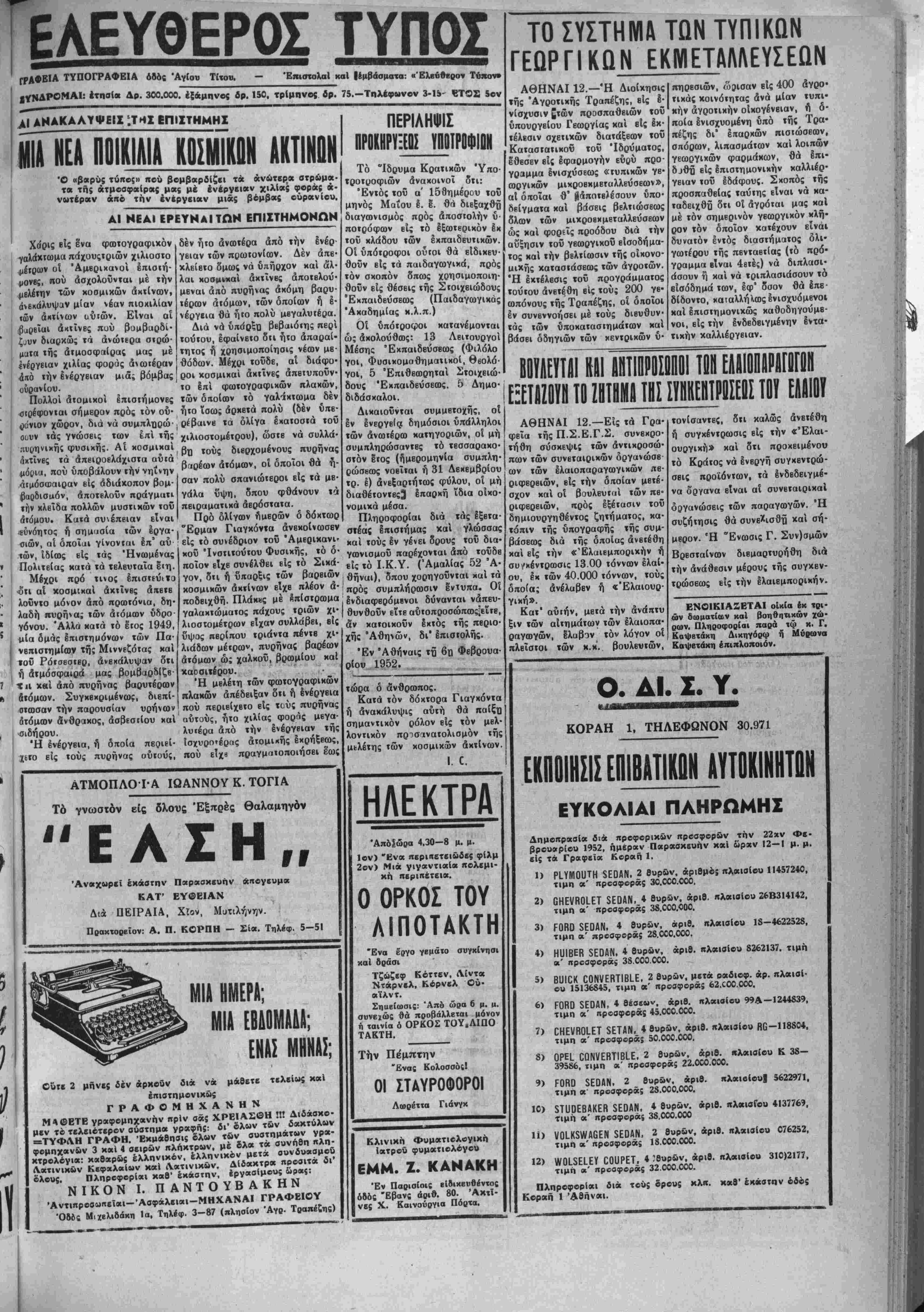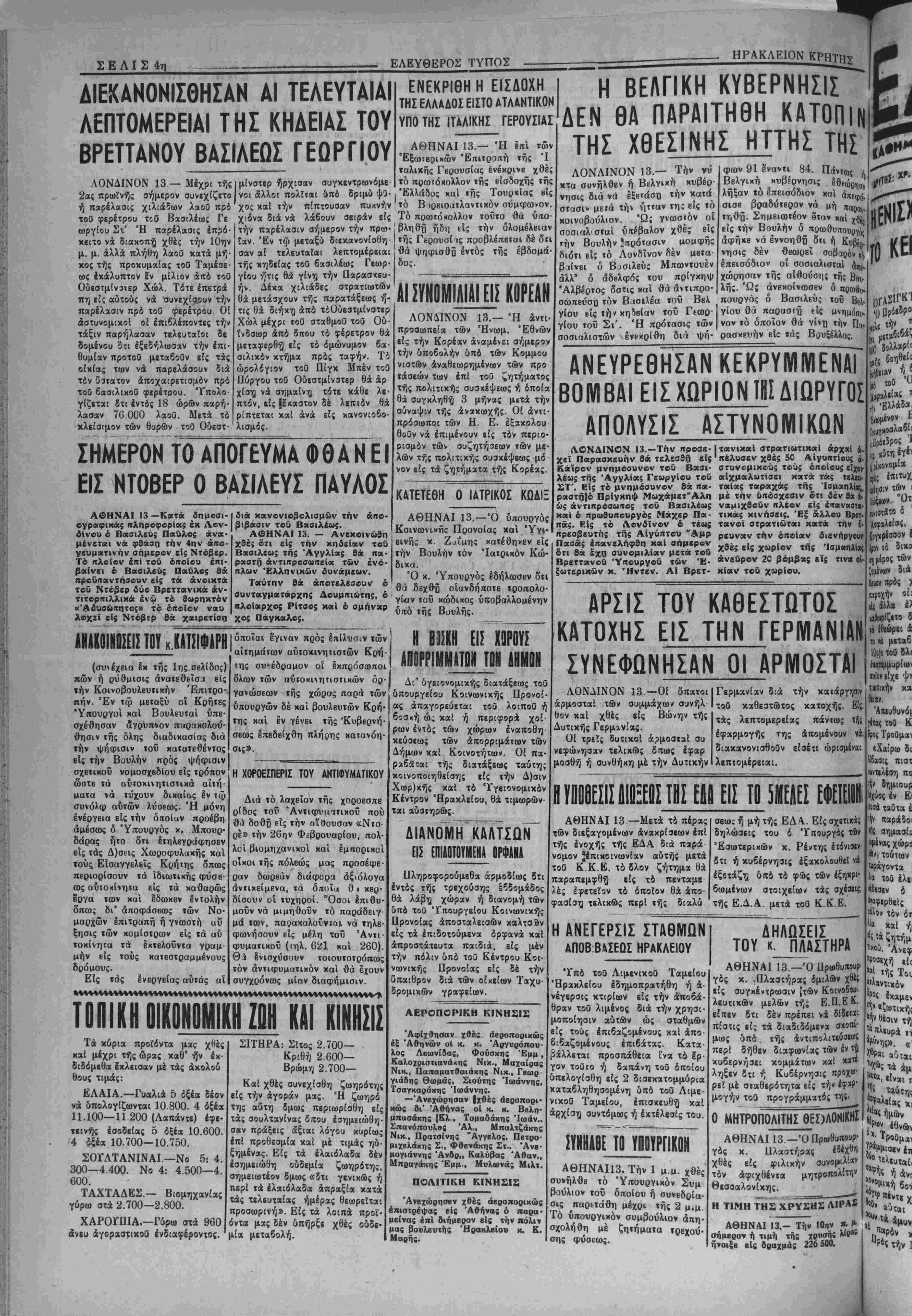 ν<υμοιτινήν σήμερον εί; Ντόβερ. Τό πλοϊον επί τού οποίου επι- βαίνει ο Βασιλεύς Παύλβς 8ά προϋιταντησουν είς τα άνοικτα τού Ντοβερ 6ύο Βρεττανικα άν- τιτορπιλλικά έν ώ τό θνρηκτόν «Άδυσώιτητο;» τό οποίον ναυ λοχχΐ είς Ντοβΐρ θά χαιρβτίση διά κανονιοβολισμών την άιτο- βιβααιν τού Βασιλέως. ΑΘΗΝΑΙ 13. — Ανεκοινώθη χθές ότι είς την κηδείαν τοΰ Βαοιλεω; τής Αγγλίας θα πα- ραστή αντιπροσωπείαι των ένό- πλων Έλληνικών ύυνάμεων. Ταύτην θά άποτΕλβσουν ο συνταγματάρχπς Δουμπιώτης, έ πλοίαρχος Ρίτσο; καΐ 6 σμήναρ χος Πάγκαλος. τό Β ιρειοαΐλαντιχόν σύμφωνον. Τό πρωτόκολλον τούτο θα υπο βληθχί ήδη εί; *ήν θλομέλβιαν τής Γβρουσί ις προβλέπεται δέ όΐι θά ψηφισθή έντός τής εβδομά¬ δος. ΑΙ ΣΥΪΟΜΙΑΙΑΙ ΕΙΣ ΚΟΡΕΑΝ ΛΟΝΔΙΝΟΝ 13.— Ή άντι· προσωπεία των Ένωμ. Εθνών είς την Κορέαν άναμένει σήμερον την !)ποεολ9)ν δπό των Κομμου νιστών άναθεωοημένων των προ τάσεών των επί τού ζητήματος τής πολιτικάς συσκέψεως ή όποία θά συγχληθ^ 3 μήνας μ*τά την σύναψιν τής άνακωχής. Οί άντι- πρόσωποι των Η. Ε. έξακολου θοθν νά έπιμένουν είς τόν περιο¬ ρισμόν των σιιζητήσεων των με· λών τής πολιτικής συσκέψεως μό νόν εί; τά ζητήματα τής Κορέας. ΚΑΤΕΤΕΘΗ Ο ΙΑΤΡΙΚΟΣ ΚΟΔΙΞ ΑΘΗΝΑΙ 13.—Ό ύπουργός Κοινωνικάς Προνοίας καί Ύγι· εινής κ. Ζϋΐμης χατέΰηχεν είς την Βουλήν τόν Ιατρικόν Κώ διχα. Ό κ. Ύπουργός εδήλωσεν δι θά δεχθχϊ οιανδήποτε τροπολο γίαν τοΰ κώδιχος υποβαλλομένην υπό τής Βιΐυλής. Η ΒΕΛΓΙΚΗ ΚΥΒΕΡΝΗΣΙΣ ΔΕΝ ΘΑ ΠΑΡΑΙΤΗΘΗ ΚΑΤΟΠΙΝ ΤΗΣ ΧΘΕΣΙΝΗΣ ΗΤΤΗΣ ΤΗΣ ΛΟΝΔΙΝΟΝ 13.— Την νύ κτα συνήλθεν ή Βίλγική κυβέρ¬ νησις διά νά έξβΓάσχ) την κατά στάσιν μεΐά την ήτταν της είς τό κοινοβούλιον. Ώ; γνωστόν οί σοσιαλισταί υπέβαλον χθές είς την Βουλήν Πρότασιν μομφής διότι β'ις τό Λονδίνον δέν μβτα βαίνει δ Βοσιλεύς Μπωντουέν άλλ' ό άδβλφός τού πρίγκηψ Άλβέρτος δστις χαί θά αντιπρο¬ σωπεύση, τον Βοσιλέα τοΰ Βελ γίου είς τή» κηδείαν τού Γεωρ γίου τού Σι'. Ή πρότασις των σοσιαλιστών ενεκρίθη διά ψή· φων 91 έναντι 84. Πάντως Βελγιχή κυβέρνησις " λήξαν τό επεισόδιον χπί σισβ βραδύτερον νά μή Σημειωτέον §ταν χ είς την Βουλήν ό άφήκβ νά εννοηθή διι ή Κυβ^'. ΐσις δέν θβωρεΐ σοβαρόν ^ επεισόδιον οί σοσιαλισταί χώρησαν τής αίθούσης τής Βο^. λής. Ώς ανεκοίνωσεν δ πουργός ό Βασιλεύς τού ΒϊΙ· γίου θά παραστή είς μνημι50υ. νόν τό οποίον θά γίνη, την ] ρασχευήν εΐε τάς Βςυξέλλας. ΑΝΑΚΟΙΝΩΣΕΙΣΤΟΥκΚΑΤΣΙΦΑΡΗΙ (συνέχεια Ιχ τής 1ης σελίδος) πών ή ρύθμισις άναΐεθε,ΐσι είς την Κοινοβουλευτικήν Επιτρο¬ πήν. Έν τώ μεταξύ ο! Κρήτες "Υπουργοί καί Βουλευταί ΰπε- σχέθησαν δγρυπνον παρακολού¬ θησιν τής δλης διαδιχασίας διά την ψήφισιν τού καΐατεθέντος ίί; την Βουλήν πρός ψήφισιν σχΒτιχοΰ νομοσχεδΐου είς τρόπον ώστε τα αύτοχινητιστιχά αϊτή· μαΐα νά τύχουν δικαίας έν τφ συνόλω αυτών λύσεως. Ή μόνη ενεργεια είς την οποίαν προέβη άμέσως δ Ύπουργός κ. Μπουρ· δάρας ήτο ότι έτηλβγράφησεν είς τάς Δ)σεις Χωροφυλακής καί τούς Εισαγγελεύς Κρήτης όπως περιορίσουν τα ίδιωτιχής φύσε¬ ως αύΐοκίνητα είς τα καθαρώς §ργα των χαί έδωκεν εντολήν δπως δι' αποφάσεως των Νο· μαρχών επιτραπή ή γνωστή αΰ ξησις των χομίστρων είς τα αύ τοχίνηΐα τα έχτελοΰντα γραμ μην είς τούς χαΐεστραμμένους δρόμους. Είς τάς ενεργείας αύτάς αί οποίαι έγιναν πρό; επίλυσιν των αίτημάτων αύτοκινηιιστών Κρή¬ της συ^έδραμον οί έχπρόσωποι όλων των αύτοχινηπσιιχών δρ- γα*ώσεων τής χώρας παρά των ύπουργών δέ καί βουλευτών Κρή της χαί έν γένει τής 'Κυββρνή- σεως έπεδείχθη πλήρης χατανόη- σις». Η ΧΟΡ