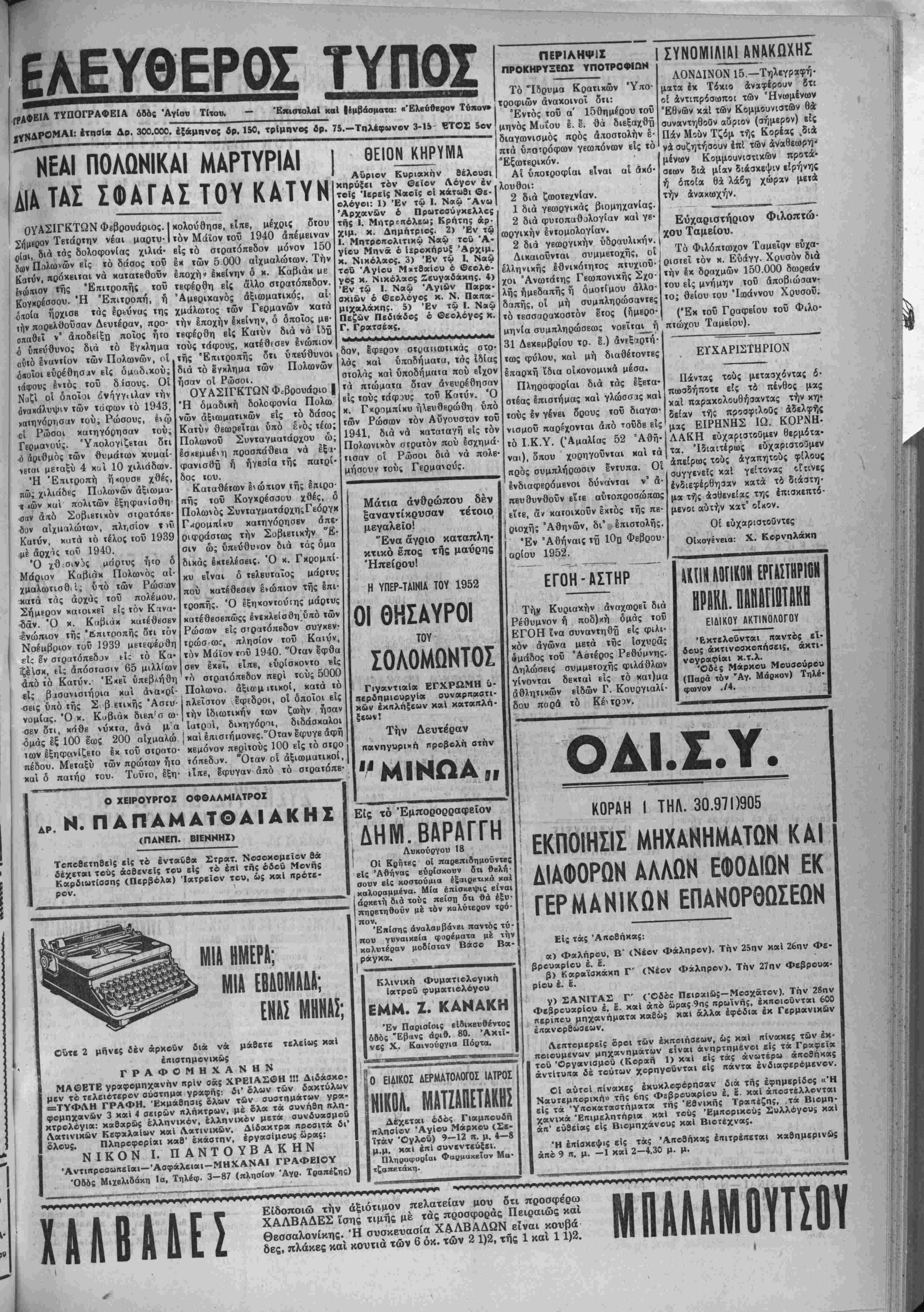 εκ Τεχερΐίνης άναφέρουν ότι ου-1 μολονότι είχον σημειώσει πο<5ο· νεχΐζονται έ*εΐ αί διαπραγμα- δόν Ι1να ποοσέ,ρ0υσαν ήδη τεύσεις μετοξύ των εκπροσωπών τής Διεθνοΰς Τραπέζης χαί τής Πβρσικής Κυβερνήσεως διά τό ζητημα των πετρελαίοον τοΰ Άμ· πάλιν «ϊς ούσιώδη διαφοονίαν δ- ναφβρομένην ΒΪς τό ζήτημα της διαχειρίσεως την πετρελαίων. Η ΧΘΕΣΙΝΗ ΜΑΚΡΑ ΣΥΝΟΜΙΛΙΛ ΒΑΣΙΛΕΩΣ ΠΑΥΛΟΥ ΚΑΙ ΑΤΣΕΣΟΝ ΑΘΗΝΑΙ 16 — Εί; τό Υ¬ πουργείον των "Εξωτερικών §λή φθη χθές τηλβγράφημα τοϋ έν Λονδίνω Πρεσβευτού τής Έλλά δο, κ. Μβλά άγγέλλον δτι χθές ή Α. Μ. δ Βασιλεύς Παΰλος χθη τόν Αμερικανόν. γόν των Έξωτβριχών κ. "Ατυβ· σον μετά τοϋ δ/τοίου συναιμΐλτν· σβν επί μαχρόν. . ΑΠΗΓΟΡΕΥ0ΗΑΥΣΤΗΡΩΣ Η ΧΡΗΣΙΣ ΤΗΣ ΜΑΣΚΑΣ Διά τηλεγραφική; Διαταγής τοΰ εγπουρΥ8[ου Έσωτεριχών πρός την Δ)σιν Χωροφυλακή; Ηρακλείου γνωρίζεται δτι άπα- γορεύεται αυστηρώς ή χρήσις τή; μάσκας καΐά την περίοδον των Απόκρεω. Η ΥΔΡΕΥΣΙΣ ΝΕΑΙ ΑΛΙΚΑΡΝΑΣΣΟΥ Τό προεδρείον τής χοινότητο; Ν. Άλιχαρνασσοΰ Ηρακλείου μετέβη χθές την μεσημβρίαν είς ΐήν Νομαρχίαν χαί εξέφρασαν παράπονα εί; τόν Νομάρχην κ. Μΐτιράχην διά ΐό δίκτυον υδρεύ¬ σεως τή; περιφερείας των ό αί μή έχουσαι εσωτερικάς χρή να; είς τάς οίκίας των υϊ<ογέ νεια δέν δύνανται νά ύδρεύωνται επαρκώς. Ό χ. Νομάρχη; ύπε σχέθη ότι θά λάβΐ) επί τούτου σ^βτιχήν μέριμναν ΤΟΠΙΚΗ 01Κ0Ν0ΜΙΚΗ ΖΟΗ ΚΑΙ ΚΙΝΗΣΙΣ Τά κύρια προϊόντα μας χθές «αί μίχρι τή; ώρας καθ' ήν έκ- διδόμεθα ίκλεισαν μέ τάς άκολού θου; τιμάς: ΕΛΑΙΑ.—Γυαλιά 5 δξέα δέον νά δπολογίζωνται 10 800. 4 όξέα ΣΙΤΗΡΑ: Σΐτος 2.700— Κριθή 2 600— Βρώμη 2.700— Καί χθές συνεχισθή ή άπόλυ· τος άπραξία είς την αγοράν μας. Ούδεμία πράξις εγένετο ουδέ εί; 10.700—10.750. ΣΟΥΛΤΑΝΙΝΑΙ.—Νο 5: 4. 300— Νο 4: 4.400— ΤΑΧΤΑΔΕΣ— Β!ομηχανία; γύρω ατά 2 700. ΧΑΡΟΓΠΙΑ.—Γύρω στά 960 άνευ άγοραοτικοθ ένδιαφέροντο;. ξένας άγορά;. όντων μα;. Οί έμποριχοί μα; κύ· κλοι ήρμήνευον την ανωτέρω έν· τέλη άπραξίαν κατά πρώτον λό¬ γον εί; την παρουσιαζομένην τά; τελευταία; ημέρας τελείαν άζη- τησίαν των προϊόντων μα; είς τά; ΟΙ ΕΝΟΡΚΟΙ ΗΡΑΚΛΕΙΟΥ ΤΟΥ ΜΗΝΟΣ ΜΑΡΤΙΟΥ Γενομένης «ληρώσεως των έ νόριων ουνόδου μηνός Μαρΐίου τοϋ Καχουργιοδιχείου'Ηραχλείου εχληρώθησυιν οί κάτωθι: Α' ΔΩΔΕΚΑΗΜΕΡΟΝ Ταχτιχοί: Δημ. Άντωνόπου λος, Μιλ. Κοκχινάχης, Εύάγγ. Χανιωτάχης, Νικόλ. Μαράχης, Νικό*. Μπουρνέλλος(;), Εύάγγ. Χρυσός, Θ. Κόχκινο;, Έμμ. Αι απάκη;, Έμμ. Μανδαλενάχης, Στέφ. Μηιλαβιίχηί, Σάββας Τσι· λένη;(;) Ήρακλή;Πανϋγιωτά*ης, Γεώρ. Φουρναράκη;, Βισ. Νού φρά*ης. Έμμ. Αλεξάκης, Τηλ. Πλεύρης, Φρΐξος Δασκαλάκης. Μιχ. Τζανάκης, Ιωάν. Δουβά- κης. Γεώρ. Β. Μαρής. Άναπληρωματικοί: Βασίλειος Σκουλα:, Άλ. Σιεφανίδης, Σΐυλ. Κωνσιαντινίδης, Ζιχ. Τσιχρι- τσή;, Κωιστ. Πολυδά<ης, Εύαγ. Καρύπης, Γιώρ. Κάββος, Ιωάν. Ανδρουλιδάκη!:, Ιωάν. Χρηστά- χη , Παν. Ραπίδης. Β'. ΔΩΔΕΚΑΗΜΕΡΟΝ Ταχτικοΐ: Κων. Γιωργαντά-, Ιωάν. Ανεμογιάννη:, Γεώργ. Μ/ιρουλιοάκη;, Έλευθ. Μαλα γαρδής, Γεώργ. Γχριδάκης, Ιω¬ σήφ Χατζή Μηλιαράκης, Έμμ. Γαλβνιανός, Άντ. Σκουλιδά;, Νικ. Λιαναντωνακη:, Παΰλος Φακιολάχης, Δημ. Ψιλλάχης, Νικ. Χουρδάκη;, Ιωάν. Στεφά¬ νου, ;Κωνστ. Φανουράκης, Γ. Γουναλάκης, 'Ελβυθ. Ταμιωλά κης, 2ΐυλ. Περδικογιάννης, Ιω. Βισκαδουράχης, Άντ. Γαγά· κης, Ιωάν. Λουλά*ης. Άναπληρωματιχοί: Μενέλαος Παρλαμάς, Γεώργ. Άλυγιζάχης, ΗΡΧΙΣΕ ΚΑΙ ΣΥΝΕΧΙΖΕΤΑΙ Η Δ!ΚΗ ΤΩΝ 39Κ0ΜΜ0ΥΝΙΣΤ0Ν ΑΘΗΝΑΙ 16 — Ενώπιον τοθ Ι ρούμενοι έχρηαιμοποίουν άσυο· Α'. ΔίαρκοΟ; Στρατοδικείου Ά-1 ματου; διά των ίΐτοίων άπέσΐελ- ψ ήρχισεν χθές ή δίκη των κατηγορουμένων διά τούς έσχε- τως5»νακαλυφθέντας ένταθθ» ά· σ;ρμά