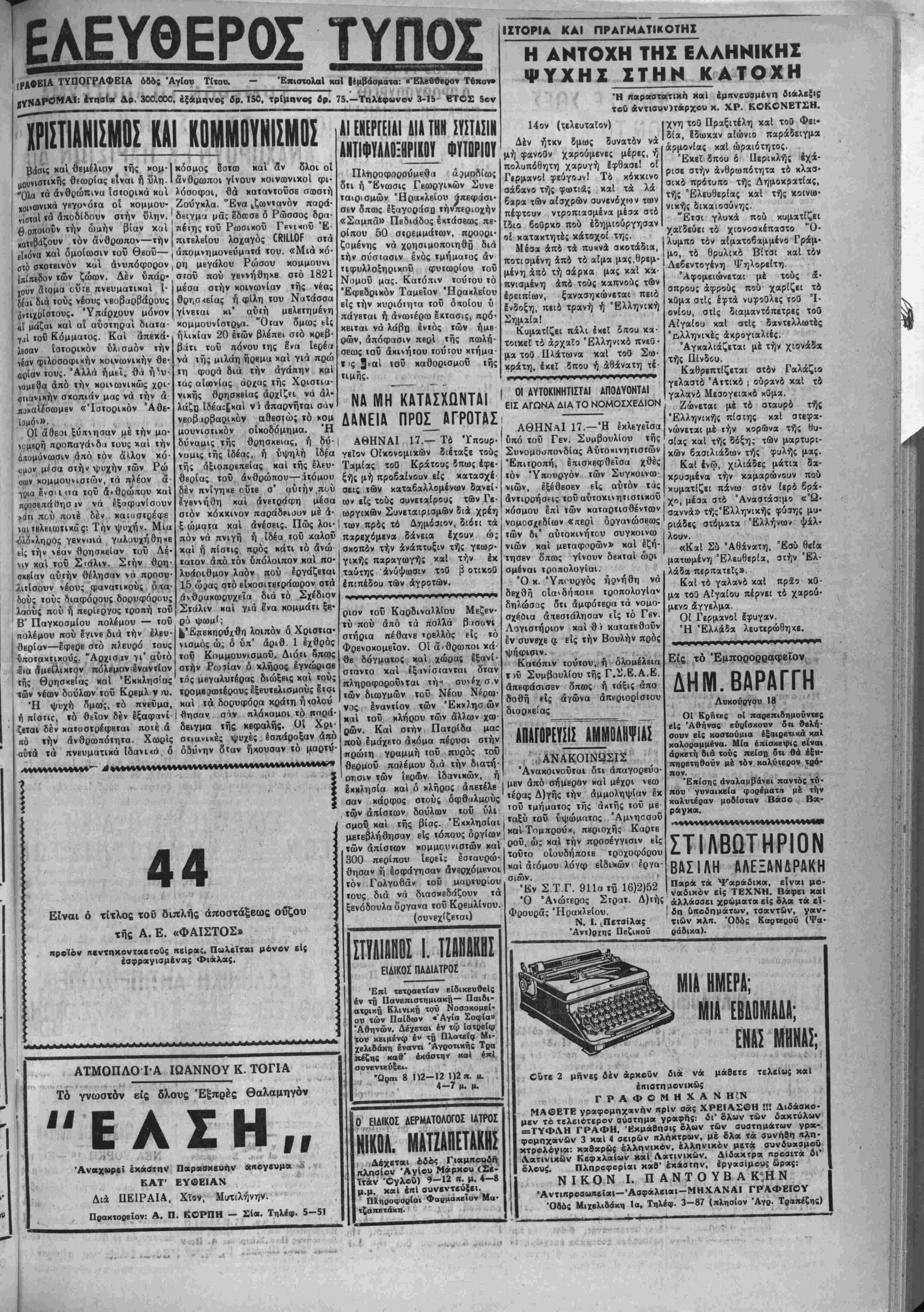 χθεσινήν ημέραν τής δ£χ1ί< των Ι τά στβιχιτχ ^ δράσεώς των χ* κομμουνιστων ενώπιον τοή Α'. ι Διαρ<οΟς Στρατοδικείου Άθη ώς μάριυ,ρες νών κ. κ. Ταβουλάρης, καί είς άλλος άνώτερος τηγορουμένων ι!ς την Πειραιώς. Ή δ(κη αανιχίζίΐαι μέ την έξίταα.ν καί των λοιπά)» >ν κατηγορΐας.