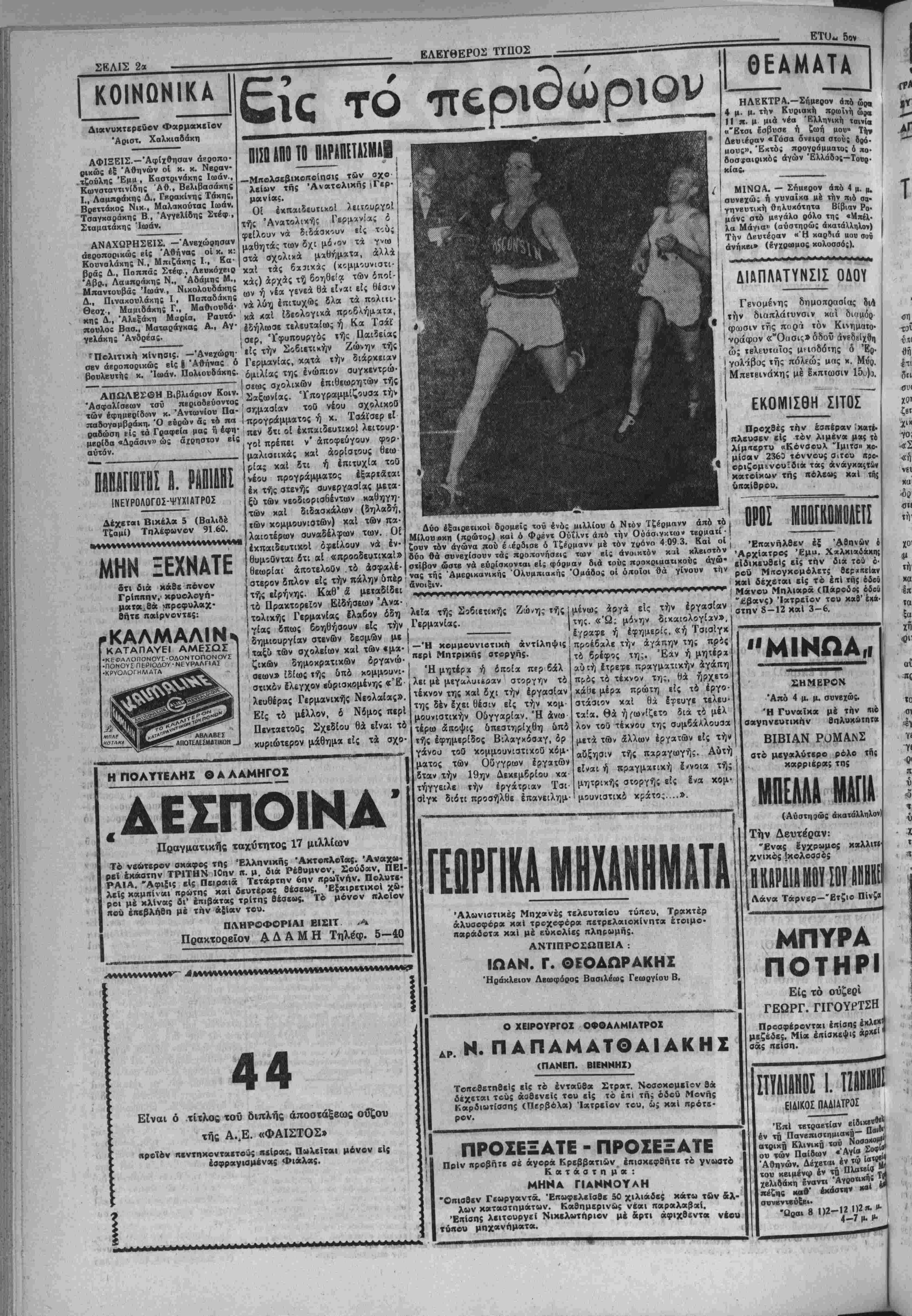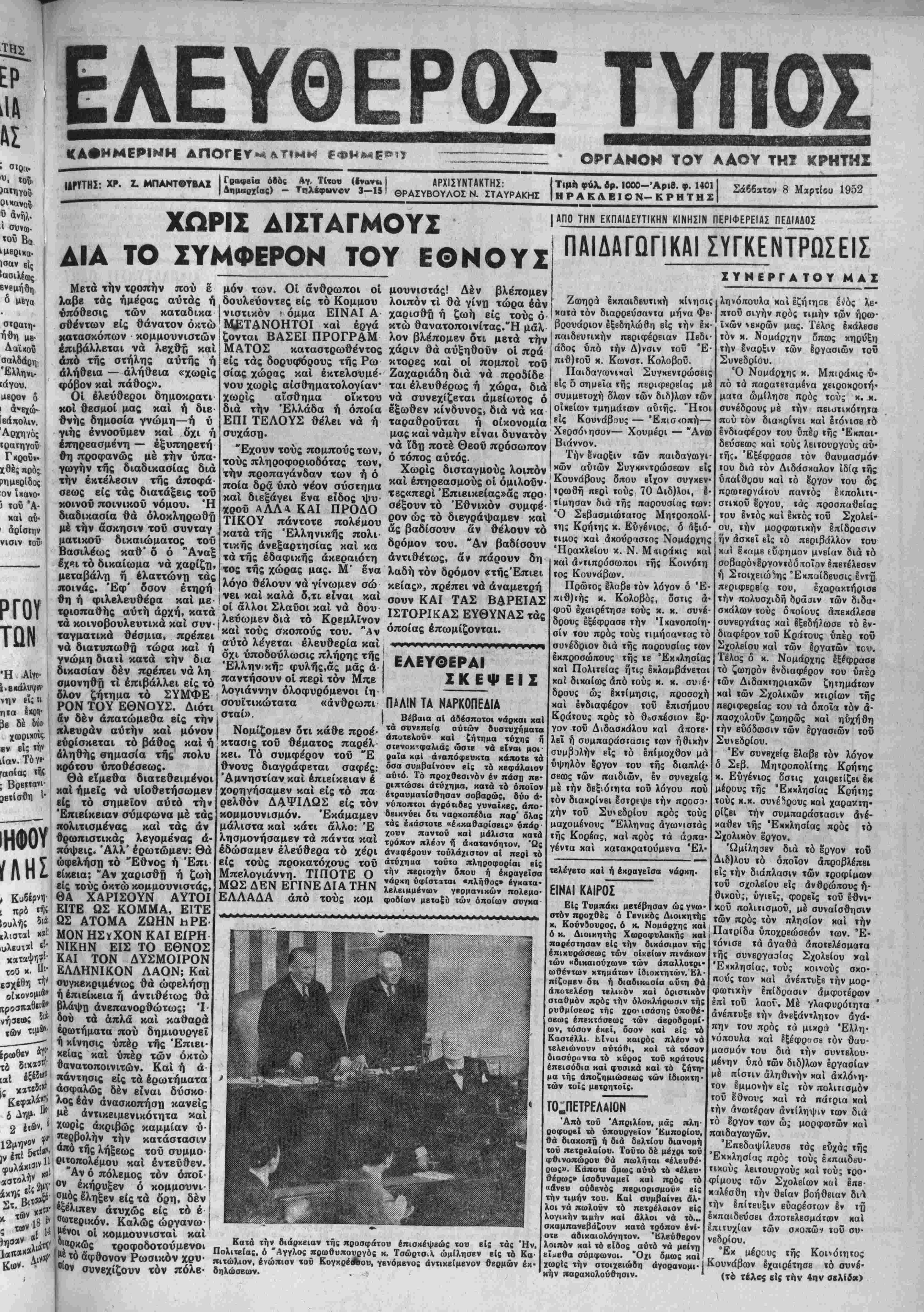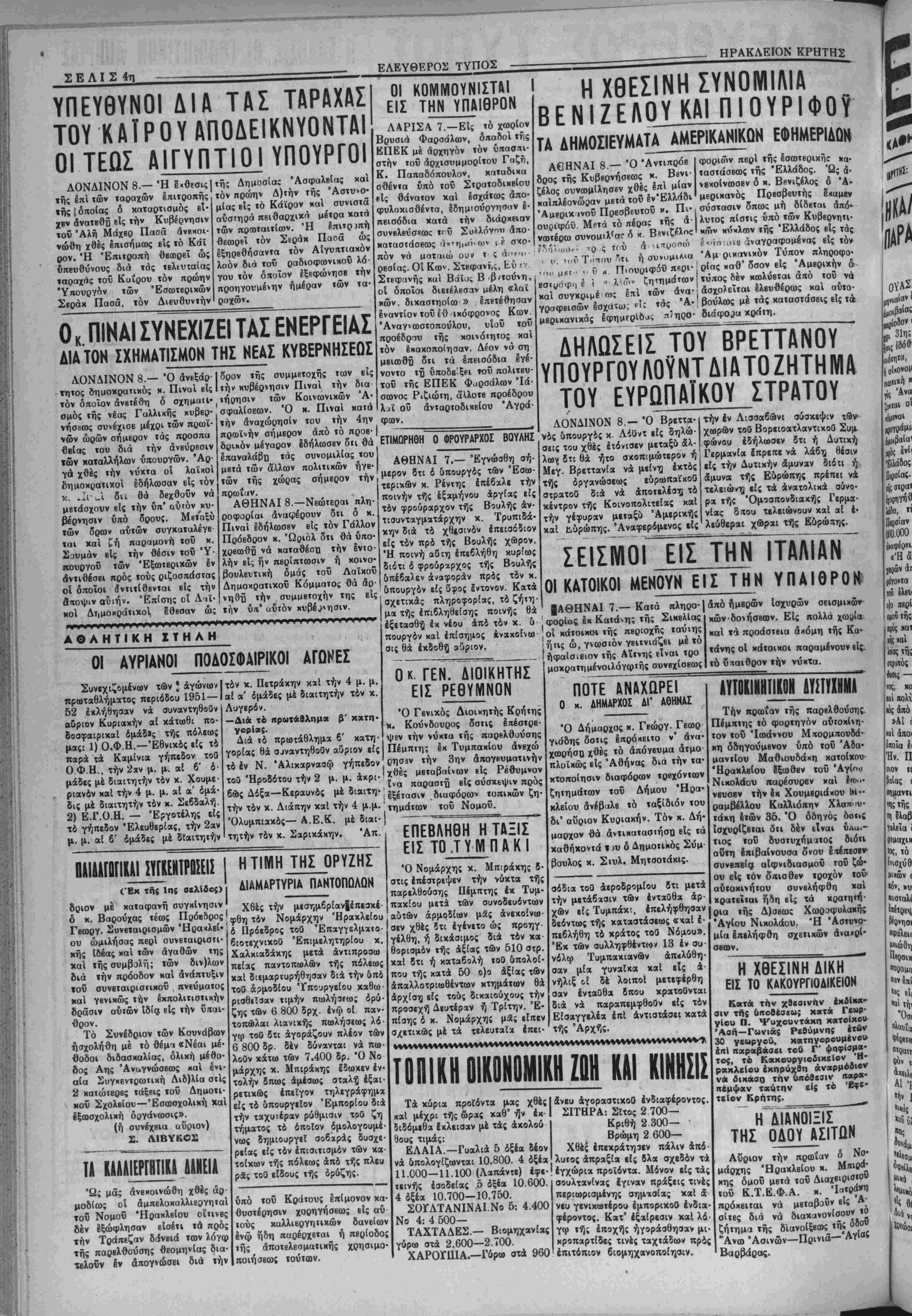 ρ<άσ:ι)ΐ8 αναγραφομένας είς τόν ού Τΐ'ΐου *τι ή αυνυμΐΜα Άμ ρικανιχόν Τύπον πληροφο- ϋ λ Πιουριφόυ περι· ρίας καθ1 δσον είς Άμβριχήν ' Α6ΗΝΑΙ 8— Ό "Αντιπρόβ δρος τής Κυβερνήσεως κ. Ββνι- ζέλος συνωμίλησβν χθες §πί μίαν καίπλέονωοαν μβτά τοϋ Ιν'Ελλάδι Άμερικ ινοϋ Πρεσβευτοϋ χ. Πι· ουοιφόϋ. Μ?τά τό πέρας τής α¬ νωτέρω συνομιλ'αΓ δ χ. 1 ή'ιιιθΓ· το ς τού (ΐ έ ί λ'ώ» ζητημάτων καί συγχριμέ ως επί των άνα· γραφβισών Ισχατω; ρ'κ τάς 'Α· μερικανικάς εφημερίδας π'ηρο· διάφο^υ κράτη. ή τύπος δέν χωλύεται άπό τού νά άσχολεΐται Ιλευθέρως καί αύτο- βούλως μέ τάς καταστάσβις είς τα ΔΗΛΩΣΕΙΣ ΤΟΥ ΒΡΕΤΤΑΝΟΥ ΥΠΟΥΡΓΟΥΛΟΫΝΤδΙΑΤΟΖγΙΤγΙΝΙΑ ΤΟΥ ΕΥΡαΠΑΪΚΟΥ ΣΤΡΑΤΟΥ ΛΟΝΔΙΝΟΝ 8 — Ό Βρεττα- νός δπουργος κ Λίϋντ είς δηλώ- σεις τού χθές ετόνισεν μεταξδ &· λων δτι θά ήτο σκοπιμώτερον ή Μεγ. ΒρεττανΕα νά μείνη έχτός εϋιρωπαΐχοθ αποτελέση τό κέντρον τής ΚοινοπολιτεΕας καί την γέφυραν μεταξϋ Άμερικής καί ϋύρώπης. Άναφερόμενος είς τής οργανώσεως στρατοθ διά νά την έν Λισσαβώνι σύσκεψιν χωρών τοθ ΒορειοατλαντιχοΟ Συμ φώνου εδήλωσεν δτι ή Δυτική ΓερμανΕα ίπρεπε νά λάβη θέσιν είς την Δυτικήν άμυναν διότι ή &μυνα τής Ευρώπης πρέπιι να τελειώνη είς τα άνατολικά σύνο· ρχ τής Όμοσπονδιακής Γερμα- νίας διτου τελειώνουν καί αί έ· λεώθεραι χώραι τής Ευρώπης. ΣΕΙΣΜΟΙ ΕΙΣ ΤΗΝ ΙΤΑΛΙΑΝ ΟΙΚΑΤΟΙΚΟΙ ΜΕΝΟΥΝ ΕΙΣ ΤΗΝ ΥΠΑΙΘΡΟΝ |ΑΘΗΝΑΙ 7.— Κατά πληρο·| άπό ημερών ίσχυρών σεισμικών- φορίας εκ Κατά<·ης τής ΣικελΙας πουργόν χαί έπίσημος χνακοΕνω οί χάτοιχοι τής πβριοχϋς ταύτης σις θά εκδοθή αυριον. ,ήτις ώ, γνωστόν γβιτνιοζει μέ τό ___ίήφαΐσιειον τής Αΐινης εϊναι τρο Όλυμπιακός—Α.Ε.Κ. μέ διαι· | ----- Ο κ. ΓΕΝ. ΔΙΟΙΚΗΤΗΣ ΕΙΣ ΡΕΘΥΜΝΟΝ Ό Γενικός Διοιχητής Κρήτης κ. Κούνδουρος δστις έπέστρε ψβν την νύκτα τής παρβλθούσης Πέμπιη; έκ Τυμπακίου άνεχώ (νησβν την 3ην άπογευματινή χθές μεταβαίνων είς Ρέθυμνον ινα παραστΐ) είς σύσκεψιν πρός εξέτασιν διαφόρων τοπικών ζή τη μαΐων τοϋ Νομοϋ. τητήν τόν κ. Σαρικακην. Άπ. ΒΑΙΔΑΓΩΠΚΑΙΙΥΓΚΕΝΤΡΩΣΕΙΣ Ι ΗΤΙΜΗ ΤΗΣ ΟΡΥΖΗΣ ("Εκ τής 1ης σβλίδος) δριον μέ καταφανή συγκίνησιν δ Π ΑΙΑΜΔΡΤΥΡΙΑ ΠΑΝΤΟΠΩΛΩΝ Χθές την μεσημβρ(αν|έπεσκέ- Νά Ηλ καί γβνιχώς την εκπολιτιστικήν δράσιν αυτών Ιδία είς την ύπαι¬ θρον. Τό Συνέδριον των Κουνάβων ήσχολήθη μέ τό θε μ ι «Νέαι μέ· θοδοι διδασκαλίας, όλική μέθο- δος Αης Αναγνώσεως «αί ένι- αία Συγκεντρωτιχή Διδ)λ(α στίς 2 κατώτερες τάξβις τοϋ Δημοτι- κου Σχολβίου—Έσωσχολική χαί έξωσχολική οργάνωσις». (ή ουνέχβια αυριον) Σ. Λ1ΒΥΚΟΣ τα καΤλιεργβτικα δανϊια" Ώς μας ανεκοινώθη χθές αρ¬ μοδίως οί άμπΕλοκαλλιεργηταί τοϋ Νομοΰ Ήρακλβίου οΐτινες 8έν έξώφλησαν εΐσέτι τά πρός την Τράπεζαν δάνβιά των λόγω τής παρελθούσης θεομηνίας δια· τβλοΰν έν άπογνώσβι διά την Ο χ. Βαρούχας τέως Πρόβδρος. Θ 4ν Νομάρχην Ηρακλείου Γβωργ. Ιυνβταιρισμων Ηραχλεί- Ι Πρόεδρος τοθ ου ομιλήσας περί συνεταιρισιι- κης Ιδέας χαί των αγαθών της χαί τής συμβολή; των διν)λων διά την πρόοδον καί ανάπτυξιν τοΰ συνεταιριστικοΰ πνΕύματος διοτεχνιχοθ Έπιμελητηρίου χ. Χαλκιαδάκης μετά άντιπροσω πείας παντοπωλών τής πόλεως χαί διεμαρτυρήθησαν διά την υπό τοθ άρμοδίου 'Υπουργείου χαθω- ρισθιΐσαν τιμήν πωλη3(ω; όρύ- ζή; των 6 800 δρχ, ένψ οί παν- τοπώλαι λιανιχής πωλήσεως λό· γφ τοθ δτι άγοράζουν πλέον των 6 800 δρ. δέν δύνανται νά πω¬ λούν χάτω των 7.400 δρ. Ό Νο μάρχη; χ. Μπιράχης έδωκεν εν¬ τολήν δπως άμέσιος σταλή έξαι- ρετικως έπεϊγον τηλεγράφημα είς τό υπουργείον Έμπορίου διά την ταχυτέραν ρύθμισιν τοθ ζή τήματος 