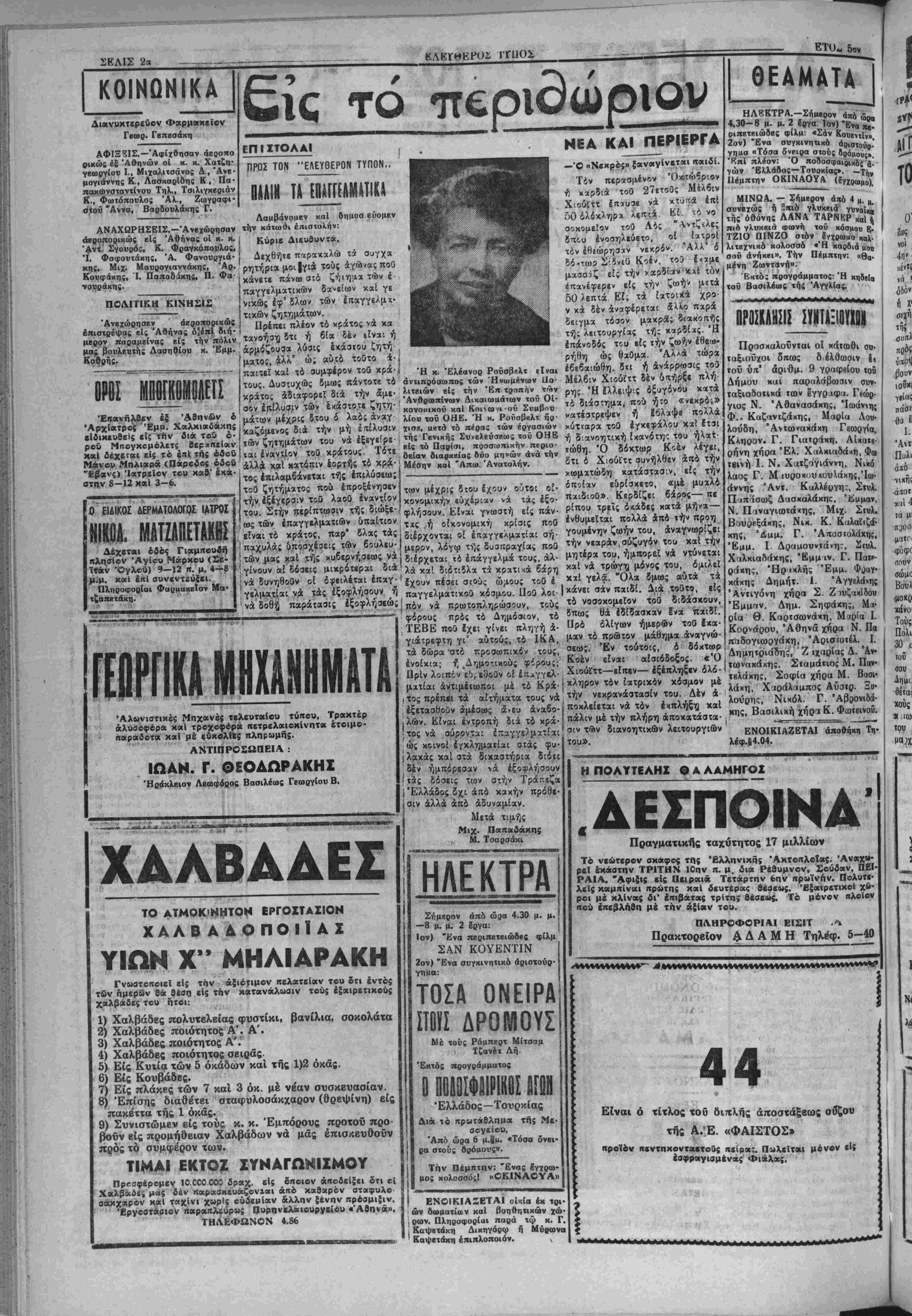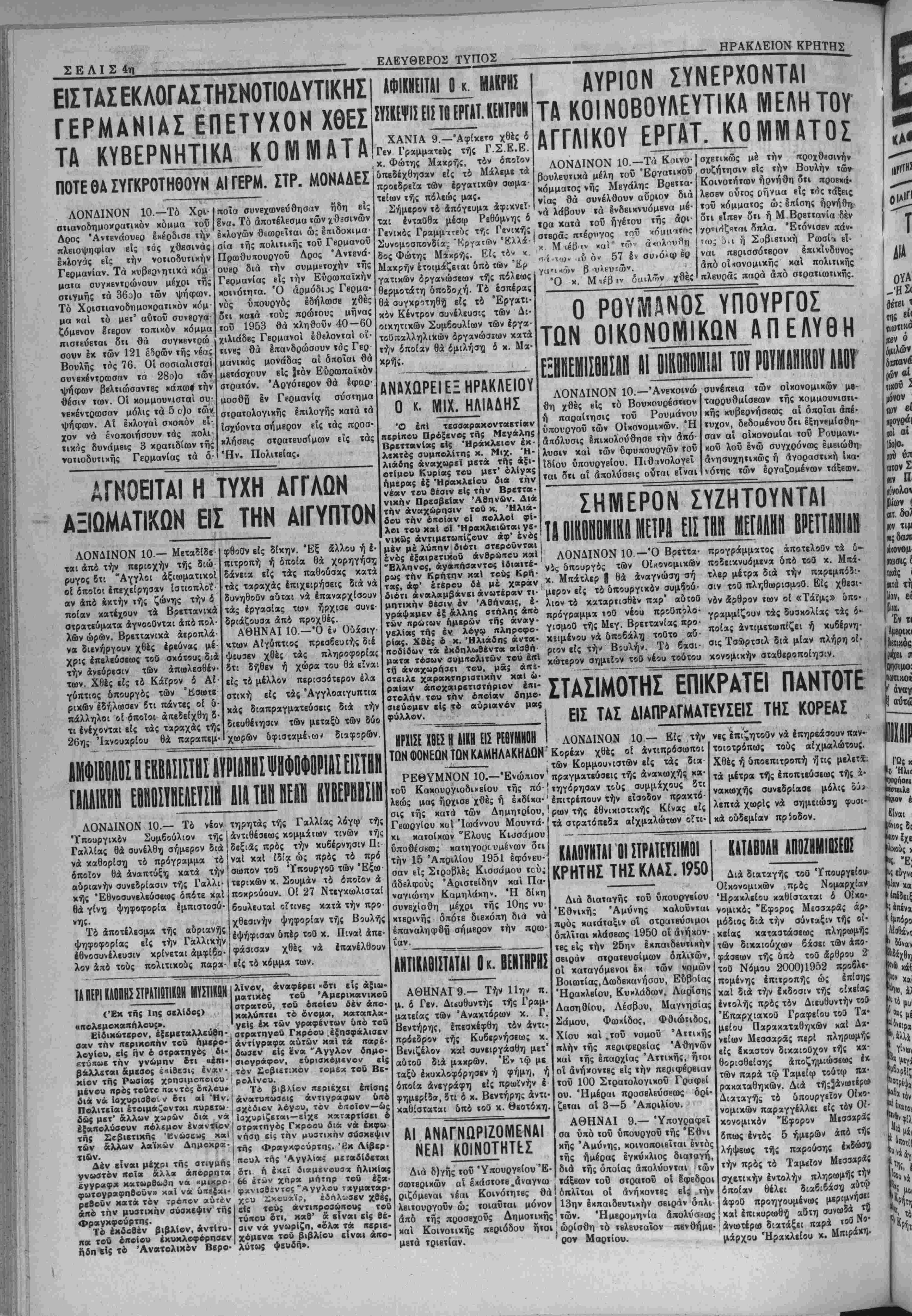φωτογραφπθοϋν» χχϊ νά ύιτε(αι· < ρβθοϋν κατά τόν τρόπον αΰτέν «πό την μυατικήν σύσκεψιν τής Φραγκφούρτη;. Τέ εκδοθέν βιβλίον, άντΐτυ- πα τού όπβίου εκυκλοφόρησεν ήδη Ε»ί το 'Ανατολικήν Βερο¬ λίνον, άναφίρβι «ότι εί; άξιω- ματικος τοϋ 'Αμερικανικοΰ ατρατοϋ, τοΰ όποίου δέν άπο- καλΰπτΐι τό ονομα, καταπλα- γβΐς έκ των γραφέντων υπο τού στρατηγοΰ Γκρόου εξησφάλισεν άντίγρκφα αυτών καΐ τα παρέ¬ δωσεν ίΐς ενα "Αγγλον δημο- σιογράφον, εΰριακβμινον ΐΐς τόν Σοβιετικόν τομεχ τοϋ Βκ- ρολίνου. Τό βιβλίον ΓΓΐριέχει έιτίσης άνατυπωσίΐς άντιγραφων υπό σχεδιον λογου, τόν οποίον—ώς Ιαχυρίζβτβι—βΐχβ καταρτίσβι ό οτρχτηγό; Γκροου δια νά έκφω νήστ) εί; την μυστιηήν σύβκεψιν τής Φραγκςρούρτηί. "Β* Λίββρ· κουλ της Αγγλίας μεταδίδβται ότι η έκεΐ διαμενουσ'χ ήλικίας 66 «των χπρα μήτηρ τοϋ ίξα· φΛνιοβ£ντος "Αγγλου τχγματαρ- χιυ 2«ου7ίϊρ, έδηλίιββν χθές, είς τούς άντιπροσώιτους τοϋ τύκου ότι, καθ1 ά βίναι είς θέ¬ σιν νά γνωρίζη, «δλα τα πβριβ- χόμκνα τού βιβλΕου «Ιναιι απο¬ λύτως ψευδη». ΑΦΙΚΝΕΙΤΑΙ^ ΜΑΚΡΗΣ ΣΥΣΚΕΨΙΣ ΕΙΣ ΤΟΕΡΓΑΤ. ΚΕΝΤΡΟΝ ΧΑΝΙΑ 9.—Αφίκετο χθές δ Γεν Γραμματεύς τής Γ.Σ.Ε.Ε. κ. Φώτης Μακρί);, τδν δττοΐον δπεδέχθηααν είς τδ Μάλεμε τα προεδρεΐα των έργατιχών αωμα- τείων τής πόλεώς μας. Σήμερον τδ άπδγευμα αφικνεί¬ ται ένταθθα μέσω Ρεθύμνης δ Γενικδς Γραμμ-»τ«ιις τής Γενικάς Συνομοσπονδία; "Κργα»6*ν Ελλά¬ δος Φώτης Μιχκρής. Είς τδ« χ. Μακρήν έτοιμίζεΐαι 5πδ των Έρ γατικών δργανώσεων τής πόλεως θερμοτάτη δποδοχή. Τδ εσπέρας θά ουγκροτηθη^ είς τδ Έργατι- κδν Κέντρον συνέλευσις των Δι¬ οικητικώς ΣυμβουλΕων των έργα- τοΰπαλληλικών δργανώσεων κατά την όποιαν θά ομιλήση ό κ. Μα· κρής. ΛΝΛΧΩΡΕΪΕΞ ΗΡΑΚΛΕΙΟΥ Ο κ. ΜΙΧ. ΗΛΙΑΑΗΣ Ό έΐτί τίσσαρακονταβτίαν πϊρίηου Πρόξενος τής Μβγάλπς Βρεττανίας αίς Ηράκλειον έκ· λΐκτός ουμιτολίτης κ. Μιχ. Ή- λιάδης άναχωρβί μβτά τή; άξι- οτίμου Κυρίας τού μ«τ' ολίγας ημέρας έξ Ήρακλϊίου δια την νέαν τού θέσιν είς την Βρεττα¬ νικόν Πρεαββίαν "Αθηνών. Διά την αναχώρησιν τού κ. Ηλιά¬ δου την οποίαν οί πολλοί φί- λοι τού καί οί 'Ηρακλειώται γ«- νικώς άντιμετωιτίζουν άφ' ενός μέν μέ λύπην διότι στβροΰνται ενός εξαιρετικόν άνθρώκου καί "Ελληνος, άγαΐττιααντοί Ιδιαιτέ¬ ρως την Κρήτην καΐ τούς Κρή¬ τα;, άφ' ετέρου δέ μέ χαράν διότι άναλαμβάνβι ανωτέραν τι¬ μητικήν θέσιν έν Αθήναι;, έ- γράψωμεν έξ άλλης στήλης άπό των πρωΐων ημερών τή; άναγ- γελίας τή; έν λόγω πληροφο¬ ρίας. Χ8ές ό κ. Ήλιάδης άντα- ποδίδων τα ίκδηλωθβντα αΐβθή ματα τβσων συμηολιτων τού επι τή άναχωρήσει τού, μά; άπϊ- στειλε χαρακτπριατικήν καί ω¬ ραίαν άποχαιρετιστήριβν έηι- στολην τού την οποίαν δημο- σιεύομκν εί; τό αυριανόν μας φύλλον. ΗΡΧΙΣΕ ΧΒιΣΠΙΚπ ΕΙΣ ΡΕΒΥΜΝΟΗ ΤΩΝ ΦΟΝΕΟΝ ΤΩΝ ΚΑΜΗΛΑΚΗΑΩΝ' ΑΥΡΙΟΝ ΣΥΝΕΡΧΟΝΤΑΙ ΤΑ ΚΟΙΝΟΒΟΥΛΕΥΤΙΚΑ ΜΕΛΗΤΟΥ ΑΓΓΛΙΚΟΥ ΕΡΓΑΤ. ΚΟΜΜΑΤΟΣ ΛΟΝΔΙΝΟΝ 10.—Τα Κοινο- βουλευτικά μέλη τοΰ Έργαΐικοΰ κόμματος νής Μεγάλης Βρβτΐα- νίας θά συνέλθουν αυριον διά νά λάβουν τα ενδεικνυόμενα μέ· ΐρα Χατά τοϋ ηγέτου τής άρι· στβράΐ πτέρνγος τοΰ νόμμτιτος ν Μ ιέβ «ν *ίχ' τ (Τι« ά-ιολ^υθη ηί.ΐο). »ύ όν 57 έν συ>ΟΑω£ο