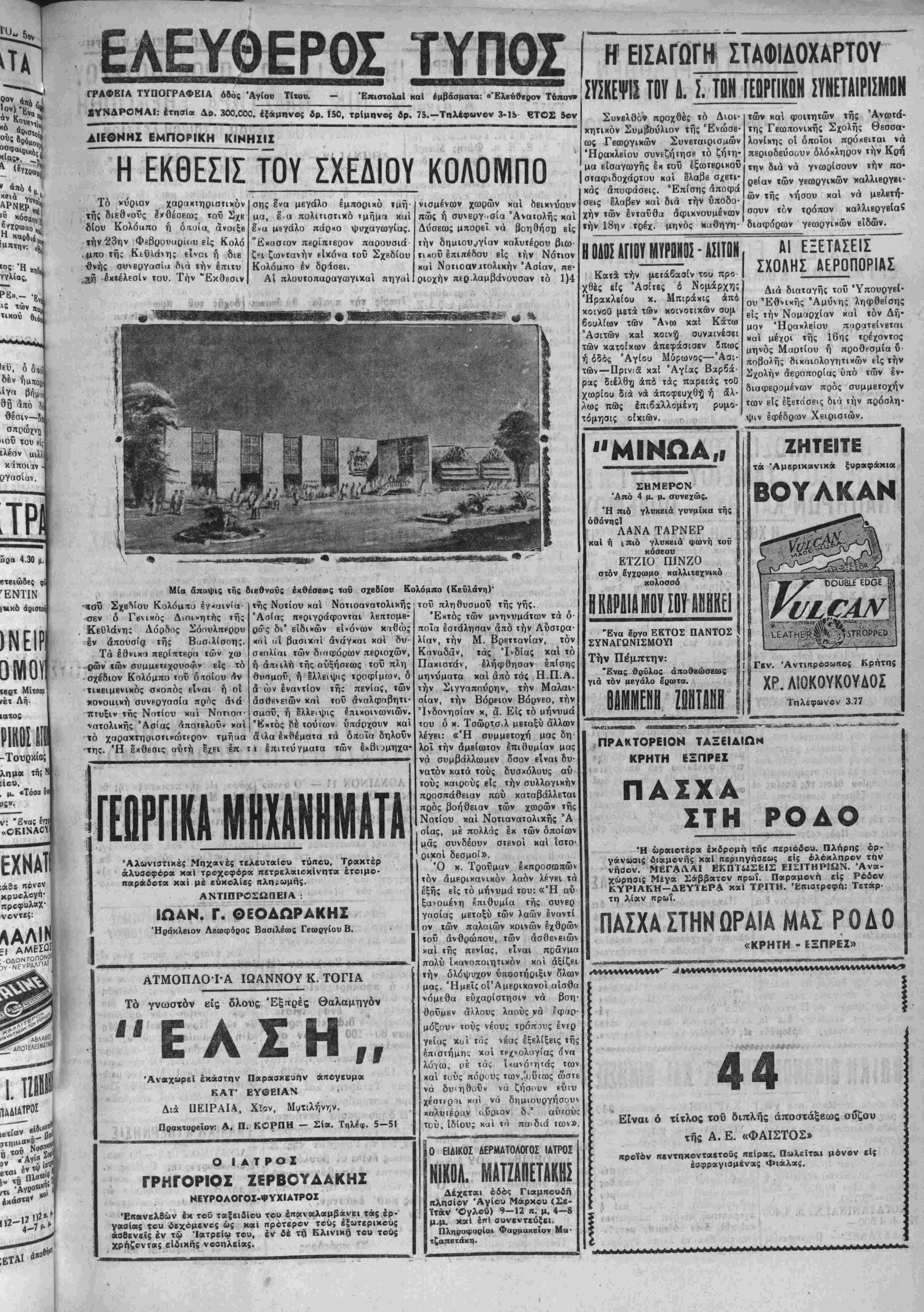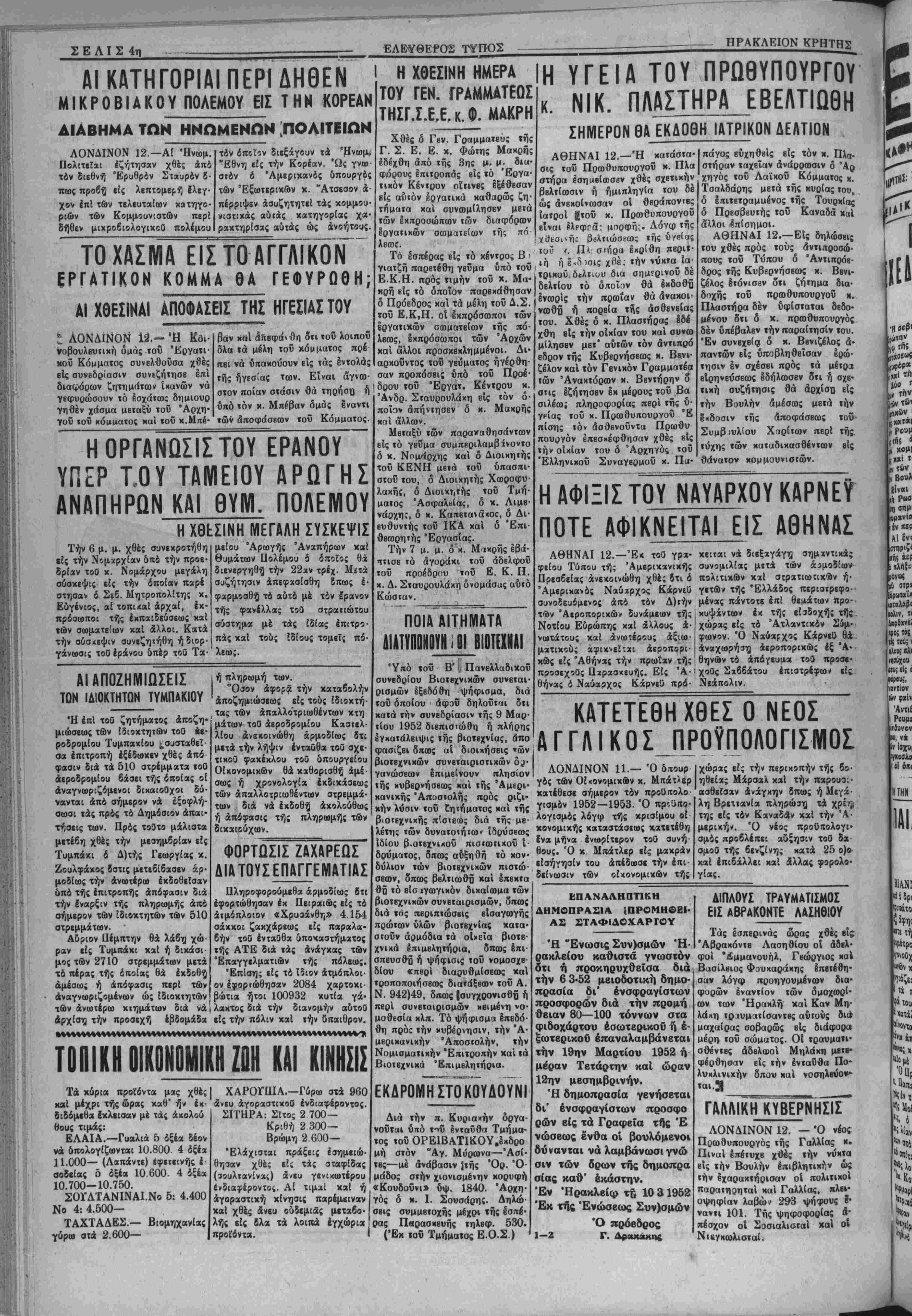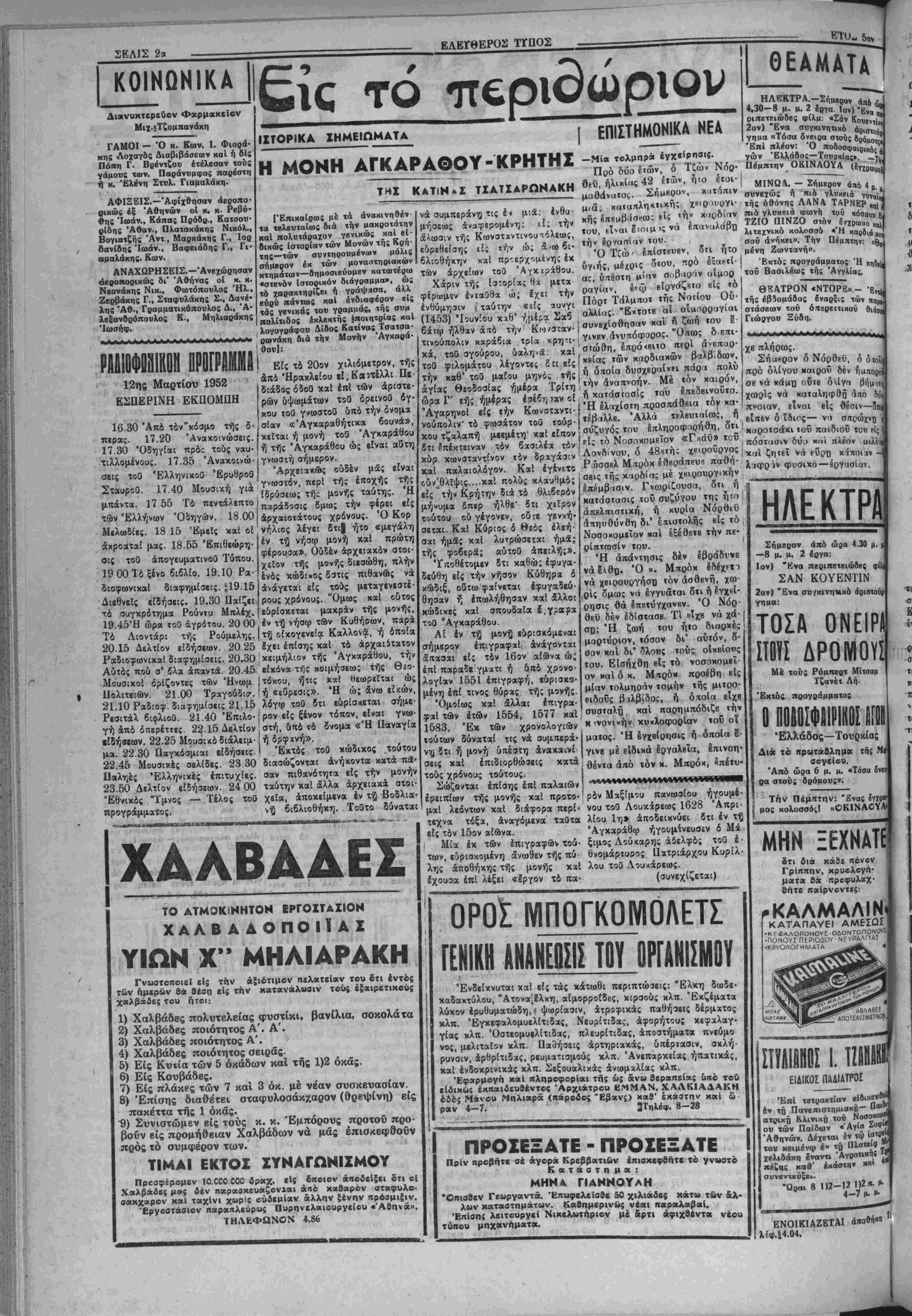 Ιδίου β.οτβχνι,,οϋ πισ.ωίΐκοΰ ί 'ν" ?*?<* ενωρίτερον τοθ συνή- δρύματος, δπως αυξηθή τό κον ββ«ς. Ο κ Μκίτλερ είς μακράν δύλιον των βιοτβχνιχών πιστώ- «ί«.Υηβ£ν τού άπέδωσβ την έκι δ δείνωσιν ων οίχονομιχ&ν τή οεων, δπως ββλτιωθη καί επεχτα δ'ίνωσιν των θη τό είσΐγωγιχόν διχαίωμα των βιοιεχνικών συνεταιρισμών, δπως διά τος περιπιώσβις είσαγωγής πρώιων ύλών βιοτεχνία; χατα στοΰν αρμοδία τα οϊχεΐα βιοτε χνιχά επιμελητήρια, δπως επι σπευσθ'ϋ ή ψήφισις τοΰ νομοσχβ δίου «πβρί διαρυθμίσεοος χαί τϋοποποιήσβως διατάξεων ιοϋ Α. Ν. 942)49, όπως Ισυγχρονισθϊ ή περί συνεταιρισμόν χβιμένη νο· μοθεσία κλπ. Τό ψήφισμιι επεδό¬ θη πρός την κυβέρνησιν, την Ά- μεριχανιχήν Αποστολήν, την Νομισματιχήν Επιτροπήν χαί τα Βιοτεχνιχά Έπιμελητήρια. ΕΚΑΡΟΜΗΣΤΟΚΟΥΑΟΥΝΙ Διά την π. Κυριακήν δργα- νοΰται υπό τιΰ ενταύθα Τμήμα- τος τοΰ ΟΡΕΙΒΑΤΙΚΟΥ.έκδρο μή στόν "Αγ. Μύρωνα—Άσί- τες—μέ ανάβασιν }της Όρ. Ό- μάδος στήν χιονισμένην χορυφή «Κουδοΰνι» ύψ. 1840. Άρχη¬ γός δ χ. Ι. Σουσάρης. Δηλώ· σεις συμμβτοχή; μέχρι της εσπέ¬ ρας Πβρασκβυής τηλεφ. 530. (Έχ τοΰ ϊμηματος Ε.Ο.Σ ) οίχονομιχ&ν τής χώρας είς την περικοπήν τής βο¬ ηθεία; Μαρσάλ καί την παρουσι¬ ασθείσαν ανάγκην δπως ή Μέγα- λη Βρετιανία πληρώΐη τα χρετ^, τη; είς τόν Καναδαν καί την Α¬ μερικήν. Ό νέος προΰιτολογι· σμός προβλέπει αύξησιν τοθ δα- σμοθ τής βενζίνης κατά 25 ο)» καί επιβάλλει χαί άλλας φορολο- γίας. ΕΠΑΝΑΛΗΠΤΙΚΗ ΔΗΜΟΠΡΑΣΙΑ ΙΠΡΟΜΗ©ΕΙ· ΑΣ ΣΤΑΦΙΔΟΧΑΡΓΟΥ Ή "Ενωσις Συν)σμών Η¬ ρακλείου καθιστά γνωστόν δτι ή προκηρυχθείσα διά την 6 3-52 μειοδοτική δημο- πρασία δι' ένσφραγίστων προσφορών διά την προμή θείαν 80—100 τόννων στα φιδοχάρτου έσωτβρικοϋ η έ- ξωτερικοϋ έπαναλαμβάνβται την 19ην Μαρτίου 1952 ή μέραν Τετάρτην «αί ώραν 12ην μεσημβρινήν. Ή δημοπρασία γενησεται δι' ένσφραγίστων προσφο ρών είς τα Γραφεϊα τής Έ νώσεως ένθα οί βουλόμενοι δύνανται νά λαμβάνωσι γνώ σιν των δρων τής δημοπρα οίας καθ" εκάστην. Έν Ηρακλείω τβ 10 31952 Έκ τής Ενώσεως Συν)σμών 1-2 Ό προβδρος Γ. ΔΙΠΛΟΥΣ ΤΡΑΥΜΑΤΙΙΜΟΣ ΕΙΣ ΑΒΡΑΚΟΝΤΕ ΛΑΣΗΘΙΟΥ Τάς εσπερινάς ώρας χθές βϊς Άβραχόντε Λασηθίου οί άδβλ- φοί 'ώμμανουήλ, Γεώργιος καί Βασίλβιος Φουχαράχη; Ιπβτέθη· σαν λόγω προηγούμενον δια· φορών εναντίον των ομοχωρί¬ ων των Ήρακλή χαί Καν Μτ>-