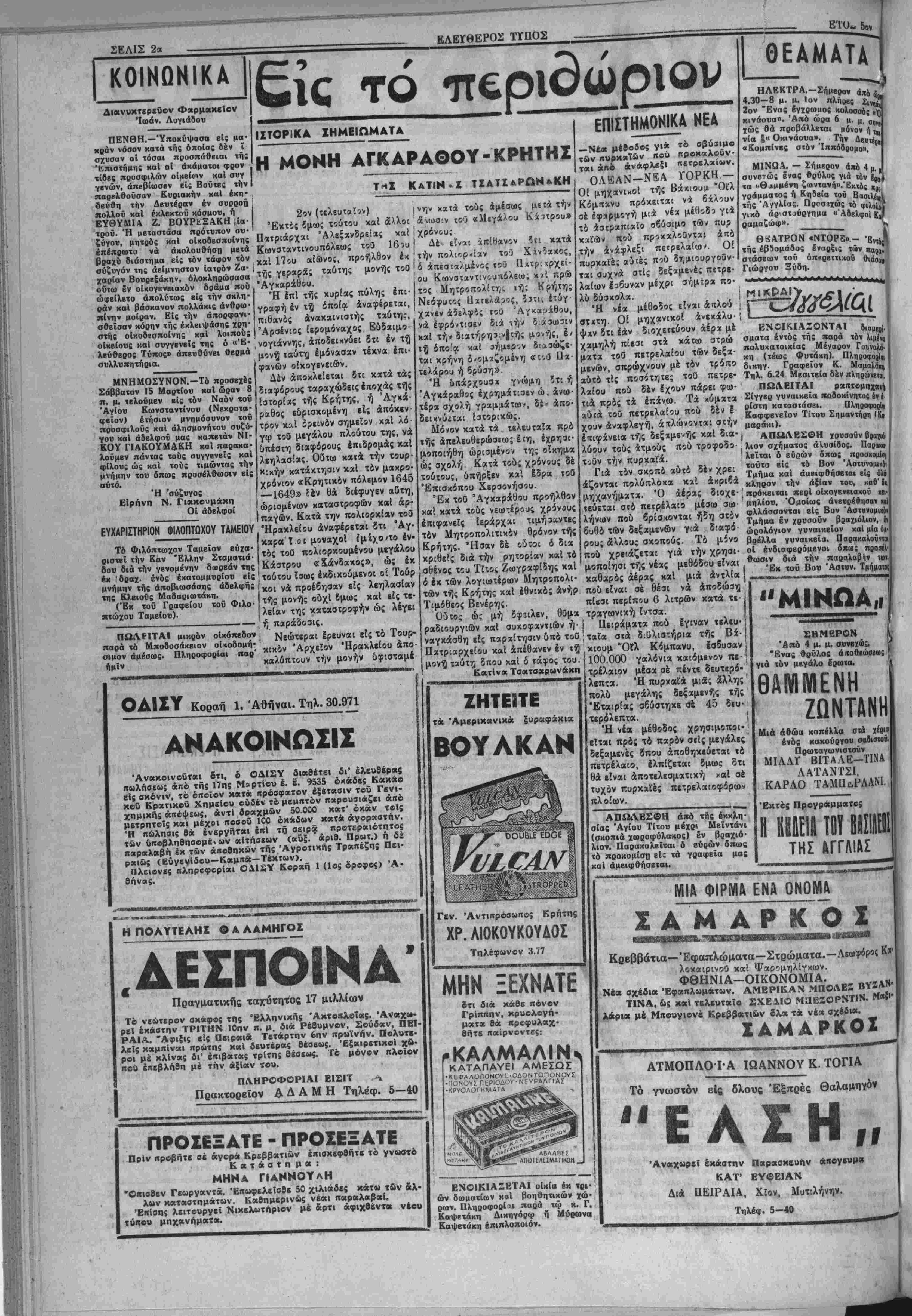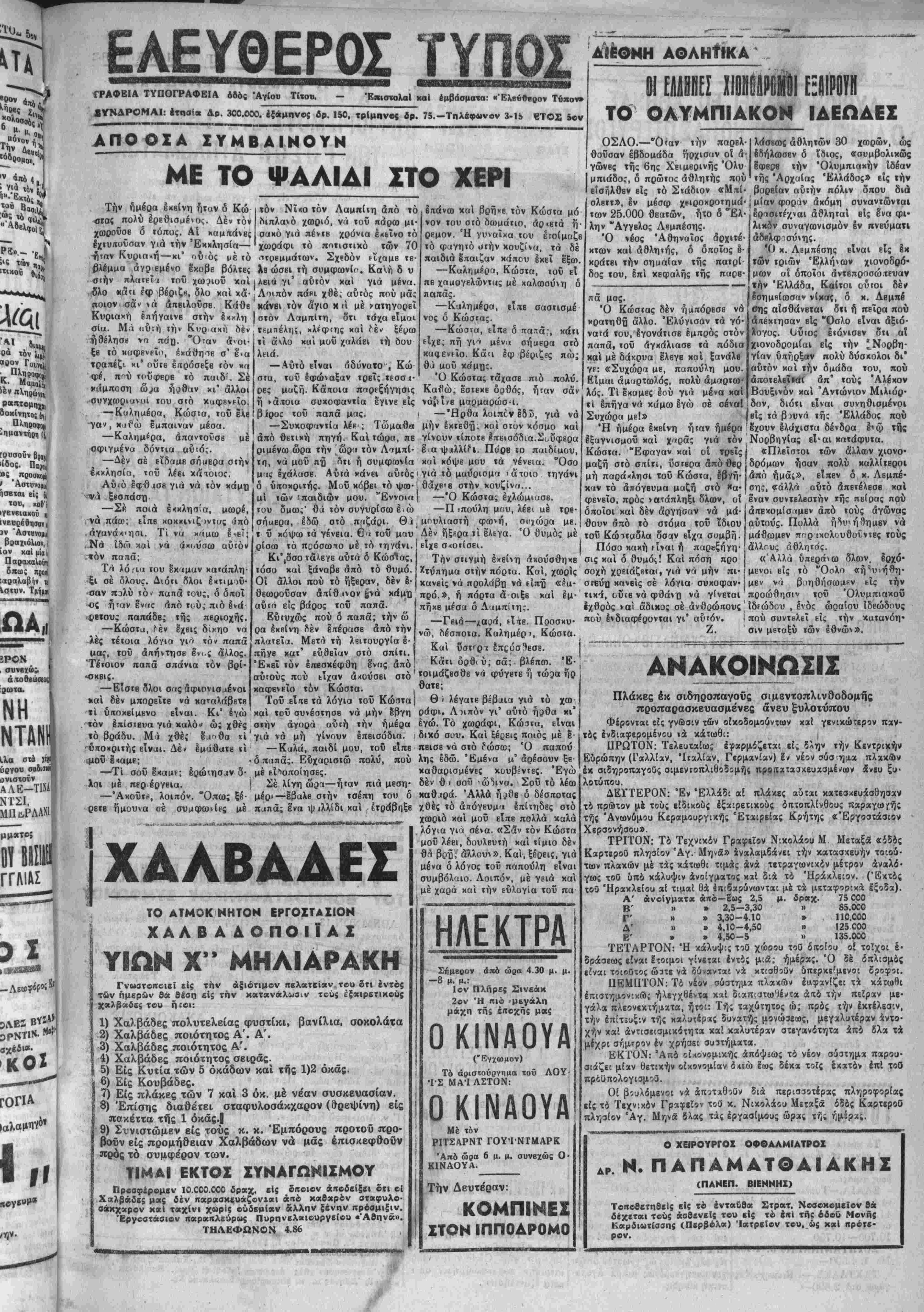νης Ηλ., Ζβρβόπουλος Γ., Λιόγκο< θρ., Λογιάΐον Εύανθία. —Άνβχώρηοαν χβές άεροπορι- κώς ·1ς Αθήνας χ. χ, Μπουφίδης ΑΝΑΚΟΙΝΩΣΙΣ Τπενθυμίζομεν είς τοΰς ενδια¬ φερομένους στρατευσίμου; κλά¬ σεως 1952 δτι δέον νά σπιύ- σωαι χαί παρουσιασθώσιν είς τάς χατά τδπους Αστυνο¬ μικάς Αρχάς έντδς τοθ μηνός Μαρτίοα πρός λήψιν τ6ν κε>*β·