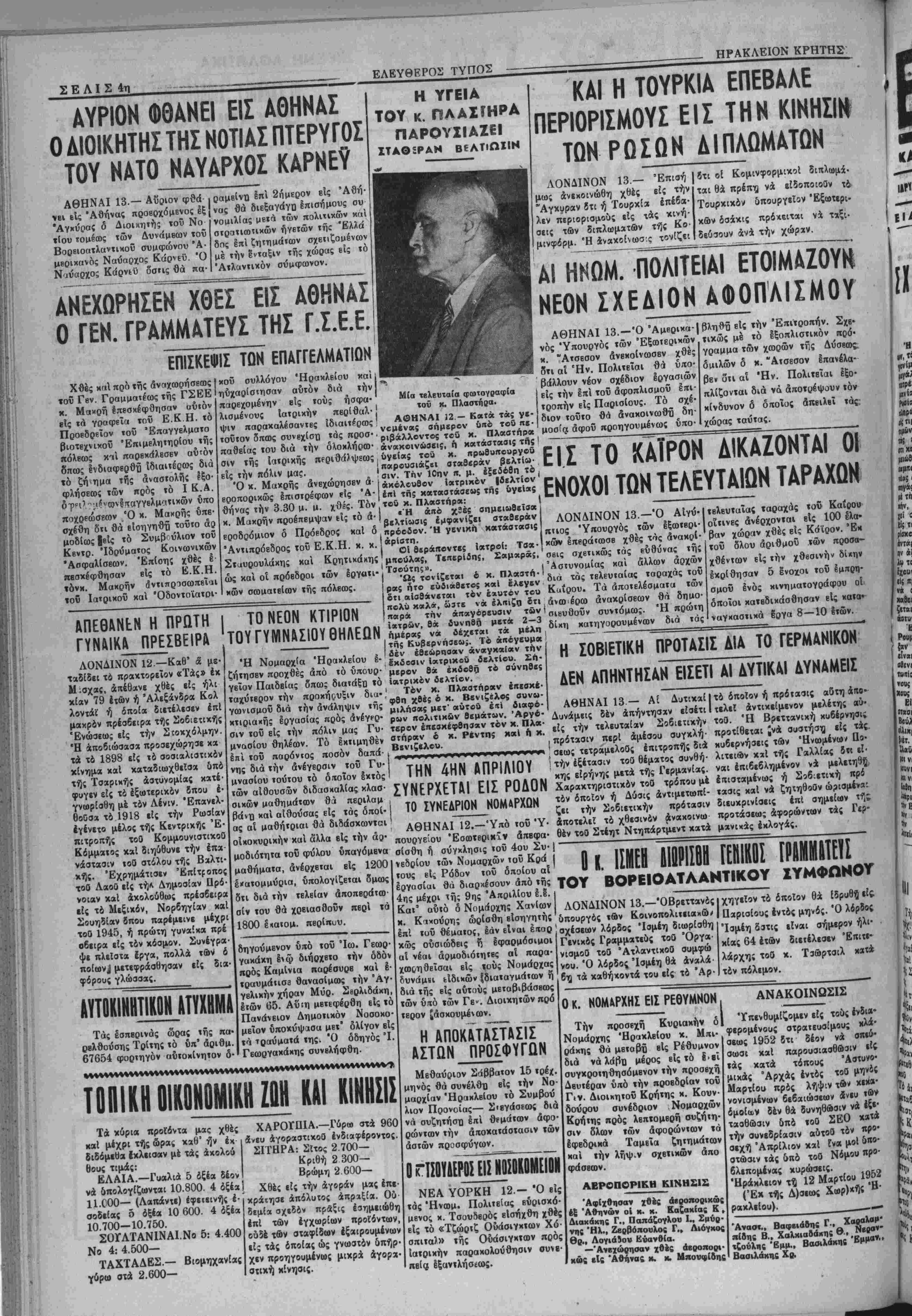 μιλήσα; μβτ' αυτού έ<τι διαφό¬ ρων πολιτΐΗών θΐμάτων. Αργό¬ τερον επεσκέφθησαν τόν χ. Πλα- βτηροτν έ χ. Ρέντης καί η κ. Βκνιζΐλου. ΤΗΝ 4ΗΝ ΑΠΡΙΛΙΟΥ ΣΥΝΕΡΧΕΤΑΙ ΕΙΣ ΡΟΛΟΝ ΤΟ ΣΥΝΕΔΡΙΟΝ ΝΟΜαΡΧΟΝ ΑΘΗΝΑΙ 12.—Υπό τοΰ "Υ· πουργείου Έσωτερικΐν απεφα¬ σίσθη ή σύγκλησις τοΰ 4ου Συ· νεδρίου των Νομαρχών τοΰ Κρά τους εί, Ρόδον τοΰ δποίου αί εργασίαι θά διαρχέσουν άπό της 4ης μέχρι τή; 9ης Απριλίου Ι.ϊ. Κατ' αύιό δ Νομάρχης Χανίων κ. Κιχούρης ωρίσθη βίσηνητίις επί τυΰ θέματος, εάν είναι έιταρ κώς ούσιώδεις ν, έφαρμόσιμοι αί νέαι άρμοδιόιητβς αί παρα- χωςηθεΐσαι είς τ,ούς Νομάρχας δυνάμ«ι ^Ιδικών {διαταγμάτων ή διά τής είς αύτούς μεταβιβάσβως των υπό των Γε*. Διοικητών πρό τερον £<ισχουμένων. η αποκαταΙτασϊΓ" αστων προσφυγων Μεθαύριον Σάββατον 15 τρέχ. μηνός θά συνέλθυ. είς την Νο¬ μαρχίαν ΉρηκλβΙου τό Συμβού λιον Προνοίας— Σιεγάσεως διά νά συζητήση εηί θεμάιων άφο· ρώντων την αποκατάστασιν των άστών προσφύγων. ογισουδεροσεισ¥σοκωμε1 ΝΕΑ ΥΟΡΚΗ 12.- Ό βΐς τάς Ήνωμ. Πολιτείας βύοισκό- μβνος κ. Τσουδβρός είσήχθη χθές είς τό «Τζώρτζ Ουάσιγκτων Χό· σπιταλ» τής Ουάσιγκτων πρός Ιατρικήν παρακολούθησιν συνε- ηβΐα Ιξαντλήοεως. ΑΘΗΝΑΙ 13.-Ό Άμβρικα- νός Ύπουργός των Εξωτερικών χ. "Ατσεσον ανεκοίνωσεν χθες δτι αί Έν. Πολιτειαι θά υπο- βιίλλουν νέον σχέδιον εργασιών είς την επί τοΰ άφοπλισμοΰ επι¬ τροπήν εις Παρισίους. Τό σχέ¬ διον τουτο θά άνακοινωθΰ δη¬ μοσία άφοΰ προηγουμένως υπο· βληθϋ βΐς την Επιτροπήν. Σχβ· τικώς μέ τό Ιξοπλιστικόν πρό· γραμμα των χωρών τής Δύσβως. ομιλών δ χ. ΆτσΕσον Ιπανέλα- βεν ότι αΐ Ήν. Πολιτειαι Ιξο· πλίζονται διά νά άποτρέψουν τόν κίνδυνον δ δ ποίος άπβιλβΐ τάς: χώρας ταύτας. ΕΙΣ ΤΟ ΚΑΪΡΟΝ Λ.ΚΑΖΟΝΤΑΙ ΟΙ ΕΗΟΧΟΙΤΟΗ ΤΕΛΕΥΤΑΙΟΝ ΤΑΡΑΧΟ.Ν ΛΟΝΔΙΝΟΝ 13.—Ό Α1γύ· πτιος Ύπουργός των Ιξωιβρι- κτβν επεράτωσε χθές τάς άνακςιΐ· σβις σχετικώς τάς βύθύνας τής Άστυνομίας καί άλλων άρχών δια τάς τελευταίας ταραχάς τοΰ Καΐρου. Τα άποτελέσματιι των άνω>έρω άνακρίσεων θά δημο-