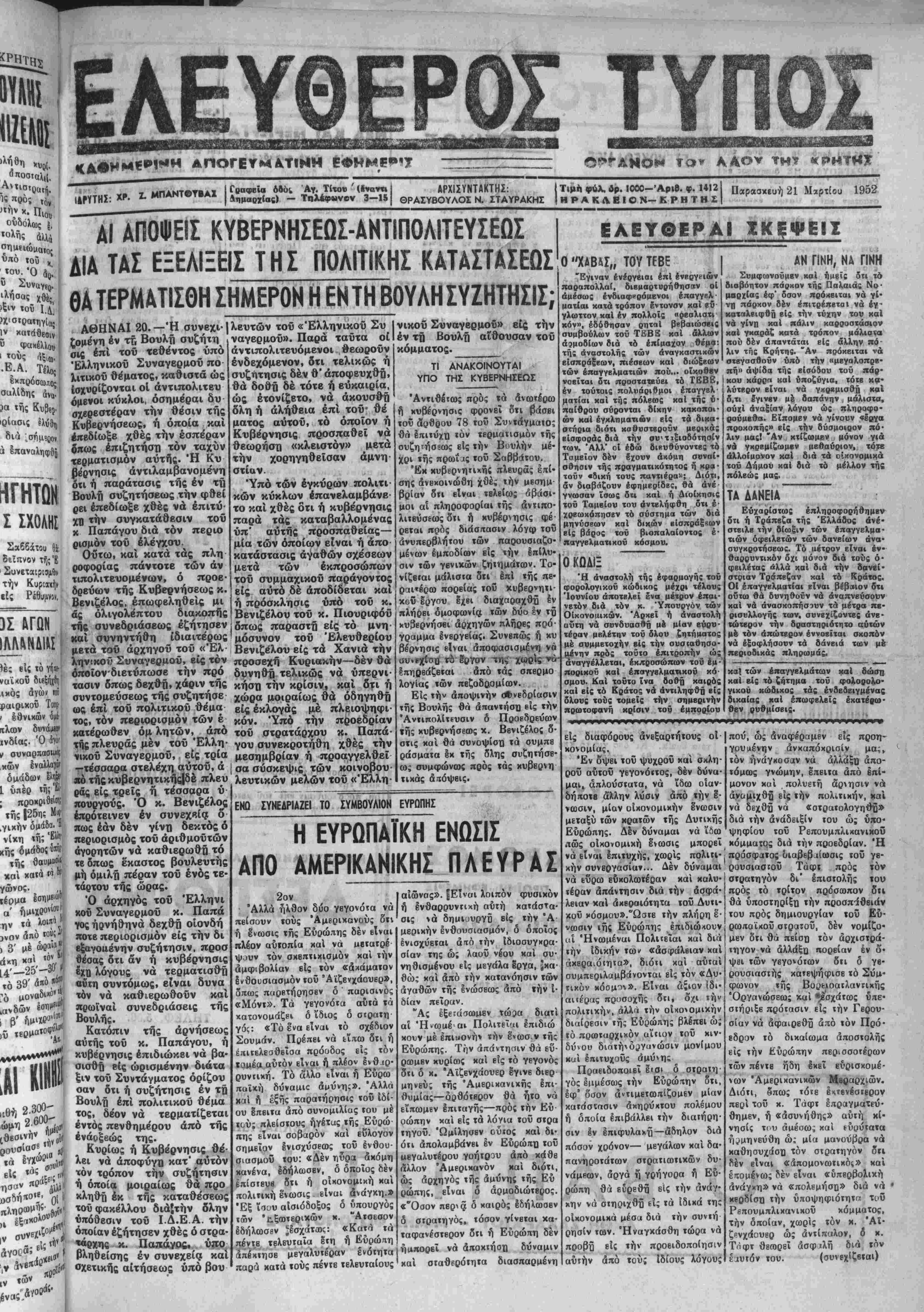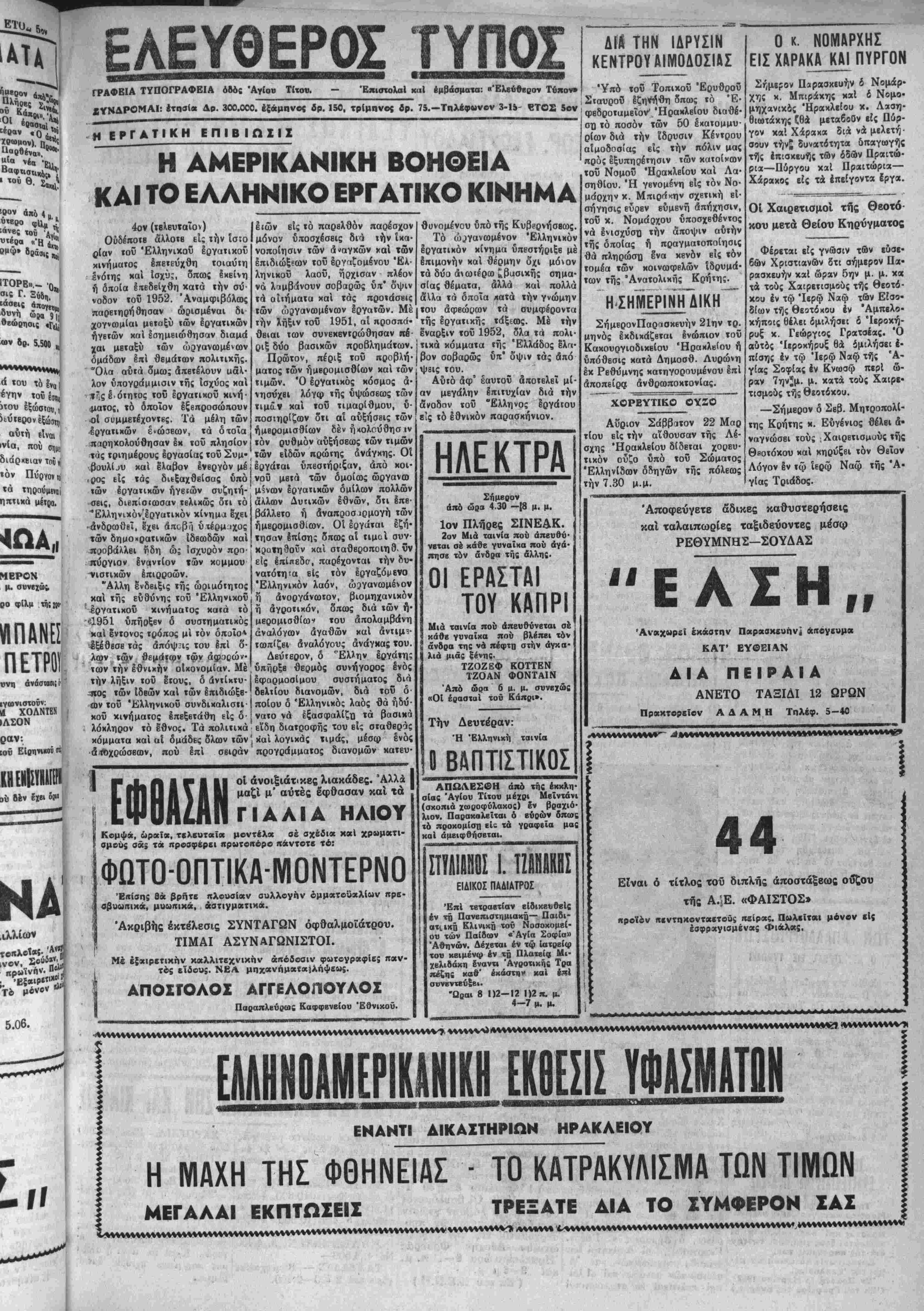 ρο φίλμ τή;»ο< «ΠΑΝΕΙ ΠΕΤΡΟΙ »νη άνάσταβιίΐ ιγωνιστονν. Λ ΧΟΛΝΤΕΝ ι ίΛΣΟΝ ΝΑ .ιλλίων Τβ μόνβ» 5.06. -—< ΕΛΕΥΘΕΡΟΣ ΤΥΠΟΣ ΓΡΑΦΒΙΑ ΤΥΠΟΓΡΑΦΕΙΑ όδός ΆγΕου Τίτον. — Επιστολαί καΐ «μβάσματα: «Ελεύθερον Τυχόν» ΧΥΝΛΡΟΜΑΙ: έτπσίβ Δρ. 300.000. έξέμηνος δρ. 150, τρίμηνος δρ. 75.—Τηλέφωνον 3-15- ΕΤΟΣ 5ον Δίί ΤΗΝ ΙΔΡΥΣΙΝ ΚΕΝΤΡΟΥ ΑΙΜΟΔΟΣΙ&Σ Η ΕΡΓΑΤΙΚΗ ΕΠΙΒ ΙΩΣΙΖ Η ΔΜΕΡΙΚΑΝΙΚΗ ΒΟΗΘΕΙΑ* ΚΑΙ ΤΟ ΕΛΛΗΝΙΚΟ ΕΡΓΔΤΙΚΟ ΚΙΝΗΜΑ 4ον (ΐβλευταΐον) Οϋδέποτβ άλλοτε εί; ΐήν ίσιο ρίαν τοΰ Έλληνιχοϋ έογατικοΰ κινήματος επετεύχθη τοιαύιη ένόιης καί ϊσχύς, δπως Ιχείνη ή όποία έΐτεδβίχθη κατά (ήν σύ¬ νοδον ΐοϋ 1952. Άναμφιβόλοος παρετηρήθησαν ωρισμέναι δι χογνωμίαι μβταξύ των έργατικών ήγβτών καί εσημειώθησαν διαμά χαι μεταξύ των ώργανωμένων όμάδων επί θεμάτων πολιΐικής. Όλα αύτά δμως απετέλουν μάλ¬ λον ύπογράμμισιν τής ίσχύος χαί «',ς ε.ότητος ΐοΰ εοΥατικοΰ χινή"- ματος, τό οποίον έξθπροσώπουν -οί συμμετέχοντες. Τα μέλη των έργαιιχών έόώαεων, τα ότοΐα παρηκολούθησαν έκ τού πλησίον τας τριημέρους εργασίας τοΰ Συμ· βουλίου καί έλαβον ένβργόνμέί ,οος είς τάς διιξαχθείσας υπό των έργατικών ήγείών συζήτη¬ σις, διεπίοιοοσαν τβλικώς ότι τό "Ελληνικόν^έργατικόν κίνημα εχει «νδρωθίΐ, ϊχβι δαοβίϊ ύτέρμιχος των δημοκρατικαί ίδβωδών μ αί ποοβάλλει ίίδη ώς ϊσχυρόν προ πύργιον εναντίον των κομμου νιστικών έπιοροών. "Αλλη Ινδβιξις τής ώοιμόιητος και τής ευθυνής τοΰ "Ελληνικόν Ιονατικοϋ κινήιιαΐος καίά τό <1951 ύπήοξβν ό συστηματικός χαί έντονος τρόπος μί τόν όπαΐο* εξέθβσβ τάς άποψις τού επί δ· λων τ^ν θεμάτφν τφν άςροςών· των την εθνικήν οίχονομίαν. Μέ την λήξιν τοΰ έτους, ό άντίκτυ- «ος των ίδβών καί των επιδιώξβ- αν τοΰ Έλληνικοΰ συνδικαλισιι- κου κινήματος έπεξβτάθη είς δ λόχληρον τό εθνος. Τα πολιτικά κόμματα καί αί δμάδες δλων των', άΛχρώσεων, πού §πί σειράν έΐών είς τό παρελθόν παρέσχον μόνον ύποσχέσβις διά την ικα¬ νοποίησιν των ά«αγκών χαί των έπιδιώξεων τοΰ Ιργαζομένου Έλ· ληνικοΰ λαοϋ, ήρχισαν πλέον νά λιμβίίνουν σοβαρώς ύπ* ό'ψιν ιά αίιήματα χαί τάς προτάσβις των ώ^γανωμένων έργατών. Μέ την λήξιν τοΰ 1951, αί προσπά¬ θειαι των συνεκεντρώθησαν πέ οιξ δύο βασικών προβλημάτων. Πρώτον, πέριξ τοϋ προβλή· ματος των ήμβρομισθίων καί των ημών. Ό εργατικάς κόσμος ά· νησΰχβι λόγω τής ύψώσεως των τιμάν καί τοΰ τιμαρΐθμου, ΰ- ποσιηρΐζων ότι βί αύξήσεις των ήμβςιομισθίων δέν ήκολούθησιν τόν ρυθμόν αυξήσεως των τίμιον των είδών ηρώτης άνάγκης. Οί εργάται υπεστήριξαν, άπό κοι- νού μειά των ομοίως ώογανω μίνων έογατικών όμΐλων πολλών άλλαν Δυτικών εθνών, δτι επε¬ βάλλετο ή άναπροσιρμογή των ήμεοομισθιων. Οί έογάται εζή¬ τησαν Ιπίσης δπως αί τιμαί συν· χοατηθούν καί σταθεροποιηθ. ϋν είς έπίπεδσ, παρέχονται την δυ- νατότηΐα είς τόν εργαζόμενο "Ελληνικόν λαόν, ώογανωμένον ή άνοργάνωτον, βιομηχανιχόν ή άγροτιχόν, δπως διά των ή· μεοομισθίω·· τού άπολαμβάνη άναλόγων αγαθών χαί άντιμ ■ τωπίζει δναλόγους ανάγκας τού. Δβύτεοον, ό Έλλην Ιογάτης ΰπήρξβ θερμός συνήγοοος ενός ίςραρμοσΐμου συστήματος διά δελτίου οΐανομών, διά τοΰ ό ποίου δ Έλληνικός λαός θά ηδύ¬ νατο νά Ιξασφαλίζη τα βασικά ειδή διατροφής τού είς σταθεράς καί λογικάς τιμάς, μέσω ενός προγοάμματος διανομών κατευ- οί άνοιξιάτικες λιακάδες. Άλλκ μαζί μ' αύτές έφθασαν καί τα ΓΙΛΛΙΑ ΗΛΙΟΥ Κομψά, ώραΐα, τβλβυταΐα μοντέλα σέ σχέδια καί χρωματι- σμβύς σκ; τα προαφβρϊΐ ηρωτοιτόρο παντοτβ τό: ΦΩΤΟΟΠΤΙΚΑΜΟΝΤΕΡΝΟ 'Ειτίσης Θά βρήτε πλουσίαν συλλογήν όμματοϋαλίων