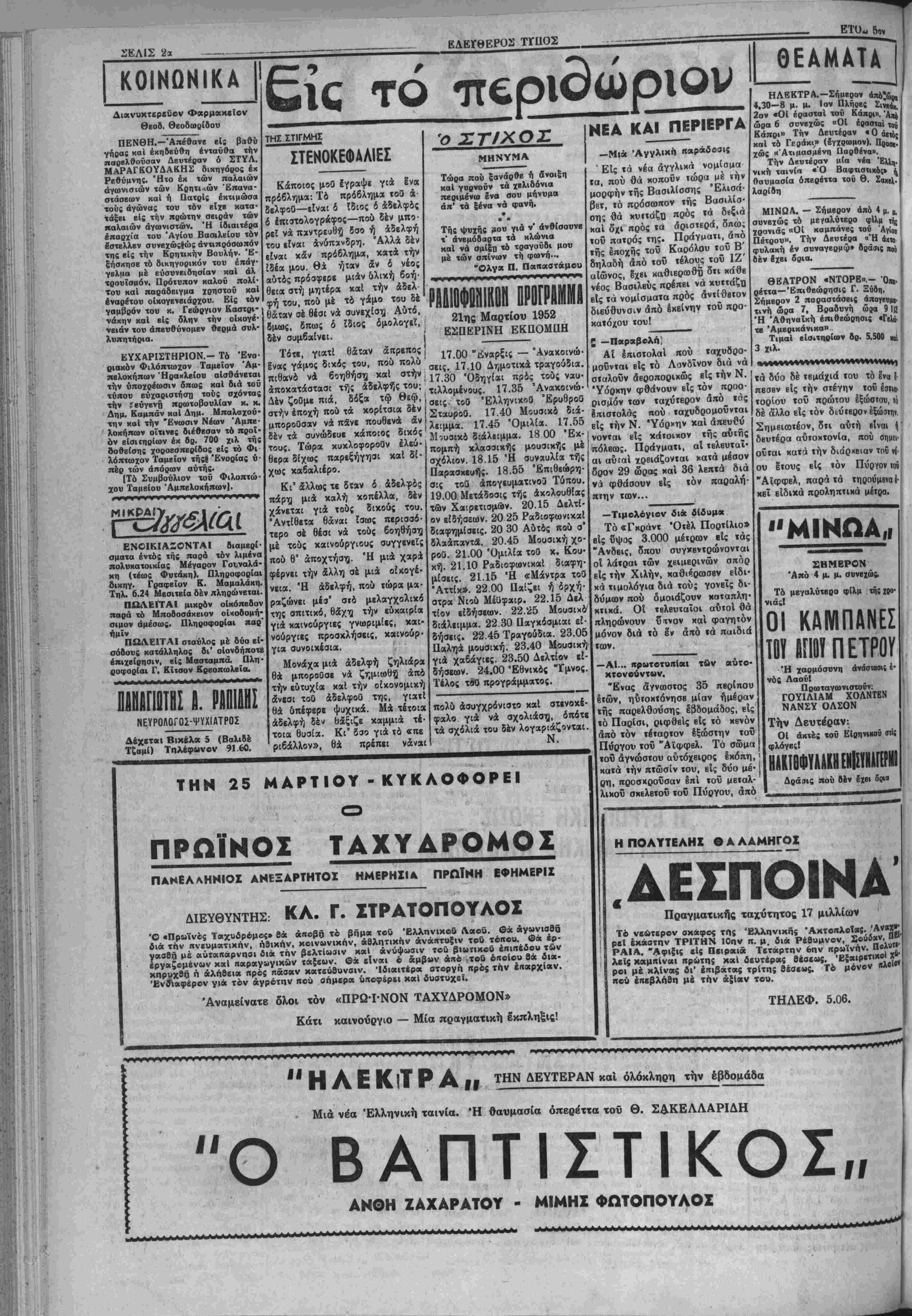 δ οποίος έχαοακτήρισεν ώς ά3<ι· σίμους τας κατηγορίας τοϋ Συνα- δυνάμεων τής χώρας. Είς τό σημείον αύιό έλαβεν χώραν δια· λογιχπ συζήτησις μεταξύ πολλών βουλβυτών δια νά λάβυ κατο- ιιν τόν λόγον δ κ.Παπασπύοου χαί δ εκ των εκπροσωπών τοΰ ώ.Σ. χ. Στεφανόπουλος δ οποί¬ ος ετόνισεν ό»ι ή Κυβίονησις απέτυχεν είς τόν τομέα §φαρμο» γής των μέτρων Είοηνβύσεως. Ή συνεδρίασιν, Ιλύθτι την 3.30 πρωϊνήν διά την 6 μ.μ. σήμε¬ ρον. γελίαγ τφγ ίπΐιτουμένων δλικων __________________ υδρεύσεως. ! ό Δ)ντής τού Πολιτικαί γρ < Ι αρχαί τής πόλεώς μας. Διαπραγματευθή μετα φε[ου Ιο- Προϊδρ.ύ»»ΐος τήςΐ Ό Άμερικανός Πρ6< της Εθνικης Τραπέζης: Με- ΗυρΒ0νήΟ8ως Χ. βενιζέλου, κ. χ. Πιουοιφόϋ δστις θά συνο τα των αρμοδίων της Μνιχης Βι:(3δινογι(ίννη- δια ιηλινραφή. δεύεται ύκό τής χυρΐας τού θά Τραπέζης ανήλθομεν είς μα· ■ κράν σύσκεψιν χαι έξητάσαμεν νό δλον ζήτημα μέ πάσαν λεπτο¬ μέρειαν. Διεπιστώθη δτι υπάρ- χει πλήρης διάθεσις καί κατα- νόηοις έκ μέρους αμφοτέρων των πλευρων διά νά πραγματοποιηθή! τό έργον τοθτο. "Ηδη έξεπονήθη χαί μδς απεδείχθη τό σχέδιον τοθ θεάτρου τό όποιαν θά περι- λαμβάνη 500 θέαεις καί θά έχη δλας τάς συγχρΐνους τελειοποιή- ΤΟ ΖΗΤΗΜΑ ΤΩΝ ΑΠΟΛΛΟΤΡΙΩΣΕΩΝ Ο ν. ΖΕΡΒΑΣ ΕΙΣ ΤΥΜΠΑΚΙ Χθές την πρωΐαν δ Πρόεδρος των Πρωτοδικών κ. Ζέρβας με¬ τέβη έκ νέου είς Τυμπάκι πρός αποπεράτωσιν τής έκδικάσεως των ελαχίστων άπομενουσων ει¬ σέτι άμφιαβητήσεων τής κυριδ- τητος των 2710 άπαλλοτριιοθέν· των ατρεμμάτων τοθ άΐροδρο- μίου ΤυμπακΙου. Ά πό σήμερον ό μ. Ζέρβας θά αρχίση την ερ¬ γασίαν διά την έκδοσιν τής σχε¬ τικάς αποφάσεως βάσει τής δ ποίας αρχίση ή πληρωμή των διχαιούχων. ΙΕΡ'ΓΠΑ^ΓτΡίϊΓ" ΕΪΑΓΓΕΔ1ΣΤΡΙΑΣ ΠΡΑΣΣΑΣ Την ηροσιχή Τρίτην 25ην Μαρτίβυ ηανηγυρίζει ο φερώνυ- ϊιος Ιβρός νβός Εύαγγίλιστρίας Πρασσάς κκί παρακαλοΰνται όϊ φΐλίορτοι διτοας τιμήσωσι ταύτην ώιά τή; παροοσίας των. Ο «. ΠΙΟΥΡΙΦΟΫ· ματός τού χθέ; βΐς τή« χίαν Ήριχλ&ίου άννέλει δΐι ό Ι» Αθήναις "Αμίριχανος Πρ« σβευιής μ. Πιουριφόϋ κατά την μετάβασιν τού εξ Αθηνών είς Χανιά αυριον Σάββατον διά νό παραστη είς τό Ιν τφ Άκρω- τηρίφ τβλεσΗησόμενον ανη^ό συνον τοΰ Ελευθερίου Βενιζέ¬ λου θά διέλθη πΐ/οηγουμέ»ως §χ τής πόλεώς μας. Τόν χ. Πι· ουριφόϋ δσΐις θά φθάση οΰοι- όν την 10 π. μ. άεουποοικ£ς ένταϋθα θά ύποδβχθοϋν εί: »ό αεροδρόμ'ον δ Νομάρχης μ. Μπι· ράχης, ό Δήμαρχος κ. Γβώ^γ. Γβωργιάδης, οί Διοικήται των φιλο$ενηθ'£ είς την οίχίαν ιοΰ κ. Στυλ. Γιαμαλά^η ίαΐροϋ χατά την διάρκειαν δέ τής ενταύ θα παραμονής τού θά ΙπισχΕφθϊί δμοϋ μετά τής κυοίας τού τό _ Μουσείον, τάς αρχαιότητάς τής ; Κνωσού πιθανώς δέ τό ι!πό γευμα θά μβΐαβΐ καί είς την Φαισΐόν. Εις τόν κ. Πιουριφόϋ θά προσφεςθΉ άνθοδέσμη δαπά ναι τοΰ Δήμου Ηρακλείου καί θά παρακαθήση είς γείμα «α Οατεθησόμενον υπό τοΰ Δήμου πρός τιμήν τού. Τό ζεΰγος Πιου ριφόϋ τό^δποϊον θά άναχωρήσχι την νύκτα τοΰ Σαββάτου ή τή* πρωΐαν τής Κυριαχής άεοοπορι κώς είς Χανιά θά αυνοδεύσουν πιθανώς δ Νομάρχης κ. Μ«ι· οάχης, δ Δήμαρχος κ. Γεωργιά¬ δης καί οί έκπρόσωποι των λοι- πών πολιτικών χαί στρατιωτικών Άρχών τής πόλεώς μας. ΑΝΑΚΟΙΝΩΣΙΣ Αυριον Σάββατον 22 Μαρ τίου 1952 καΐ ώραν 4 μ. μ. έν τη αιθούση τής Στρατιω- τικής Λέσχης Φρουράς Ή ρακλείου θέλει διβνεργηθή ό άναβληθείς μειοδοτικός δι αγωνισμος διά την άνάδει- Ιιν χορηγητοΰ προμηθείας όπωρολαχανίκων διά τάς α¬ νάγκας τοΰ Κ,Ε.Ν.Η. καί διά τό χρονικόν διάστημα άπό 1 Απριλίου εως 30 Ι ουνίου 1952. Οί βουλόμενοι δύνανται νά λάβουν γνώσιν των δρων συμφωνιών προ- νρι τη