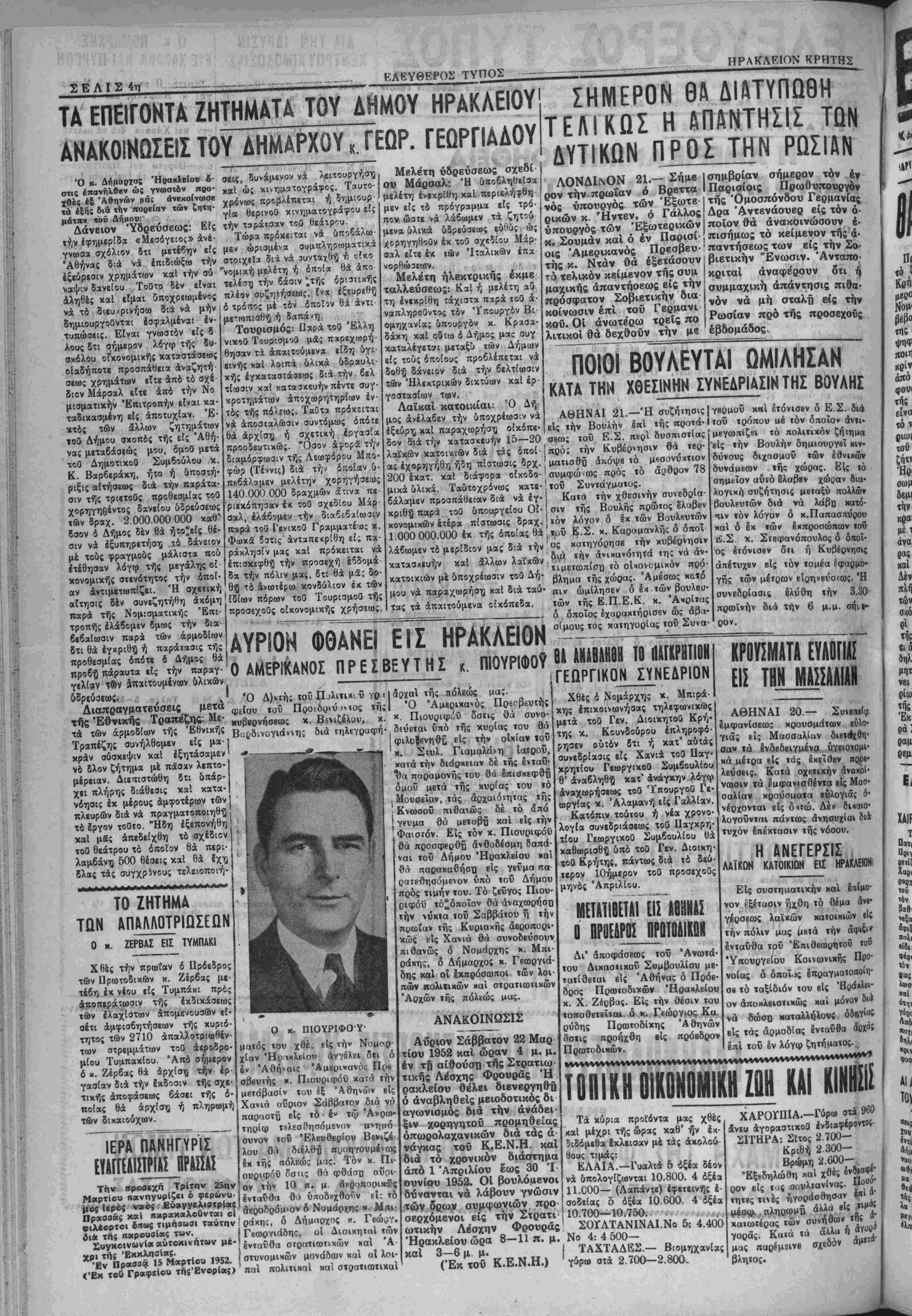νά το διευ.<ρινήσω διά νά μην δημιουργοθντ-ϊΐ έσφαλμέναι έν· τυπώοεις. Είναι γνωστόν είς 8 λους δτι σήμερον λόγω τής δυ· σκόλου οΓκονομιχής καταστάσεως οιαδήποτε προσπαθεία άναζητή σεως χρημάτων είτε άπό τό αχέ διον Μαρσάλ είτε άπό την Νο μισματικήν Επιτροπήν είναι κα· ταδικααμένη είς άποτυχίαν. Έ- κτδς των δλλων ζητημάτων τοθ Δήμου σκοπός τής είς Αθή¬ νας μεταβάσεώς μου, ίμοθ μετά τοθ Δημοτικοθ Συμβούλου κ. Κ. Βαρβεράκη, ήτο ή υποστή- ριξις αίτήσεως διά την παράτα¬ σιν τής τριετοθς προθεαμΕας τοθ χορηγηθέντος δανείου υδρεύσεως των δραχ. 2.000.000 000 καθ' ίσον δ Δήμος δέν θά ήτο^είς θέ¬ σιν νά εξυπηρετήση τό δάνειον μέ τούς φραγμούς μάλιστα ποΰ ετέθησαν λόγφ τής μεγάλης οί κονομικη"ς στενότητος την οποί¬ αν αντιμετωπίζει. Έ σχετική δ τρότΐος μέ τόν οποίον θά άντι μετ<οπισθζ ή δ,χπά/η Τουρισμός: Ιΐαρά τοθ Έλλη νιχΐθ ΤουρισμοΟ μδς παρεχωρή· θησαν τα απαιτούμεν* εϊδη δγι εινής καί λοιπά ύλικά ΰδραυλι- κί]ς εγκαταστάσεως διά την 6ελ τίωσιν χαί κατασκευήν πέντε συγ· κροτημάτων αποχωρητηρίων έν όλ Τ ό ρημ τος τΐ)ς πόλεως. πρόκειτ*ι ) ρ νά άποστβλωσιν συντόμως δπότε θά αρχίση ή" σχετική εργασίαι προοδευτικώς. Όσον άφορά την διαμάρφωσιν τής Λεωφόρου Μπο¬ φώρ (Τέννις) διά την οποίαν δ· πββάλαμεν μελέτην χορηγήσεως 140 000 000 δραχμών δίΐνα π« ριεκόπησαν έκ τοθ σχεδίου Μάρ σαλ, ελάβομεν την διαβεβαίωσιν παρά τοθ ΓενικοΟ Γραμματεύς κ. Φιοκδ 5ατις άνταπεχρίθη είς πα¬ ράκλησιν μας καί πρόκειται νά επισκεφθή την προσέχη Ιβδομά δα την πόλιν μας, 8τι θά μά; δο¬ θή1 τί ανωτέρω κονδύλιον έχ των αίτησις δέν συνεζητήθη άχόμη ίδίων πόρων τοθ ΤουρισμοΟ τί)ς παρά τής Νομισματικής Επι¬ τροπήν ελάβομεν δμως την δια¬ βεβαίωσιν παρά των αρμοδίων δτι θά εγκριθή ή παράτασις τής προαεχοθς οικονομικάς χρήσεως. Μελετη υδρεύσεως σχεδί ου Μαρσάλ: Έ υποβληθείαα μελέτη ενεκρίθη καί περιελήφθη μέν είς τό πρόγραμμα είς τρό¬ πον ώστε νά λάβωμεν τα ζητοψ μενά δλικά υδρεύσεως ευθύς ώ; χορηγηθοϋν έκ τοθ σχεδίου Μάρ σαλ είτε έκ τώ ν Ίταλικων έπα νορθώσεων. Μελέτη ήλβκτρικής έκμε ταλλεύσεως: Καί ή μελέτη α5 τη ενεκρίθη τάχιατ» παρά τού ά· ναπληροθντος τόν εγπουργόν Βι ομηχανία; Υπουργόν κ. Κρααχ- δάκη καΙ ούτω δ Δήμος μας συγ καταλέγετοπ μεταξύ των Δήμων εί; τού; ίκοΐονς προβλέπεται νά δθή δάνειον διά την βελτίωσιν των Ηλεκτρικήν δικτύων καί έρ- γοατασίων των. Λαΐκαί κατοικίαν Ό Δή¬ μς άνέλαβεν την υποχρέωσιν νά έξεύρη καί παραχωρήση οικόπε¬ δον διά την κατασκευήν 15—20 σβω; λαϊκων κατοικίαν διά τάς δττοί- ι ποό; ΣΗΜΕΡΟΝ ΘΛ ΔΙΛΤΥΠΩΘΗ ΤΕΛΙΚΩΣ Η ΑΠΑΝΤΗΣΙΣ ΤΩΝ ΔΥΤΙΚΟΝ ΠΡΟΣ ΤΗΝ ΡΩΣΙΑΝ ι ---------------------------------------------- ΛΟΝΔΙΝΟΝ 21.— Σήμε Ισημβρίαν σήμερον τόν έν ρον την πρωϊαν ό Βρεττα Ι Παρισίοις Πρωθυπουργόν νός ύπουργός των Έξωτβ Ι τής Όμοσπόνδου Γερμανίας ρικών κ. τΗντεν, ό Γάλλος Ι Δρα Άντβνάουερ είς τόν ο¬ ύ πουργός των Εξωτερικών ποίον θά άνακοινώσουν έ¬ κ. Σούμαν καί ό έν Παρισί-! πισήμως χό κείμενον τής ά. οις Άμερικανάς Πρβσβευ'παντήσεως των είς την Σο· της κ. Ντάν θά έξβτάσουν | βιετικήν "Ενωσιν. Άνταπο· το τελικόν κείμενον τής συμ ! κριταί άναφέρουν ότι ή συμμαχική απάντησις πιθα¬ νόν νά μή σταλη βίς την Ρωσίαν πρό τής προσεχούς εβδομάδος. μαχικής απαντήσεως είς την πρόσφατον Σοβιετικήν δια κοίνωσιν επί τοΰ Γερμανι κου. Οί ανωτέρω τρείς πό λιτικοί θά δεχθοΰν την μβ άς έχορηγήθη ήδη πίστωσις δρχ. μαΐισθίϊ άΐιόψβ τό μβσονύχτιον 200 Ικατ. καί διάφορα οίκοδο-'συμφώνως πρός τό άρθρον 78 μικά ΰλικά. Ταυτοχρόνως 