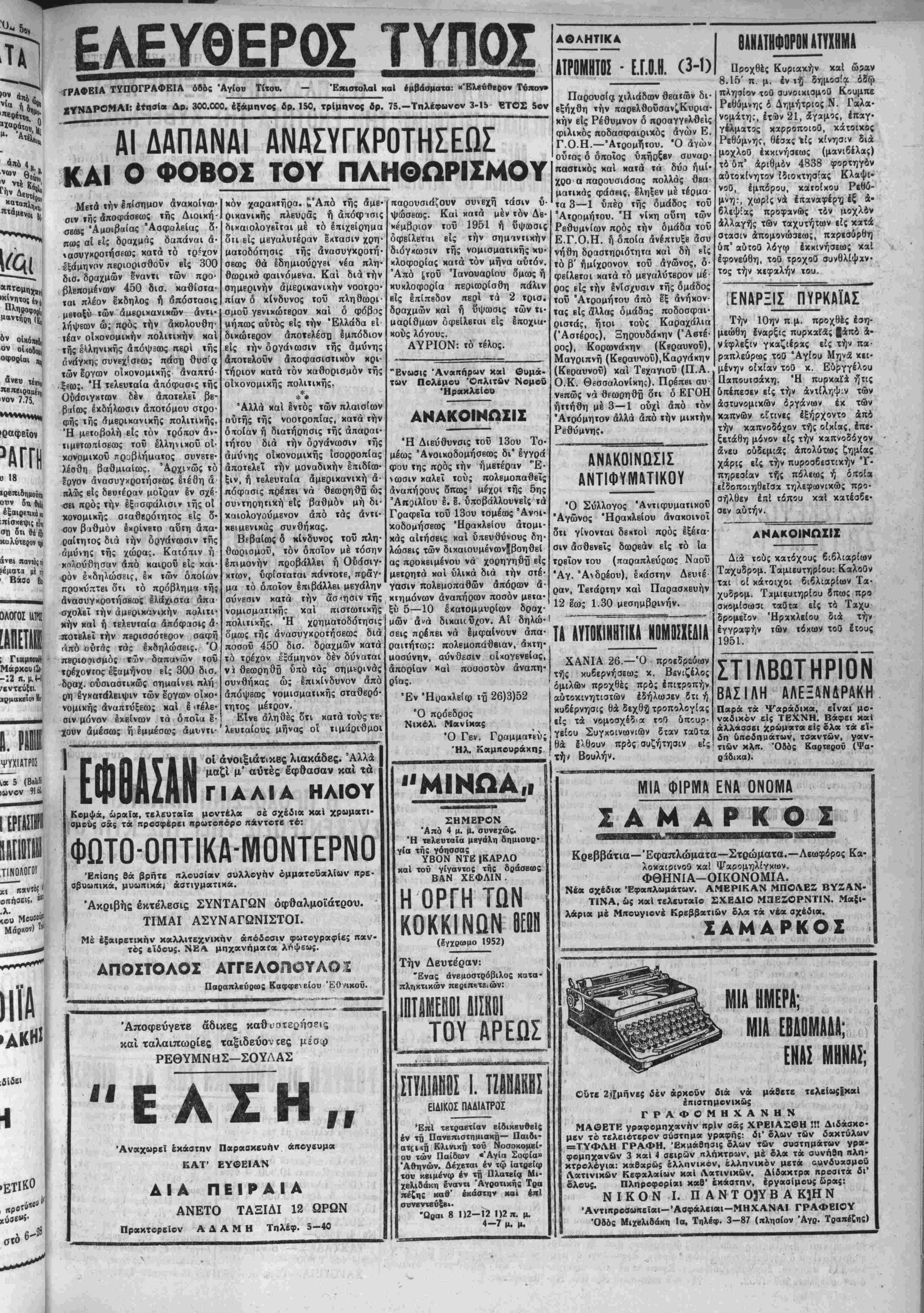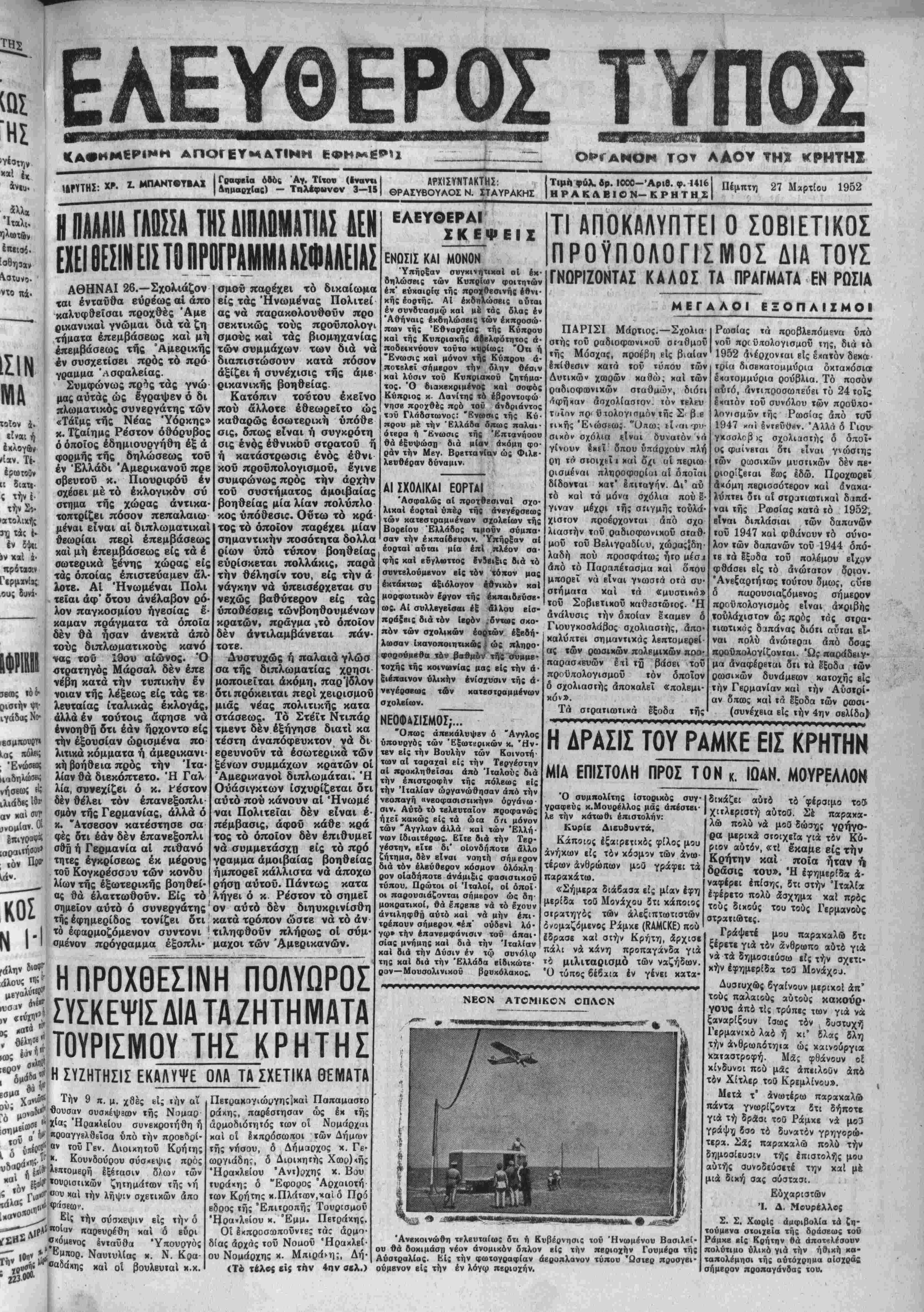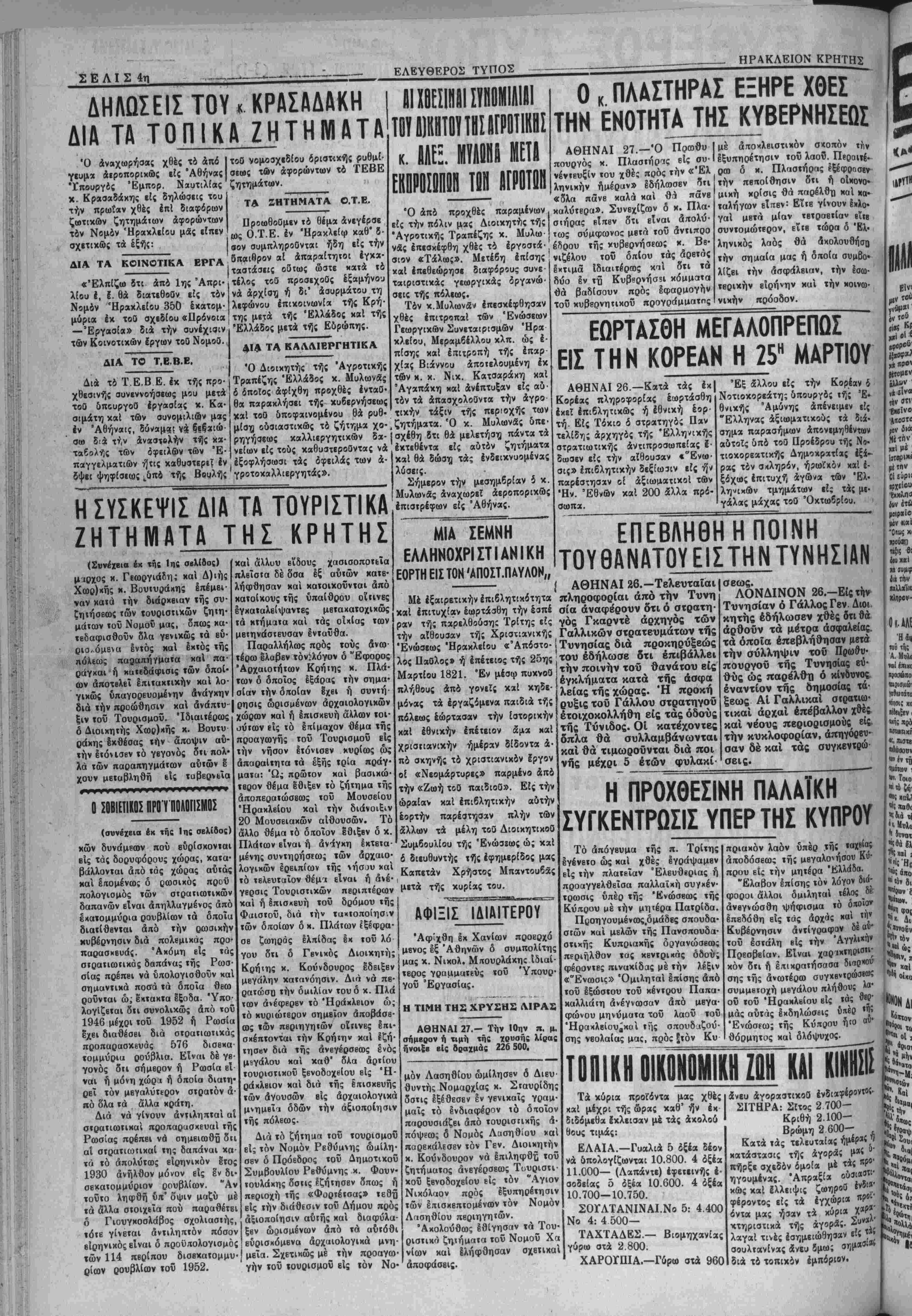 είρηνικός είναι ό προϋ<τολογισμό; των 114 πβρΐπου δισεκατομμυ- ρίων ρουβλίων τού 1952. χαί άλλυυ β'ίδους χασισοποτιΐα πλείστα δέ δσα έξ αυτών κατε- λήφθησαν καί κατοιχοΰνται άπό κατοίχους τής ύπαίθρου οΐτινες εγχαταλείψαντες μετα χατοχι κώς τα κτήματα καί τάς οικίας των μετηνάστευσαν ενταύθα. Παραλλήλως πρός τούς ανω¬ τέρω έλαβεν τόνίλόγον ό "Εφορος Άρχαιοτήτων Κρήτης κ. Πλά¬ των δ οποίος εξάρας την σημα¬ σίαν την οποίαν Ιχβι ή συντή- ρήσις ωρισμένων αρχαιολογικήν χώοων καί ή έπισκευή άλλων τοι¬ ούτων είς τό Ιττ,ίμαχον θέμα τής προαγωγής τοϋ Τουρισμοϋ είς την νήσον ετόνισεν κυρίως ώς άπαραΐτητα τα εξής τρία πράγ- ματα: Ώς πρώτον καί βασιχώ- ιερόν θέμα εθιξεν τό ζήτημα τής αποπερατώσεως τοΰ Μουσείον Ηρακλείου καί την διάνοιαν 20 Μουσειαχών αίθουσών. Τό άλλο θέμα τό οποίον έθιξβν ό κ. Πλάτων είναι ή άνίγχη έκτβτα- μένης συντηοήσίω; των αρχαιο¬ λογικήν έρειπίων τής νήσου χαί τό τελευταίον θέμι είναι ή ανέ¬ γερσις Τουριστικών περιπτέρων καί ή έπισχευή τοΰ δρόμου τής Φαιστού, διά την τυχτοποίησιν των οποίων δ κ. Πλάτων εξέφρα¬ σε ζωηράς ελπίδας έκ τού λό γου δτι δ Γβνιχός Διοικητής Κρήιης κ. Κούνδουρος εδβιξεν μεγάλην χατανόησιν. Διά νά πε¬ ρατώση την δαιλΐαν τού ό κ. Πλά των ανέφερεν τό Ηράκλειον ώ; τό κυριώτερον σημείον άποβάσβ- ως των περιτιγητών οΐτινες επι- σχέπτονται την Κρήτην καί Ιζή- τησβν διά τής ανεγέρσεως ενός μεγάλου καί χαθ' δλα άρτίου τουριστιχοΰ ξβνοδοχϋίου είς εΗ- ράκλειον καί διά τής Ιπισκευής των άγουσών είς άρχαιολογιχά μνημβΐι δδών την άξιοποίησιν τής πόλεως. Διά το ζήτηιιη τοϋ τουρισμοΰ είς τόν Νομόν Ρεθύμνης ωμίλη¬ σεν δ Πρόβδοος τοΰ Δημοτιχοϋ ΣυμβουλΙου Ρεθύμνης κ. Φουν- τουλάχης όστις εζήτησεν δπως ή πβριοχή τής «Φορτετσα;» τε9Β είς την διάθεσιν τού Δήμου πρός άξιοποίησιν αυτής χαί διαφύλα- ξβν ωρισμένων άπό τα αυτόθι ευρισκόμενα άρχαιολογιχά μνη- μεΐα. Σχετικώς μέ την προαγω· γήν τοϋ «ουρισμοϋ είς ΐόν Νο· ι ΤΟΤ Α1ΚΗΤΒΥ ΤΗΣ ΒΓΡΟΤ1ΚΗΣ κ. ΙΙΕ. ΠΙΙΙΙ ΜΕΤΑ ΒΡΠΗΠΙ1 ΑΓΡΟΤΟΙΙ Ό άπδ προχθές παραμένων είς την πόλιν μας Διοικητής τής 'Αγροτικάς Τραπέζης κ. Μυλω- νδς επεσκέφθη χθές τό έργοστά-' σιον «Τάλως». Μετέβη επίσης καί ίπεθεώρησε διαφόρους συνε- ταιριστικάς γεωργικάς δργανώ- σεις τής πόλεως. Τδν κ.Μυλωνα^ επεσκέφθησαν χθές έπιτροπαί των Ένώσεων Γεωργικών Συνεταιρισμόν Έρα χλείου, Μεραμβέλλου κλπ. ώς έ- πίσης χαί έπιτεοπή τής έπαρ χίας Βιάννου αποτελούμενη έκ των κ. κ. Νικ. Κατσαράχη καί Άγαπάκη χαί άνέπτυξαν είς α&· τδν τά άπασχολοθντα την άγρο τικήν τάξιν τής περιοχής των ,ζητήματα. Ό κ. Μυλωνδς υπε¬ σχέθη δτι θά μελετήση πάντα τά εκτεθέντα είς αυτόν ζητήματα χαί θά δώση τάς ενδεικνυόμενα; λύσετς. Σήμερον την μεσημβρίαν ί κ. ίΜυλωνάς αναχωρεί άεροπορικώς έπισΐρέφων είς Αθήνας. ΜΙΑ ΣΕΜΝΗ ΕΛΛΗΝΟΧΡΙΣΤΙΑΝΙΚΗ ΕΟΡΤΗ ΕΙΣ ΤΟΝ 'ΑΠΟΣΤ.ΠΑΥΛΟΝ,, Ο . ΠΛΑΣΤΗΡΑΣ ΕΞΗΡΕ ΧΟΕΣ ΤΗΝ ΕΚΟΤΗΤΑ ΤΗΣ ΚΥΒΕΡΚΗΣΕΟΖ ΑΘΗΝΑΙ 27.—Ό Ποωβυ πουργός κ. ΠλαστήρΊς είς αυ· νένιευξίν τού χθές πρός την «Έλ ληνικήν ημέραν» εδήλωσεν δτι «δλα πάνε καλά καί θοί πάνβ καλυτέρα». Συνεχίζων δ κ. Πλα¬ στήρας είπεν δτι είναι απολύ¬ τως σύμφωνος μβτά τοΰ άντιπρο έδρου τής κυβερνήσεως *. Ββ· νιζέλου τοϋ όπίου τάς άρβτάς έχτιμα Ιδιαιτέρως καί δτι ϊά δύο έν τ·η Κυββρνήσ5ΐ «όμματα θά βαδΐσουν πρός εφαρμογήν τοΰ κυβεοντιτικοϋ προγοάμμητπς ΕΩΡΤΔΣΟΗ ΜΕΓΑΛΟΠΡΕΠΩΣ ΕΙΣ Τ Η Ν ΚΟΡΕΑΝ Η 25" ΜΑΡΤΙΟΥ ΑΘΗΝΑΙ 26—Κατά τα; έχ| Κορία; πληροφορίας έωρτάσθη ίχεϊ ίπιβλητιχώς ή έθνιχή έορ· τή. Είς Τόχιο δ στρατ