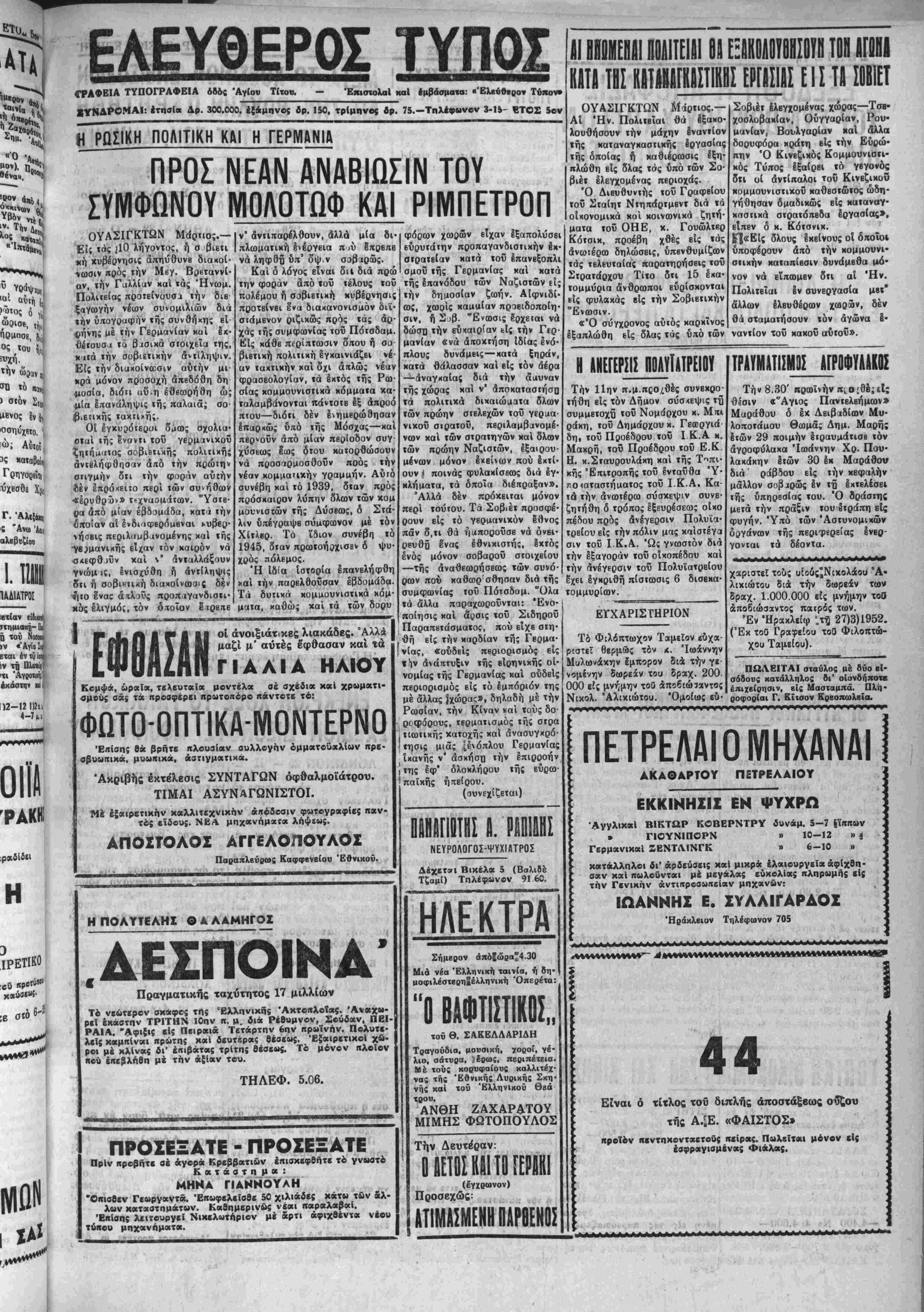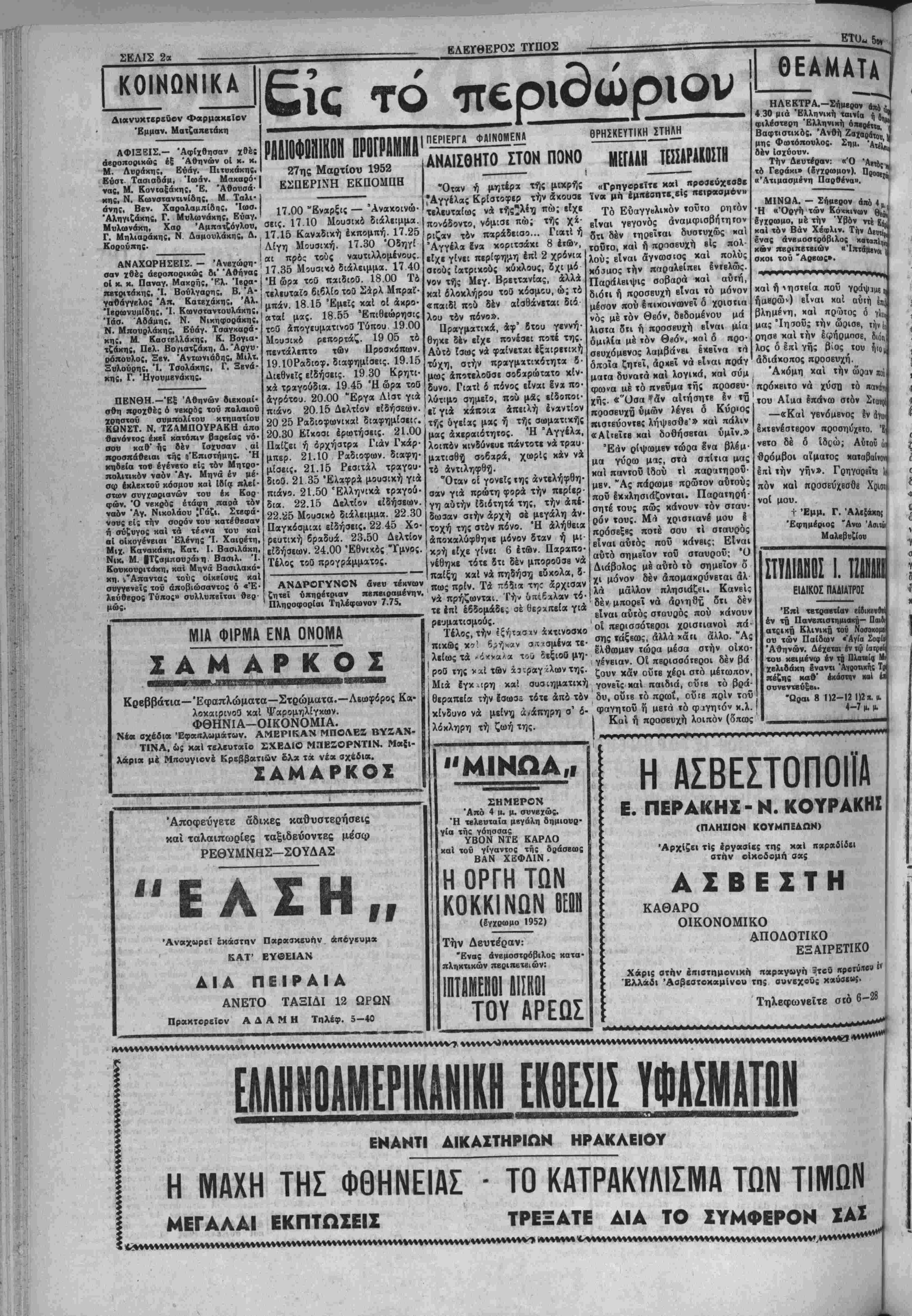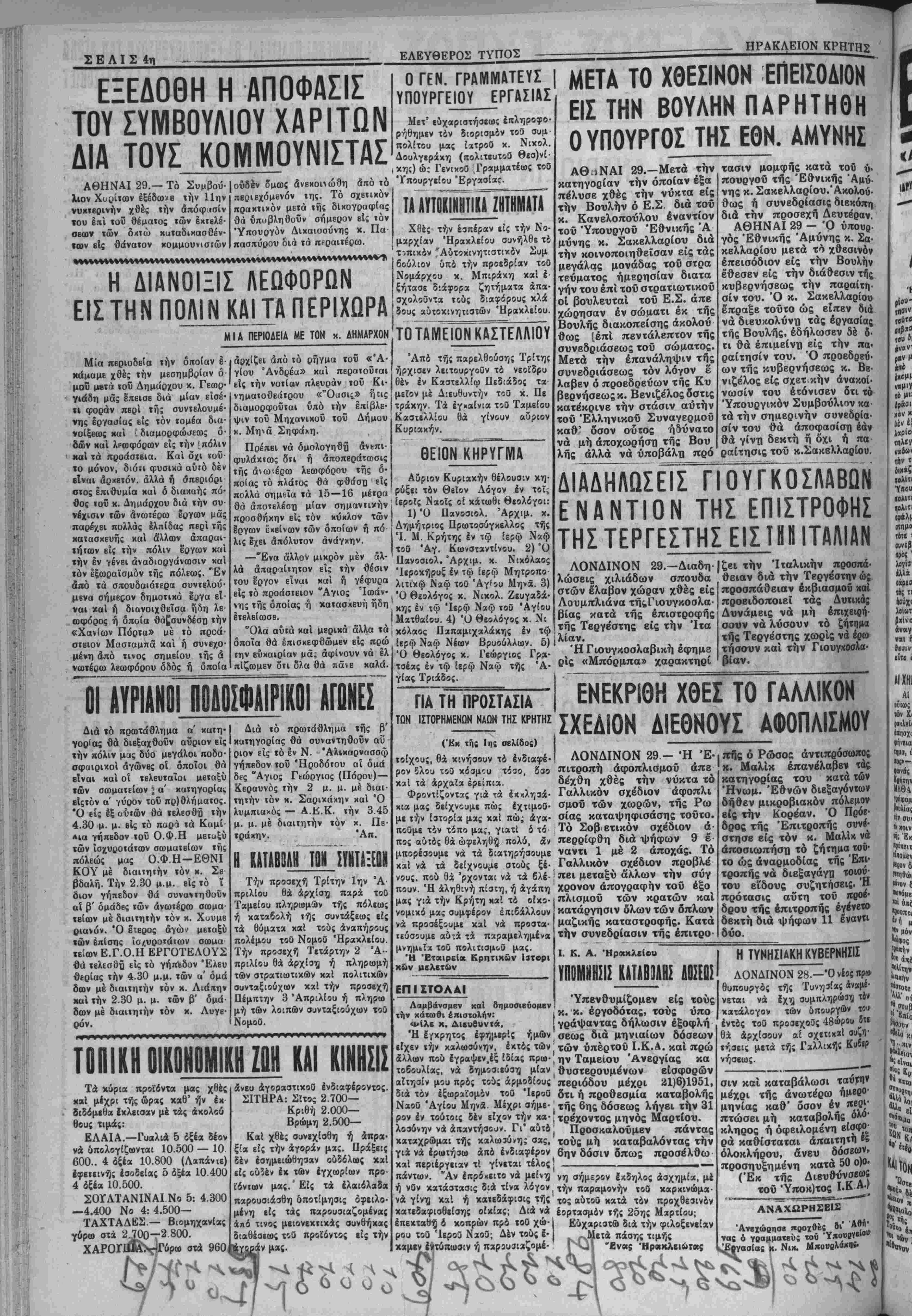<*»ίλί κ. Διευβυντά, 'Η έγκρητος εφημερίς ημών η λύ ΛΟΝΔΙΝΟΝ 29 - Ή Έ· πιτροπή άφοπλισμοϋ άπε δεχθή χθές την νύκτα τό Γαλλικόν σχέδιον άφοπλι σμοΰ των χωρών, τής Ρω οίας καταψηφισάσης τούτο. Τό Σοβ ετικόν σχέδιον α¬ περρίφθη διά ψήφων 9 έ¬ ναντι 1 μέ 2 άποχάς. Τό Γαλλικόν σχέδιον προβλέ πει μεταξύ άλ,λων την σύγ χρόνον απογραφήν τοϋ έξο πλισμοϋ των κρατών καί κατάργησιν δλων των δπλων μαζικής καταστροφής. Κατά την συνεδρίασιν τής έπιτρο- πής ό Ρώσοα άντιπρόσωκος κ. Μαλίκ έπανέλαβεν τάς κατηγορίας τού κατά των Ήνωμ. Εθνών διεξαγόντων δήθεν μικροβιακόν πόλεμον είς την Κορέαν. Ό Πρόί- δρος τής Έπιτροπής συνέ¬ στησε είς τόν κ. Μαλίκ νά άποσιωπήστ) τό ζήτημα του¬ το ώς άναρμοδίας τής —τ1-· τροπής νά διεξαγάγη τοιού¬ του εϊδους συζητήσβις. Ή πρότασις αυτή τοΰ ποοέ· δρου τής έπιτροπής εγένετο δεκτή διά ψήφων 11 έναντι δύο. Ι. Κ. Α. Ηρακλείου ΔΟΣΕΩΣ Ύπβνθυμίζομβν είς τούς κ. κ. έργοδότας, τοΰς -υπο γράψαντας δήλωσιν έξοφλή σβως διά μηνιαίων δόσεων είχεν την καλωσύνην, έκτός τών) τών ύπέρτοΰ Ι.Κ.Α. καί πρώ άλλαν ποϋ Ιγραψεν,έξ ιδίας πρω,ην Ταμείου Άνεργίας κα τοδουλίας, νά δημοσιεύση μίαν (θυστερουμένων εισφορών αίτησίν μου πρός τού; άρμοδίους περιόδου μέχρι 21)6)1951, διά τόν έξωραίσμόν τοθ Ίεροθ δτι ή προθεσμία καταβολής Ναοθ Άγίου Μηνα. Μέχρι σήμε-' τής 6ης δόσεως λήγει την 31 ρον έν τούτοις δέν είχον την κα-, τρέχοντος μηνάς Μαρτίου. οαυνην νά άΐταντήσουν. Γι' αυτό: Προσκαλούμεν πάντας χαταχρωμαι τής καλωσύνης σας, τοΰς μή καταβαλόντας την γιά νά έρωτήσω άηό ενδιαφέρον 6ην δόσιν δπω; προσέλθω χαί περιέργειαν τί γίνεται τέλος' __________ _ πάντων. Άν έπρόχειτο νά μείνη νη αήμε?ον ϊκδηλος άσχημία, μέ ή νΟν κατάστασις διά τίνα λόγον, χήν παραμονήν τοθ καρκινώμα- νά γίνη καί ή χατεδάφισις τής' χος αδχοο κατά τόν προχθεσινόν χατεδαφιοθείσης οικίας; Διά νά Ιορτασμόν τής 25ης Μ*ρτίου· Ευχαριστώ διά την φιλοξενείαν |Ιετά πάσης τιμής "βνας Ηραχλειώτας ς δ κοπρών πρό τοθ χώ ου τοθ Ίεροΰ ΝχοΟ; Δέν τούς Ι καμεν εντύπωσιν ζ Η ΤΥΝΗΣΙΑΚΗ ΚΥΒΕΡΝΗΣΙΣ ΛΟΝΔΙΝΟΝ 28.—Ό νέος ηρ» θυκουργός τής Τυνησίαί άναμέ- νεται νά έχη συμπληρωθή τίν κατάλογον των υπουργύ&ν το» έντός τοθ τϊροοεχοθς 48ώρου 8τε θά άρχίοουν αί σχετικαί ουζΐ)· τήαεις μετά τής Γαλλικής Κυδιρ νήσεως. σιν καί καταβάλωσι ταΰτητ μέχρι τής ανωτέρω ήμεβ°' μηνίας καθ' όσον έν π*0)" πτώσει μή καταβολής ολο- κλήρος ή όφειλομένη βίον0" ρά καθίσταται άπαιτητη έδ ολοκλήρου, άνευ δόσεων» προσηυξημένη κατά 50 ο)ο· (Έκ τής Διευθύνσεως τοΰ Ύποκ)τος Ι.Κ ά·} ΑΝΑΧΩΡΗΣΕ1Σ Άνεχώρησβ ηροχθέί δι ΑτπΙ" νας ό γραμματεύς τού 'ΥΛουβΥί'0" "*------- κ. Νικ. ΜπουολάΗΐΙί.