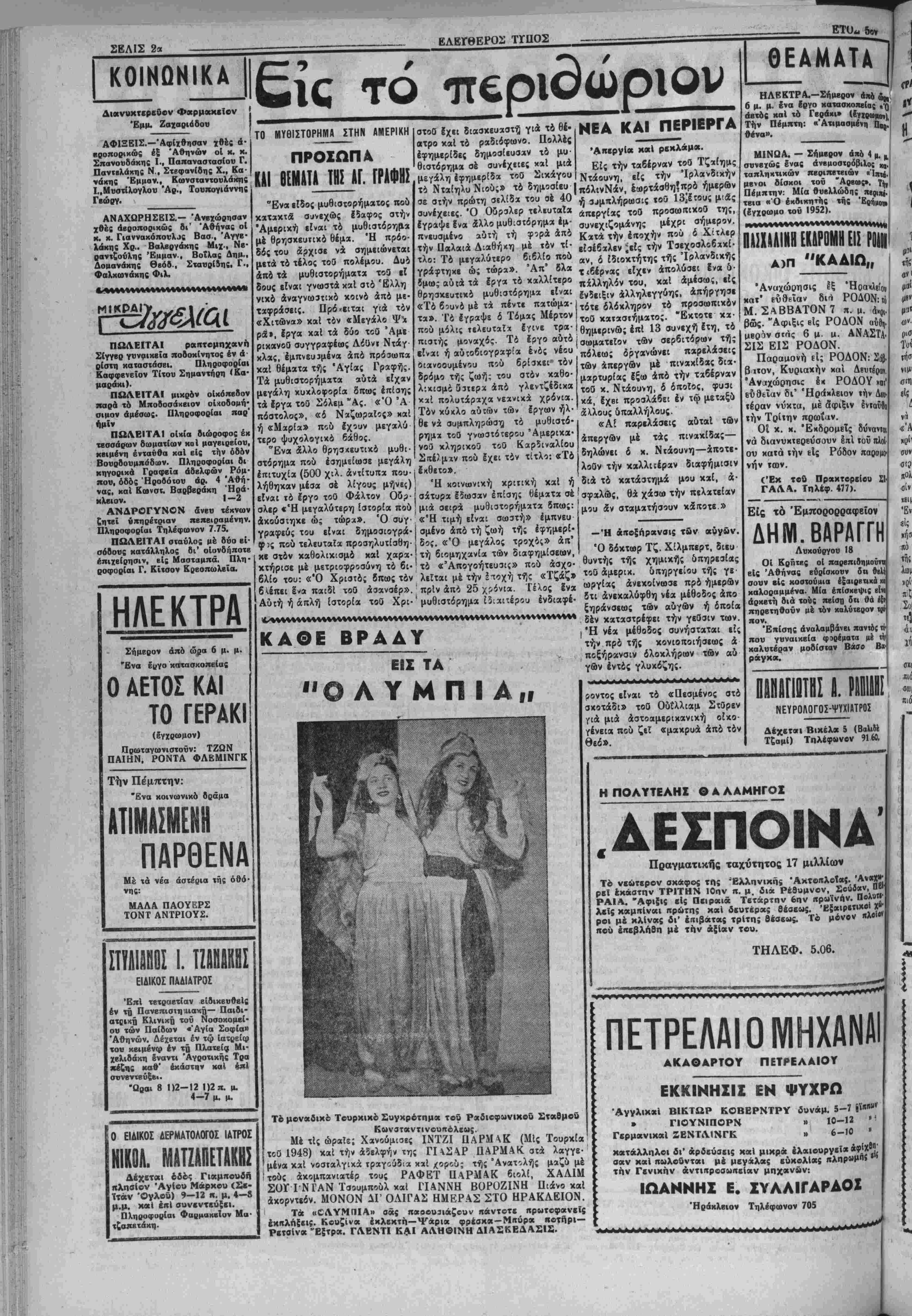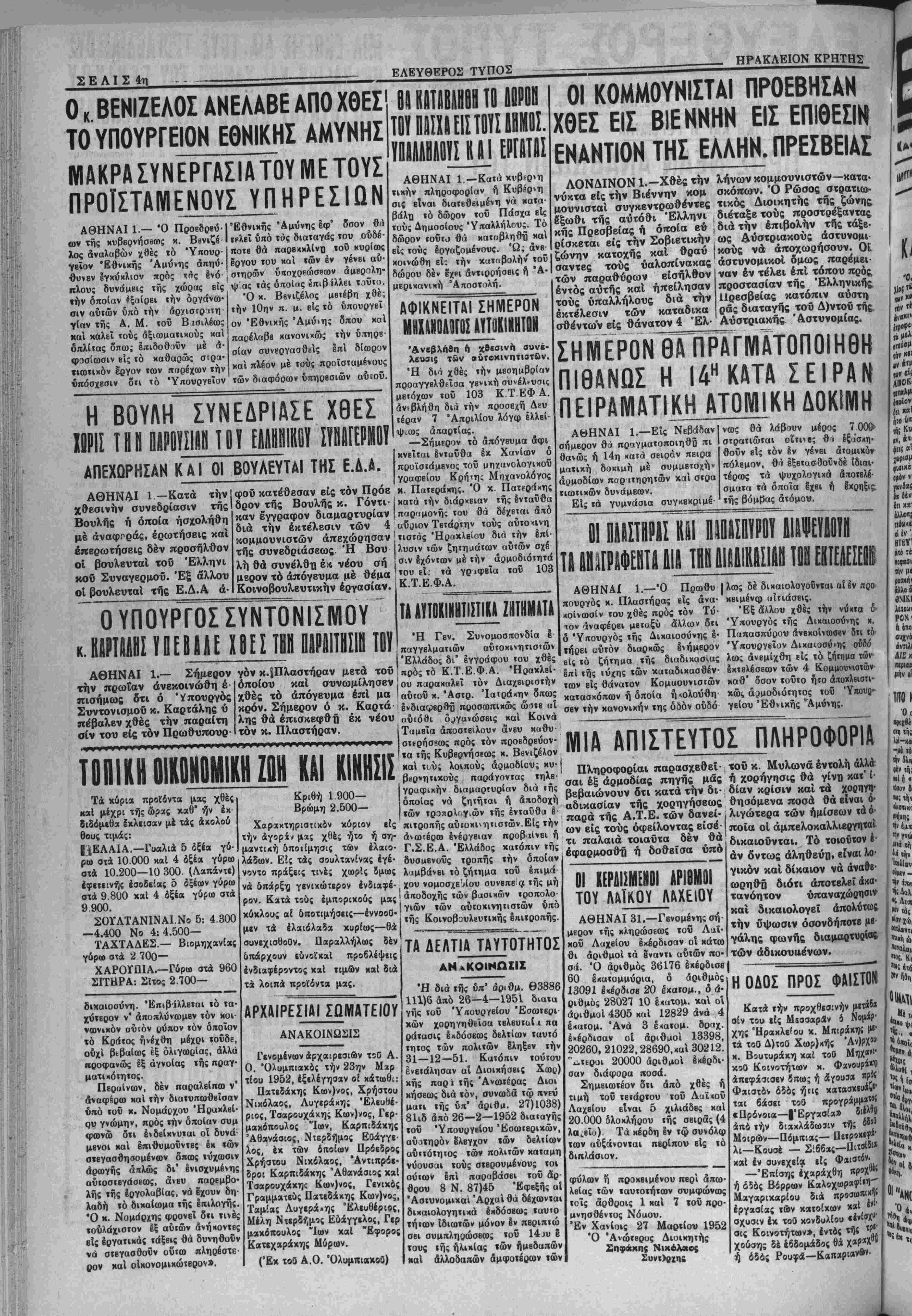 'Υπουργβϊον Διχαιοσύνη; οδδ<5 λως ανεμίχθη είς τό ζήΐημα των εχτβλέσβων των 4 Κομμουνιστήν καθ* δΌον τουτο ήτο άποχλβιστι- χώς άίμοδιότητος τού Ύπουο» γείου 'Εθνικής Αμύνης. ««ν Χ" «αν τίι ,,μίλ ίίΙιιβΜ (IV »«' ,ν, ««ν4α; II «V «(V ΒΤΒΥ' Μ τί βΜΚΙ «ιιχνιι ϊντάι ΑΙΣ χ «ιριορ ! ,ΤΙΤΟ ΜΙΑ ΑΠΙΣΤΕΥΤΟΣ ΠΛΗΡΟΦΟΡΙΑ ΤΑ ΑΕΛΤΙΑ ΤΑΥΤΟΤΗΤΟΣ ΑΝΑΚΟΙΝΩΣΙΣ Γενομένων αρχαιρεσιών τοθ Α. Ο. Όλυμπιακός την 23ην Μαρ τίου 1952, εξελέγησαν οί κάτωθι: Πατεράκης Κων)νος, Χρήστου Νικόλαος, Λυγεράκη; Ελευθέ¬ ριος, Τσαρουχάχης Κων)νος, Γερ- μαχδπουλο; "Ιων, Καρπιδάκης Άθανάοιος, Ντερδήμος Ευάγγε¬ λος, έκ των οποίων Πρόείρος Χρήστου Νικόλαος, Άντιπρόε- δροι Καρπιδάκης Αθανασίας καί Τααρουχάχης Κων)νος, Γενικάς Γραμματεύς Πατεδαχης Κων)νος, Ταμίας Λυγιρά.«ης Ελευθέριος, Μίλη Ντερδήμος Ευάγγελος, Γερ μακόπουλος "Ιων χαί Έφορος Κατεχαράχης Μύρων. (Έκ τοθ Α.Ο. ΌλυμπιχχοΟ) Ι Ή διά τής υπ' αρ.θμ. Θ3886 111)6 άπό 26—4—1951 διατί» γής τοϋ Ύιτουργείου "Εσωΐερι χών χορηγηθείσα τβλευταΐ^ πά ράτασις εκδόσεως δελτίων ταυτό τητος των πολιτών έληξβν την 31—12—51. Κατόπιν τούτου ένετάλησαν αί Διοιχήσβις Χωρ) κης παρι τής Ανωτέρας Διοι κήσεως διά τόν, συνωδα τφ πνευ μαιι τής ύΐτ' άριθμ. 27)1038) 81ιδ άπό 26—2—1952 διαιαγής τοΰ Ύπουργβίου Έσωτβρικών, αύατηρόν ίλεγχον των δελτίων αύΐτότητος των πολιτών κηΐαμη νύουσαι τούς στβρουμένους τοι ού των επί παραβάσει τού άς>