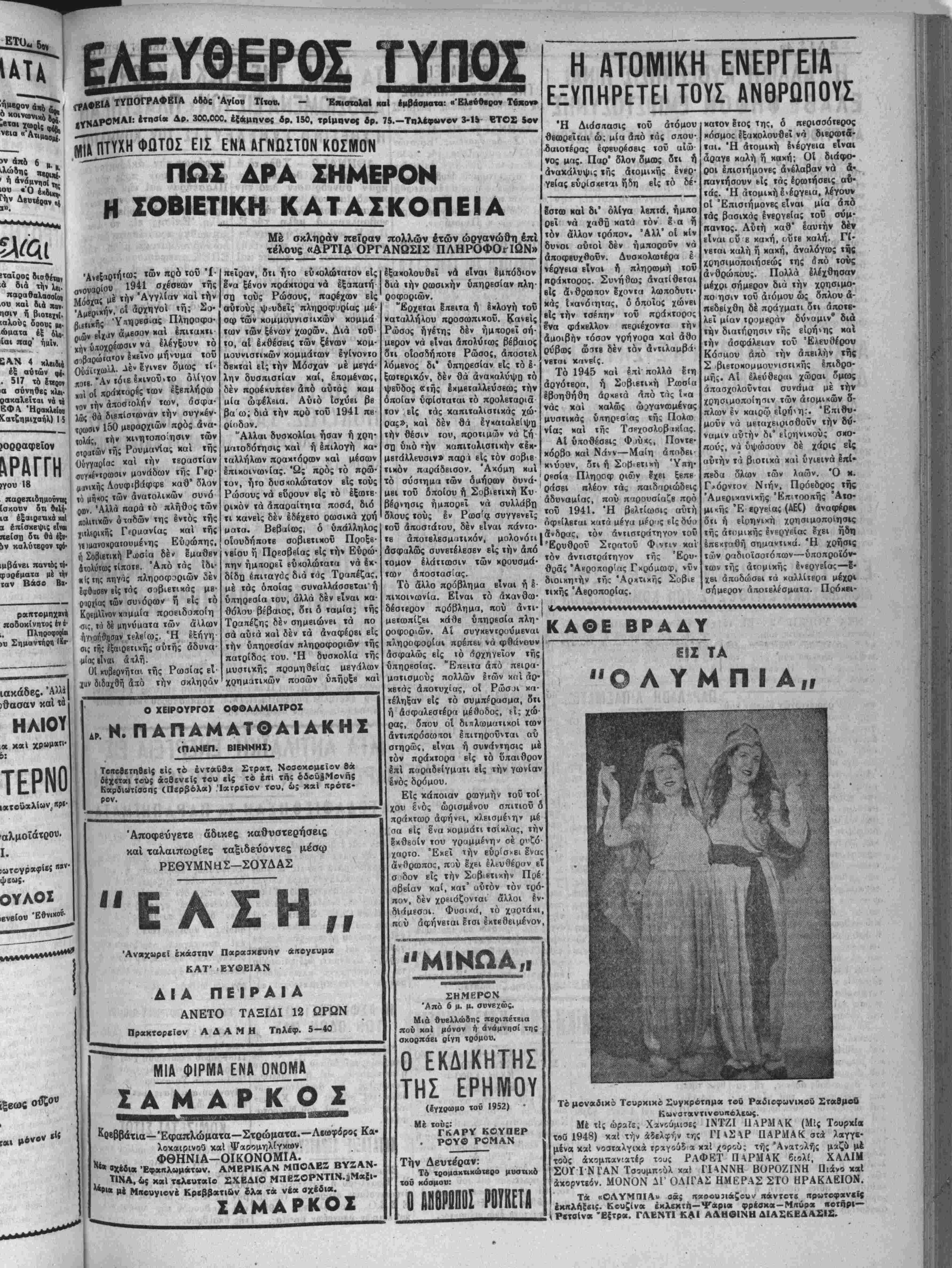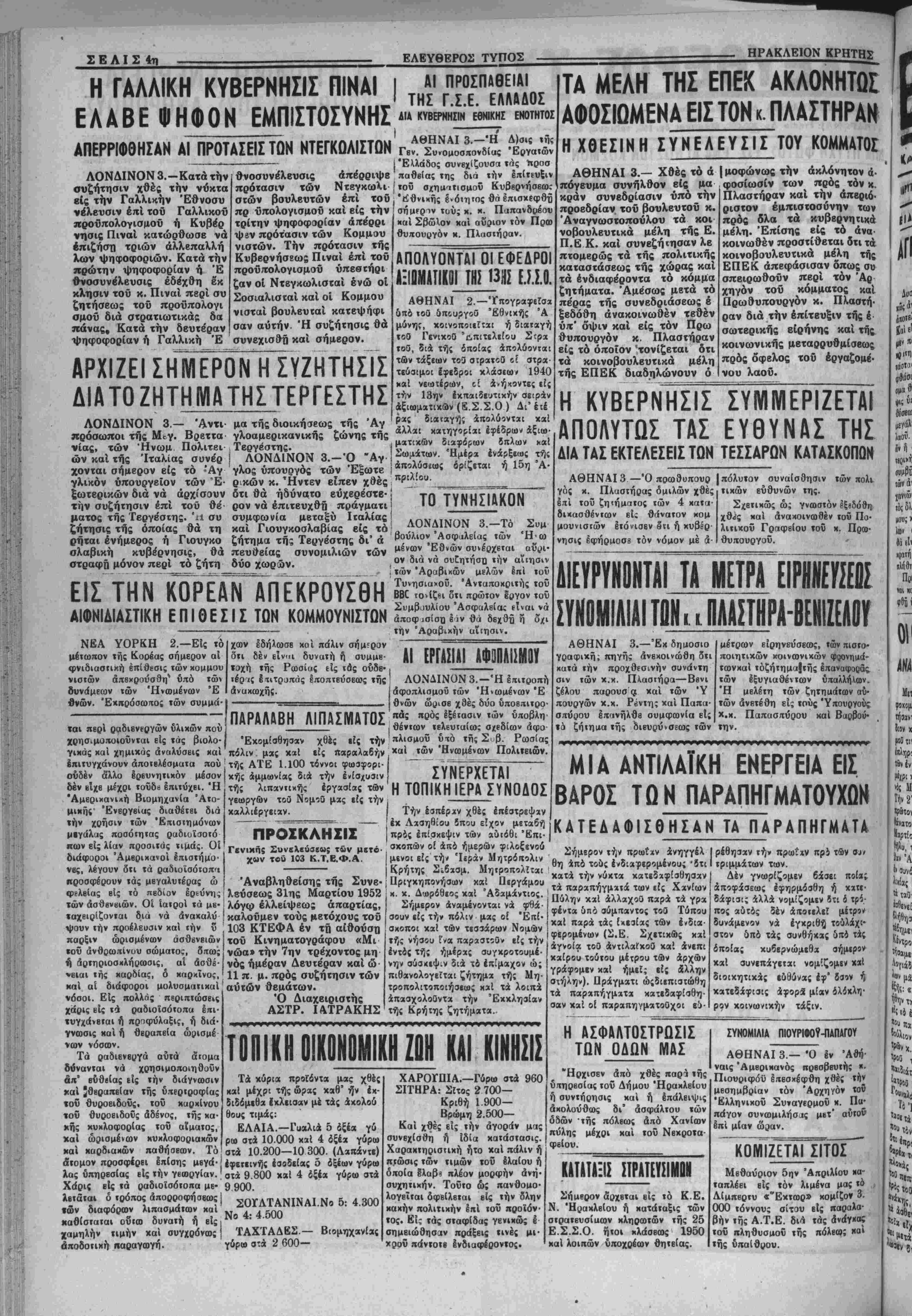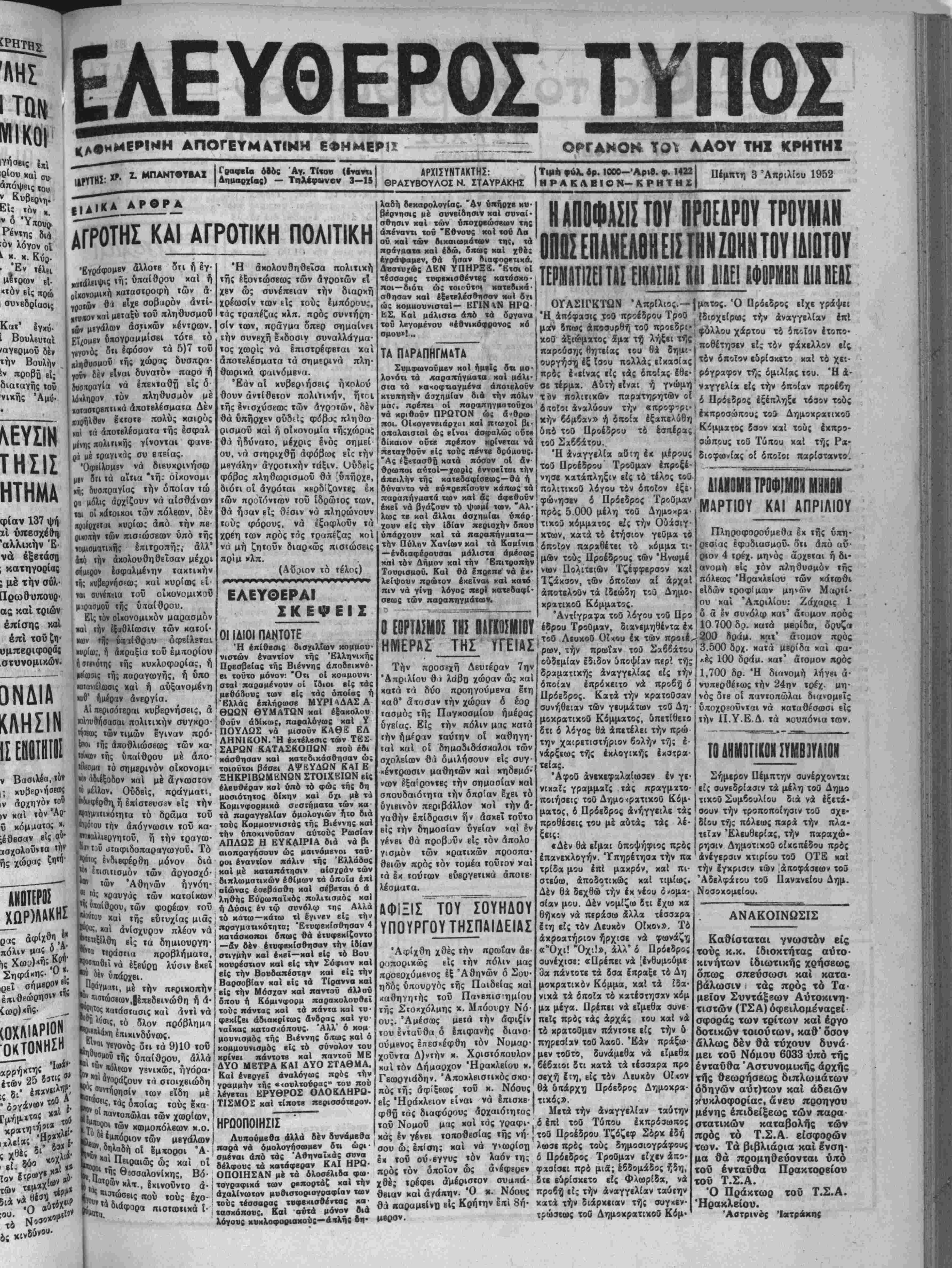 καί παρά τάς ίκεσίας των έ<δια- ΤΟΠΙιΚΗ ΟΙΚΟΝΟΜΙΚΗ ΖΟΗ ΚΑΙ ΚΙΝΗΣΙΣ Τά χύρια προΐέντα μας χθές καί μίχρι τί)ς ώρας καθ ήν έκ- διδόμεθ* Ιχλιιοαν μέ τά; άχολού θους τιμάς: ΕΛΑΙΑ.—Γυαλιά 5 4ξέα γύ ρω οτά 10.000 καί 4 δξέα γόρω σχβ 10.200—10 300. (Λαπάντε) άτομον προσφίρει έπίσης μβγά- Ιφιτεινής εσοδείας 5 δξέων γύριο λας ύπηρβσίας βΐς την γβιοργίαν.' Οχά 9 800 χαί 4 όξέα γύρω οτά Χάρις βίς τά ραδιοΐσότοπα μ ε- 9 900. λβτάται δ τοόπος άπορροφήσεως των διαφόρων λιπασμάιων καί καθίσταται οΰιοο δυνατή ή είς χαμηλήν τιμήν χαί συγχρόνως άποδοιιχή «αραγωγή. ΣΟΓΛΤΑΝΙΝΑΐ.Νο 5: 4.300 Νο 4: 4 500 ΤΑΧΤΑΔΕΣ — Βιομηχανίας γ6ρω ο:ά 2 600— ΧΑΡΟΓΠΙΑ.—Γύρω στά 960 ΣΙΤΗΡΑ: 2ΐτος 2 700— Κριθή 1 900— Βρώμη 2.500— Καί χθές είς την αγοράν μας συνεχίσοη ή Ιδία κατάστασις. Χαρακτηριστική ήτο Χαί πάλιν ή πτώσις των δκοία Ιλαβ συχητιχήν. τιμών τού ελαίου ή πλέον μορφήν άνή Τουτο ώ; πανθομο· λογεΐται δφβίλβται βίς την δλην κακήν πολιτικήν επί τού προϊόν· τος. Είς τάς σταφίδος γενικώς έ σημειώθησαν πράξει; τινές μι- κροϋ πάντοτβ ένδιαφέοοντος. άγνοία το καίρου τούτου μέτρου των άρχών γράφομΐν καί ήμεΐ; είς άλλην στήλην). Πράγματι ώςδιιπιατώθη τά παραπήγμιχτα κατεδαφίσθη- σαν χαί ο! παραπηγματοθχοι εϊ· Δέν γνωρίζομεν βάσει ποία; αποφάσεως εφαρμοσθή ή χατε- δάφισι; άλλά νομίζομεν δτι ί τρ-5- πο; αύτό; δέν άΐτοιελεΓ μέτρον δυναμένων νά εγκριθή τουλάχι¬ στον ϋΐτό τάς συνθήκας υπο τί; οποίας κυβερνώμεθα σήμερον χαί συνΐπάγεται νομίζομεν χαί διοικητιχά; ευθύνας έφ' !»ν ή χατεδάφισις άφορ3 μίαν ολόκλη¬ ρον κοινωνικήν τάξιν. Η ΑΣΦΑΛΤΟΣΤΡΟΣΙΣ ΤΩΝ ΟΑΩΝ ΜΑΣ "Ηρχισεν άπό χθές τής ΣΥΝΟΜΙΛΙΑ ΠΙΟΥΡΙΦΟΥ-ΠΑΠΑΓΟΥ ύπηρβσίας ι ου Δήμου Ήραχλείου ή συντήρησι; καί ή έπάλειψις ακολούθως δι9 άσφάλτου των ό δών -τής πόλεως άπό Χανίων πύλης μέχρι καί τοΰ Νβχροτα φβίου. ΚΑΤΑΤΑΞΙΣ ΣΤΡΑΙΕ.ΣΙΜΩΝ Σήμβρον άρχεται είς τό Κ Ε. Ν. Ηρακλείου ή κατάταςΊς των στρατευσίαων κληρωτών τής 25 Ε.Σ.Σ.Ο. ήτοι κλάσεως 1950 χαί λοιπών ύποχρέων θητείας. ΑΘΗΝΑΙ 3.— Ό έν ΆΗ· ναις Άμβρικανός ηρβσββυΐή; ". Πιουριφόϋ έιτβσχέφθη χθές την μεσημβρίαν τόν Αρχηγόν τοΰ Έλληνιχοΰ Συ»αγεομοΰ κ. Π πάγον συνωμιλήσ^ς επί μίαν ώραν. μβτ' αύιοΰ ΚΟΜΙΖΕΤΑΙ ΣΙΤΟΣ Μβθαύριον 5ην Απριλίου κα- ταπλέει είς τόν λιμένα μας τό Λίμπβρΐυ «Έχτωρ» κομ'ζον 3. 000 τόννους σίτου είς παοαλθ' βήν τής Α.Τ.Ε. διά τάς ανάγκας τοΰ η τής ύπαΐθρου.