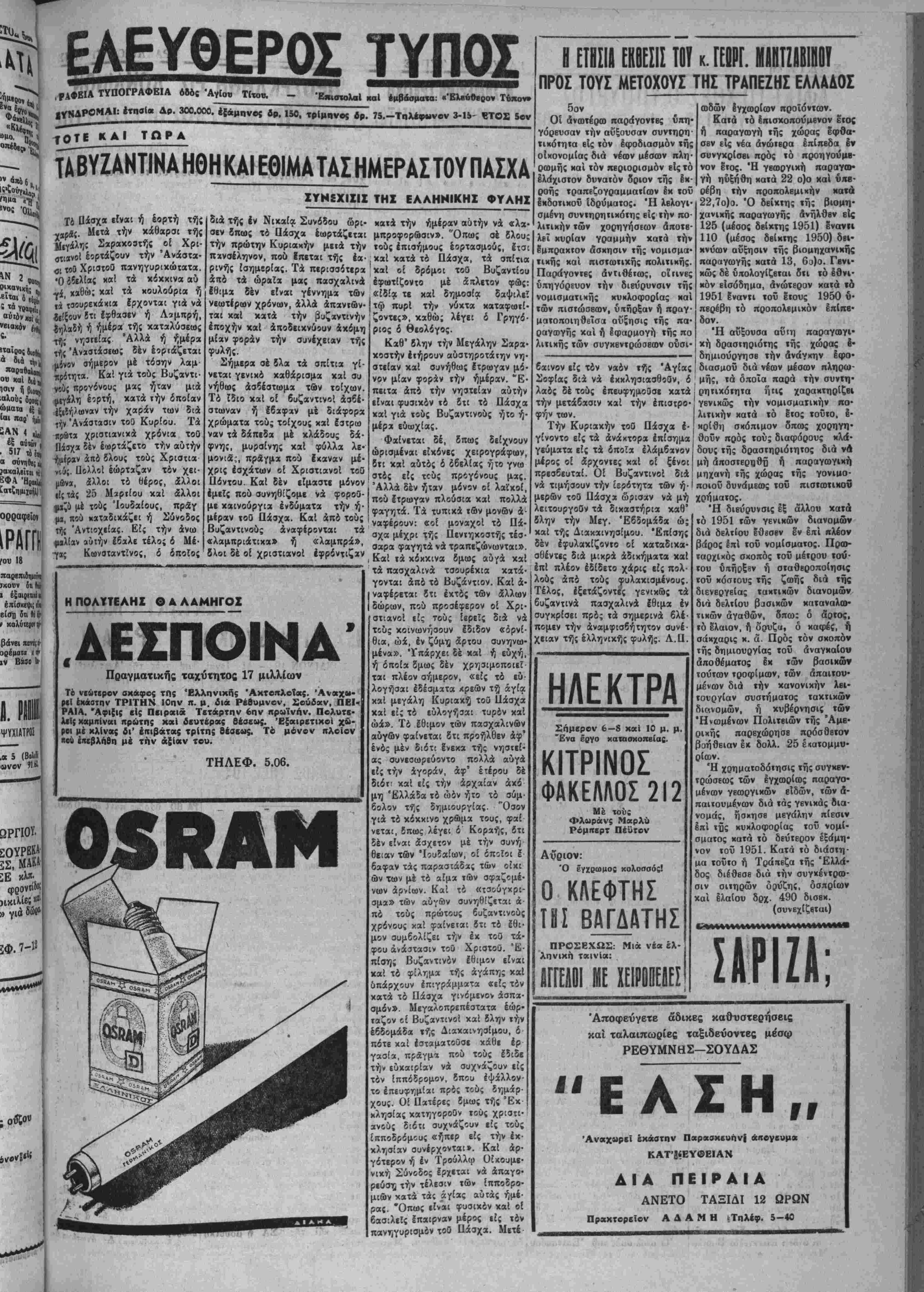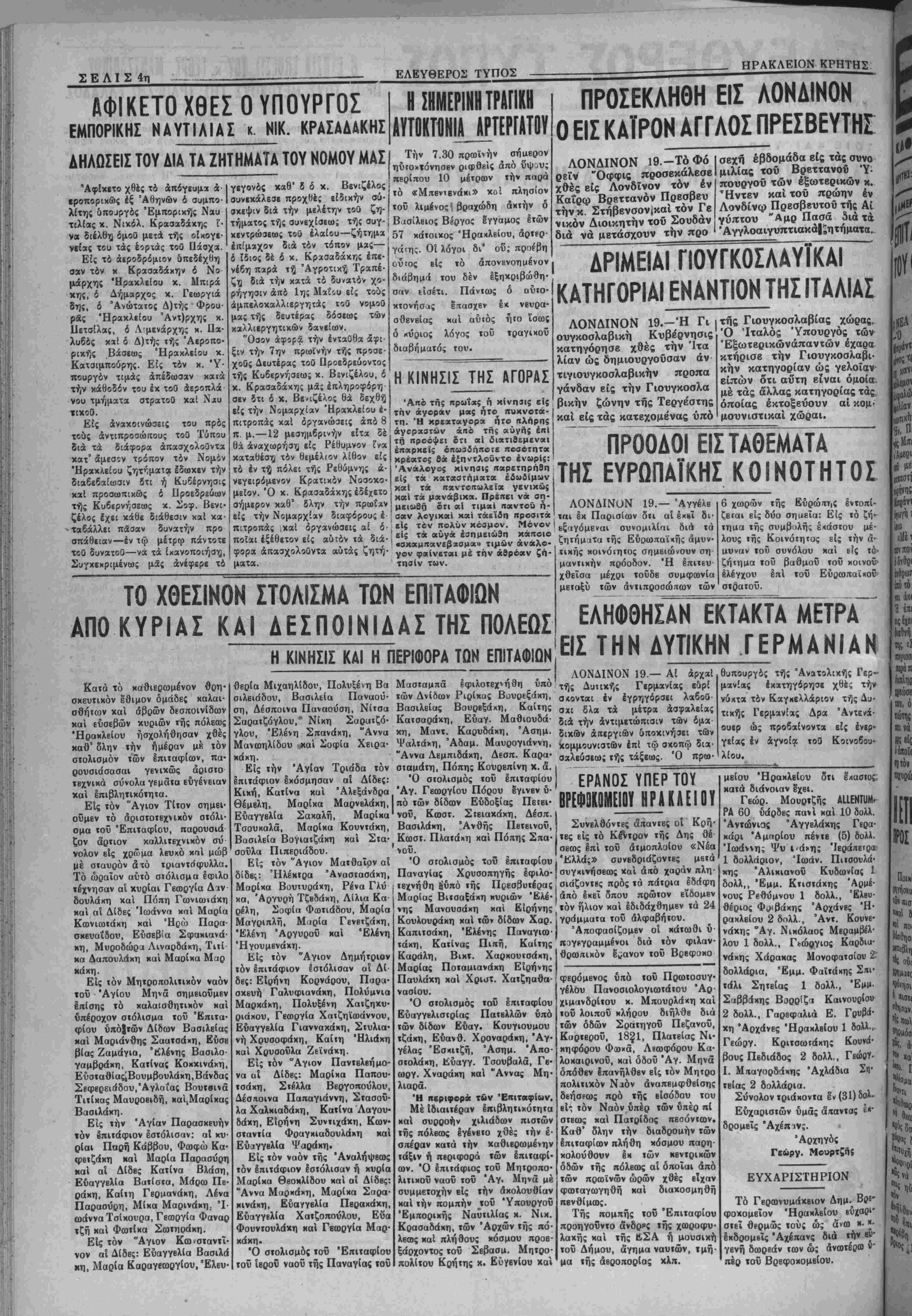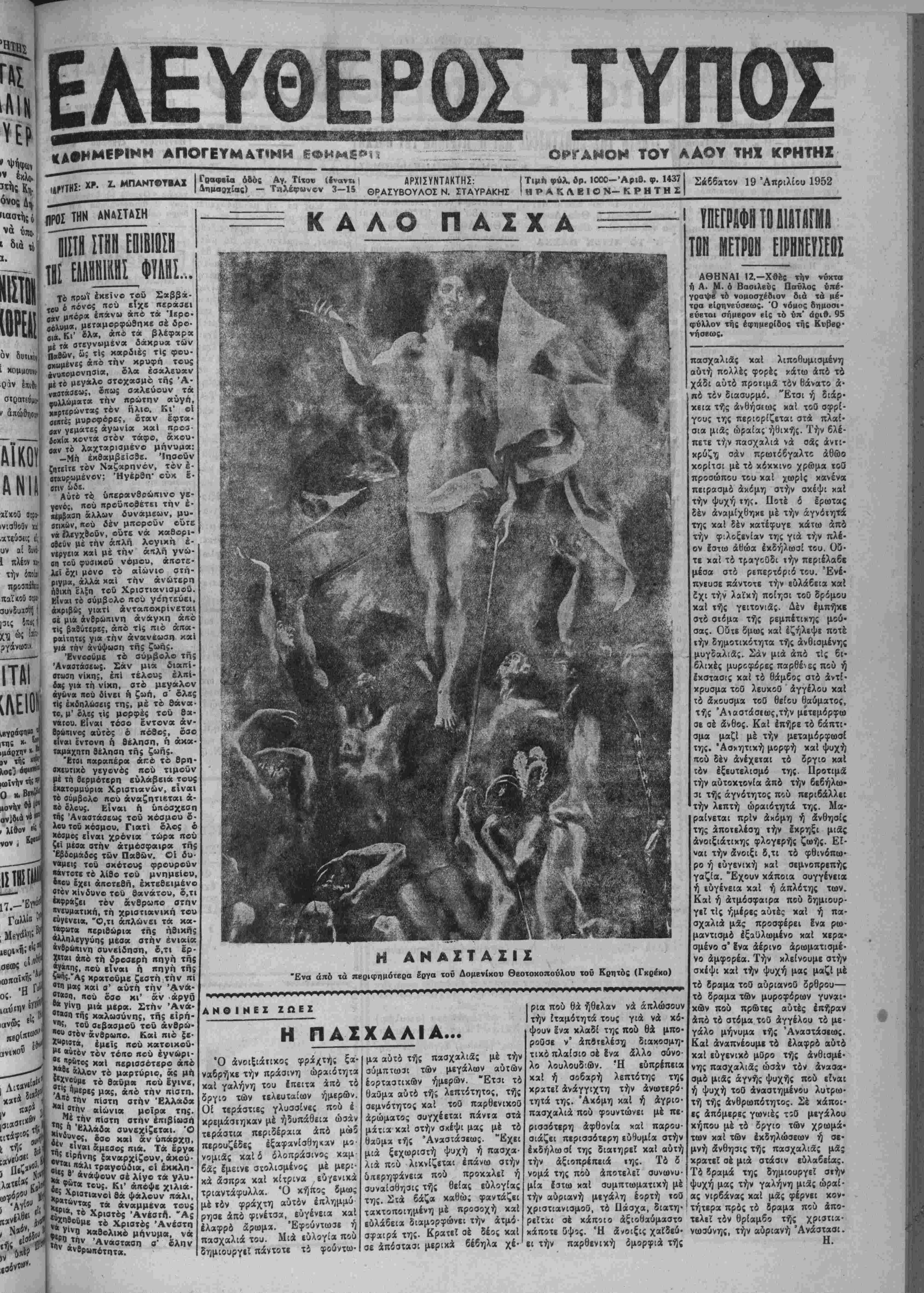 Γοαφβϊα όδύς Αγ. Τίτον (έναντι < Αημαρχίας) — Τηλέφωνον 3—15 ΛΡΧΙΣΥΝΤΑΚΤΗΣ: ©ΡΑΣΥΒΟΥΛΟΣ Ν. ΣΤΑΥΡΑΚΗΣ Τιμη φύλ. δρ. ΙΟΟΟ-Άριθ. φ. 1437 ΗΡΑΚΛΕΙΟΝ-ΚΡΗΤΗΣ Σάββατον 19 Απριλίου 1952 ϋ» ΠΡΟΓ ΤΗΝ ΑΝΑΣΤΑΙΗ ΙιΙμΓεϊβιιιιη iii ειμη φϊαησ.. «,„ - «όνος αχν μ«όρ« επάνω «πό τα Ιερο βέλ»μ«· μεταμβριρΜβηκε σέ δρο- _ |^|> 5λα, άκο τοε βλέφαρα