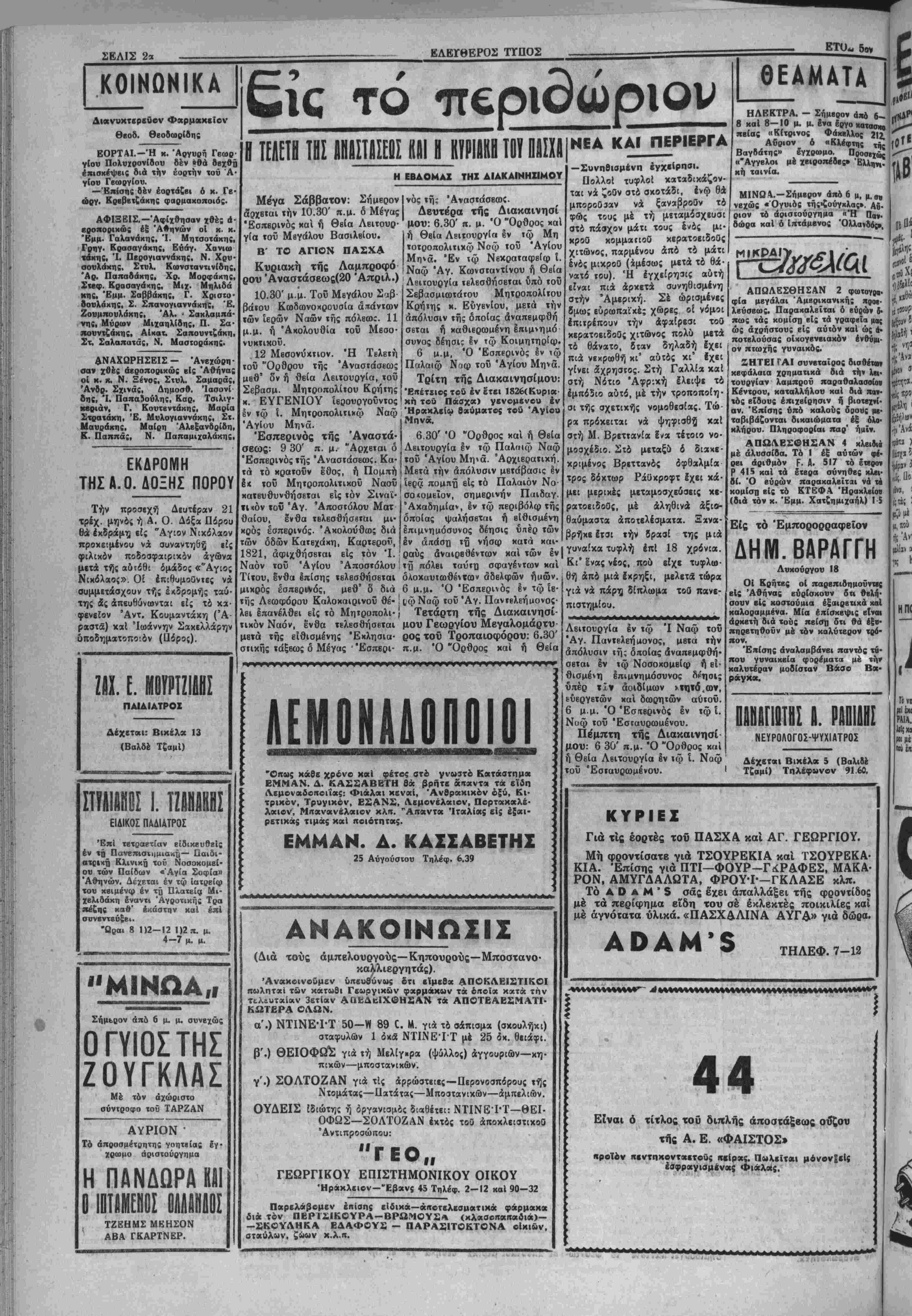σ<ονται έν εγρηγόρσει λαβοθ- άχι δλα τα μέτρα ασφαλείας διά την αντιμετώπισιν των δμα- δικών άΐτεργιών υποκινήσει των κομμουνιστών επί τω σκοπώ δια- σαλεύσεω; τής τάξεως. Ό πρω- Θυπουργός τής Ανατολικώς Γερ¬ μανίας έκατηγόρηαΐ χθές την νύκτα τόν Καγχελλάριον τής Δυ· τιχγ)ς Γερμανίας Δρα Άντενα- ουερ ώ; προβχίνοντα είς ενερ¬ γείας εν άγνοία τοθ Κοινοδου· λίου. ΕΡΑΝΟΣ ΥΠΕΡ ΤΟΥ ΒΡΕΦ3ΚΟΜΕ1ΟΥ ΗΡΑΚΛΕΙΟΥ Συνελθόντες άπαντες οί Κρή¬ τες είς τό Κέντρον τής Δης θέ¬ σεως επί τοΰ ατμοπλοίου «Νέα Ελλάς» συνεδριαζόντες μετά συγκινήσεως καί άπό χαράν πλη- , σιάζοντβς πρός τα πάΐρια έδάφη | άπό Βχεΐ όπου πρώτον είδομεν ' τόν ήλιον καί έδιδάχθημβν τα 24 Ιγράμματα τοΰ άλφαβήτου. Αποφασίζομεν οί κάτωθι ύ· πογργοαμμένοι διά τόν φιλαν¬ θρωπικόν έρανον τοϋ Βρεφοκο φερόμενος υπό τοΰ Πρωΐοσυγ· γέλόυ Πανοσιολογιωΐάτου "Αρ- χιμΐινδρίτου χ. Μπουρλάκη καί τοΰ λοιπού χλήρου διήλθβ διά των όδών Σρατηγοΰ Πβζανοΰ, Καρτεροΰ, 18^1, Πλατβίας Νι¬ κηφόρου Φοοχά, Λβωφόρου Κα· λοχαιρινοΰ, χαί όδοΰ Αγ. Μηνδ δπόθβν επανήλθεν είς τόν Μηΐρο πολιτικόν Ναόν άναπβμφθείσης δεήσεως πρό τής εΐσόδου τού βϊ- τόν Ναόν υπέρ των υπέρ πί στεως χαί Πατρίδος πεσόντων. Καθ' δλην την διαδρομήν των έπιταφίων πλήθη χόσμου παρη- χολούθουν εκ των χβντριχών δδών τής πόλεως αί οποίαι άπό των πρωΐνών ώρών χθές είχαν φωταγωγηθή καί διαχοσμηθή πενθίμως. Τής πομΐιής τοΰ Έπιταφίου προηγοϋντο άνδρρς τής χωροφυ- λακής καί τής ϋΣΑ ή μουσική τοΰ Δήμου, άγημα ναυ ιω ν, τμή- μα τής άβροπορίας κλπ. μβίου Ηρακλείου δτι §χασΐος χαιά διάνοιαν έχει. Γεώο. Μουοτζής ΑίΙΕΝΤυΜ- ΡΑ 60 ύάρδες πανί χαί 10 δολλ. Αντώνιος Άγγελάχης Γβρα- χάρι Άμηρίου πέντε (5) δολλ. Ιωάννης Ψυ ΐ'άκη; Ίεράηεΐρα 1 δολλάριον, Ιωάν. Πιτσουλά- χης Άλικιανοΰ Κυδωνίας 1 δολλ,, Έμμ. Κτιστάκης Άρμέ- νους Ρβθύμνου 1 δολλ., Ελευ¬ θέριος Φυιβάκης "Αρχάνες Η¬ ρακλείου 2 δολλ., Άντ. Κουνε· νάχης "Αγ. Νικόλαος Μβραμβέλ- λου 1 δολλ., Γεώργιος Καρδιιι- νάχης Χάρακος Μονοφατσίου 2. δολλάρια, Έμμ. Φαϊτάκης Σηι- τάλι Σητείας 1 δολλ., "Εμμ. Συββαχης Βορρΐζα Καινουρίου 2 δολλ., Γαςβφαλιά Ε. Γΰφ· χη 'Αρχάνβς Ηρακλείου 1 δολλ., Γεώργ. Κριτσωτάκης Κουνά- βους Πεδιάδος 2 δολλ., ΓειοοΥ· Ι. Μ/ταγορδάχης "Αχλάδια Ση· τβίας 2 δολλάρια. Σύνολον ΐριάχοντα έν (31) δολ- Ευχαριστών υμάς άπαντας ε*" δρομεΐς 'Αχέηιν;. Άρχηγός Γεώργ. Μο»ρτζη$ ΕΥΧΑΡΙΣΤΗΡΙΟΝ Τό Γβοωνυμάκβιον Δημ.^ Φοχομεϊον Ηρακλείου ύ στεΐ θερμώς τούς ώς άνω *■ *■ Ικδρομβϊς "Αχέπανς διά την β&· γενή δωρεάν των ώ; ανωτέρα) "* πέρ τοϋ Βρβφοχομβίου.