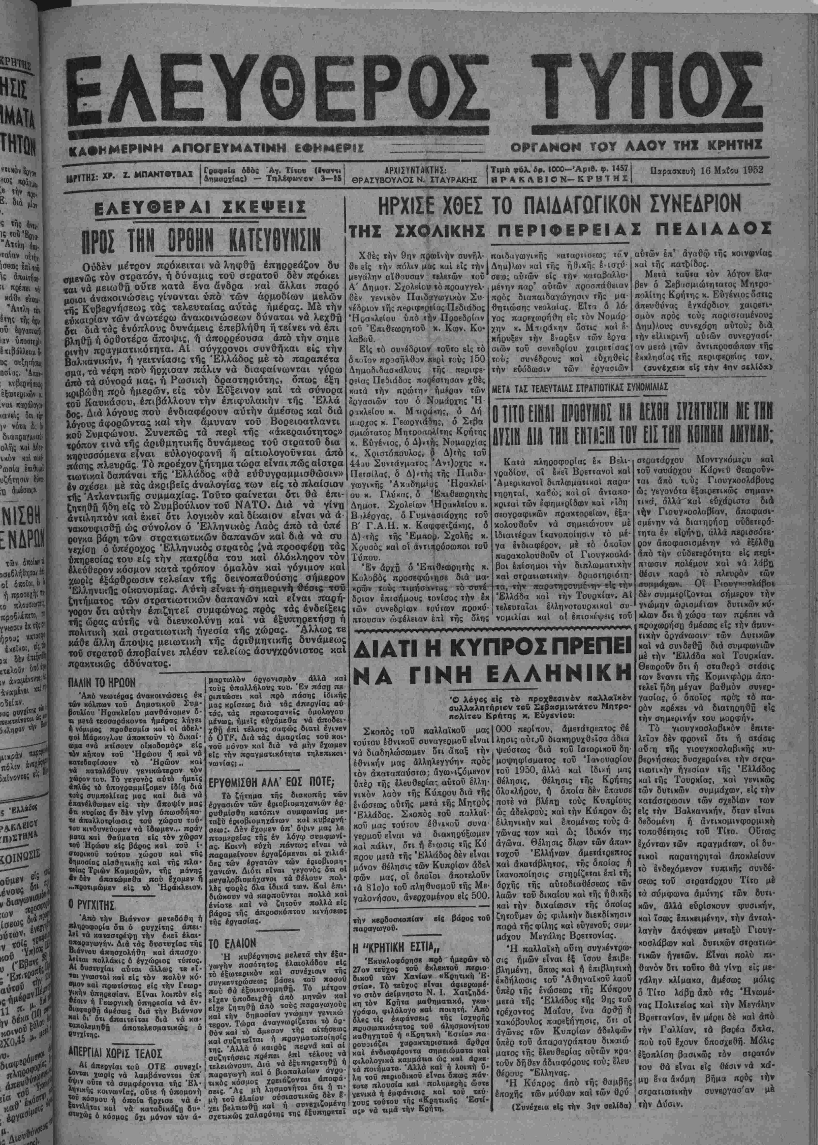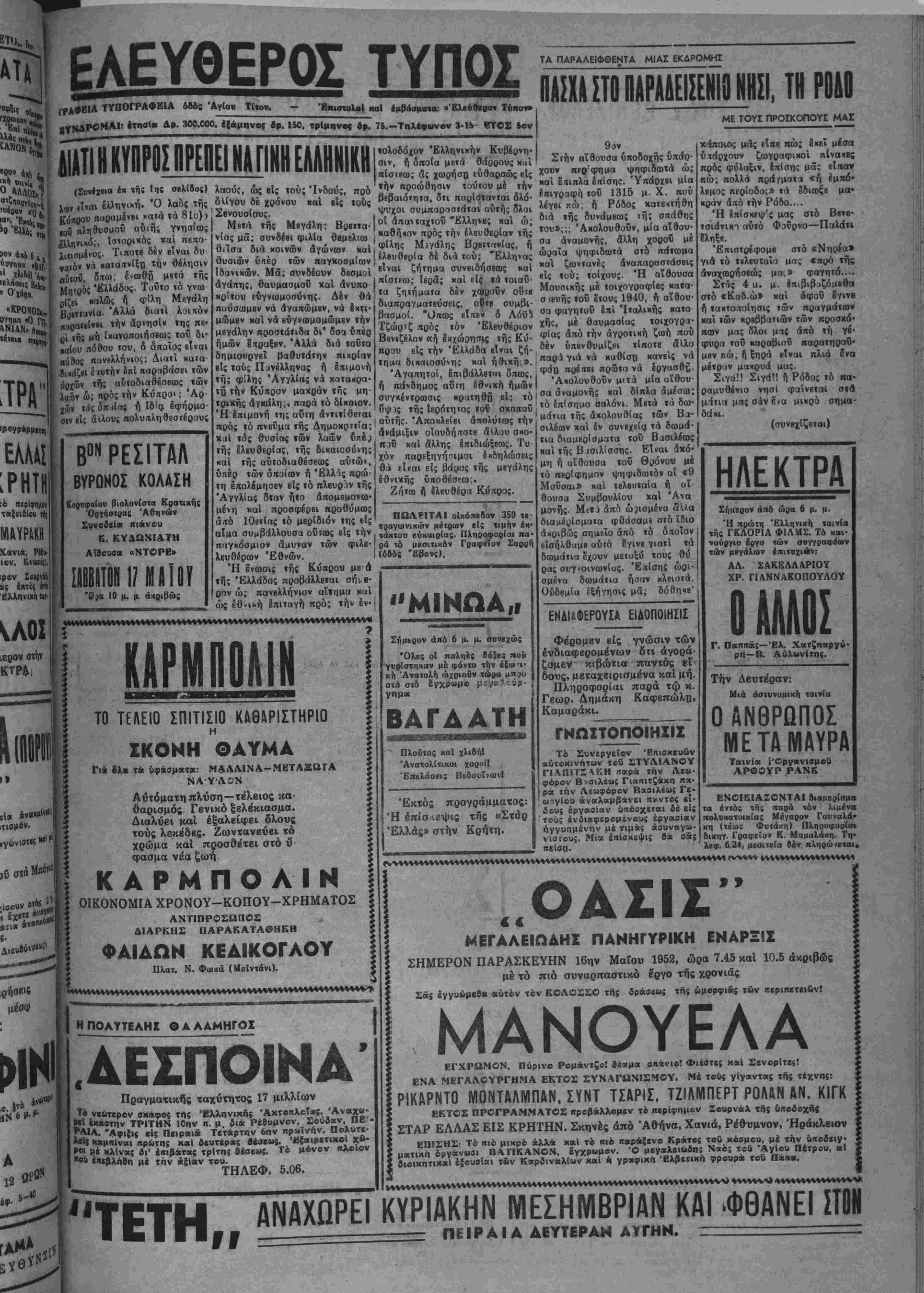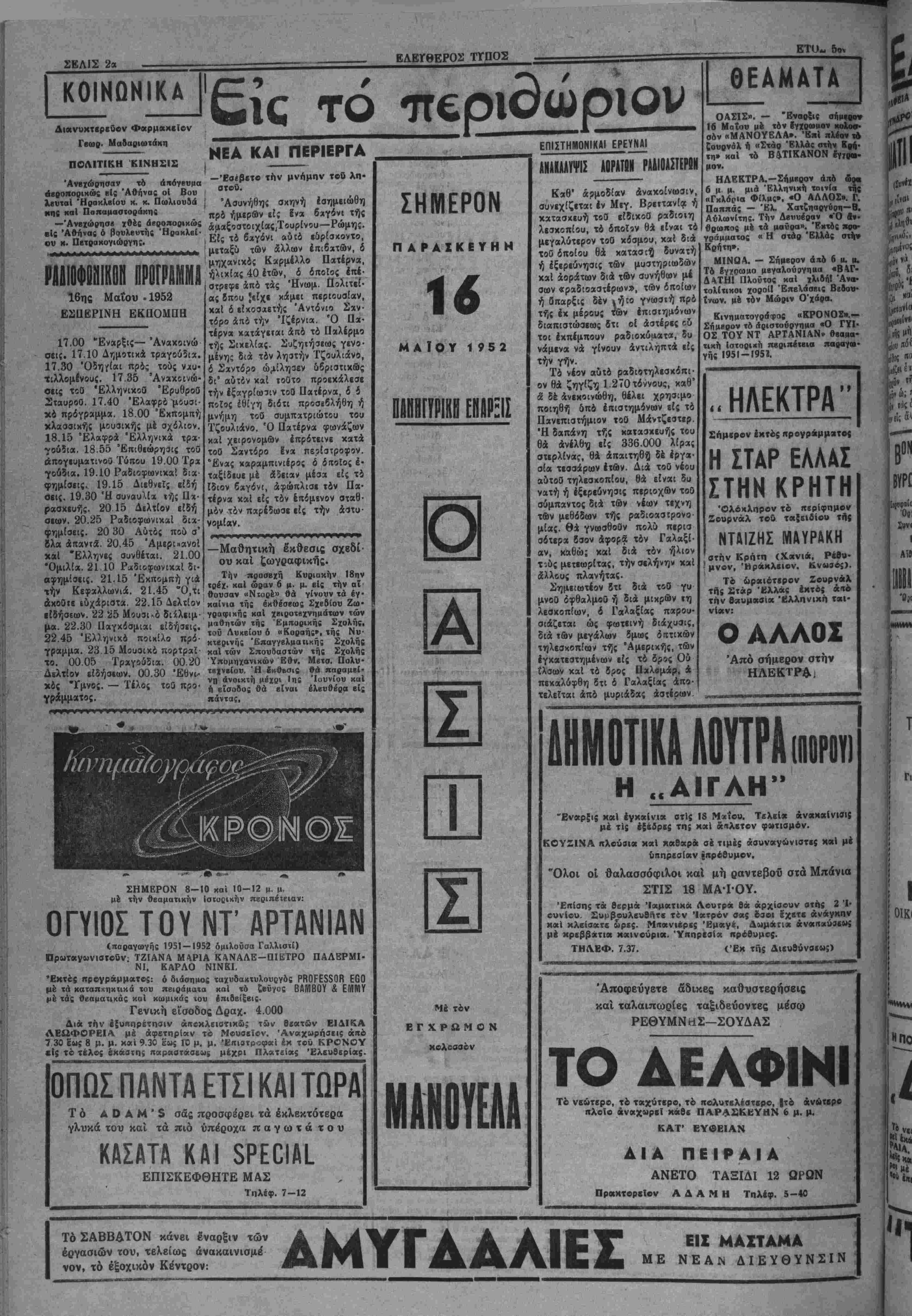 πράξωμβν δηλοΰντες α<ταξ διά παντός τα εξής: ©ά προχωρήσω· μ«ν σταθϊρώς αίς τό έργον μ«;, άφίνοντες την διά τού τύπου φλυαρΐαν ώς αποκλειστικόν Ιρβι- σμ« των καταθορυβηθέντων άν τιπάλων μας. Έκιδινχομεν νά απαλλάξωμεν τόν Εμπορικόν κόσμον άπό την παντοειδή εκ¬ μετάλλευσιν [καί άιτό την άπό· πείραν μονοπωλήσεως των μετα- φορ&ν. Μέ την συνδρομήν τοδ ορθώς σκιητομένου 'Εμΐτορικοϋ καί Βιοτεχνικοϋ κβσμου, Θά τό ίπιτΰχωμβν οηωαδήποτβ διότι ηιστΐόομιν ότι ή επιχράτηβι; "Εχοντβς ύ/τ5 δψβι 1) Την ύπ' άριθμ. 50542)12990)2—4—52 απόφασιν ιλ ΎπουργεΙου "Εμ·' πιρίου πβρί διανομής χαφέ καί| 2) την ύπ' αριθ. 8114—5-52 απόφασιν τής Άγορανομικής Έ- πιτροπής Ηρακλείου ανακοινού¬ μεν είς τόν πληθυσμόνότι άπόΐδ ,-5—52 μέχρι 3-6-52 θέλει 'διβνβργηθ'β διανομή 17,5 δρα- [ μ!ων πεφρυγμένου ή κομμένου Ικαφέ διά τοΰ ύπ' αριθ. 3 κου· πονίου διαφόρων εΐδών πρός δραχ. 2700 κατά μερίδα. Ώσαύ τως κατά τό αύΐό διάστημη οί παντοπώλαι διανομεΐ; τής ύπαί- θρου δύνανται Ιξουσιοδοτούμε· νοι παρά των ΚΕΔ νά παραλαμ- βάνωσι την Ιδίαν κατ' άτομον ποσόιητα πρός δρχ. 62450 κατ' οκάν πρός διανομήν μβτά των λοιπών τροφΐμων τής τρεχούσης διανομής καί άντί 2.800 δραχ. κατά μβρίδα. Ό Προΐστάμενος Έμμαν. Αρχοντάκης ΚΟΜΙΖΕΤΑΙ ΖΑΧΑΡΙΣ Πληροφορούμεθα αρμοδίως δ· τι εντός των ημερών κομίζονται ενταύθα 500 τόννοι ζαχάρεω; πρός διανομήν είς τόν πληθυ¬ σμόν τής πόλεως καί τής ύπαί- θρου. μιάς έπιχβιρησε»ς είς την πρβη- γμένην καί Εντιμον αγοράν τοΰ Ηρακλείου δέν βΐναι ζήτη¬ μα ψευδολογιων, βββαρυμένης συνϊΐύήσβως κ»1 υλικων μέσων άλλά έντιμοτητο;, βύαυνβιδη· βίας καί άψβγου έ{υπηρβτήσΕως. Θέτοντες διά τής παρούσης τέρμα εί; την άστόχως παρατει- νομενην δημοσιογραφικήν πρβ- σπαβίΐαν τοδ έκ Σύρου....Ήρα- κλιιώτβυ κ. Λυμπέρη καΐ Υίοΰ, δηλούμεν βτι ϊφβξής δέν προ-1 κείται νά απαντήσωμεν είς τάς προκλήσϊΐς τού. Ό χρβνος μάς είναι πολύτι- μος κ»Ι θά τόν διαθέσωμεν απο¬ κλειστικώς διά την εξυπηρέτησιν τής «πό ημέρας είς ημέραν ογ·' κουμένης πελατβίας μας. Ι Ηράκλειον 16 Μαΐου 1952 , II ΑΝΤΡΙΑΛ Ι ΑΘΗΝΑΙ 16,-Ήάπόφα σις τής Κυβερνήσεως διά τό εσχάτως προκληθέν ζήτημα τής Άστυνομίας Πόλεων θά άνακοινωθϋ έντός τής σή μερον. Επί τοΰ ζητ,ήματος τούτου συνειργάσθη χθές ό Προεδρεΰων |τής Κυβερνή σεως κ. Βενιζέλος μβτά τοΰ ι Πρωθυπουργόν κ. Πλαστήρα καί βραδύτερον μβτά τοΰ 'Υπουργοΰ Έσωτερικών χ. Ρέντη. Μετά την ανωτέρω- συνεργασίαν ανεκοινώθη αρ¬ μοδίως δτι ζήτημα παραιτή)· σβως τοΰ κ. Ρέντη δέν υφί¬ σταται. Κ. ΑΦΙΞΙΣ ΤΟΥ ΚΑΘΗΓΗΤΟΥ ΜΑΡΙΗΑΤΟΥ ΚΜ Φ3ΙΤΗΤΡΗ ΕΥΧΑΡΙΙΤΙΑΙ ΑΜΕΡΙΚΑΝΟΝ Ό ίπικεφαλής των αφιχθέν¬ των προχθές διά τής θαλαμηγοθ «Στέλλα Πολάρις» Άμερικανων περιηγηχων ώ; καί ό ξεναγδς αυτών απηύθυναν διά οήματός των έκ τοθ ατμοπλοίου θερμάς ευχαριστίας πρός την τοπικήν επιτροπήν τουρισμοθ διά τάς έπιδαψιλευθείσας περιποιήσεως κατά την έ_δώ παραμονήν των. Ιδιαιτέρως οί αύτοι ώ; 5νω κύ· ριοι ηυχαρίστησαν την "Εφορον Όδηγών "Ηρακλείου κυρίαν Μα· ρί Πετράκη 1 ή οποίας μΐιέβη είς Άνώγεια διά νά εξοικονομήση τοπικάς στολάς διά τάς γενομέ¬ νας είς Κνωσόν έπιδείξεις τοπι- κων χορών μέ Κρητικάς ίνδυμα- οίας. —Διά τοθ ατμοπλοίου τής γραμμάς αφίχθησαν χθές είς την πόλιν μας περί τούς 30 φοιτη- ταί τοθ Πανεπιστημίου Αθη¬ νών υπό τόν καθηγητήν χ. Μα· ρινάτον πρός έπίσκιψιν των άρ- χαιοτήτων. Οί ανωτέρω φοιτη ταί κατά την τριήμερον παραμο¬ νήν των ενταύθα θά επισκεφθούν την Γόρτυνον, την Φαιατόν, την Κνωσόν καί τό οροπέδιον Λαση¬ θίου. Ο κ. ΝΟΜΑΡΧΗΣ ΕΙΣ Χθές την μεση
