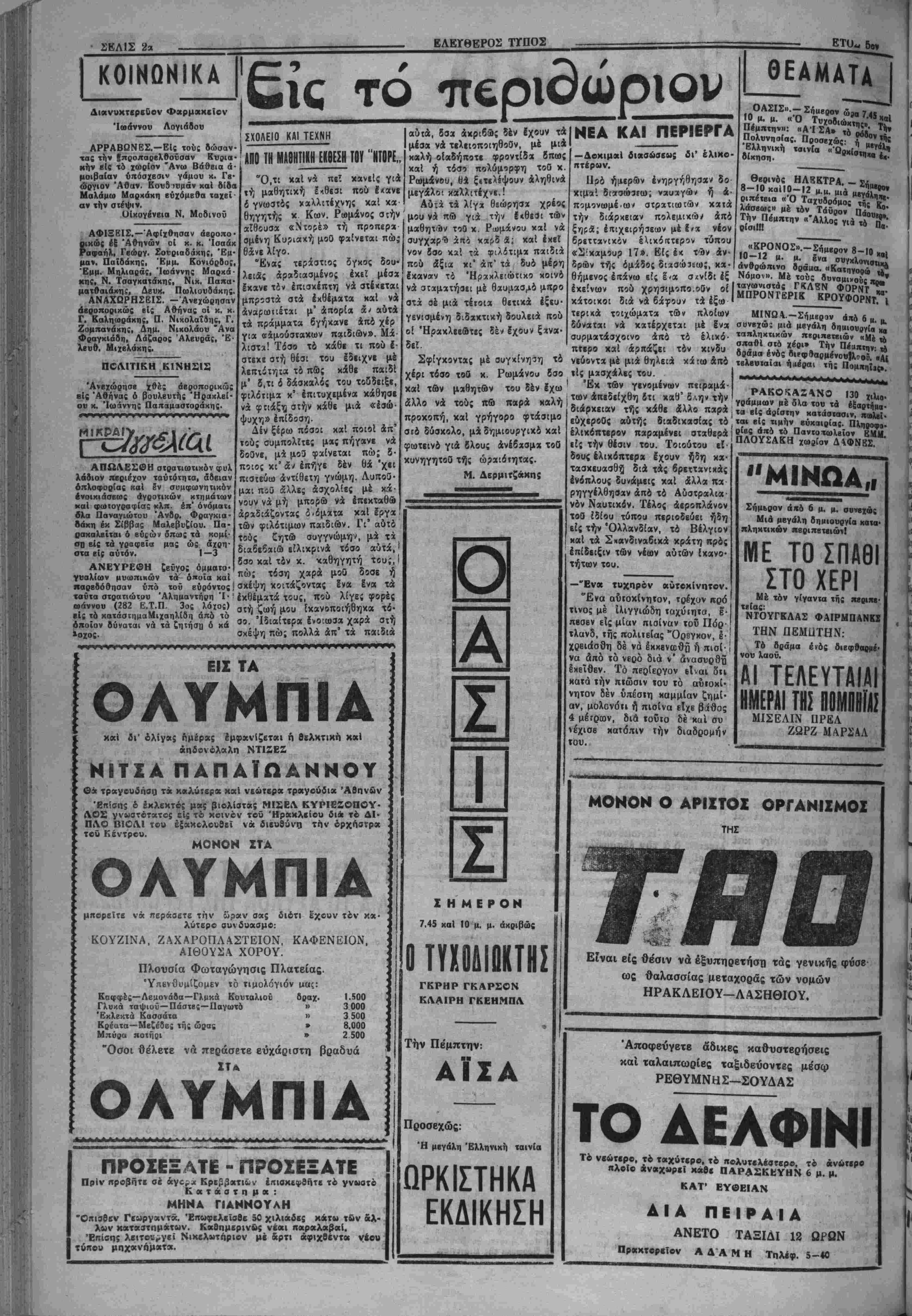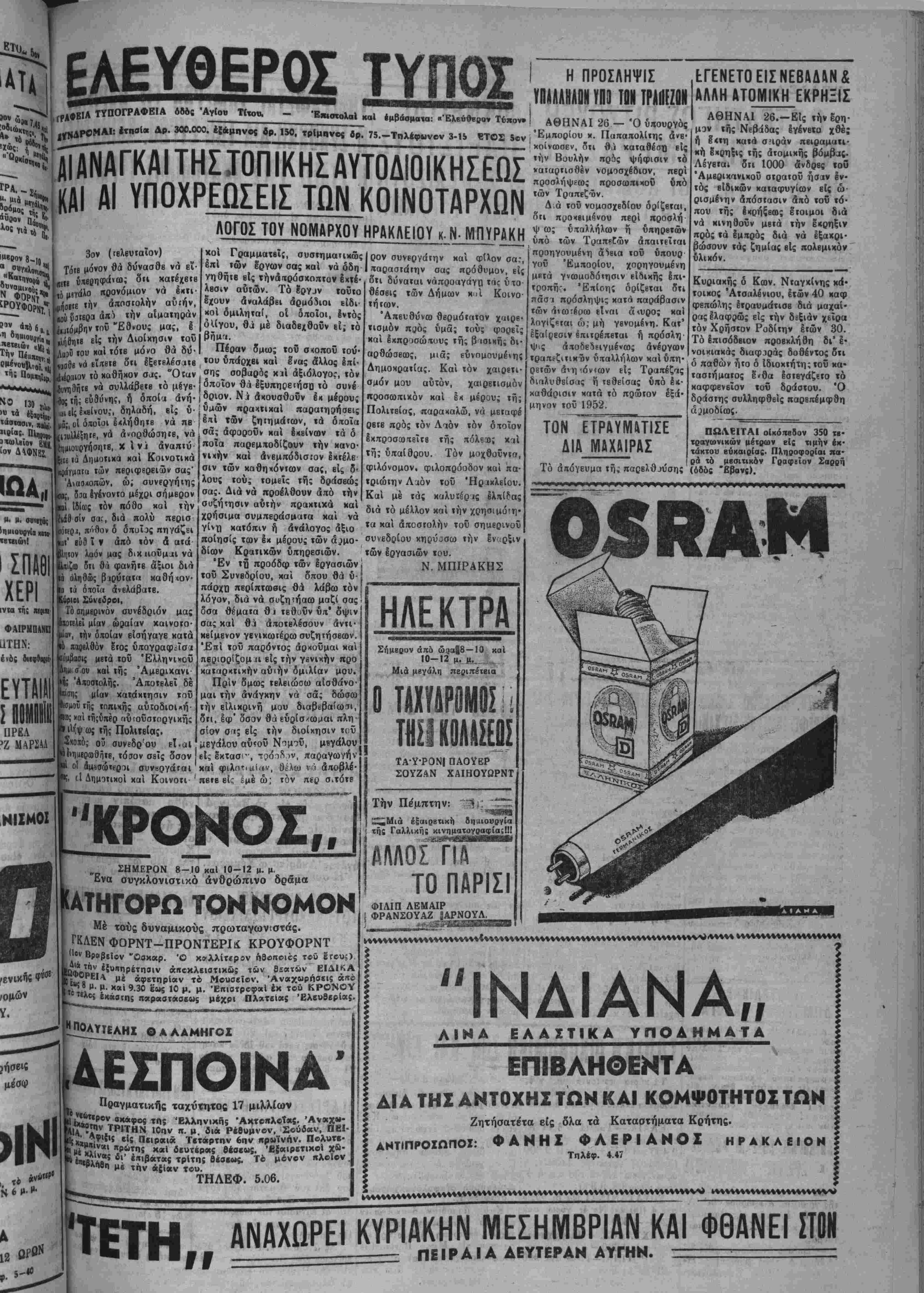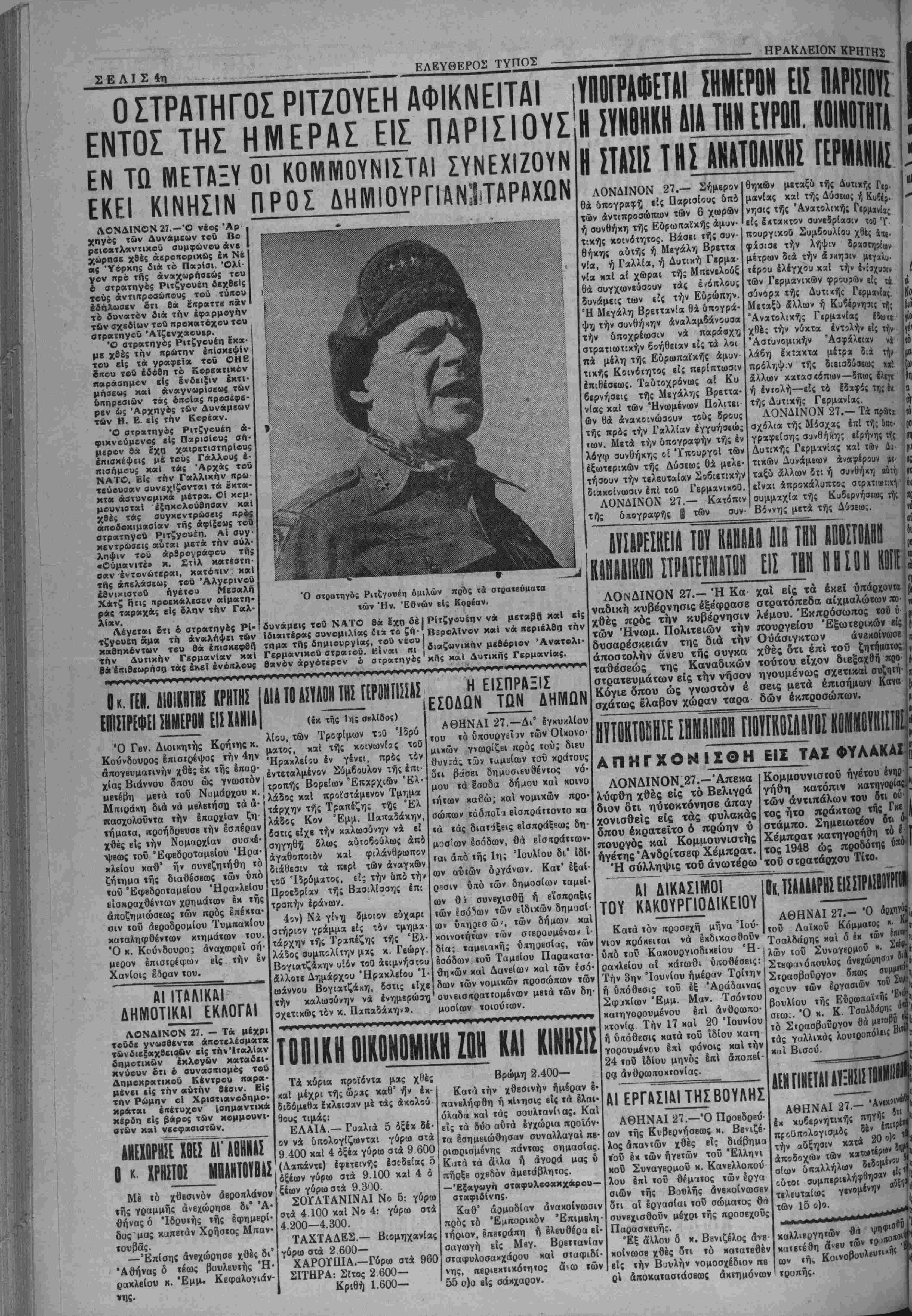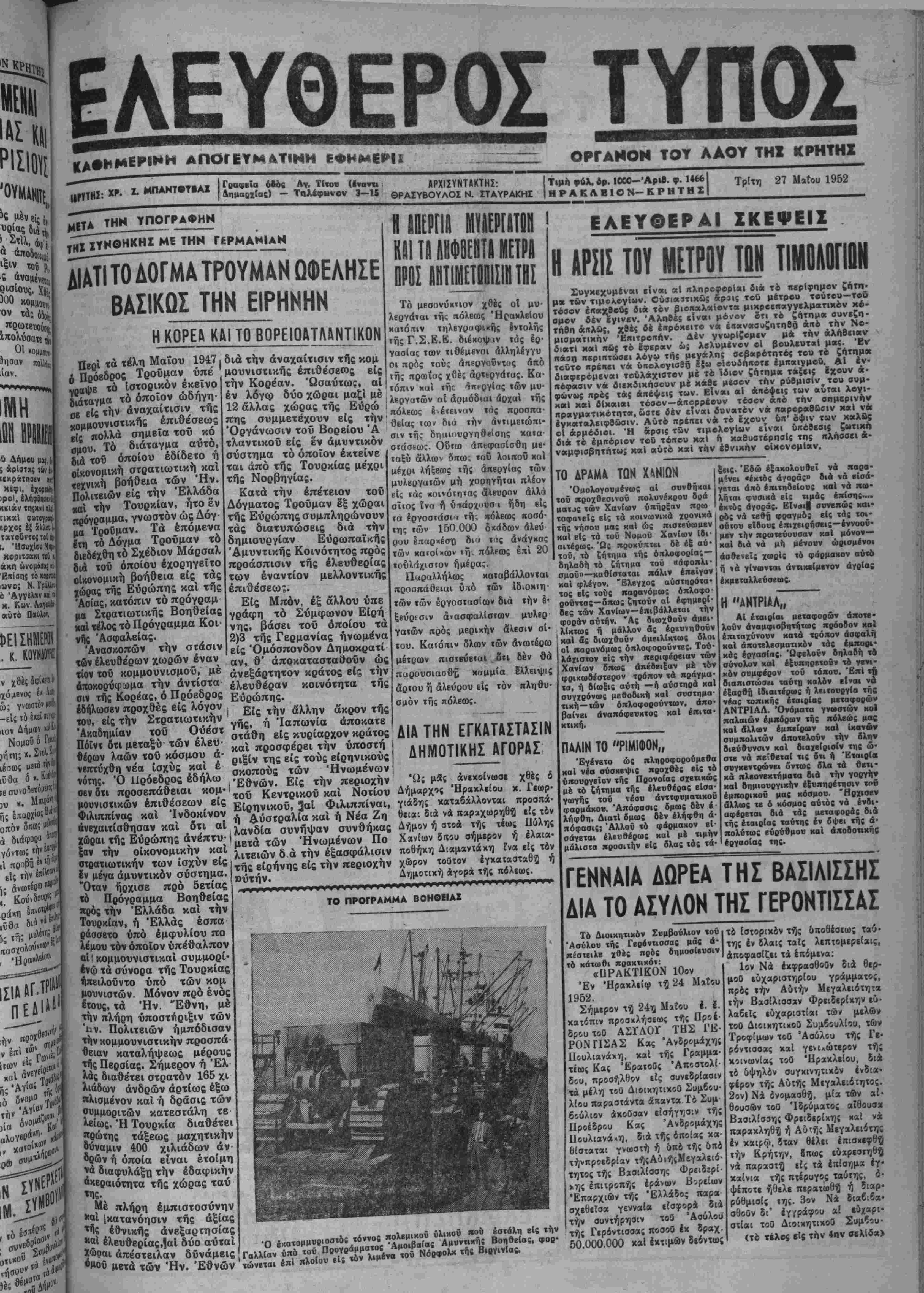 μουνιστικής έπιθέσβ<ος είς την Κορβαν. Ωσαύτως, αί έν λόγω δύο χώραι μαζί μέ 12 άλλας χώρας τής Εΰρώ πης συμμετέχουν είς την "Οργάνωσιν τοΰ Βορείου 'Α τλαντικοΰ είς έν άμυντικόν σύστημα τό οποίον έκτείνε ται άπό τής Τουρκίας μέχρι τής Νορβηγίας. Κατά την επέτειον τοΰ Δόγματος Τροΰμαν έξ χώραι της Εύρώπης συμπληρώνουν τάς διατυπώσεις διά την δημιουργίαν Εύρωπαΐκής 'Αμυντικής Κοινότητος πρός προάσπισιν τής ελευθερίας των εναντίον μελλοντικής έπιθέσεω;. Είς Μπόν, έξ αλλου ύπε γράφη τό Σύμφωνον Είρή νης, βάσει τοϋ όποίου τα 2)3 τής Γερμανίας ήνωμένα είς Όμόσπονδον Δημοκρατί αν, θ' άποκατασταθοΰν ώς ανεξάρτητον κράτος είς την ελευθέραν κοινότητα τής 11 ΚΑΙ ΤΑ ΛΚΦΒΕΠΐή ΜΕΤΡΑ ^ ρ λαων τοϋ κόσμου νιπτύχθη νέα ίσχύς καί έ ό όδ έδήλ Τό μεσονύκτιον χθές οί μυ· «ής πόλεως "Ηρακλείου κατόπιν τηλΒγραφικής βντολής τής Γ.Σ.Ε.Ε. διέκοψ.ιν τάς Ιο· γασΐας των τιθέμενοι άλληλέγγυ οί πρός τούς άιτβργοΰντυς άπό τής προοΐιις χθές άοτίργάιας. Κα¬ τόπιν χαί τής 'ίπεογΐας ιών μυ· λβογατών αί άρμόδιαι αρχαί τής πόλεως έέιεινιιν τάς προσπα¬ θείας τω* διά την αντιμετώπι¬ σιν τής δημιουργηθείσης καια ταξύ άλλων 5πω: «ου λοιπού καί μέχοι λήξεως (ής άπεργίας των μυλβογαιών μή χορηγήται πλέον είς (άς κοινόΐητας ανεύρον άλλά σΐιος ίνα ή ύΐτάρχουσ ι ήδη εί; τα ίργοστάσιι τή. πόλεως ΐτοσό· της «ών 150 000 οκάδων άλεύ ρου έπαςχέστι δι» «άς ανάγκας των καιοίχων τή. πόλεως επί 20 τουλάχιστον ημέρας. Παραλλήλως καταβάλλονται προσπάθειαι υπό των ίδιοκΐη- των των εργοστασιον διά «ήν §· ξβύοεσιν άνασφαλίστων μυλεο γατών πρός μερικήν άλεσιν οί- «ου. Κατόπιν δλων «ών άνωτέοω μέτοων πισιβύειαι ότι δέν θά παρουσιασθή καμμιά έλλειψις άρτου ή άλεύοου είς «όν πληθυ¬ σμόν τής πόλεως. ΔΙΑ ΤΗΝ ΕΓΚΑΤΑΣΤΑΣΙΝ ΑΓΟΡΑΣ ΕΛΕΥΘΕΡΑΙ ΣΚΕΨΕΙΣ «λ™"λ"·λΊΤ·"κλ«" ΑΚΑ1 "^ σκοπούς των Ήνωμένων! ί"&. ?^ρ^&?δ^..|Έθνών. Είς την περιοχήν οεν δτι προσεπάθειαι κομ· ρ ΰ «αί Νοτίου 'Ω; μ8ς ανεκοίνωσε χθές ό Ηρακλείου κ. Γεωρ- δτι αί χώροι τής Εύρώπης άνέπτυ τιωτικήν των ισχύν είς έν μέγα άμυντικόν σύστημα. "Οίαν ήρχισε πρό δετίας τό Πρόγραμμα Βοηθείας ποόςτήν Έλλάδα καί την Τουρκίαν, ή "Ελλάς έσπα ράσσετο υπό έμφυλίου πό λέμου τόν οποίον ύπέθαλπον οί ^κομμουνιστικαί συμμορί· ένφ τα σύνορα τής Τουρκίας ήπειλοΰντο υπό των κομ μουνισιών. Μόνον πρό ενός «ούς, τα Ήν. Έθνη, μέ την πλήρη ύποσττιριξιν των ·&ν. Πολιτειών ήμπόδισαν την κομμουνιστικήν προσπά¬ θειαν καταλήψεως μέρους τής Περσίας. Σήμερον ή 'Ελ λδς διαθέτβι στρατόν 165 χι λιάδων άνδρών άρτίως έξω «λισμένον καί ή δράσις των ουμμοριτών κατεσιάλη τβ λειως. Ή Τουρκία διαθέτβι «θώτης τάξεως μαχητικήν δυναμιν 400 χιλιάδων άν 66ών ή όποία είναι ετοίμη ·*« διαφυλάξη την έδαφικήν βκβραιότητα τής χώρας ταΰ *ης. Μέ πλήρη εμπιστοσύνην *»1 Ικατανόησιν τής άξίας ^ί έθνικής άνεξαρτησίας ελευθερίας,Ιαί δύο αύται α απέστειλαν δά τι Αύστραλία καί ή Νέα Ζή θειαι διά νά παραχωρηθς είς τον λανδία συνήψαν συνθήκας Δήμον ή στοα τής τέως Πύλης μετά των Ήνωμένων Πό Χανίων δπου σήμερον ή ελαια· λιτειών δ ά την εξασφάλισιν ποθήκη Διαμαντάκη Ενα είς τον τής είρήνης είς την περιοχήν χώρον τούτον έγκατααταθ^ ή ούτήν. Δημοτική αγορά τής πόλεως. ΤΟ ΠΡΟΓΡΑΜΜΑ ΒΟΗΘΕΙΑ! Η ΑΡΣΙΣ ΤΟΥ ΜΕΤΡΟΥ ΤΩΝ ΤΙΜΟΑΟΠΟΝ Συγχεχυμεναι είναι αί πληροφορίαι διά το περίφημον ζήτπ- μ» των τιμολογίνν. Ούσιαΐτικώ; αρίΐς τοϋ μέτρου τούτου—τού τόσον έηαχβους διά τον βιοπαλαίοντχ μιχρεεπαγνελματιχόν Ηύ· σμόν δέν έγινεν. 'Αληθέ; είναι μόνον δτι τ