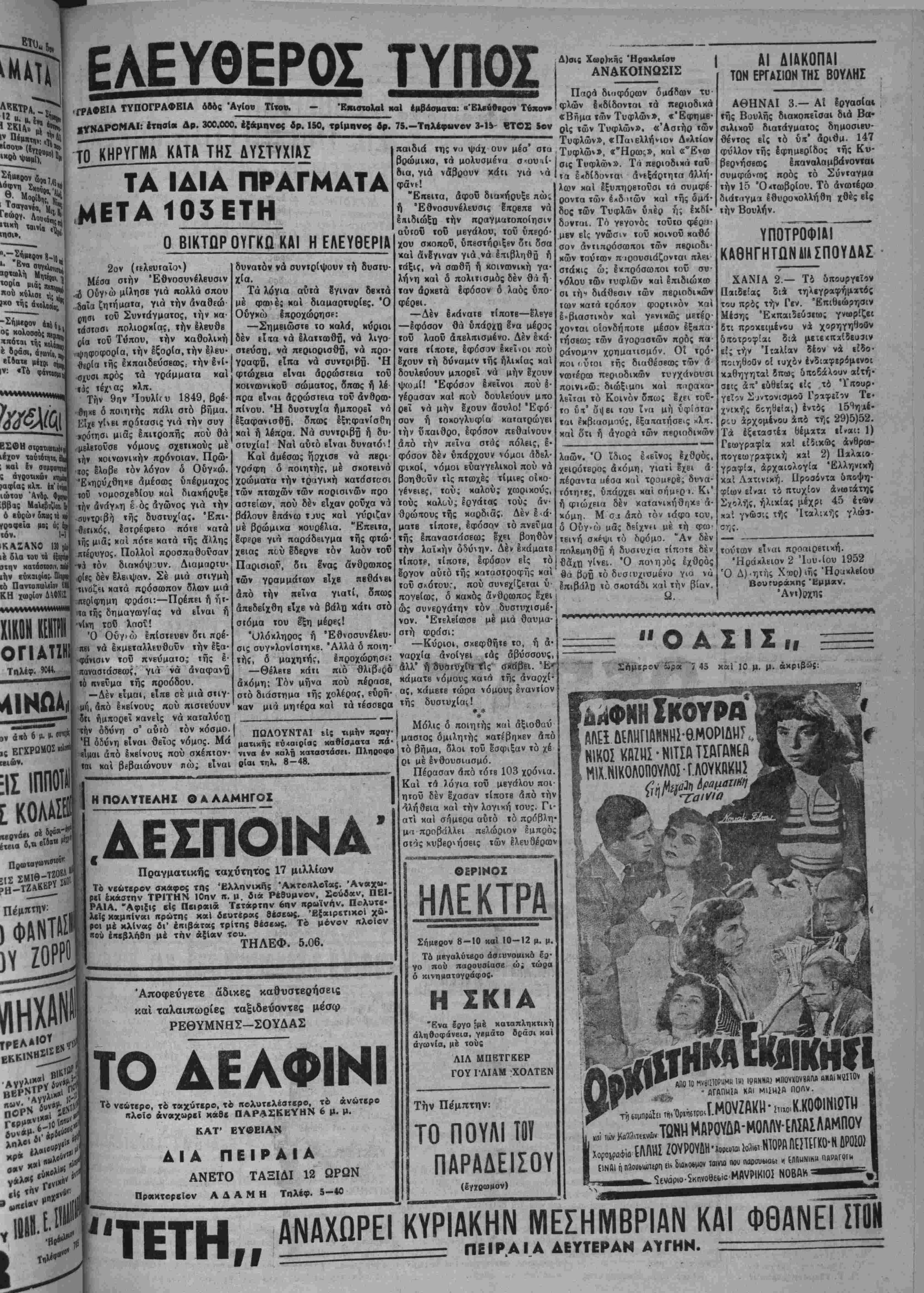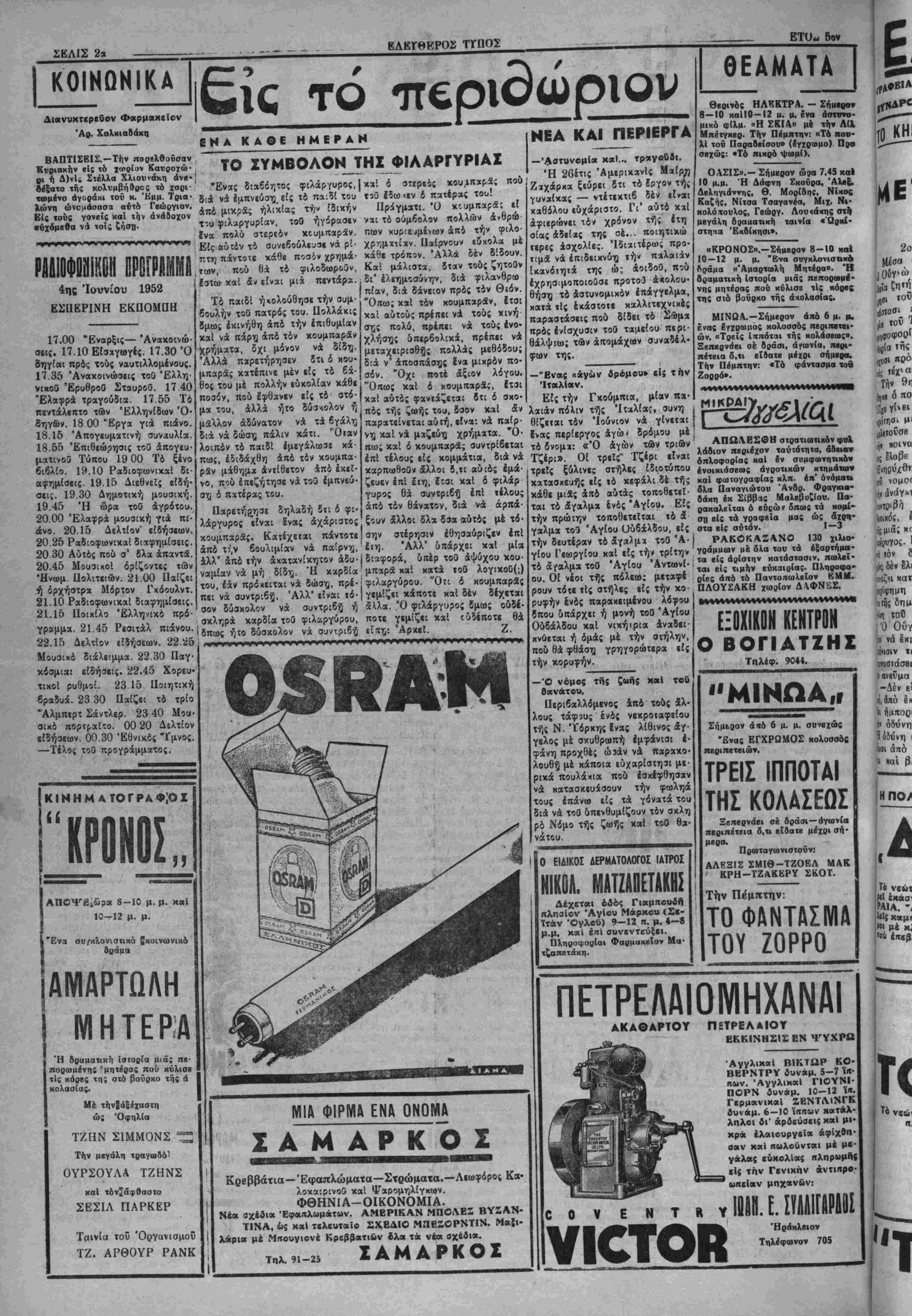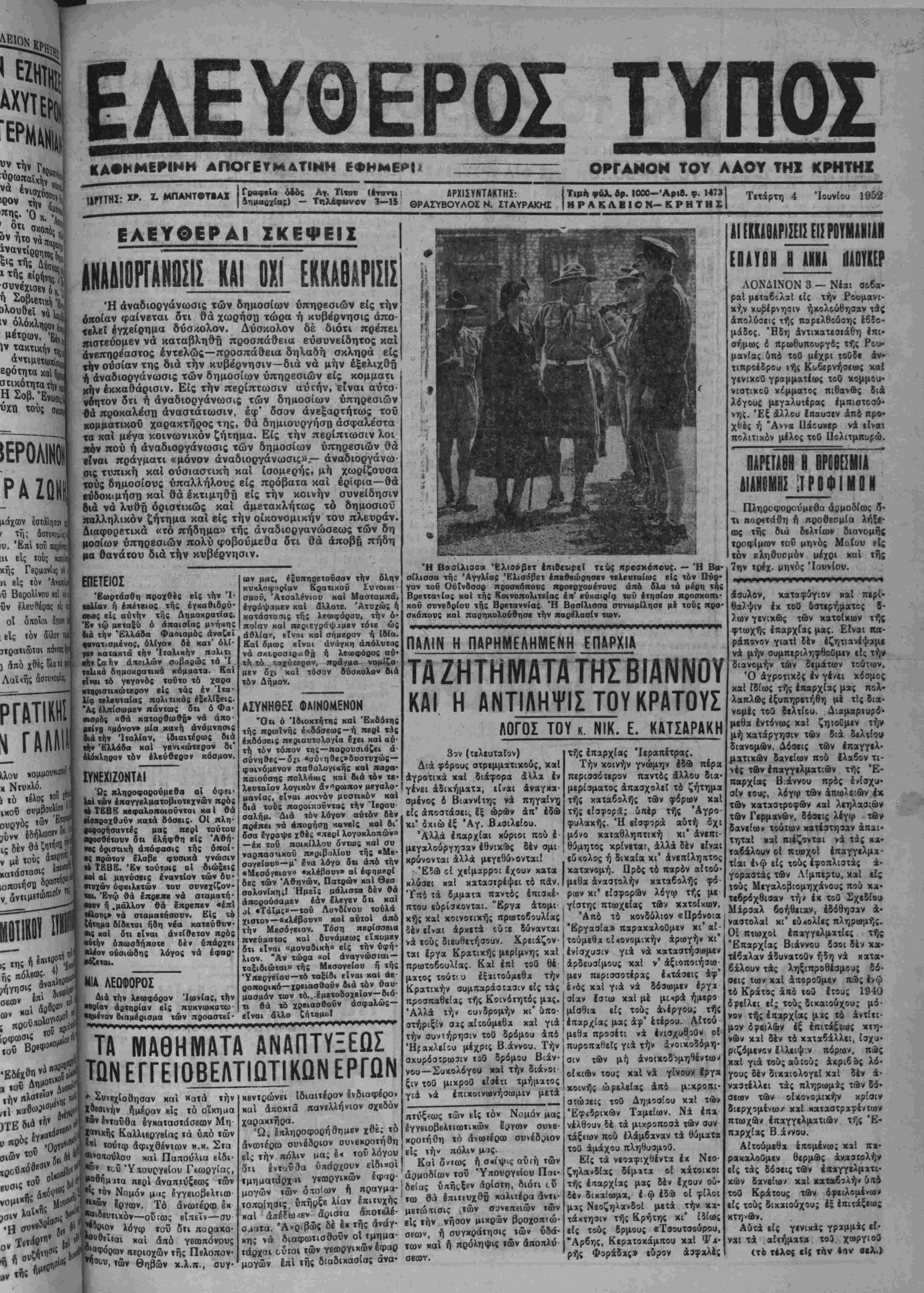11·ΥΤΗΣ· ΧΡ· -ΜΠΑΝΤ·Τ·ΑΧ Γ8"*·^ Τ*8 τ^*ΤΙ<Μ '*?""{ ΛΡΧΙΣΥΝΤΑΚΤΗΣ: ·ΙΓΤΤΗ*- __________________μημ-βχίας) - Τηλέφωνον 3-15 ©ΡΑΣΥΒΟΥΛΟΣ Ν. ΣΤΑΥΡΑΚΗΣ Τιμίί φόλ. βρ. ΙΟΟΟ-'ΛριΟ. φ. 1473 ΗΡΛΚΛΒΙΟ Ν— ΚΡΗΤΗΣ Τετάρτη 4 Ίουνίου 1952 ΕΛΕΥΟΕΡΑΙ ΣΚΕΨΕΙΣ ΛΝΛΛΙΟΡΓΛΝΙΙΣΙΣ ΚΛΙ Ο~Χ1 "ίΚΚΑΘΛΡΙΣΙΣ Ή άναδιοργάνωσις των δημοσίων ύπηρβσιών είς την οποίαν φαίνεται δτι θά χωρήση τώρα ή κυβέρνησις απο¬ τελεί έγχβίρημα δύσκολον. Δύσκολον δέ διότι πρέπει πιστεύομεν νά Ματαβληθή προσπαθεία εΰσυνείδητος καί ανεπηρέαστος εντελώς—προσπαθεία δηλαδή σκληρά είς ττ|ν θυσίαν της διά την κυβέρνησιν—διά νά μην εξελιχθή ή άναδιοργάνωσις των δημοσίων ύπηρεσιών είς κομματι κήν εκκαθάρισιν. Είς την περίπτωσιν αυτήν, είναι αύτο- νοητόν δτι τ) άναδιοργάνωσις των δημοσίων ύπηρεσιών όά προκαλέση αναστάτωσιν, έφ' δσον ανεξαρτήτως τοΰ χομματικοΰ χαρακτήρος της, θά δημιουργήση άσφαλ,έστα τα καί μέγα κοινωνικόν ζήτημα. Είς την περίπτωσιν λοι «όν ποΰ ή άναδιοργάνωσις των δημοσίων ύπηρεσιών θά είναι πράγματι «μόνον άναδιοργάνωσις».— άναδιοργάνω- σις τυπική καί ούσιαστική καί ίσομερής, μή χωρίζουσα τούς δημοσίους ύπαλλήλους είς πρόβατα καί έρίφια—θά εύδοκιμήση καί θά έκτιμηθή είς την κοινήν συνείδησιν διά νά λυθή οριστικώς καί άμετακλήτως τό δημοσίου ηαλληλικόν ζήτημα καί είς την οικονομικήν τού πλευράν. Διαφορετικά «τό πήδημα» τής άναδιοργανώσεως των δή μοσίων ύπηρεσιών πολύ φοβούμεθα δτι θά αποβή πήδη μα θανάΐου διά την κυβέρνησιν. ΕΠΕΤΕΙΟΣ Έωρτάσθη προχθίς είς την Ί· (•λίαν ή έπέτειος τής έγκαθιδού- •ειβς είς αυτήν τής Δημοκρατίας. 'Β» <φ μβτας'ϋ ό άπαισΐας μνήαης βιά την Έλλάδα Φασισμός άναζβϊ •ενατισμένος, ολίγον βέ κατ' όλί- »ο» καΐακτά την Ίταλικήν πολιτι ιΑ»ζα;Γΐν απειλών σοβαρώς τα Ί «βλιχά δημοκρατικά «όμματα. Καί είναι τό γβγονός τούτο τό χαρα «"βιοτικώΐβοον εις τάς έν Ιτα¬ λία τελευταίας πολιτικάς έξίλίξβις. Άς ελπίσωμεν πάντως δτι ό Φα· βισμδς «θά κατορθωθή» νά απο¬ μείνη «μόνον» μία καχή άνάμνησις διά ΐήν Ιταλίαν, Ιδιαιτέρως διά τί)» Έλλάδα καί γβνικώτϊρον δι* ολόκληρον τδν ελεύθερον κόσμον. ΙΥΝΕΧΙΖΟΝΤΑΪ Ό; πληροφορούμεθα αί όψει- ΙαΙ των έκαγγελματοβιοτεχνάν πρός «ε ΤΕΒΕ κεφαλοποιοϋνται καί θά •Ισκοαχθϋύν κατά δόσβις. ΟΙ πλη- εονοοήοαντές μας περΐ τούτου «βοσθέτοιιν δτι ελήφθη είς "Αθή¬ νας Αριστική απόφασις τής όποί- •ς πρώτον έλαβε φυσικά γνώσιν «ε ΤΕΒΕ. Έν τούτοις οί διώξεις «οί αί μηνύσεις εναντίον των δυ· ετυχών όφειλετών τού συνεχίζον¬ τες Ένφ θά έΐτριχβ νά σΐαματή- •ενν η .μάλλον Θά έπρβπεν «επί «·1ο«ί» νά σταμαΐήσουν. Εί: τέ Ιήτημο δίδεται ηδη νέα κατεύθυν· ·>( καί ότι είναι αντίθετον πρός