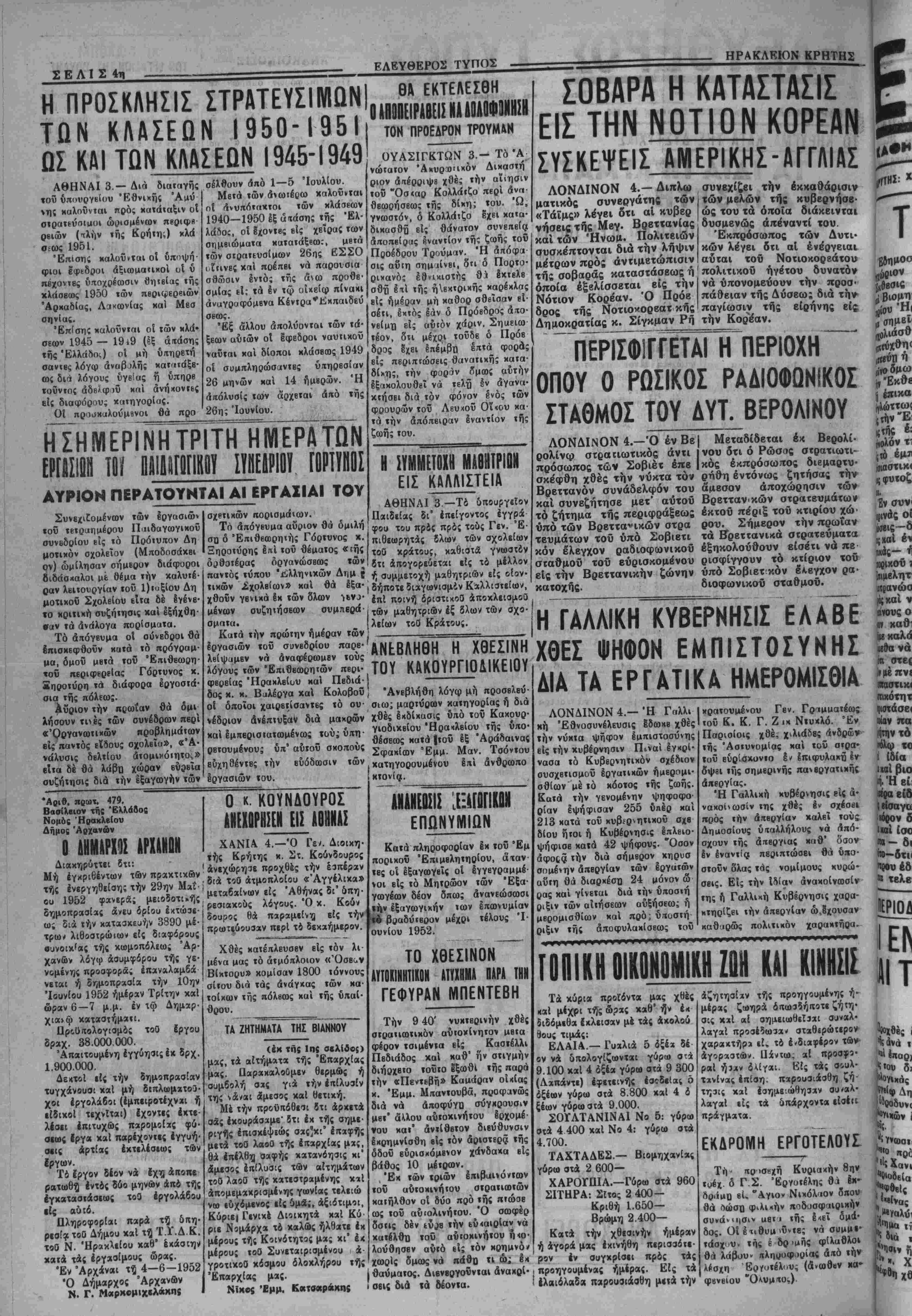 9 __. _ /_ Ιϊί^Ι ' ^λ *— _ _* « ■ _ ι 4ε> **1Λ *■ ι_ ^Λ Λ Λ «*^^**^^ε ■ Α4* «*.**&* ^<3»&* ^_ _. __- όποία έξβλίσσεται είς την Νότιον Κορέαν. Ό Πρόε δρος τής Νοτιοχορεατ κης νά ύπονομεύονν την προσ πάθβιαν τής Δύσεω; διά την παγίωσιν τής είρήνης είς συζήτησις διά την εξαγωγήν των Η ΣΥΜΜΕΤΟΧΗ ΜΑΘΗΤΡΙΟΝ ΕΙΣ ΚΑΛΛΙΙΤΕ1Α ΑΘΗΝΑΙ 3.—Τό δπουργείον ϋαιδείας δι' έπείγοντος έγγρά φού τού πρός πρός τούς Γεν. Έ- πιθεωρητάς δλων των σχολείων τοθ κράτους, καθιστά γνωστόν , , δτι άπογορεύεται είς τδ μέλλον παντός τυΐτου ϋίλληνιχών Δημ ς ή αυμμετοχή μαθητριων είς οίον τικων _χολβίων» και θα Ιξα-, δήποτε διαγωνισμόν Καλλιστείων, χθουν γβνικά βκ των δλων ν6νο· ίπ1 Ποινη- δριστικοσ άποχλεισμοθ μένων ουζητηοεων συμπβρα·(των μαθητριών έξ δλων των σχο- ο·*™"· , , λείων τοθ Κράτους. Καΐά την πρώτην ημέραν των :_________________________ Δημοκρατίας κ. Σίγκμαν Ρή την Κορ'έαν. "πΤρΙσφΓγγεται γΓπεριοχη ~~ οπου 0 ρωσικοσ ραδιοφωνίκοσ σταθμοσ του αυτ. βερολινου ΛΟΝΔΙΝΟΝ 4.—Ό έν Βε | Μεταδίδεται έκ Ββρολί- ρολίνφ στρατιωτικάς άντι ι νού δτι ό Ρώσος στρατιωτι- πρόσωπος των Σοβιέτ έπβ |κός έκπρόσωπος διεμαρτυ* σκεφθή χθές την νύκτα τόν ρήθη εντόνως ζητήσας την Βρεττανόν συνάδελφον τού άμεσον αποχώρησιν των καί συνεζήτησε μβτ' αύτοΰ Βρεττανκών στραΐβυμάτων τό ζήτημα τής περιφράξεως έκτοϋ πέριξ τοΰ κτιρίου χώ· υπό των Βρεττα^ικών στρα ρου. Σήμερον την πρωΐαν τβυμάτων τοΰ υπό Σοβιβτι τα Ηρβττανικά στρατβύματα κόν έλεγχον ραδιοφωνικοΰ έξηκολούθουν εισέτι νά πβ- σΐαθμοΰ τοΰ εύρισκομένου ρισφίγγουν τό κτίριον τοΰ είς την Βρεττανικήν ζώνην υπό Σοβιετ κόν έλβγχον ρα· κατοχής. διοφωνικοΰ σταθμοΰ. λόγους των φβρείας Ηρακλείου καί Πβδιά-1 δος χ. ν». Βυλέργα χαί Κολοβοΰ' "Ανεβλήθη λόγφ μή προσελβύ- οί όποΐοι χαιρετίσανΐΕς τό ου- σιω; μαρτύρων κατηγορίας ή διά νέδριον άνέπιυξαν διά μακρών χθές έκδίκασις υπό ΐοΰ Κακουρ- καΐ ΙμπΒρισιαΐωμένως »ού;ύηη· Υΐοδιχβίου Έρακλβίου τής υπο- ρετουμένους ύπ' αύτοϋ σκοπούς δύχηθέντες την εύόδωσιν των εργασιών τού. Αριθ. πρωτ. 479. Βασίλειον τής Ελλάδος Νομός Ηρακλείου Δήμος Αρχανών Ο ΔΗΜΑΡΧ9Σ ΑΡΧΑΝΩΝ Διακηρύττει δτι: Μή εγκριθέντος των πρακτικών τής Ινεργηθείαη; την 29ην Μαί- ου 1952 φανερα; μειοδοτΐχής δημοπρασίας άνευ δρίου έχτώσε- ως διά την κατασκευήν 3890 μέ- τρω* λιθοστ,ρώιων είς διαφόρους συνοικίας τής κωμοπόλεως Αρ¬ χανών λόγφ άσυμφόρου τής γε¬ νομένης προσφοραί; έπαναλαμβά ; νεται ή δημοπρχσία την Ιθην Ίουνίου 1952 ημέραν Τρίτην καί ώραν 6—7 μ.μ. έν τφ Δημχρ- χια»φ καταστήματι. Πριϋιτολογισμδς τοθ ίργου δραχ. 38.000.000. Απαιτουμένη εγγύησις έκ δρχ. 1.900.000. Δεκτοί είς την δημοπρασίαν τυγχανουσι χαί μή διπλωμχτο3· χοι ίργολάβοι (έμπιιροτέχνχι ή ■ίδιχοΐ τεχνίται) έχοντες έχτ*- λέσει επιτυχώς παρομοίας φύ¬ σεως ίργα καί παρέχοντες ίγγυή- οεις άρτιας έχτελέσεω; των έργων. Τό έργον δέον νά έχη άποπε ρατωθ^ έντδς δόο μηνών άπδ τής εγκαταστάσεως τοθ έργολάβου είς αύΐό. Πληροφορίαι παρά τή δπη- ρεσία τοθ Δήμου χαί τή Τ.Υ.Δ Κ. τοθ Ν. Ηρακλείου καθ' έχάσΐην κατά τάς εργασίμους ώρας. Έν Αρχαναι τ? 4-6-1952 Ό Δήμαρχος Άρχκνιον Ν. Γ. Μ«ρκομιχελ«Μης Ο κ. ΚΟΥΝΔΟΥΡΟΣ ΑΝΕΧΩΡΗΣΕΝ ΕΙΣ ΑΘΗΝΑΣ ΧΑΝΙΑ 4.—Ό Γε/. Διοικη «ής Κρήτης χ. Στ. Κούνδουρος προχθές την ατμοπλοίου «Άγγέλ μεταβαίνων είς Αθήνας δι9 δπη ρεσιαχούς λόγους. Ό χ. Κου ν δουρος θά παραμείνη είς την πρωτεύουσαν περί τό δεκαήμερον. Χθές κατέπλευσεν είς τόν λι μενά μας τό ατμόπλοιον «Όσβον Βίχτορυ» χομίσαν 1800 τόννους σίιου διά τάς ανάγκας των κα τοίκων τής πόλεως καί τής ύπαί· 