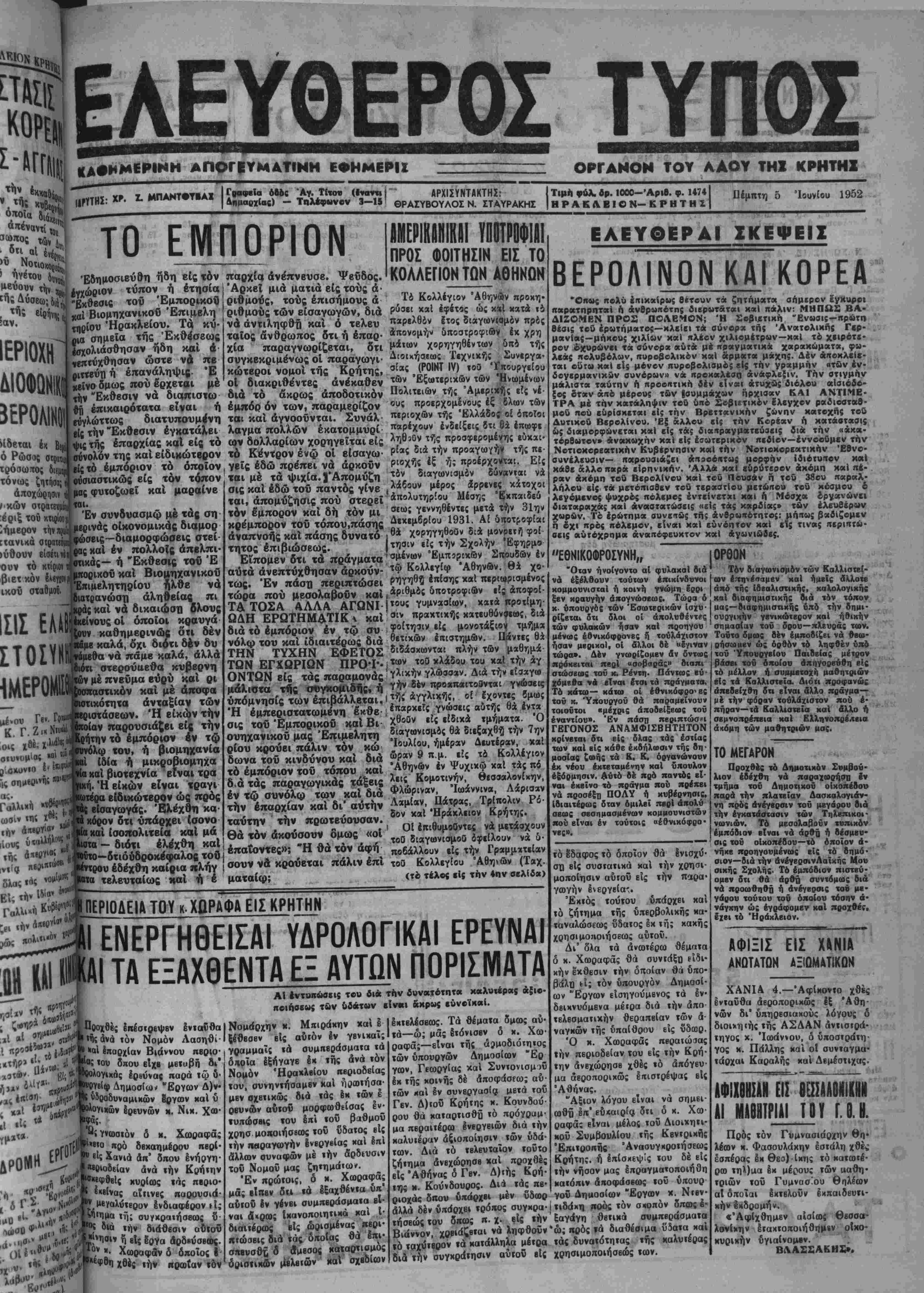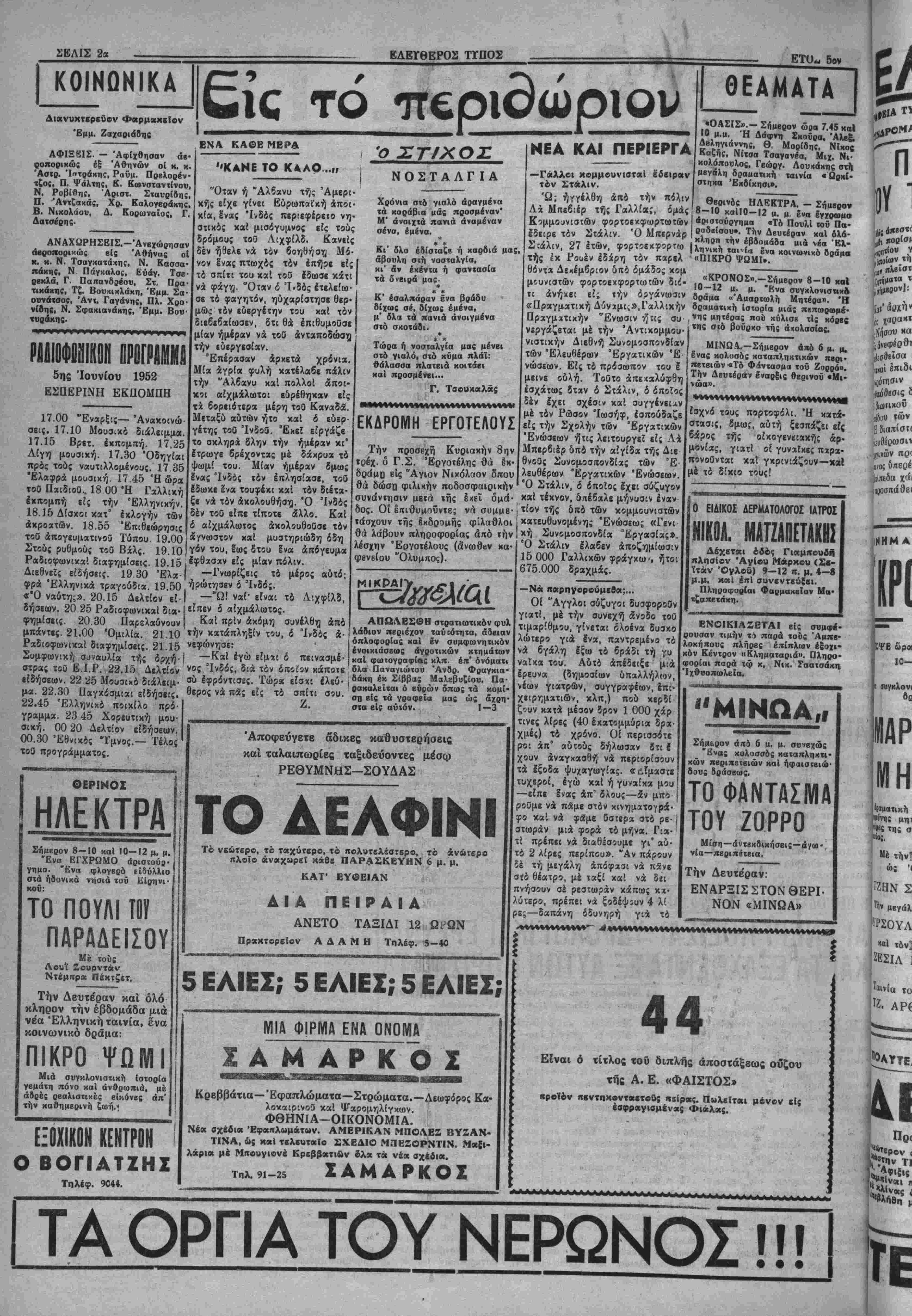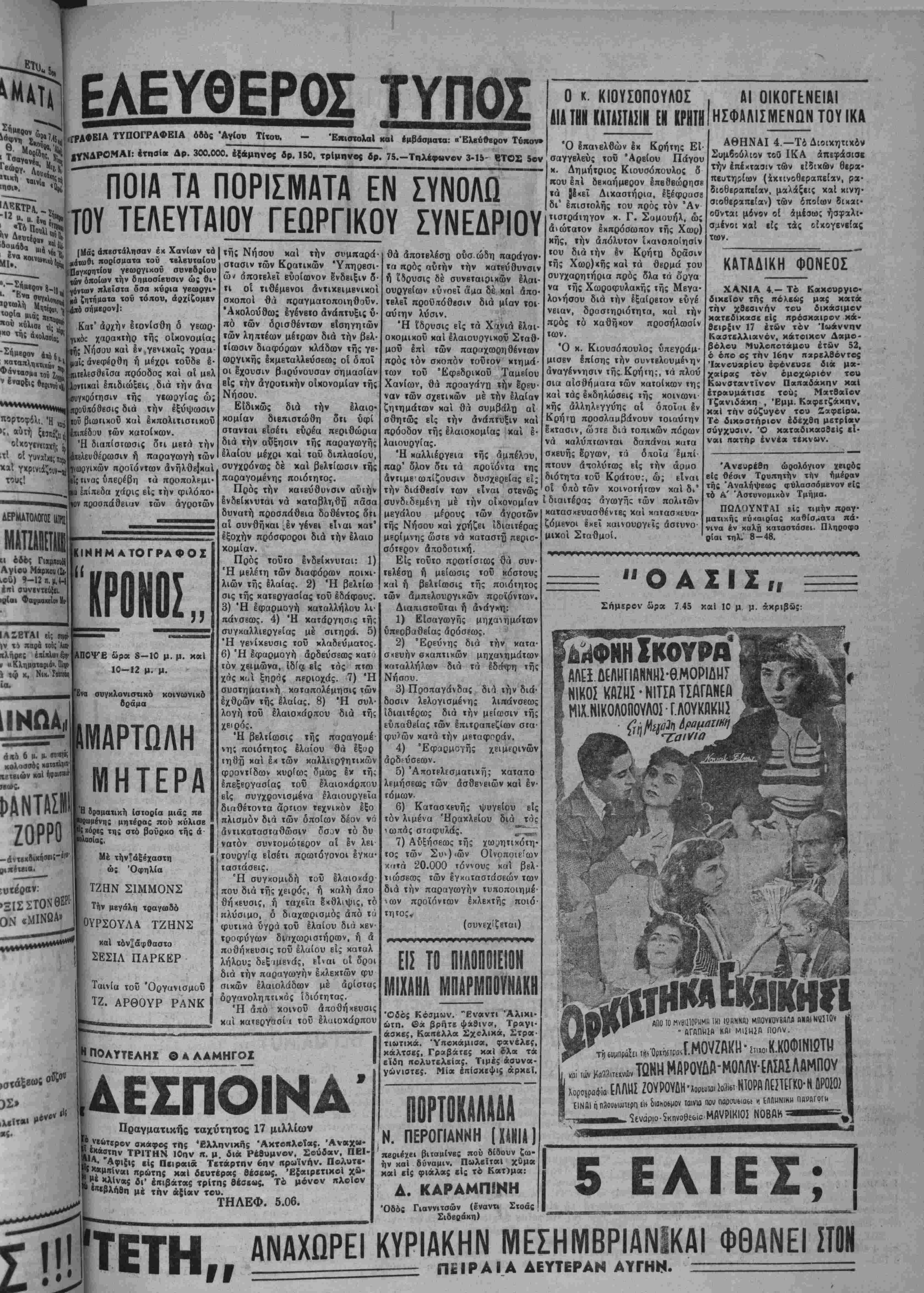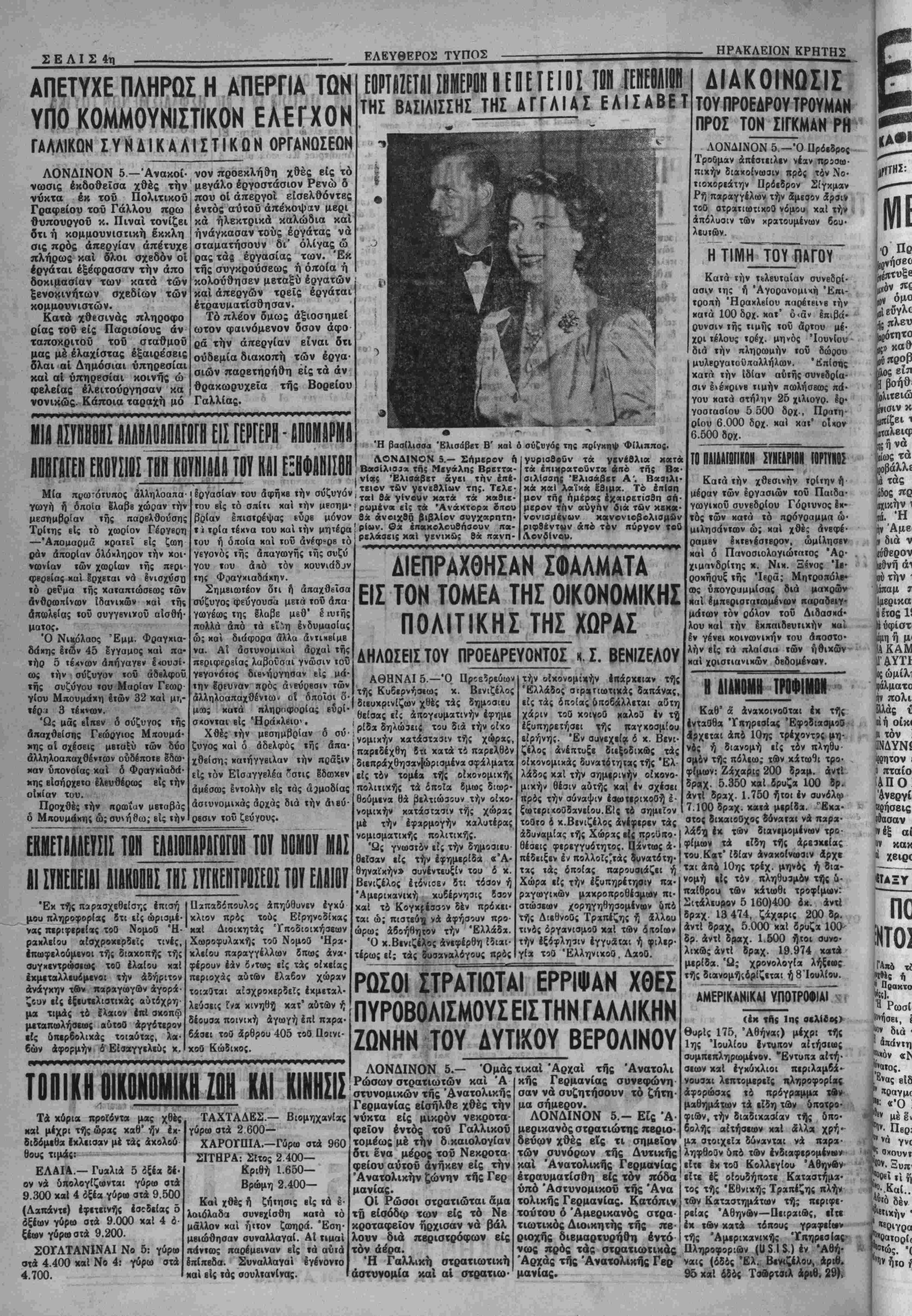 τήρ 5 ιέ«να>ν άπήγαγεν έ<ουαί· ως (ήν σύζυγον τοΰ άδβλφοϋ τής συζύγου ι ου Μαρίαν Γεωρ γίου Μπουμάκη έιών 32 καί μτ,- ιέρ ι 3 τέκνον. Ώς μας είπεν ό ούζυγσς της δκαχθβίσης Γεώργιος Μΐτουμά· "τις αί σχέσεις μβταΕύ των δύο δλληλοαπαχθέντων ουδέποτε έδω¬ καν ύπονοίας καί ό Φραγκιαδά¬ κης είσήρχβτο ελευθέριος είς την οίκίαν τού. Προχθές την πρωΐαν μεταβάς ό Μιθυμάκης ώ; συνήθω; είς «ήν εργασίαν τού αφήκε την σύζυγον, ^ τού είς το σπίτι και «ήν μεσημ- < ρΜμίνοι βϊς τ* Άνάκτορ» βιτβυ βρίαν επιστρέψας εύρε μόνον Θά ανοιχθή βιβλίον συγχαρητη τ ι τρία τέκνα τού καί την μητέρα! ΡίΜΥ· ©* ϊκ«κολου8πσουν κα- τού ή δποία καί (ου άνίφ,ρβ τό ρ'λ"3"*χα' ν«ν.*&ς 8« "»νη· Ή βασίλισσα Έλισάβετ Β' καί ό σύζυγός της πρίγκηψ Φίλιππος. ΛΟΝΔΙΝΟΝ 5.— Σήμερον π γυρισθοθν τα νενέθλια κατά Βασίλιαΐχ της Μινάλης Βρίττα- τα έηικρατοΰντκ άιτό της Βα νίαί Έλιοάβϊτ άγβι την επί- σιλίασης Έλιαάβετ Α'. Βααιλι κά καί λα'ίχά Εθιμα. Το έπΐοη μόν τή( ημέρας έχαιρετισθη αή μερον την αϋγήν διά των κβκ«· νονισμβνων κανβνιοβολισμών ριςρθέντ^ν άαο τβν πύργον τοθ ΛονδΙνοιι. μ«οημβθΙαν δ ου·; ^ άδελφός της 4«α·Ι »".-]„ ΑΘΗΝΑΙ 5 _Ό Πρ«ϊρεύιο* Βενιζέλος · ' £ β1Γβγ,ϋμ«τινή! έφημε ' ρΕΒ« ΒηλώΜΐβ τού διά (ήν οίκο ·;* ^ ' ΕΚΜΕΤίΛΑΕΤΣΙΣ ΤΙΙΙ ΕΑΒΙΟΠΑΡΑΓΟΓΟίί ΤΟΥ Γ1ΟΗΟΥ ΜΙΙ II ΣΥΙΕΙΕΙΙΙΔΙΙΚΟΙΗΙ ΤΗΣ ΜίΜΜΪ ΤΟΥ Ε11ΙΙΙΥ Έκ τί)ς πίρασχεθείστ,ς Ιπισή μου πληροφορίας δτι είς ωρισμέ¬ νας περιφερείας τοθ ΝομοΟ Η¬ ρακλείου αίσχροκερδιϊς τινές, ■πωφελούμενοι τής δΐακοπής τής ουγχεντρώοιως τοθ ελαίου καί ϊκμεταλλευόμενοι την άδήριτον ανάγκην τ®ν παραγωγών άγορά- ζιυν είς έξευτΐλιβτιχάς αύτδχρη- μα τιμάς τό ίλαιον ίπί σκοπψ μεταπωλήσετβς βύτοθ αργότερον είς υπερβολικαί τοιαύτας, λα¬ βών αφορμήν 6 Εισαγγελεύς χ. γεγονός τής άπαγωγής τής συζύ γου (ου άκό τόν κουνιάδϋν της Φ^αγκιαδάκην. Σημειωτέον ότι ή άπαχθεάσα σύζυγος φεύγουσά μετά τοΰ άπα γωγέως της έλαβε μεθ' έ ιυιής πολλά ά πό (ά εΐ',η ένδυμαοίας ώ; καί διάφορα άλλα άνΐιχβίμε να. Αί αστυνομικαί αρχαί (ής περιφερείας λαβοΰσαι γνώσιν τοΰ γεγονότος διενήργησαν είς μά¬ την Ιρευναν πρός ανεύρεσιν των άλληλοαπαχθέντω» ο! δποιοι ό- μαι; κατά πληροφορίας εύρί* ονιαι είς Ήράχ Χθές την μεσημβρίαν δ ζυγος καί δ χθείση; κατήγγβιλαν την πραςιν ■ δ,,πράχθησανΐώριαμένα αφαλματα ίς τόν Είσοιγγβλέα "στις Ιδωκβν είς τον τομέα τής οίχονομιχής 'πολιτιχής τα όποΐα βμως διωρ· θούμενα θά βελχιώσουν την οικο¬ νομικήν κατάστασιν τής χώρας μέ την εφαρμογήν καλυτέρα; νομισματικής πολιτιχής. Ώς γνωστόν είς την δημοσιευ θεΐσαν είς την εφημερίδα «Α¬ θηναϊκήν» συνέντευξιν τού ό χ. Βενιζέλος ετόνισε/ δτι τόσον ή Άμερικανιχή κυβέρνησις δσον και τό Κογχεέσσ^ν δέν πρόχει· ται ώ; πισχεύη νά άφήσουν προ- ώρω; άδοήθητον την Ελλάδι. Ό χ.Βενιζέλος άνεφέρθη ιδιαι¬ τέρως εί; τάς δυσαναλόγους πρός ΔΙΕΠΡΑΧΘΗΣΑΝ ΣΦΑΑΜΑΤΑ ΕΙΣ ΤΟΝ ΤΟΜΕΑ ΤΗΣ ΟΙΚΟΝΟΜΙΚΗΣ ΠΟΑΙΤΙΚΗΣ ΤΗΣ ΧΩΡΑΣ ΔΗΛΟΙΕΙΙ ΤΟΥ ΠΡΟΕΑΡΕΥΟΗΤΟΣ κ. Σ. ΒΕΝΙΖΕΛΟΥ παρεδέχθη δτι χατά τό παρελθόν άμέσως εντολήν είς (άς αρμοδίας αστυνομικάς αρχάς διά (ήν ανεύ¬ ρεσιν (ου ζεύγους. ι Ιΐαπαδόπουλος απηύθυνεν έγκύ χλιον πρός τού; Είρηνοδίκας καί Διοιχητά; Ύποδιοικήσεων Χωροφυλακή; τοθ ΝομοΟ Ηρα¬ κλείου παραγγέλλων δπως άνα· φίρουν εάν όΊ>τως είς τάς οίχείας