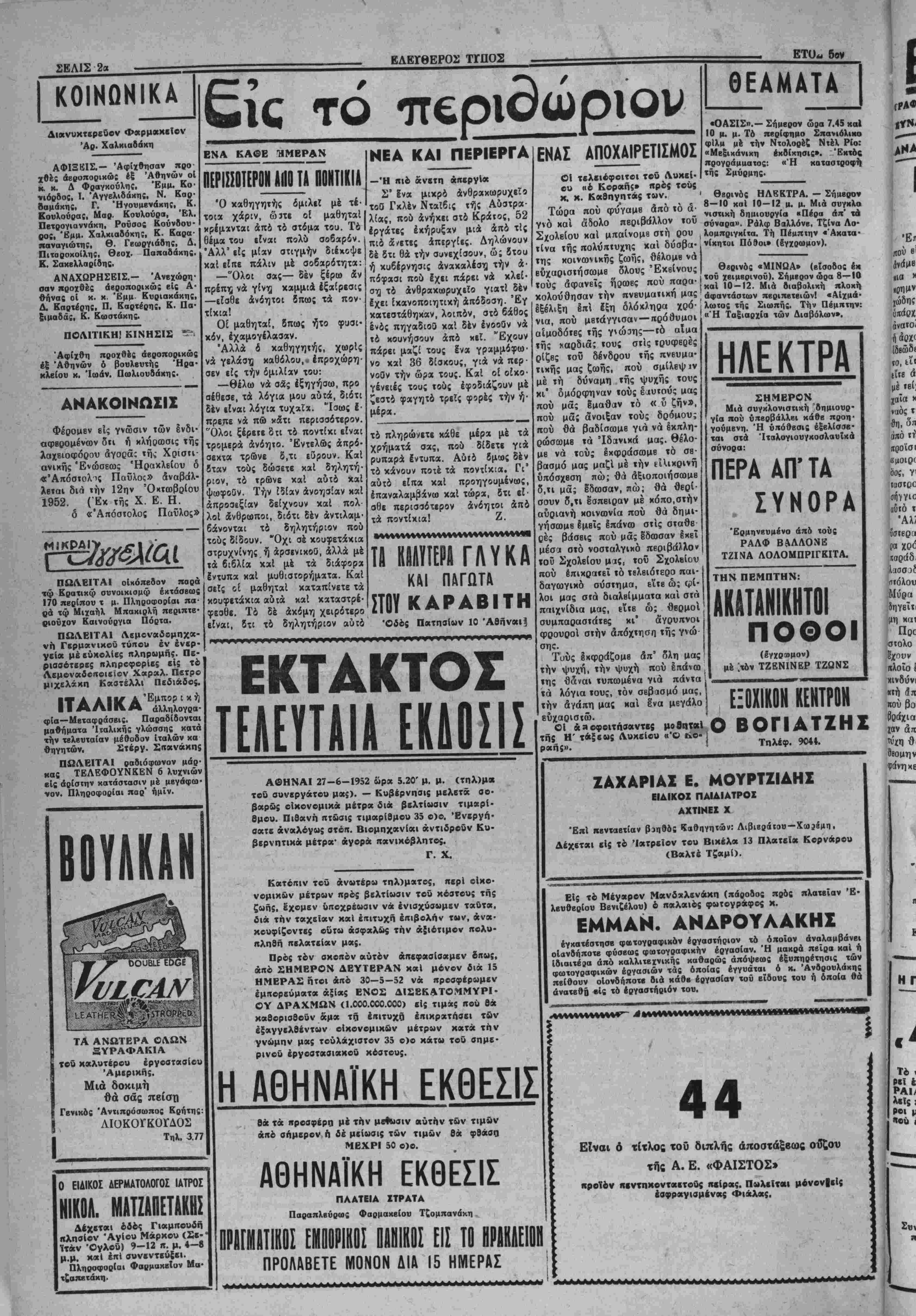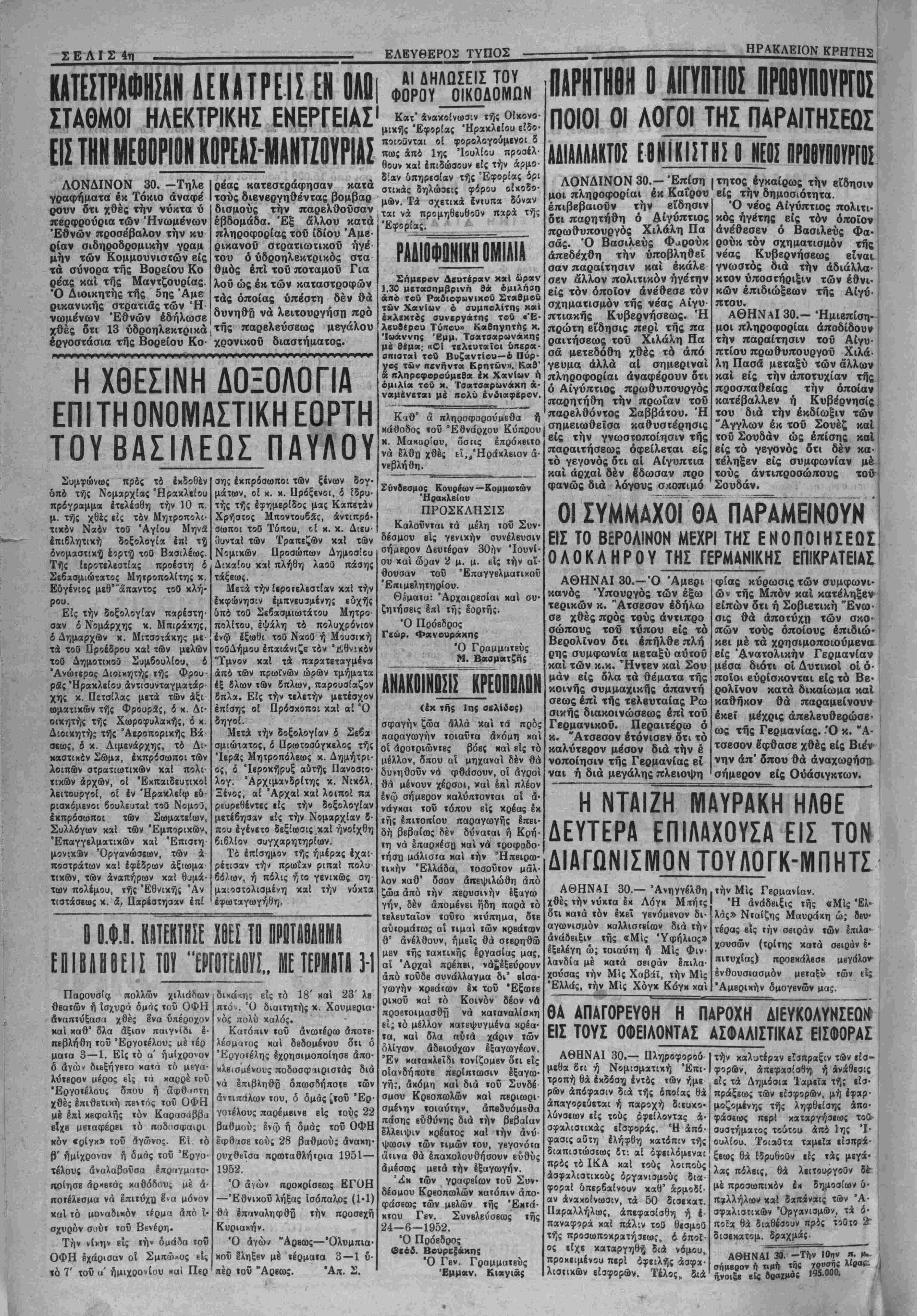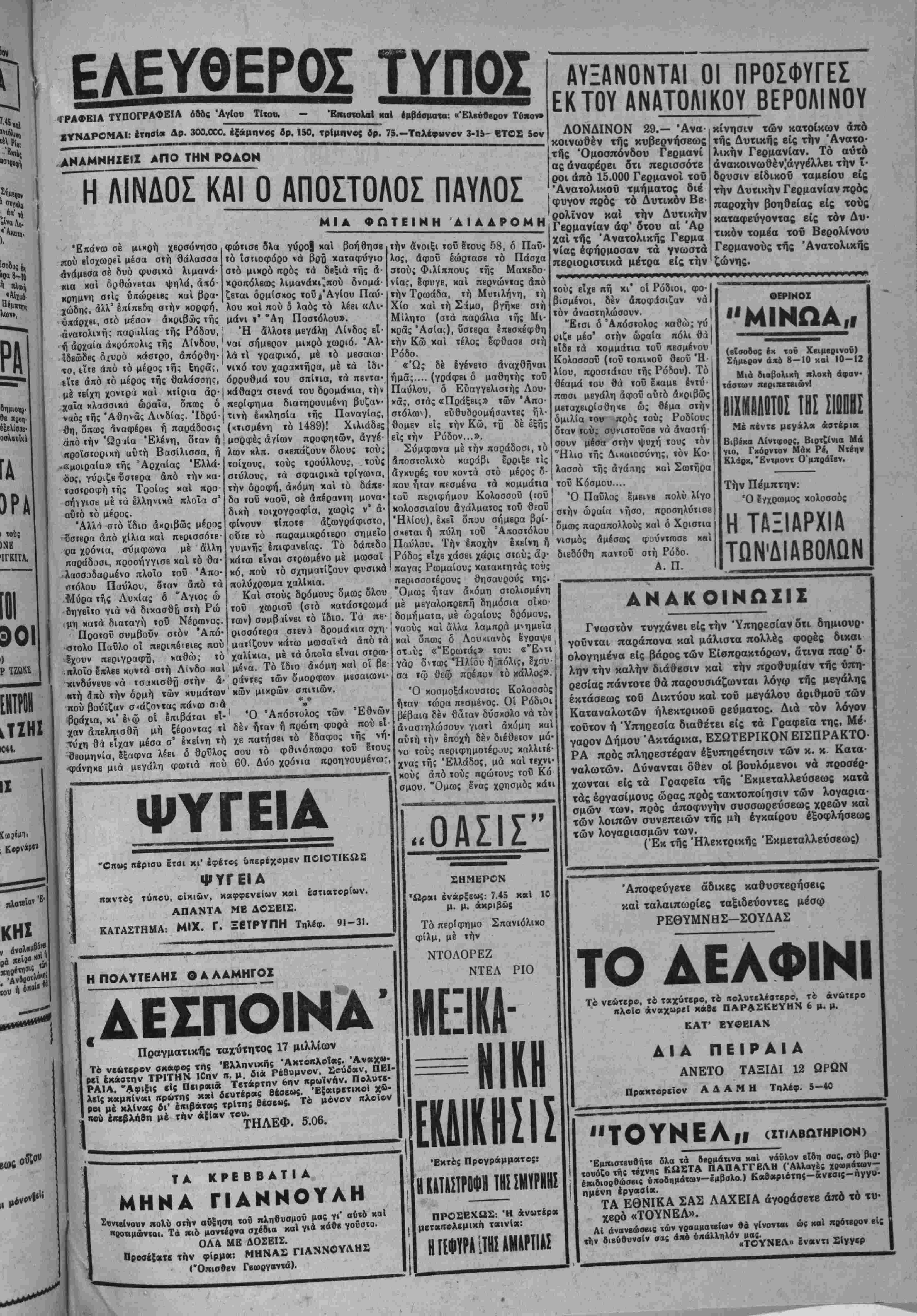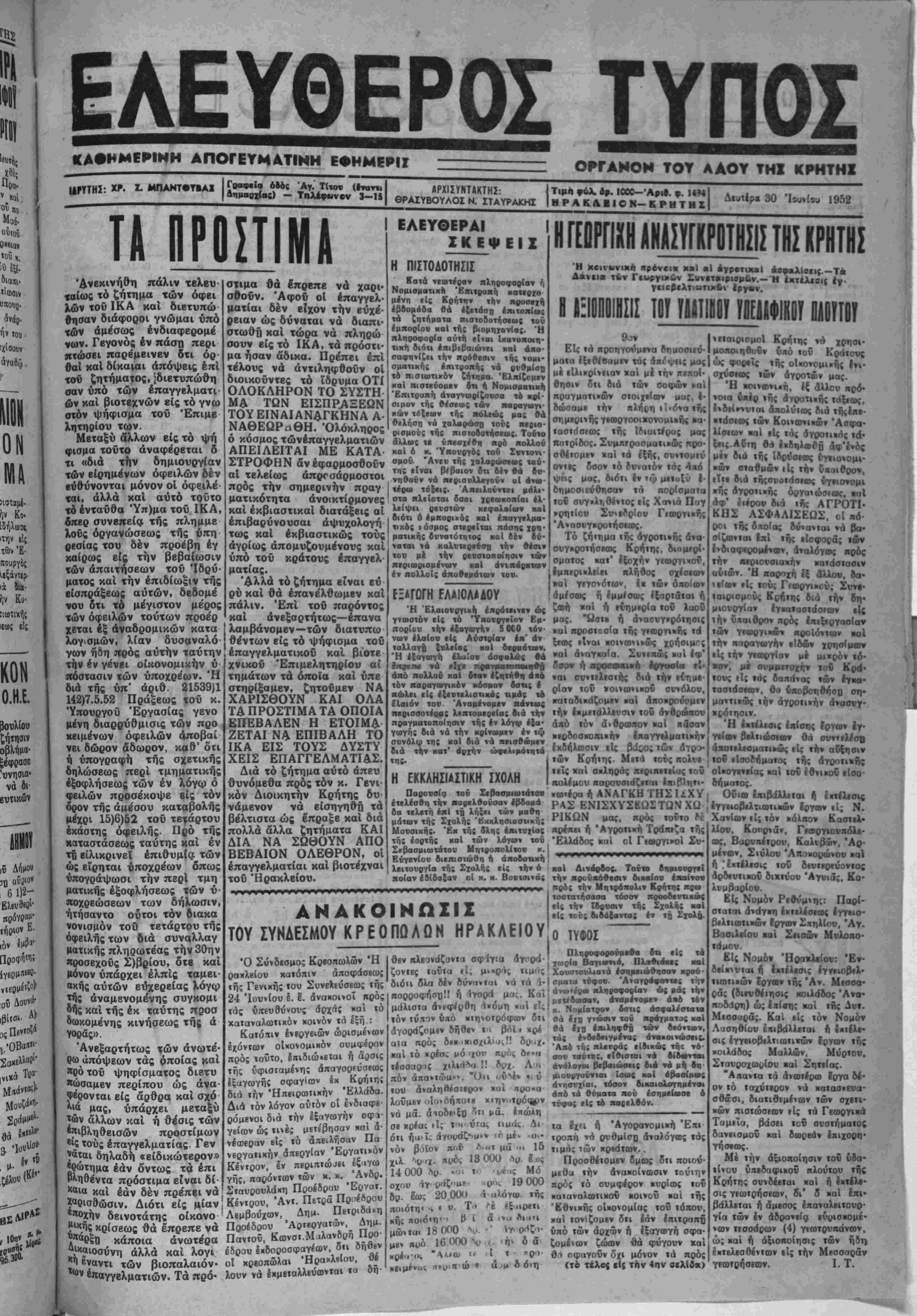 πεβλήθη τοΰ Έργοτέλους μέ <έα ματα 3—1. Είς τό α' ήΊιίχρονον δ αγών δι&ξήγβτο χαιά τό μέγα- λύτβοον μέρος είς (α «αρρέ τού "Εργοιέλους δπου ή άφθ<ι"τη χθές έπιθβτική πβντός τού ΟΦΗ μέ επι κεφαλής τόν Καρασάββα βϊχβ μβταφέρει τό ποδησφαιρι «όν «ρίγκ» τοΰ αγώνος. Εί τό β' ήμΐχβονον ή ομάς τοΰ Έργο- τέλους άναλαβοΰσα Ιπραγμ'ΐτο- ποίησβ άρ«β«άς κίΐθόδου; μέ ά- ποΐέλεσμα νά Ιπιτύχϋ Ινα μόνον Χαί τό μοναδικόν τέρμα άπό ι¬ σχυρόν σούτ τοΰ Ββνέρη. Την νίκην είς την δμάδα τοΰ ΟΦΗ έχάρισαν οί Σμπώ«ος είς ΐό Τ τοΰ (»' ήμιχοονίου «αί Περ δι «ά-.ής είς τό 18' καί 23' λβ πτόν. Ό διαιτητής κ. Χουμερια- νό; πολύ καλός. Κατόπιν τοΰ ανωτέρω άποτβ- λέσμητος καί δβδομένου δτι ό 'Εργοτέλης εχρησιμοποιήθη άπο· κλβισμένους ποδοσφ ΐιριστάς διά νά επιβληθή δπωσβήποτ,ε των άντιπάλων τού, δ ομάς ^τοΰ Έρ¬ γοτέλους παρέμεινε είς τούς 22 βαθμυύς Ινφ ή δμάς τοΰ ΟΦΗ έφθασε τούς 28 βαθμούς άναχη· ρυχθεΐσα προοταθλήιρια 1951— 1952. Ό άών προκοίσεως ΕΓΟΗ —Έθνικοΰ λήξας Ισόπαλος (1-1) θά επαναληφθή την προσβχή Κυριακήν. Ό αγών "Αρβως—Όλυμπια· κου δληξβν μέ τέρμαΐα 3—1 υ¬ πέρ τοϋ "Αρβως. 'Απ. Σ. ΑΙ ΔΗΛΩΣΕΙΣ ΤΟΥ ΦΟΡΟΥ ΟΙΚΟΔΟΜΩΝ Κατ' ανακοίνωσιν τί)ς Οικονο¬ μικάς 'Εφορίας Ηρακλείου είδο· ποιοΰνται οί φορολογούμενοι δ πως άπδ 1ης Ιουλίου προσέλ¬ θουν χαί έπιδώσουν είς την &ρίθ- δίαν δπηρεσίαν τής 'Εφορίας δρι στικάς δηλώσεις φόρου οίκοδο- μών. Τβ αχετιχά ένιυκα δύναν ται νά προμηθευθοθν παρα τής Έφορίας. ΡΑΑΙ0Φ0Η1ΚΗ 0Μ1ΑΙΑ Σήμερον Δευτέραν καί ώραν 1.30 μετασημβρινή θά έμιλήση άηβ τοϋ Ραδιοφυνικοϋ ΣταθμοΟ των Χανίων ό συμπολίτας καί έχλβχτος συνβργάτης τού «Έ- λβυβίρου Τύτοι») Καθηγητπς χ. Ιωάννης Έμμ. Τσατσαρωναχης μέ Θ4μα; «Οί τελευταΐοι όίτερα- βπισταΐ τοθ Βυζαντίου—έ Πυρ¬ γος των πβνήντα Κρητών». Καθ" & ηληροφορουμεθΜ έκ Χανίων ή όμιλία τού χ. Τσατσαρωνάκη ά- ναμένΐται μέ πολΰ ένίιαφίρβν. Κ'ΐθ' ά πληροφορούμεθα ή κάθοδος τοΰ Έθνάρχου Κύπρου κ. Μακαρίου, όστις επρόκειτο νά έλθη χθές ιΐ,/Ηράχλβιαν α¬ νεβλήθη. Σύνδεσμο; Κουρέων—Κομμωτών Ηρακλείου ΠΡΟΣΚΛΗΣΙΣ Καλοϋνΐαι τα μέλη τοΰ Συν δέσμου είς γενικήν συνέλευσιν σήμερον Δευτέραν 30ήν Ίουνί- ου χαί ώοαν 2 μ. μ. είς την αί¬ θουσαν τοΰ Επαγγελματικήν Έπιμβλητηρίου. Θ^μαια: Αρχαιρεσίαι καί ου- ζηιήσεις επί τή; εορτής. Ό Πρόεδρος Γεώρ. Φανουράκης Ό Γραμματεύς Μ. Βασμοττζήί αηα1ν¥σ1ρεοηολον (έχ της 1ης οελΐδος) σφαγήν ζώα άλλά καί τα πρός παραγωγήν τοιαΰτα άνόμη καί οί άροΐριώντβς βόες καί εις τό μέλλον, δπου αί μηχαναί δέν θά δυνηθούν νά φθάσουν, οί αγροί θά μένουν χέρσοι, ναί έηί πλέον ένφ σήμερον χαλύ/ττονΐαι αί ά· νάγχαι τοΰ τόπου είς κ ρέας έκ τή; επιτοπίου παραγωγής έπει- δή βεβηίοος δέν δύναται ή Κρη· τη νά επαρκέσο καί νά τροφσδο- τήσχι μάλιστα καί την Ήπειρον τικήν Έλλάδα, τοσούτον μάλ¬ λον καθ* δσον άπεψιλώθη άπό ζώα άπό την πβρυσινήν έξαγω γήν, δέν άπομένει ήδη παρά τό τελευταίον τουτο χτύπημα, δτβ αυτομάτως αί τιμαί των κρΒάτοον θ' άνέλθουν, ημείς θά στερηθώ μέν τής τακτιχής εργασίας μας, αί Αρχαί πρέπβι, νά^έξεύρουν άπό τούδε συνάλλαγμα δι' βίσα- γωγήν χρεάτων έχ τού 'Εξοοτε ρικοΰ καί τό Κοινόν δέον νά προβτοιμασθή νά καταναλίσκη ει; τό μέλλον χατΕψυγμένα κρβα· τα, καί δλα αύτά χάριν των ολίγων άδβιοΰχων έξαγωγέων. Έν χατακλεϊ^ι τονίζομβν ότι είς οϊανδήΐτοτε περίπτωσιν έξαγω- γης, άκόμη καί διά τοΰ Συνδέ σμου Κρεοπωλών καί περιωρι¬ σμένην τοιαύτην, άπβδυόμβθα πάσης ευθυνής διά την βεβαίαν έλλειψιν κρέατος χαί την ανύ¬ ψωσιν των τιμών τού, γβγονόια άτινα θά έπαχ