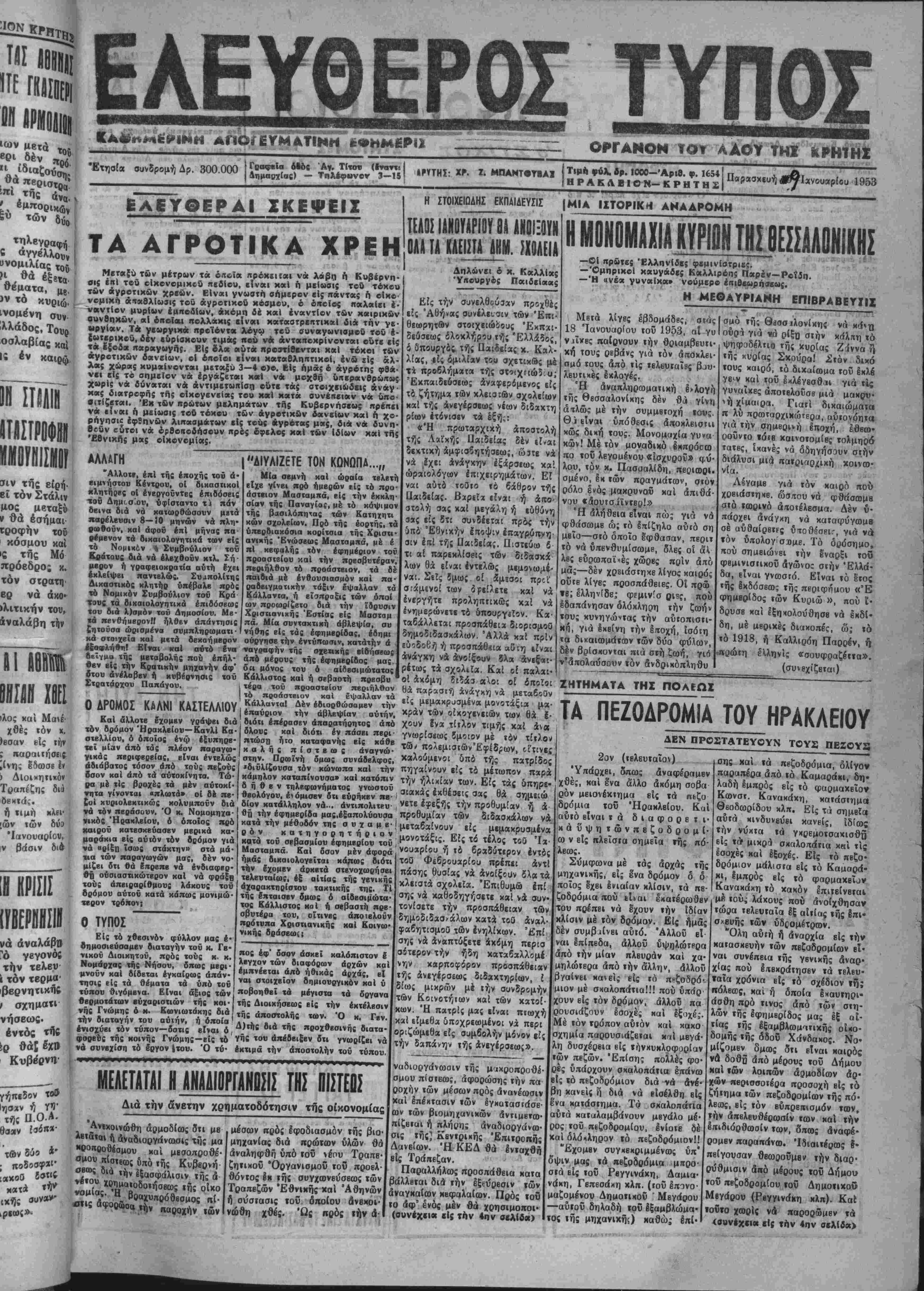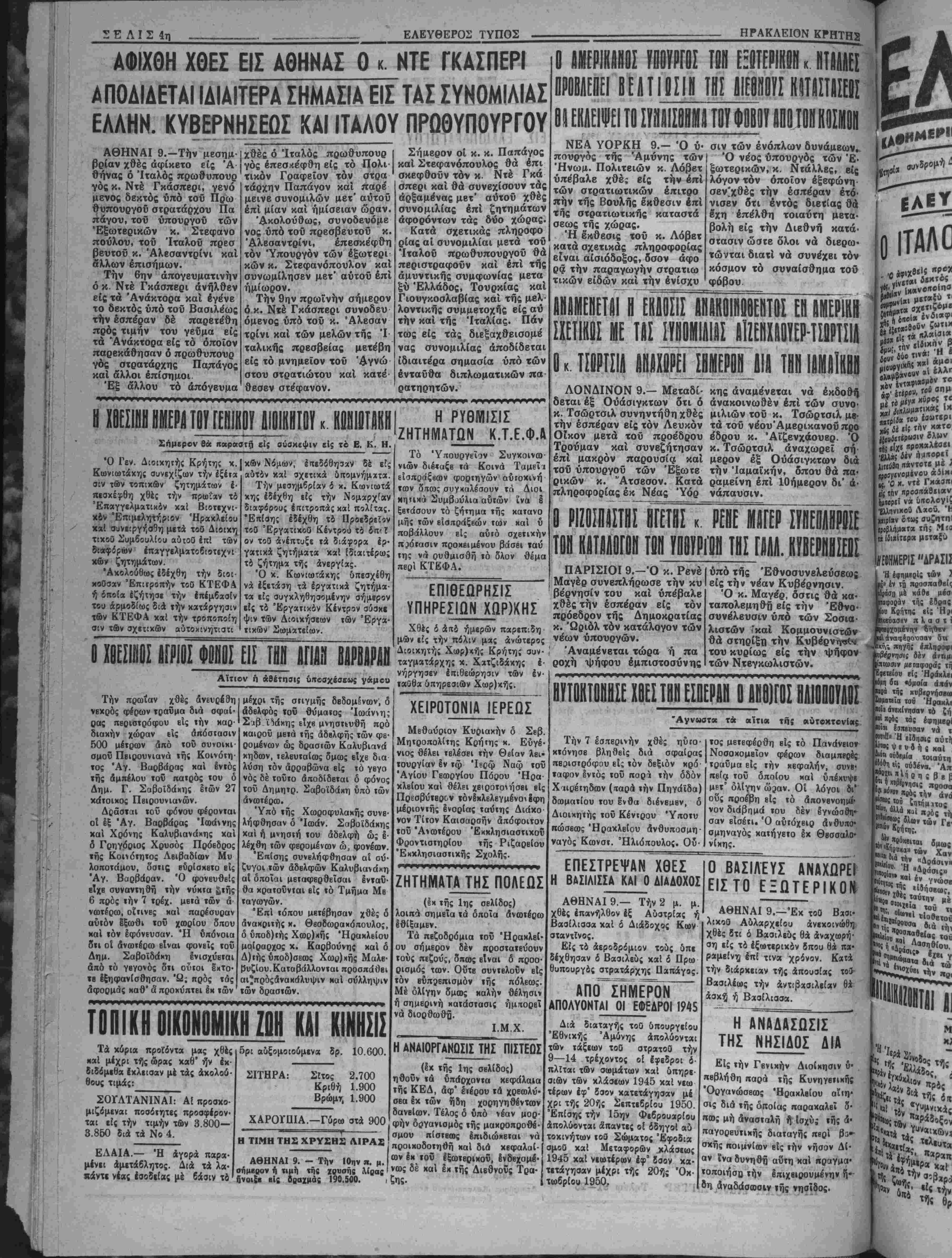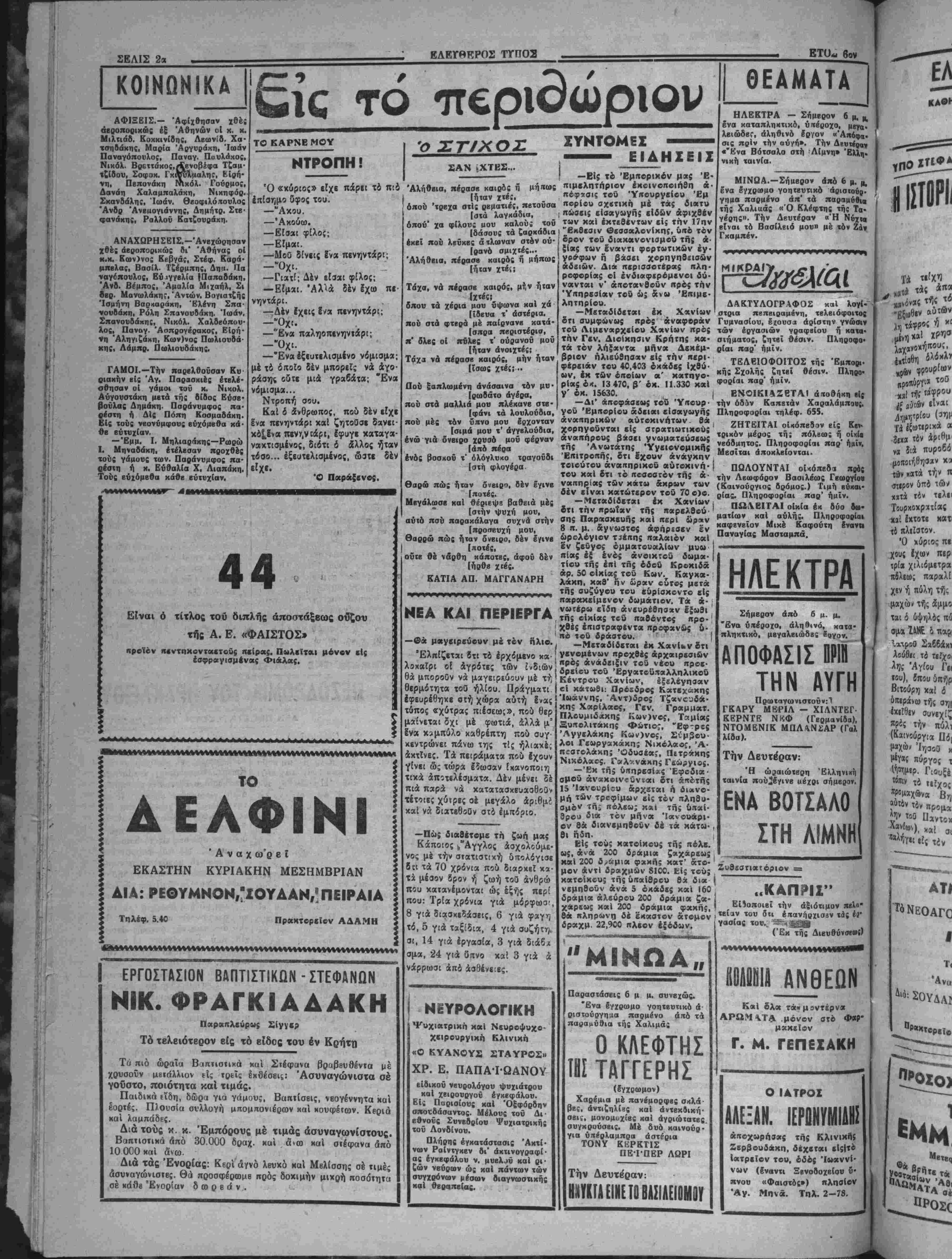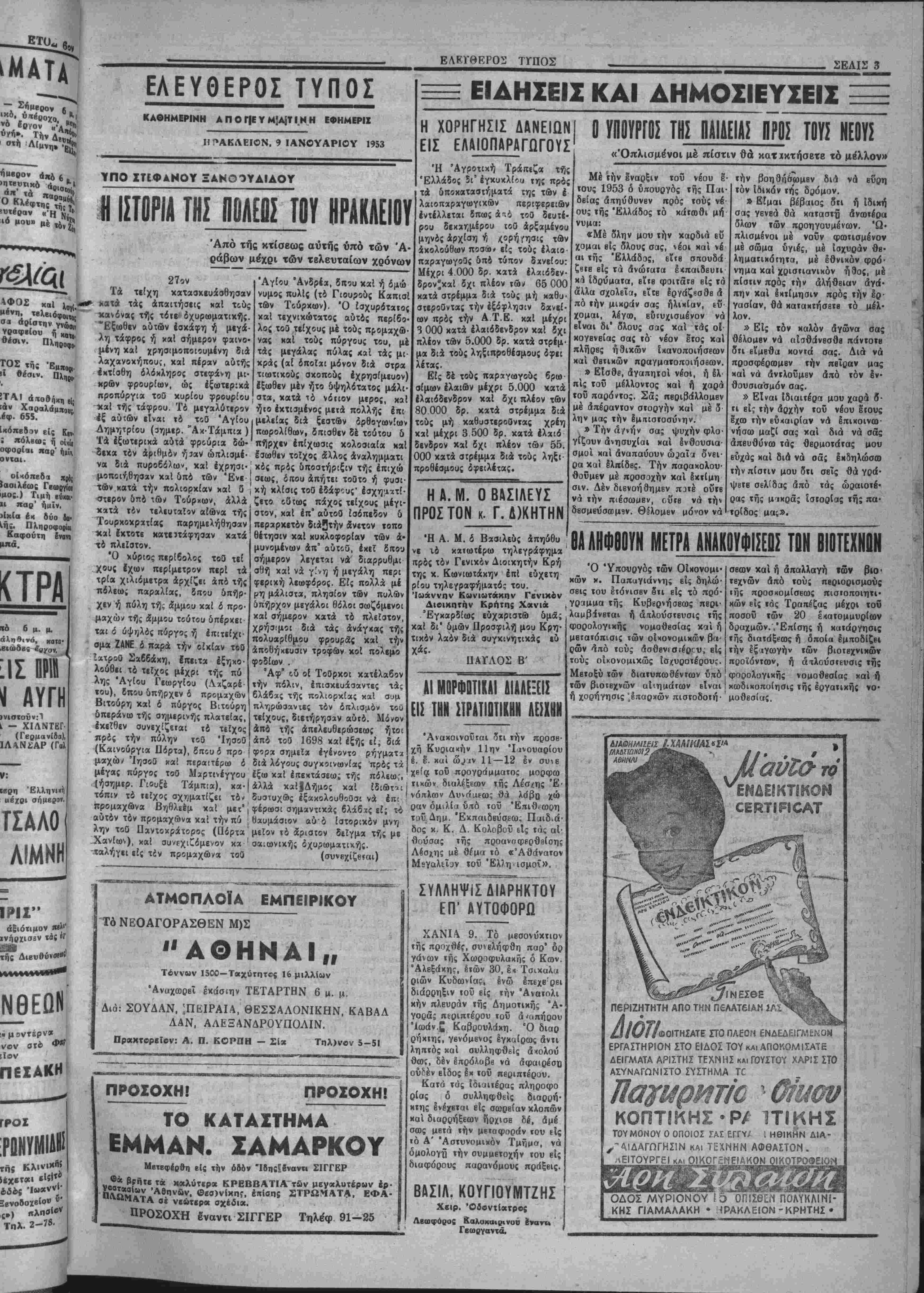 <«ίά τής χνββονήσβΜ «ιματίϊα τού Ήρακλι ιοϊα άνεχίνησαν τό ζή Ι Μ: τάς έφημβρΙ »ι»ι ?5πβ«σαν νο τ •«Ι!» Ή ίίβηοις αυτή »'»5 Ψ β υ ί ή ς «αί * »»«μίι« τοιαύτη Λ'. οΰϊενβ. Άπ «ΒΡΐρνησις προσα ι-ον π6 ί Ο ΒΑΣΙΛΕΥΣ ΑΝΑΧΩΡΕΙ ΕΙΣΤΟ ΕΞΩΤΕΡΙΚΟΜ ΑΘΗΝΑΙ 9.—Έκ «Ο Βασι- λιχοθ Ααλαρχείου ανεκοινώθη χθές 8τι ό Βαοι/«6ς θά αναχωρή¬ ση είς τδ εξωτερικόν δπου θα πα¬ ραμείνη επί τίνα χρόνον. Κατά την διάρκειαν τής άπουοίαί το5 Βασιλέως την αντιβασιλΐΕαν θ* άσκ^) ή Βχοίλιασα. Η ΑΝΑΔΑΣΩΣΙΣ ΤΗΣ ΝΗΣΙΑΟΣ ΔΙΑ Είς την Γενικήν Διοίκησιν δ· «ββλήθη παρά ΐτΐς Κυνηγβτικης "Οργανώσεως ΉοακλβΙου αϊΐι»· σις διά τής οποίας παραχαλβϊ δ· ηης μή άνασταλή ή Ισχύ; ΐτϊς δ· ιαγορευτικής διαταγίίς πβρί 03·- σκής ποιμνίων βίς την νήσον Λί¬ αν ίνα δυνηθΉ αυτή καΐ «ραγμα· τοιήσυ την Βπιχβιρουμένην βη ΛναδασοΒσιν «τίς ντ·σΐδος. ^ΛΠ6^ τΐ ή ,<λ- Λα("ιθίου. Μ