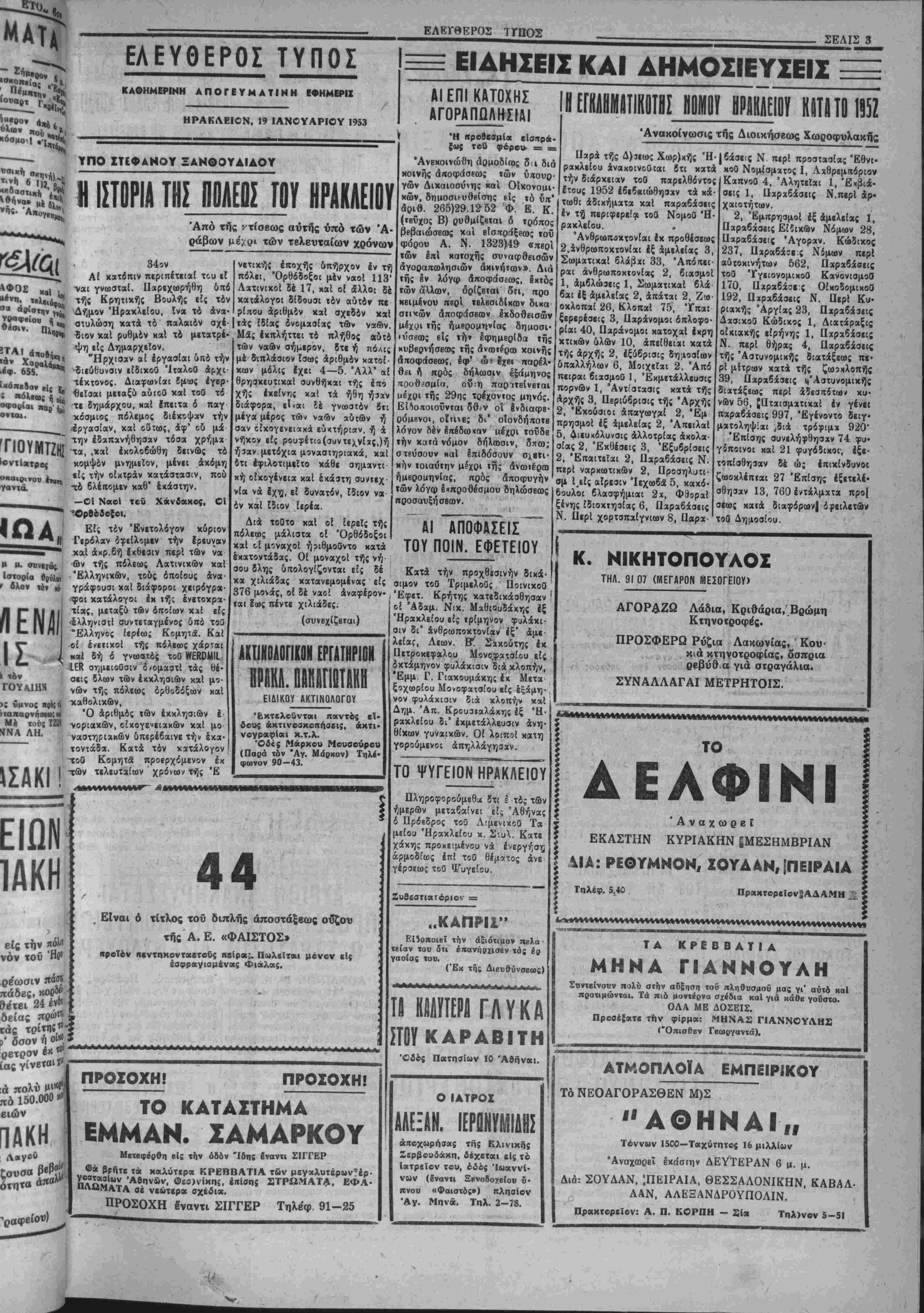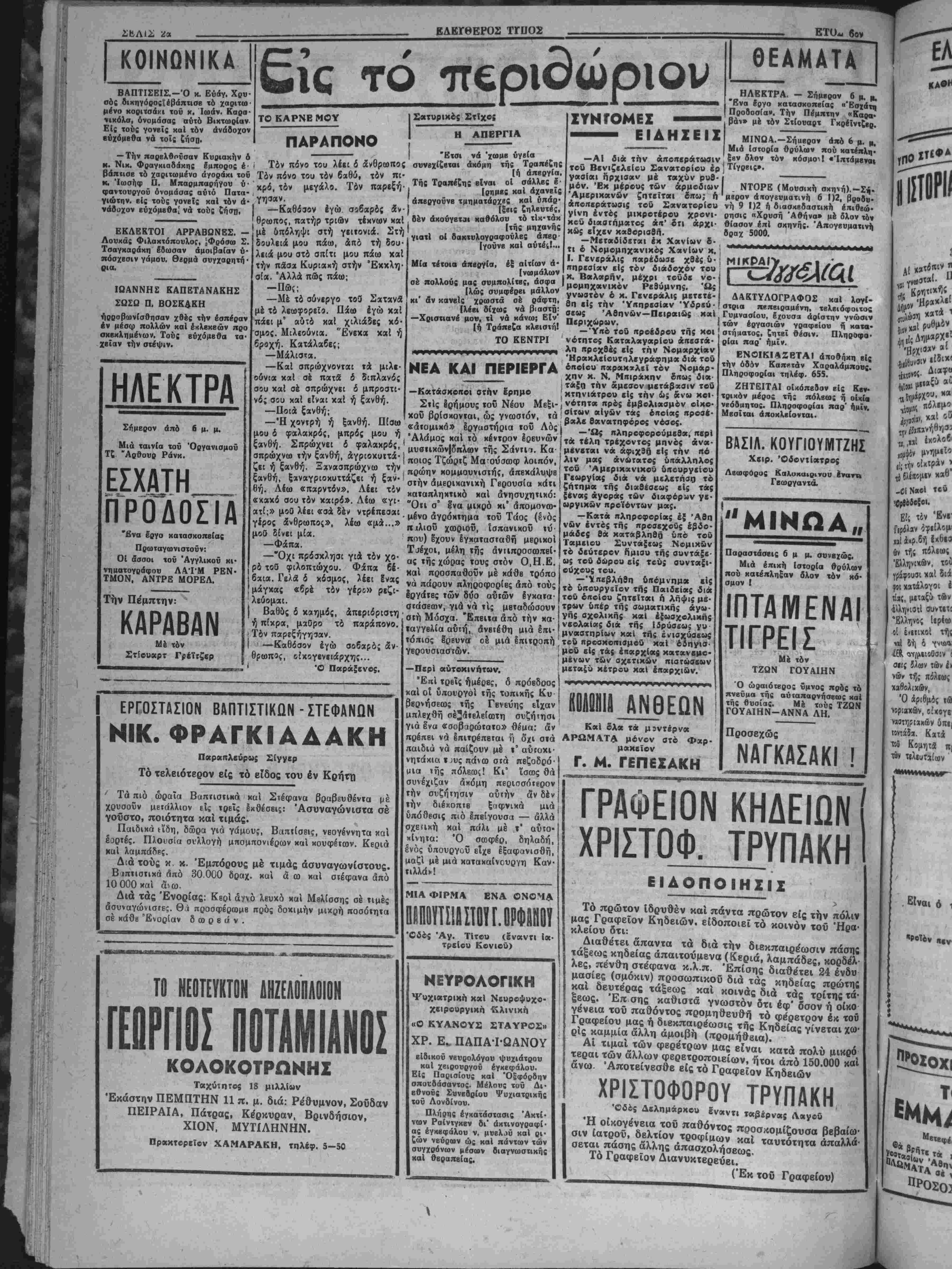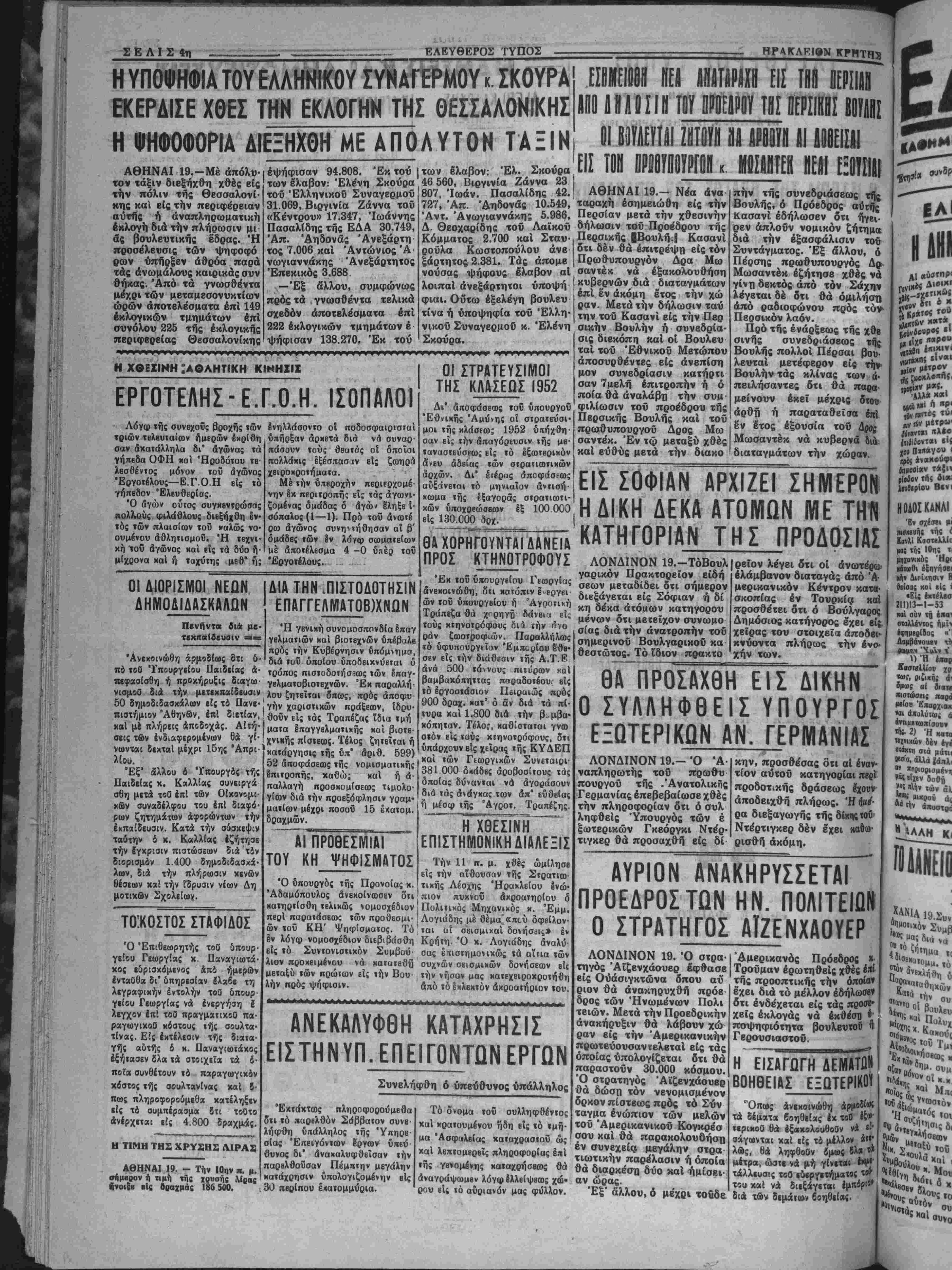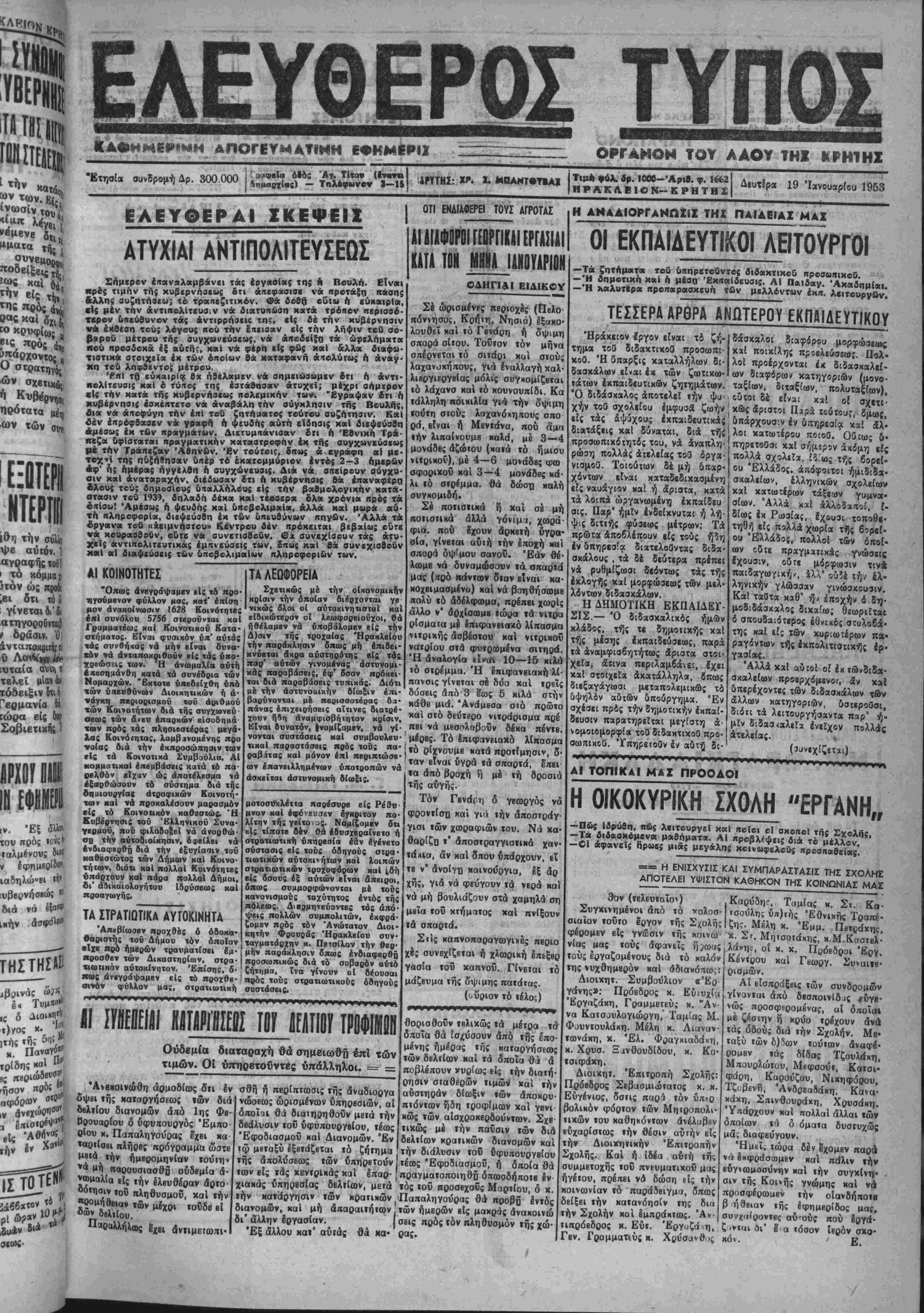 αγραφής %<ή • χό χομμαϊ 5τόν ώς ηβοϋ ;βι δτι τόβ . γίνεταιδι'δι ατηγοροΰνκΐι} * δράσιν. Ό ίυταία τέλει μ.ίαν άχι ΐόδειξιν δτιή Γερμανία Μ ίώρα είς οο|) Σοβιετιχής 1 ΙΠΙΤ ,ν. Έξ χου πρός ΐαλμένου; ιαδηλώνΒΐ β διά νά Ιξα» ικήν ΤΗΣΤΗΣΑΣ! Κοινάς &*' Ι< ΤυμΛβ* ,ς ό £λιοι«_0·* τ}γος κ· ΊίΐΚ τιηιι, — ., ,τής τής &Πί" τρίδης «αί Π' Βς ΒΒριώβί·^ ,ήσον «ο« ~ αφορών *0* : Ε83 ΕΛΕΥΘΕΡΟΣ ΤΥΠΟΣ ΟΡΓΑΝΟΝ ΤΟΥ ΛΑΟΥ ΤΗΙ "ΕτησΕα συνδρομή Δρ. 300 000 1,7! «ΡΤΤΗΣ: ΧΡ. - ΜΡΑΝΤ·Τ·ΑΙ Τι»* ·άλ δρ. ΙΟΜ-Άριβ. φ. 1662 ΗΡΑΚΛΕΙΟΝ—ΚΡΗΤΗ2 Διυτίρα 19 Ίανουαρίου 1953 ΕΑΕΥΟΕΡΑΙ ΙΚΕΦΕΙΙ ΑΤΥΧΙΑΙ ΑΗΤΙΠΟΛΙΤΕΥΣΕΟΣ Σήμερον ίίταναλαμβάνει τάς εργασίας της «Ι Βουλή. Είναι «ιρβς τιμήν τής κυβερνήσεως δτι απεφάσισε: νά προτά(η πάσης Λλλης συζητήαεω; τ© τραπεζιτικήν, ©ά δοθή οΰια» ή «ΰκαΐρία, «Ις μέν την άντιιτολίτευα,ν νά· διατυπώση κατά τρόπον περισσό¬ τερον υπεύθυνον τάς άντιρρήσεις τη;, είς δέ την κυβέρνησιν ν* εκθέση τού; λβγους ηβΰ την Ιηϊΐσαν αίς την λήψιν τβθ σο· βαροθ μέτροο τής συγ^ωνίύσβως, νά άιτοδείξη τα ώρελήματα κου «ρβσδοχά έ{ αύτη;, καΐ νά φέρη ετΐς φ«5 **1 &λλ« διαφω τιστικά στοιχιΐα έκ των οποίων θχ καταφανή απολύτως Α άνάγ χπ τού ληςρθκντο; μέτρου. ΊΉ1 τή εύκαιρΐα θχ ηθέλαμεν να σημειώσωμβν ίτι η άντι πβλίτευσις καΐ ο τΰΐτος τη; εστάθησαν άτυχεί; μέχρι σήμερον «Ι; την κατά της κυβιρνήσΐω; πολεμικήν τω». "Εγραψαν ίτι ή κυβέρνησις έσκέκτβτο νά αναβάλη την σύγκλησιν τής Ββυλής, δια νά αποφύγη την επί τού ζοτήυατος τούτου συζήτησιν. Καΐ ίέν έπρβφθασβν νά γράφη ή ψευδής αύτη βΐδηαις καΐ διεψεύσθη αμεσω; έκ των πρανμάτων. Δΐϊτυμπάνισαν δτι ή 'Εθνική Τρα¬ πέζα υφίσταται πραγματικήν καταστροφήν έκ τής συγχωνϊύσβως μέ την Τράπεζαν Αθηνών. Έν τούτοις, δπως ά «γράφη α! μβ- τ©χ»τί της ηυξήθησαν υπέρ τό έκατομμύριον έντβς 2—3 ημερών βφ' ηί ημέρας ήγγέλθη ή συγχώνευσιν Λιμ νά σπείρουν σύνχυ- σιν καΐ αναταραχήν, διεδωσαν δτι 6 κυβέρνησις θά έπαναφέρη 2λους τού; δημοσίου; ΰχαλληλους εί; την βαβμολογικην καίτοι- οτασιν τού 1939, δηλαδη δέκα καΐ τέοσερα ©λ« χρόνια προ; τα βΓτίσω! 'Αμεσως η ψβυδης καΐ ΰπεβολιμαία, άλλά καΐ μωρα αύ¬ τη πλπροφορία, διεψβυβθη έκ των ΰπιυθύνων πηγών. Άλλά τα έργανα τβθ «χειμνηστου» Κέντρου δέν πρόκειται βεβαί&>; βυτε
