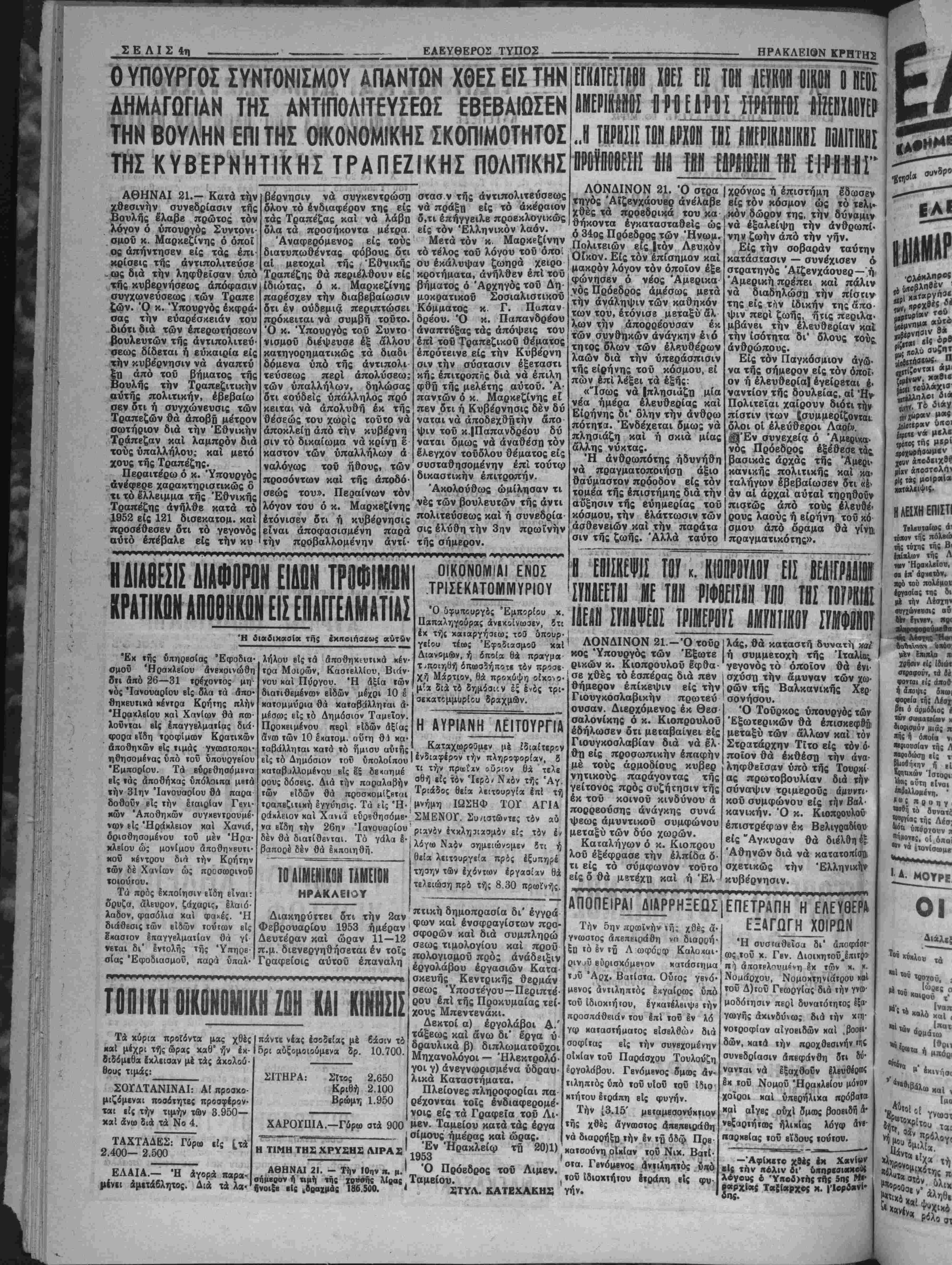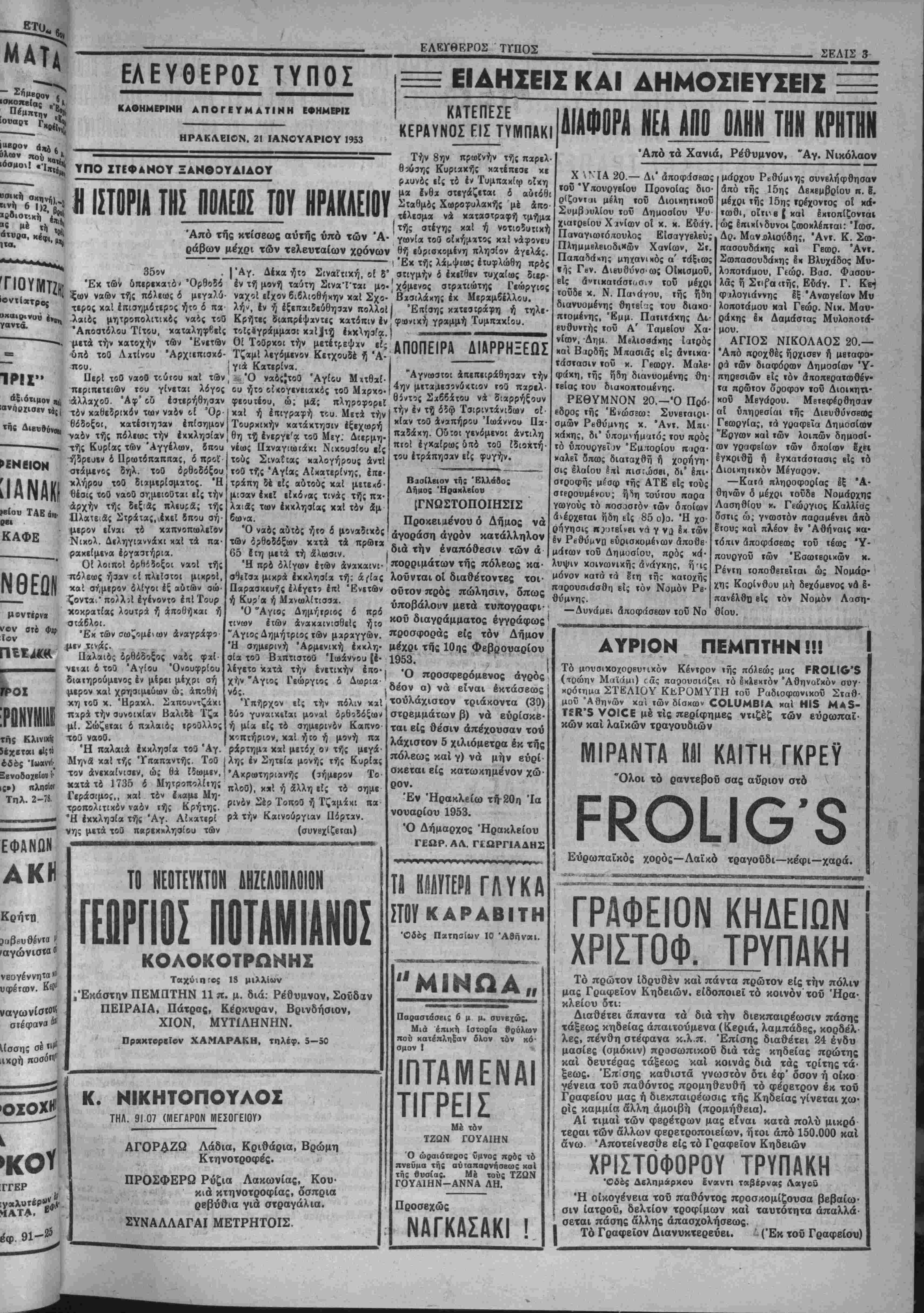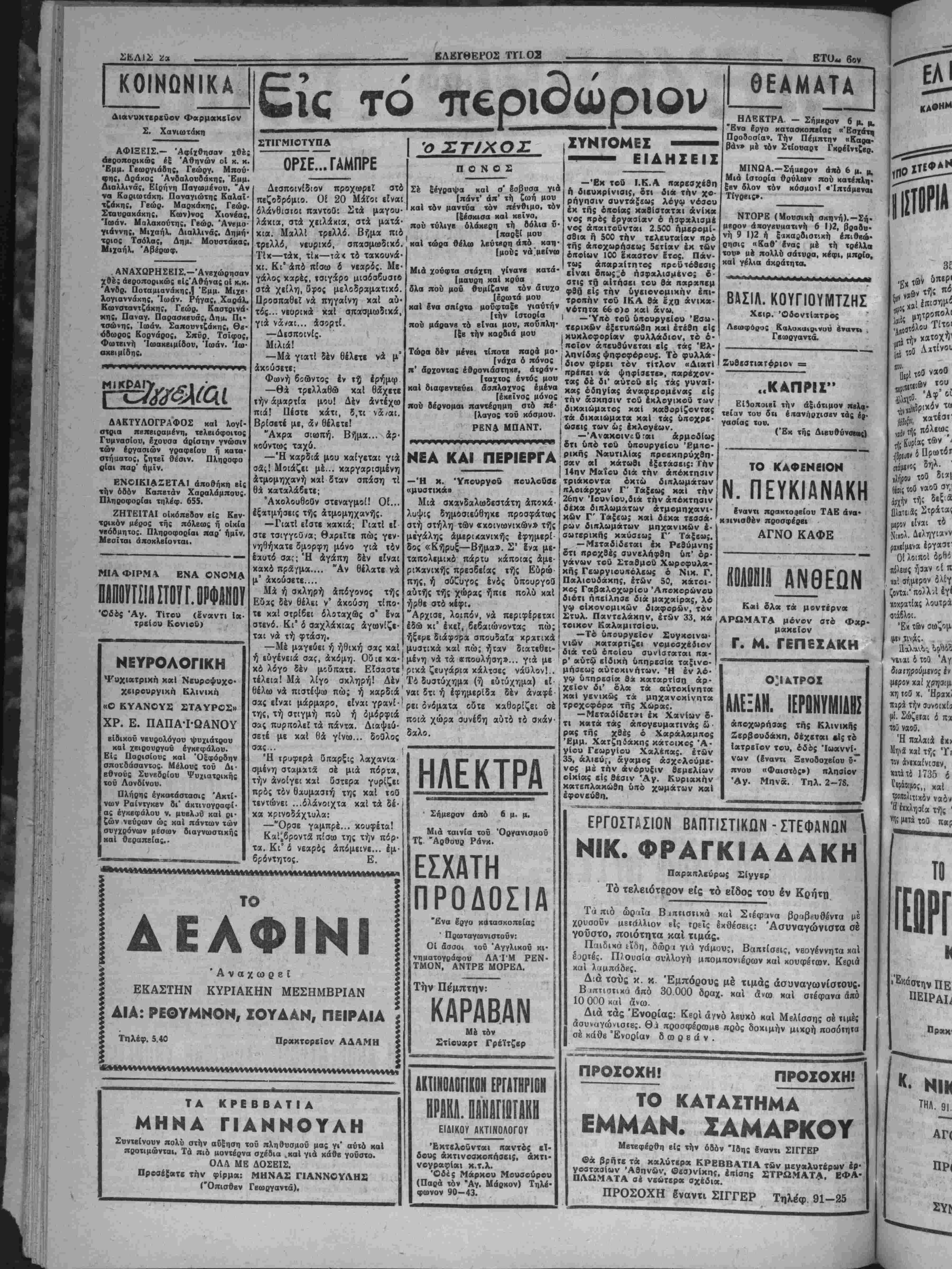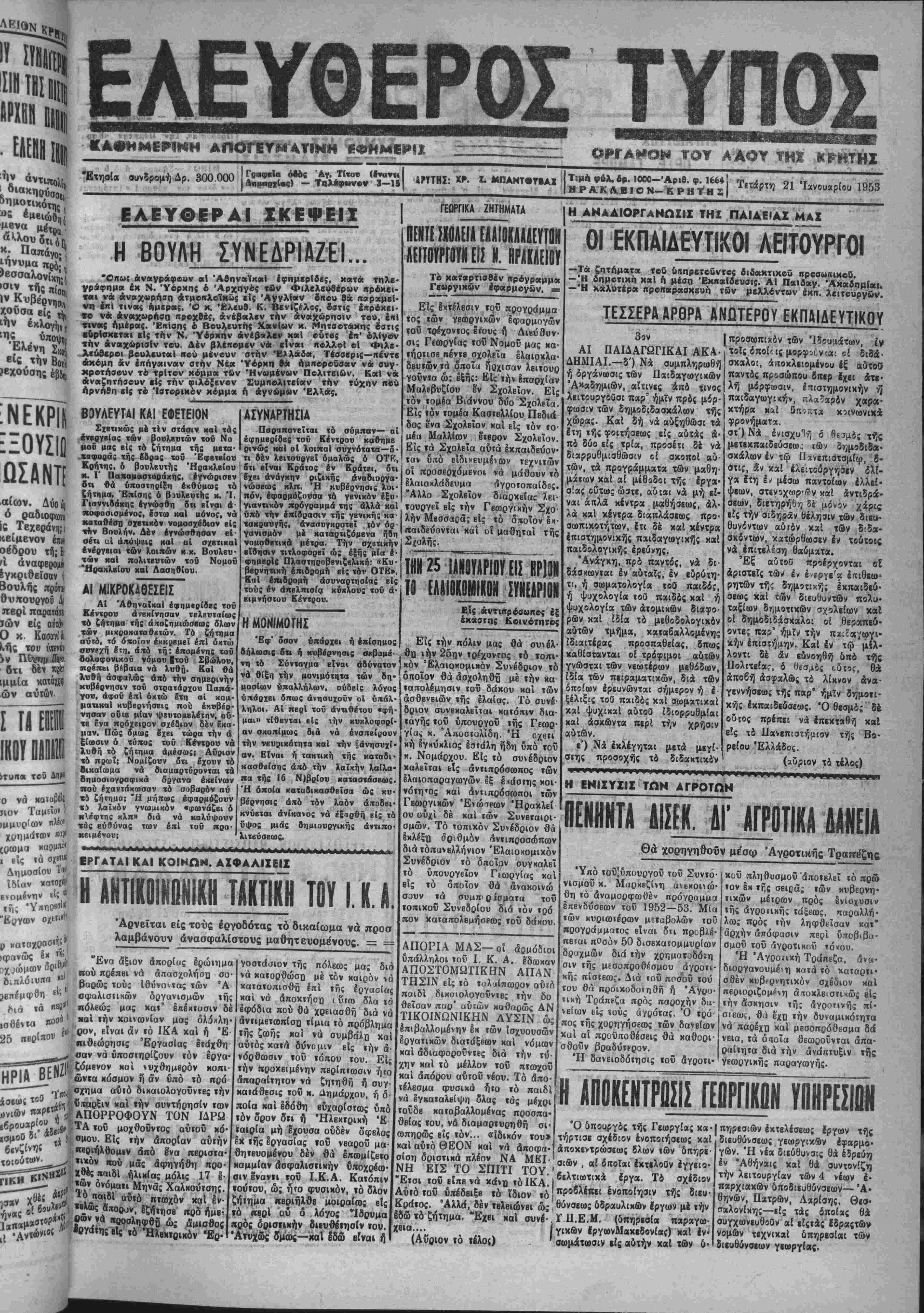 <αι ν« άνβιχΜρήοα άτμο«ιλοϊΧ«ς «Ις 'Αγνλίβτν ίι«β» θα παραμεί¬ νη επί τινοιΐ ημέρας. Ό κ. Έλευβ. Κ. Βενΐζβλβς, όστις επρόκει¬ το ν* αναχωρήση «Ρβχβέί, άνββαλεν την αναχώρησιν τού, έ<ι! τινάς ημ»ρ«ς. Έ«ίσης * Βουλευτάς Χ*νΙ«ν κ. Μητσοτάκης οίτις ■(.ρΐσκεται ιΐς την Ν. Υόρκην *νέβ»λ«ν χ«» βυτβς ί«· ολίγον την άναχώρισίν τού. Δέν βλέπομεν ν« «·ν*ι κολλοΐ οί Φιλβ- λεύβεροι βουλευτού «ου μίνβον στήν Ελλάδι», Τεσσβρις—ίΐεντί «χόμη &ν ί«ήγ<χιν«ν στήν Νέ» 'Υβρκη β* Λμ«βρβυσ«ν ν* συγ- κροτπσουν το τρίτον χόμμβτ τ&ν Ηνωμένον ΠολιτετΜν. Καί νικ «νβζητήσβυν «Ιί την φιλοϊενον -ομΛβλιτείοιν την τύχην «ου ηρνήθη «1, το Ιστορικόν χομμ« ή άγνύμνν ΒΟΥΛΕΥΤΑΙ ΚΑΙ ΕΦΕΤΕΙΟΝ Σχετικώς μέ ττν στάσιν καί τάς ίνβργβίας των βουλβυτών τοΰ Νο ου μας εί; τό ζήΐημα τής μβτα· ΓΕΟΡΓΙΚΑ ΖΗΤΗΜΑΤΑ ΑΣΥΝΛΡΤΗΣΙΑ Παραπονείται τό σύμπαν— αί έφημβρίδβς τοϋ Κέντρον καθημε ρινώς καί οί λοιπαί συχνότατα—5 ΠΕΝΤΕΣΧΟΑΕΙΑΕΑΑΙΟΚΑΑΔΕΥΤΩΝ ΑΕΙΤΟΥΡΓΟΥΗ Ε)^ Η. ΗΡΑΚΛΕΙΟΥ Το καταρτισθή ν κρόγραμμκ ΓϊΜργικων εφαρμογήν. — «αφορά; της έδρας τοϋ Έφετβίου τι βέν λβιτουργβϊ ομαλώς ό ΟΤΒ, Κρήτης, δ βουλευτής Ηρακλείου ! δτι είναι Κράτος έν Κράτβι, 6τι Ι' Παπαμαστορβκης, ίγνώρισεν Εχβι ανάγκην ριεικής άνοβιοβγα- " νώσεως κλπ, Η κυβέρνησις λοι- πόν, εφαρμόζουσα τό γενιχόνέξυ· γιαντικόν πρόγραμμά τη; άλλά καί υπό «ήν επίδρασιν τής γενική; κα- τακοαυγήί, άναπυγκροτεϊ τόν ορ¬ γανισμόν μέ κατάρτιζόμενα ήβη νοιιοθβτικά μέτρα. Την σχβτικήν Είδησιν τιτλοφσρεϊ ώ; εξής μ(α έ- φημβρΐς Πλαστηροββνιζβλικη: «Κυ· βερνητική έπιδρομτι εί: τόν ΟΤΚ». ΚιιΙ έπιθρομή άσυναρτησίας είς τούς έν άπελπισ(α κνχλους τοϋ α¬ ειμνήστου Κέντρου. δτι ιμμία ών αυτώ* δτι θά υποστηρίξη έκθύμωί τό ζήτημα. Έπίσης ό βιυλευτης κ. Ί. Γιαννιβάκη; εγνώσθη δτι είναι ά χοφασισμένος, &ατια καί ιιόνο;, νά καταθέση σχετικόν νομοσχέδιον είς τίιν Βουλήν. Δέν εγνώσθησαν εΙ αέτι οί άηόψβις καί αί σχετικαί ενέργειαι των λοικών μ κ, Βουλβν των καί πολιτβυΐών τοϋ Νομοΰ "Ηραχλβίου καί Λασηθίου. ΑΙ Μ1ΚΡ0ΚΑΘΕΣΕΙΣ ΑΙ Αθηναϊκαί ένημεοίββς τοϋ Κέντρον άνεκίνησαν τελβυταίως «ό Εήτημα της άηοΐημιώσβωίδλων των μικροκαταθΐΐών. Τό ζήτημα αύΐό, τό οποίον έχκρβμεΐ επί όχτώ συνβχή έτη, άΐτό τή; ίηομ6νις τού βολοφονικαΰ νόμον |τοΰ Σβώλου, έ βεβαία νά λνθπ· ΚαΙ θά ά ο ββ π λυθή ασφαλώς ά πό την σημερινήν κυβέρνησιν τού σΐοαΐάοχου Παπά- γον, άφοΰ επί όκτώ ίτη αί κομ- ματικαΐ κυβερνήσεις ποΰ έχνβέο- •νησαν ούΐβ μίαν ψίντομΒλέτην, οΰ· τβ ένο πρόχειρον σχέβιον δέν έκα¬ μαν. Πως δμως ϊχει τώρα την ά τού Κέντρον νά Είς Ιιτέλβσιν τοΰ προγράμμα τος των γβωργιχων έφαομογών τοϋ τρέχοντος ετους ή Διβύθυν- σι; Γεωργίας τοΰ Νομοΰ μας κα· τηρΐισθ πέντβ σχολειό έλαιοκλα- δβυιών τά όποΐα ηρχισαν λβιτουο γοΰνια ώ; εξής: Είς την επαρχίαν Μαλϊβυζίου IV Σχολείον. Είς τόν τομέα Βιάννου δύο Σχολίΐα. Είς ϊόν τομέα Καστελλίου Πεδιά δος ενα Σχολείον καί είς τόν το- μέιι Μαλλίων ειβρον Σχολείον. Είς τά Σχσλεΐα αύτά §κπαιδεύον· ταν υπό Βΐδινευμένων «Εχνιτών οί ποοσΕθχόμενοι νά μάθουν τό έλαιοχλάδευμα άγροτοπαίδες. "Αλλο Σχολείον διαρκείας λει- τουργεϊ είς την Γβωργΐκήν Σχο¬ λήν Μεσσαράς είς τό όΐτοΐον έκ- παιδεύονται καί ο! μαθηταί τής Η ΑΝΑΔΙΟΡΓΑΝΩΙΙΣ ΤΗΣ ΠΑΙΔΕΙΑΣ ΜΑΣ ΟΙ ΕΚΠΑΙΑΕΥΤΙΧΟΙ ΑΕΙΤΟΥΡΓΟΙ —Τά ζητήματα τβΰ ύηηρετοΰντος ίιδβτΗτικοΰ ιτροσ«ηικοΰ. —"Η δημοτικη καί η μέσα ΈχκαΙβευσις. ΑΙ Παιδαγ. Άκαδημίαι. —Ή καλυτέρα πρβπαραοκίυη τ&ν μβλλίντων έκιτ. λβιτουργών. ΤΕΣΣΕΡΑ ΑΡΘΡΑ ΑΝΩΤΕΡΟΥ ΕΚΠΑΙΔΕΥΤΙΚΟΥ ΑΙ 3βν ΠΑ