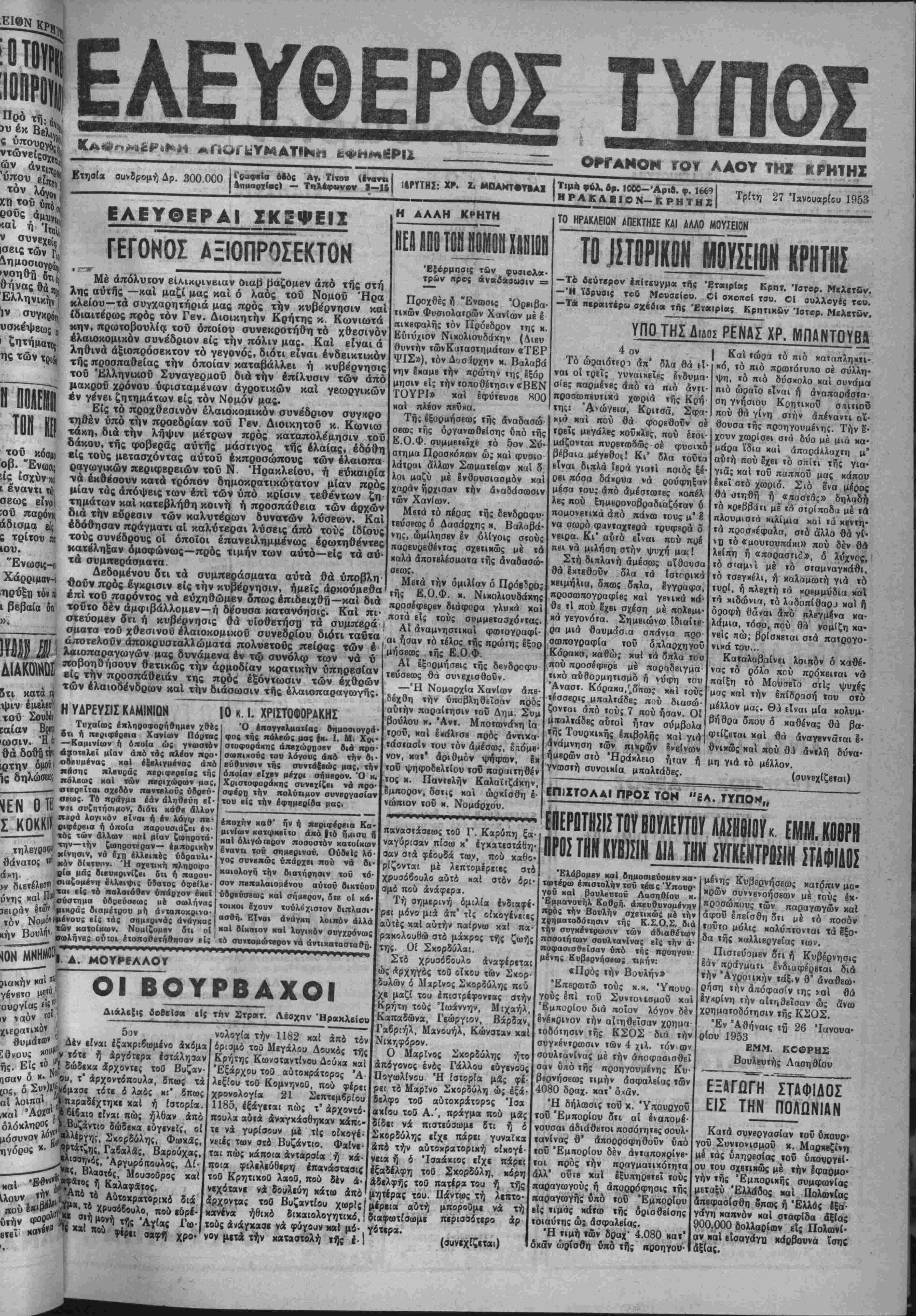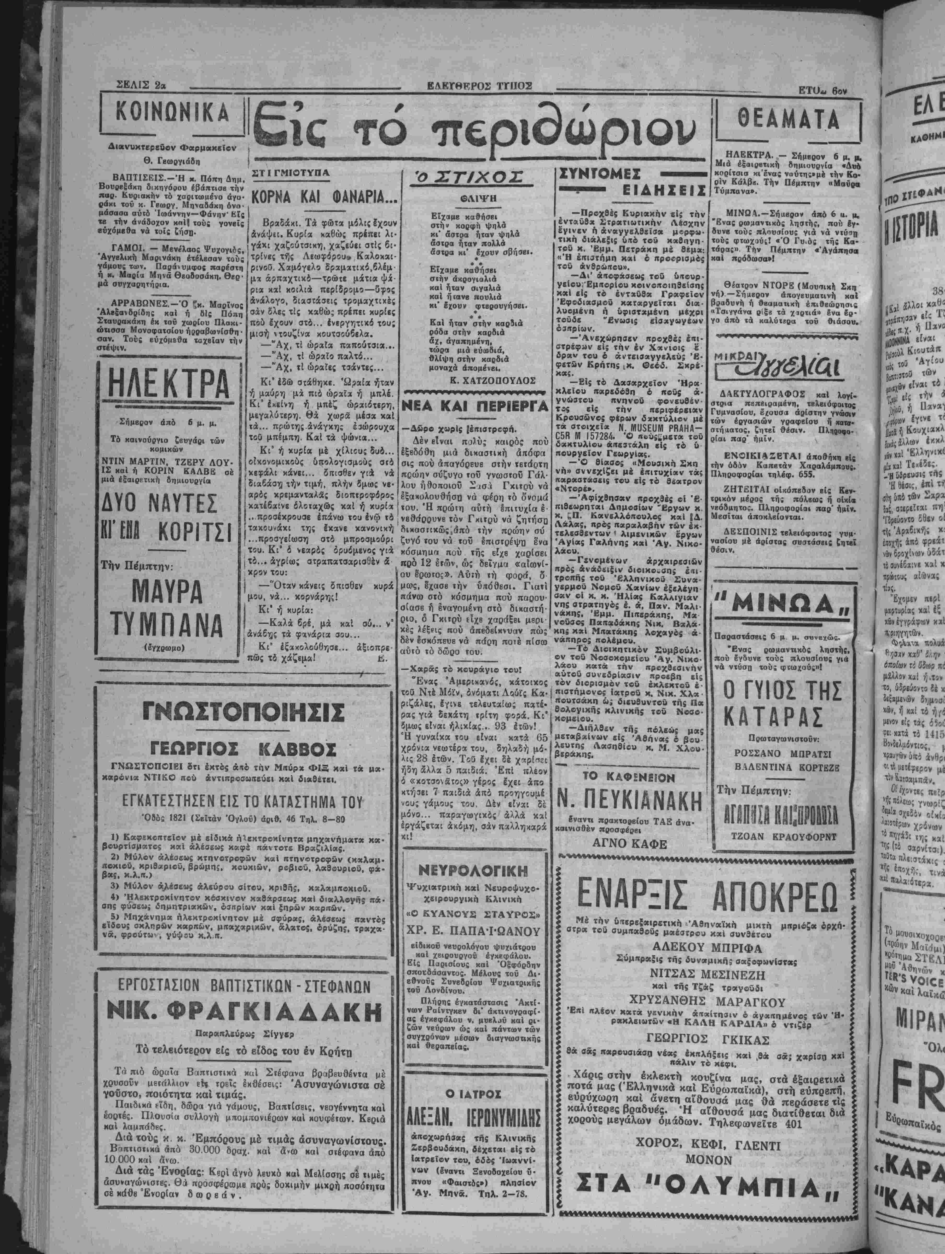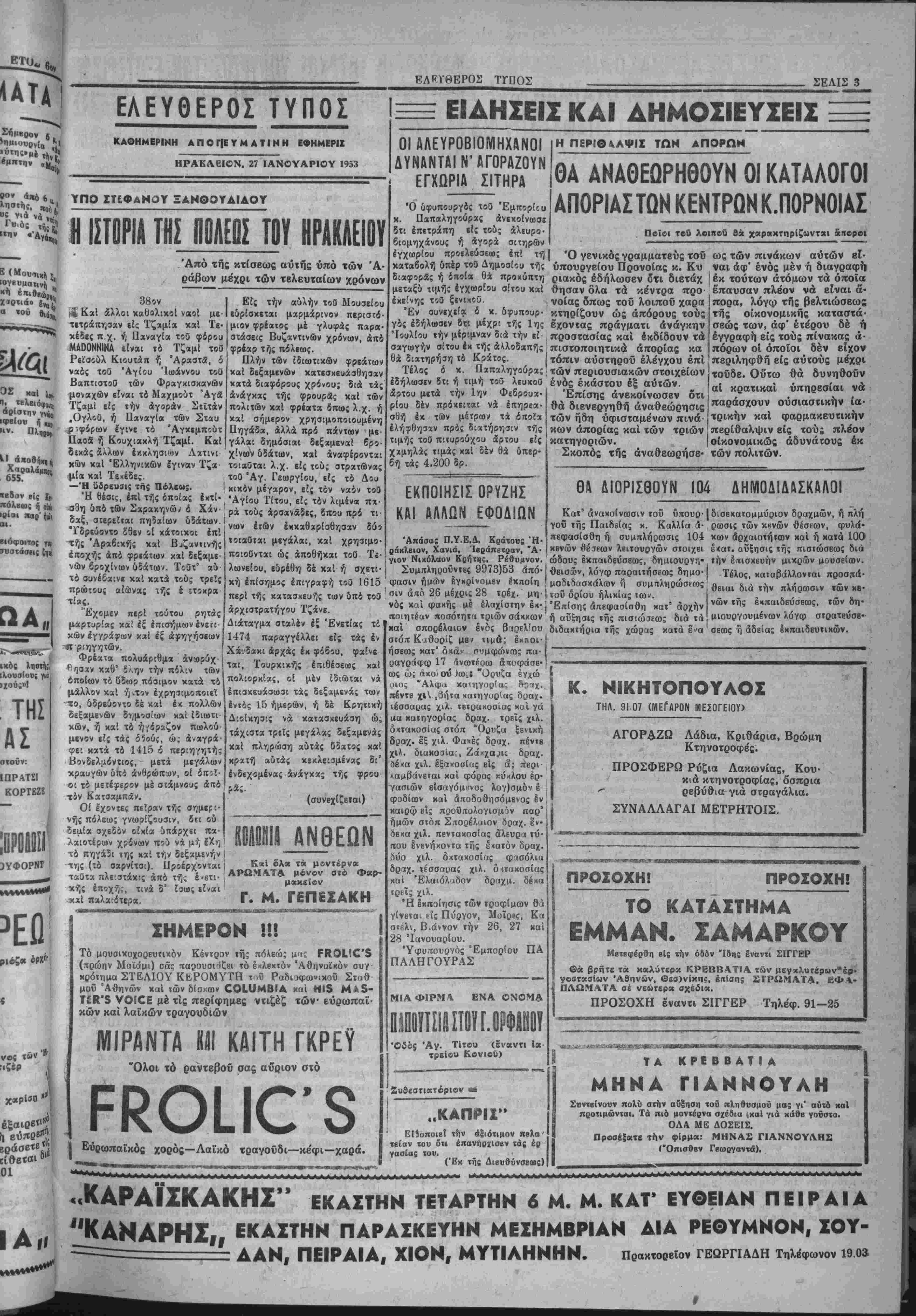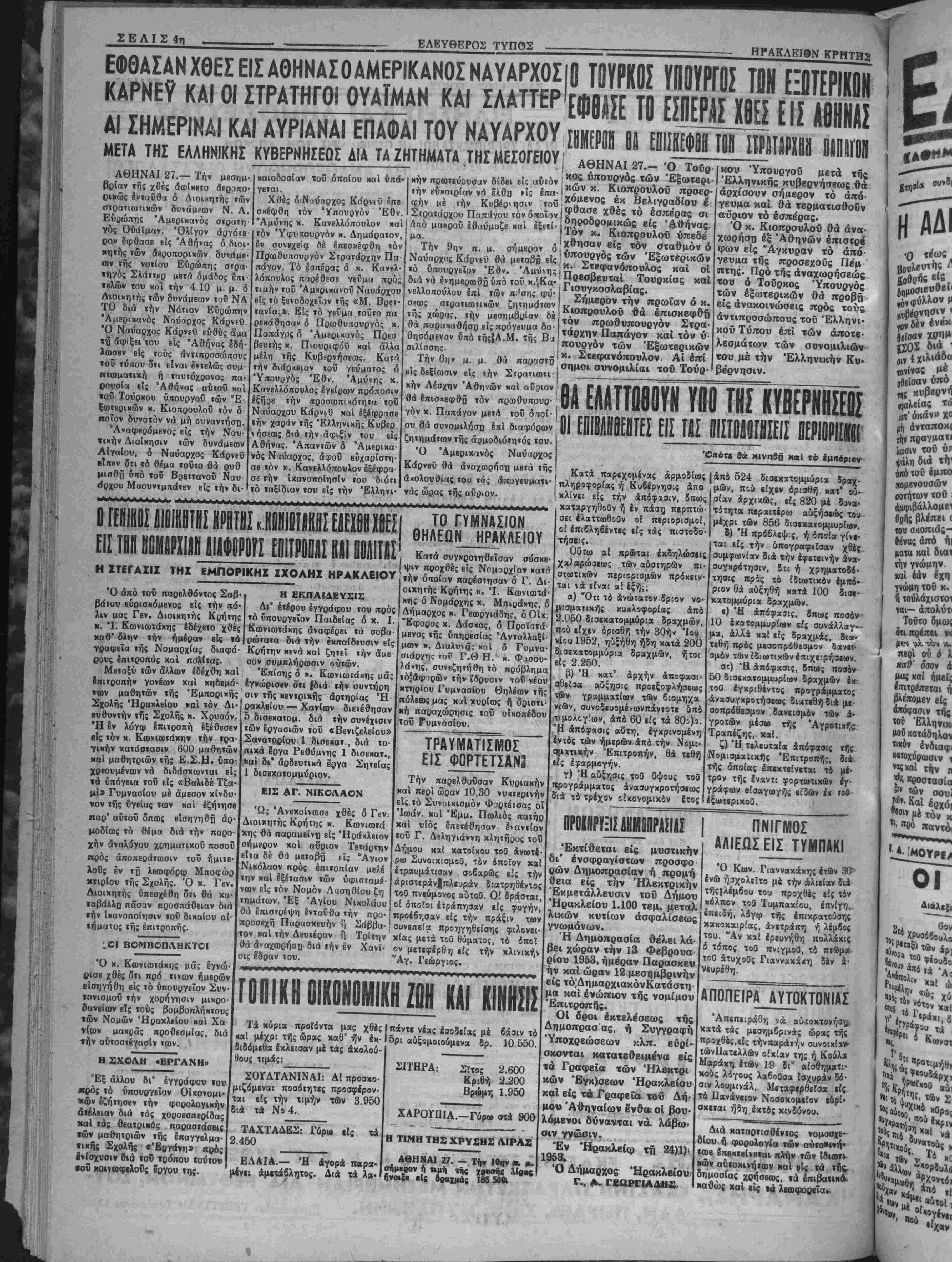 <ύπουργός των Εξωτερικών ι κ. Στβφανόπουλος καί οί ! Πρεσβευταί Τουρκίας καί Γιουγκοσλαβίας. Σήμερον την πρωΐαν ό κ. Κιοπρουλοΰ θά επισκεφθή τόν πρωθυπουργόν Στρα¬ τάρχην Παπάγον καί τόν ύ πουργόν των Εξωτερικών κ. Στεφανόπουλον Αί επί σημοι συνομιλίαι τοΰ Τούρ· «ου Ύπουργοΰ μετά τής Έλληνικής κυβερνήσεως θά άρχίσουν σήμερον τό άπό- γευμα καί θά τερματισθοΰν αυριον τό εσπέρας. Ό κ. Κιοπρουλοΰ θά ανα¬ χωρήση έξ Αθηνών έπιστρέ φων είς Άγκυραν τό άπό· γβυμα τής προσεχούς Πβ'μ πτης. Πρό τής αναχωρήσεως τού ό Τοϋρκος Ύπουργός των^ εξωτερικών θά προβή είς άνακοινώσεις πρός τοΰς άντιπροσώπους τοΰ Έλληνι- κου Τύπου επί των άποτε- λεσμάτων των συνομιλιών τού μέ την Ελληνικήν Κν· βερνησιν. Θί ΕΛΑΤΤΟβΟΥΝ ΥΠΟ ΤΗΣ ΚΥΒΕΡΝΗΣΕΙ ΟΙ ΕΙΗΒΗΤΕΙ Ε[Πίί ΒΙίίΒϋΙΙΙίΕΙί ΟΕΡΗΙΚ 'θποτ» βά κινηθό χ*1 τό , Κατά παρεχομένας αρμοδίως | άπό 524 δισεχατομμύρια πληροφορίας ή Κυβίρνησ.ς άπο μδν, π:ΰ είχεν &ρια%ϊ κατ' ού· χλίνιι είς την απόφασιν, δπως Ο Π.Π1Κ0Ι ΙΜΜΙΜΚ ,ΗΟΗΙΙΤΑΚΙΙ Ε1ΕΙΟΗΙΒΕΙ ΕΙΙΤΗΗ ΗΟΜΙΡΙίΙΑΗ ΙΙΙΦ8ΡΟΥΙ ΕΐΙΤΡΟΟΙΙ Κ1Ι ΠΟΛΙΤΑΣ Η ΖΤΕΓΑΖΙΖ ΤΗΣ ΕΜΠΟΡΙΚΗΖ ΣΧΟΑΗΖ ΗΡΑΚΛΕΙΟΥ Ό άπό τοΰ παρελθόντος Σάβ¬ βατον ευρισκόμενος εις την πό¬ λιν μας Γεν. Διοικητής Κρήτης μ. "Ι. Κωνιωτάκης εδέχετο χθές χαθ" δλην την ημέραν είς τα ΎθαφΕΪα της Νομαρχίαν διαφό¬ ρους Ιηιτροπάς καί πολίτας. Μβταξύ των άλλων εδέχθη καί ίηιτροπήν γονίων καί κηδβμό- νεον μαθητών τής Έμπορικής Σχολής Ηρακλείου καί τόν Δι ευθυντήν τής Σχολής κ. Χρυσόν. "Η έν λόγω Ιπιτροπή έξέθεσβν βίς ιόν κ. Κωνιωτάκην την τρα¬ γικήν κατάστασιν 600 μαθητών «αί μαθητριών τής Ε.Σ.Η. υπο· χρβουμένςον νά διδάσχωνται εί; »ά ύπόγβια ΐοΰ είς «Βαλιδέ Τζα μί» Γυμνασίου μέ άμεσον χίνδυ νόν τής ΰγβίας των καί Ιζήιησ καρ' αυτού όπως βΐσηγηθή άρ μοδίως τό θέμα διά την παρο¬ χήν άναλόγου χρηματιχοΰ ποσοΰ πρός αποπβράτωσιν τού ήμιΐβ λούς έν τί) λβωφόρω Μποφώρ χΐιρίου τής Σχολής. Ό κ. Γεν Διοικητής υπεσχέθη ότι θά κα ταβάλλη πάσαν προσπάθειαν διά «ήν Ικανοποίησιν τού δικαίου αί τήματος τής επιτροπής. .01 ΒΟΜΒΟΠΛΗΚΤΟΙ Ό κ. Κανιωτάκης μας εγνώ· ρισβ χθές ότι πρό τίνων ημερών βΐστιγήθη είς τό ΰπουργϋΐον Συν τονισμού την χορήγησιν μιχοο δανείων είς τούς βομβοπλήχτους των Νομών Ήρακλβίου καί Χά νίων μακρά; προθεσμίας, διά την αύτοσιίγασίν των. Η ΣΧΟΛΗ «ΒΡΓΑΝΗ» Έξ άλλου δι" έγγράφου »ου «ρός τό ύπουργΒΪον Οϊκονομι- Χων έζήτησβν την φορολογιχήν ατέλειαν διά τάς χοροεσπερίδας καί τάς θίατρικός παραστάσβις των μαθητριών τής έπαγγβλμα- τικτΐς Σχολής «Έργάνη» πρός ενίσχυσιν διά τοΰ τρόπου τούτον •ου κοινωφελούς έργον τί);. Η ΕΚΠΑΙΔΕΥΣΙΣ Δι* ετέρου έγγράφου τού πρός τό υπουργείον Παιδβΐας ό χ. Ι. Κωνιωτάχης άναφέρει τα σοβα ρώτατα διά την Ικπα(δευσιν είς Κρητην κενα καί ζητεί την άμβ σον συμπλήρωσιν αυτών. Έπίσης δ κ. Κανακάκης μά; Ιγνώρισβν ότι (διά την συντήρη σιν της κβντριχής άρτηρίας Ή ραχλεΐου — Χανίων διετέθησαν 5 δισβχατομ. διά «ήν συνέχισιν «ών εργασιών τού «Βενιζελείου» Σανατο^ίου 1 διθΒχοτ , διά το πιχά εργα Ρεθύμνης 1 δισβχατ., καί δι* αρδβυιικά εργα Σητείας 1 διοεκατομμύριον. ΕΙΣ ΑΓ. ΝΙΚΟΛΑΟΝ Ώς Άνβχοίνοοσβ χθές ό Γυν Διοικητής Κρήτης κ. Κωνιοοΐά κης θά παραμείνη) είς Ήοάχλβιον σήμερον καί αυριον Τβτάρτην βΐτα δέ θί) μβταβΌ είς "Άγιον Νικόλαον πρός έπιτοπίαν μελέ την καί εξέτασιν «ών υφισταμέ¬ νων είς ιόν Νομόν Λασηθίου ζή τημάτων. "Εξ Άγίου Νικολάου θά έπιστρέψΓ) ενταύθα την προ- προσέχη Παρασκευήν ή Σάββα¬ τον καί την Δευτέραν ή Τρίτην θά αναχωρήση διά