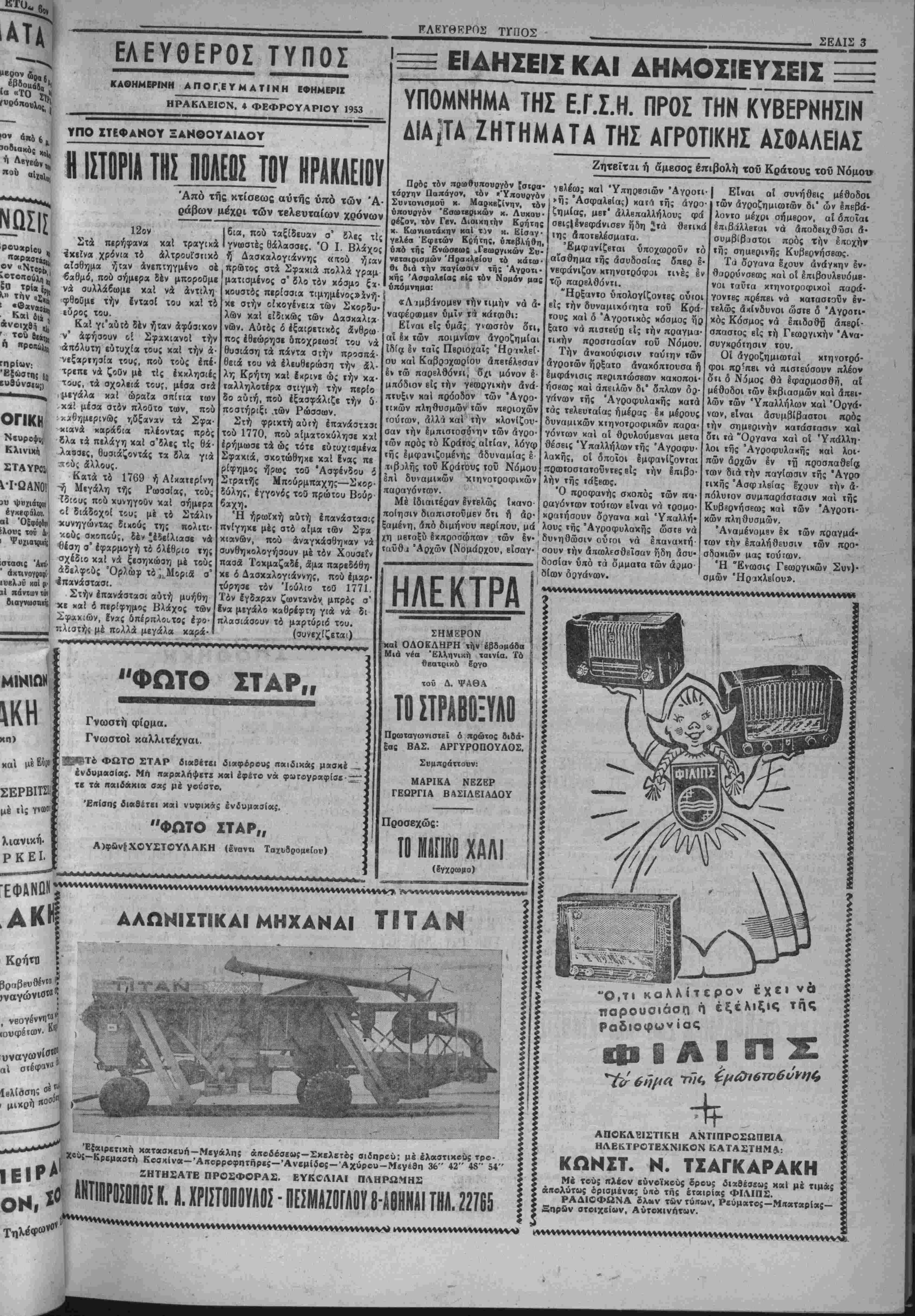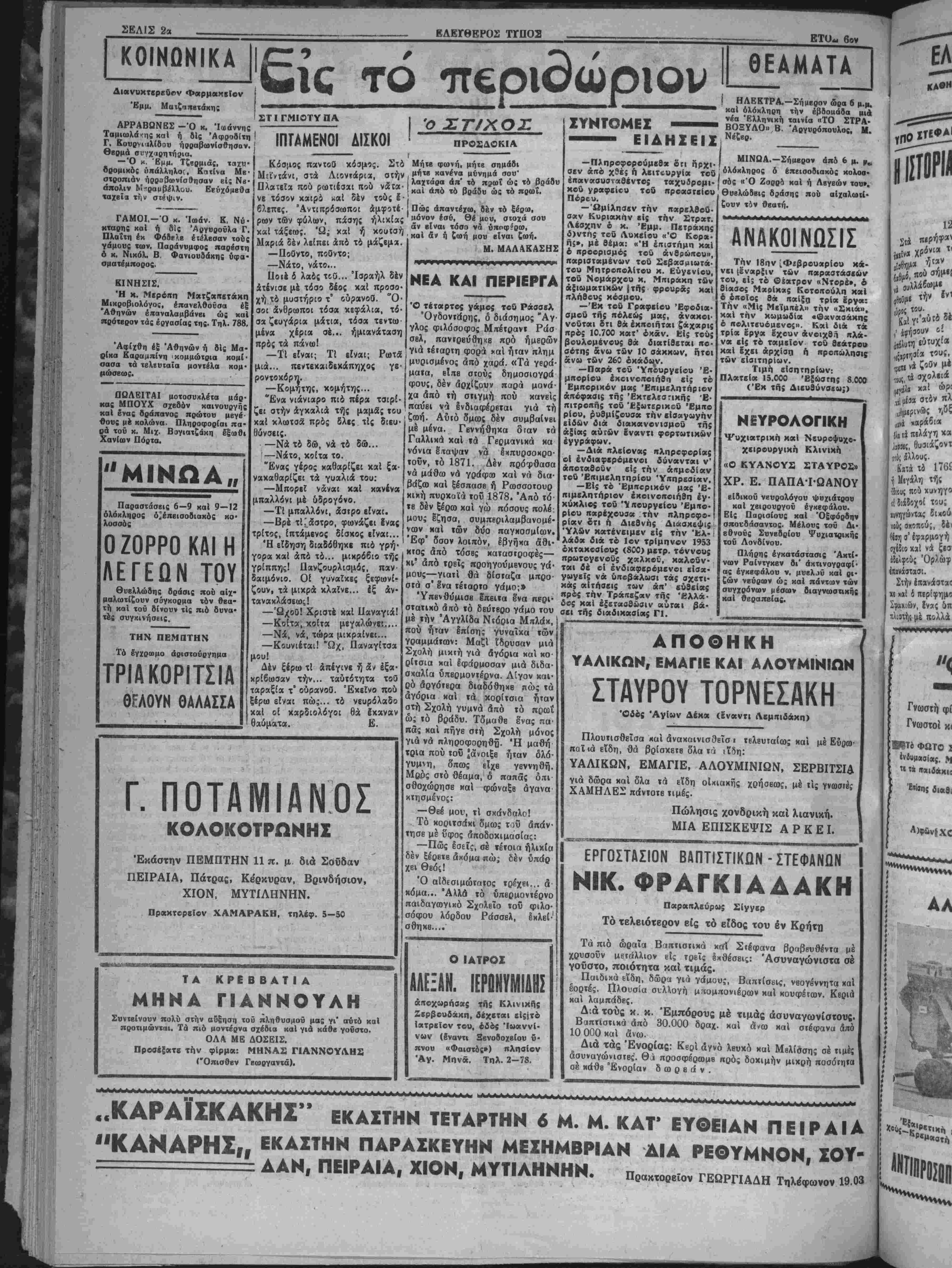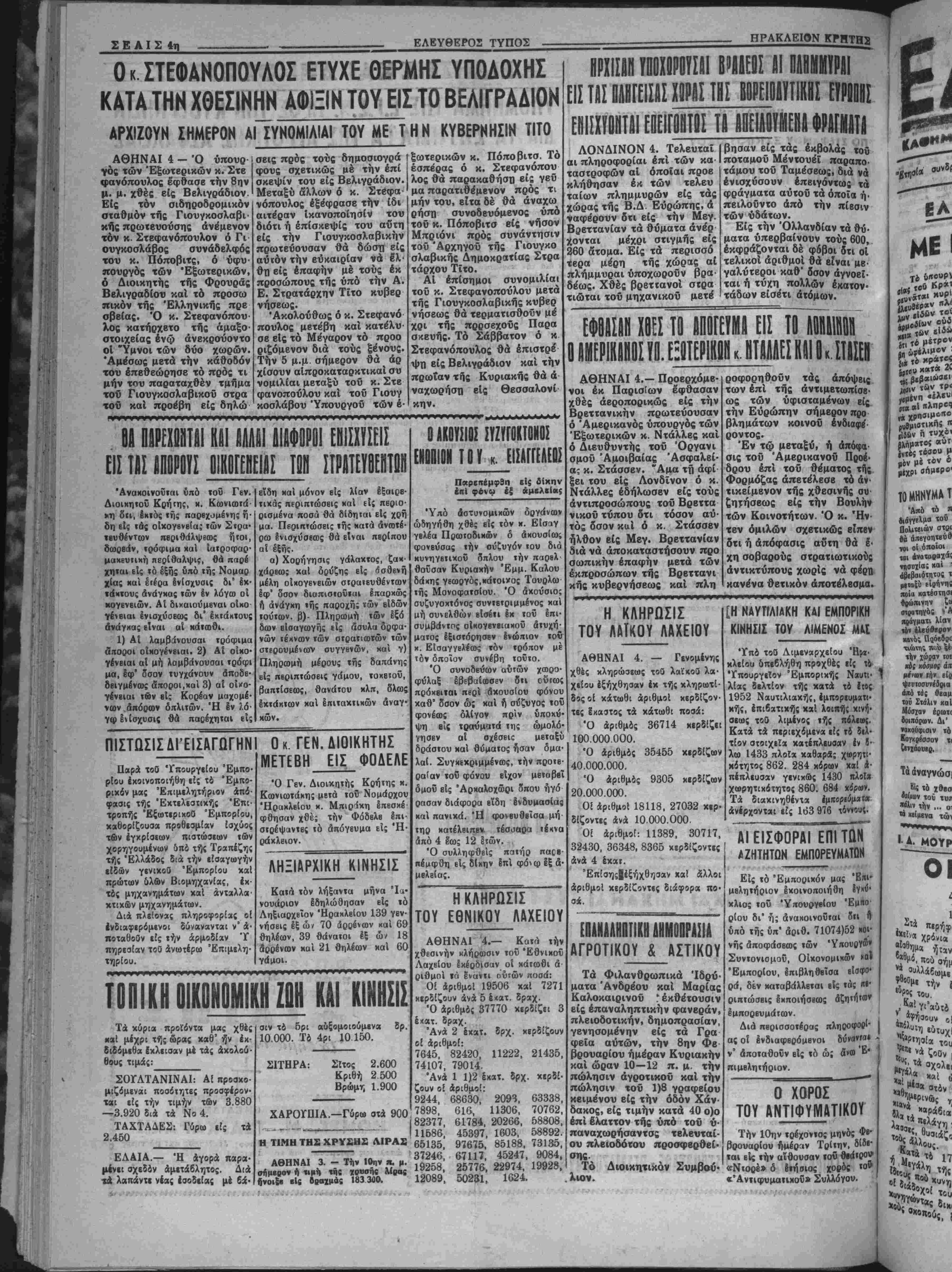 κερδΐζουν άνά 5 έ<ατ. δραχ. Ό άριθμάς 37770 κερδίζει 3 έχατ. δραχ. Άνά 2 έκατ. δρχ. κερδίζουν οί άριθμοί: 7645, 82420, 11222, 21435, 74107, 79014. Άνά 1 1)2 έκατ. δρχ. χερδί- ζουν οί άριθμοί: 9244, 68630, 2093, 63338, 7898, 616, 11306, 70762, 82377, 61784, 20266, 58808, 11686, 45397, 1603, 58892. 65135, 97675. 85188, 73135, 37246, 67117. 45247, 9084, 19258, 25776, 22974, 19928» 12089, 50231, 1624. ΑΘΗΝΑΙ 4. — Γενομένης χθέ; κληρώσεως τοθ λαΐκοθ λα- χείου εξήχθησαν {χ τής κληρωτί- δοςοί κάτωθι άριθμοί κερδίζον- τες Ικαστος τά κάτωθι ποσά: Ό άριθμβς 36714 κΐρδίζει 100.000.000. Ό άριθμός 35455 χερδίζων 40.000.000. Ό άριθμος 9305 κερδίζων 20.000.000. Οί άριθμοί 18118. 27032 χερ· δίζοντες άνά 10.000.Ο00. Οί άριθμοί: 11389, 30717, 32430, 36348, 8365 χερδίζοντες άνά 4 έχατ. Έπίσης|έξήχθησαν χαί άλλοι άριθμοί χερδίζοντις διάφοραι πο· οί. ΕΟΑΝΑΑΗϋΤΙΚΗΔΗΜΟΠΡΑΣΙΑ ΑΓΡΟΤΙΚΟΥ & ΑΣΤΙΚΟΥ Τά Φιλανθρωπικά Ίδρύ- ματα Άνδρέου καί Μαρίας Καλοκαιρινοϋ . εκθέτουσιν βίς επαναληπτικήν φανεράν, πλειοδοτικήν, δημοπρασίαν, γενησομένην βίς τα Γρα φεία αυτών, την 8ην Φβ βρουαρίου ημέραν Κυριακήν καί ώραν 10—12 π. μ. την πώλησιν άγροτικοϋ καί την πώλησιν τοΰ 1)8 γραφείον κειμένου είς την οδόν Χάν¬ δακος, είς τιμήν κατά 40 ο)ο επί έλαττον τής υπό τοΰ ν- παναχωρήσαντσς τελευταί¬ ον πλειοδότου προσφερθεί· σης. Τό Διοικητικόν Συμβού¬ λιον. [Η ΝΔΥΓΙΛΙΛΚΗ ΚΑΙ ΕΜΠΟΡΙΚΗ ΚΙΝΗΣΙΣ ΤΟΥ ΛΙΜΕΝΟΣ ΜΚ 'Υπό τοθ Λιμεναρχείον Ήρβ- χλείου δπεβλήθη προχθές εί; :»■ "Υπουργείον Εμπορικάς Ναυΐι· λίας δελτίον τής χατά το εΐος 1952 Ναυτιλιαχής, Ιμπορευματι· κης, έπιδατικής χαί λοιπάς χινή· σεως τοθ λιμένος τή; πόλεως. Κατά τά περιεχόμενα εί; το δελ¬ τίον οτοιχεΐα χατέπλιυοαν έν 8· λω 1433 πλοϊα κβθαρβς χωρητι¬ κότητος 862. 284 κόρων χαί &■ πέπλευσαν γενικώς 1430 πλοΓ* χωρητικότητος 860. 684 χόριον. Τά διακινηθέντα Ιμποριύμαΐ» άνέρχονται βίς 163 976 χδννους. ΑΙΕΙΣΦΟΡΑΙ ΕΠΙΤΟΪΓ ΛΖΗΤΗΤΟΝ ΕΜΠΟΡΕΥΜαΤΟΝ Εις τό Έμποοικόν μας Έκι» μβληιήοιον εκοινοποιήθη ίΥ»ύ' χλιος τού ΎπουογβΙου Έμ«ο ρ(ου δι' ή; ανακοινούται δτι ή υπό τής ΰπ* αριθ. 71074)52 εβι· νης άποφάσβως των εγηουογδ* Συντονισμοϋ, ΟΙχονομικών «α» 'Εμπορίου, βπιβληθβΐσα βίσφο· ρα δέν καταβάλλεται εϊς τάς ην Οΐιτΐώσβις §κποιή*σβως άζητή'ΐ»1* Ι έμποοβυμάτων. Διά πβρισσοτέρας πληβοφορ!· Ι άς οί ένδιαφβοόμβνοι δύ»β»'α· * ν' άποταθοΰν βίς »ό ώ; ανα> Έ*
