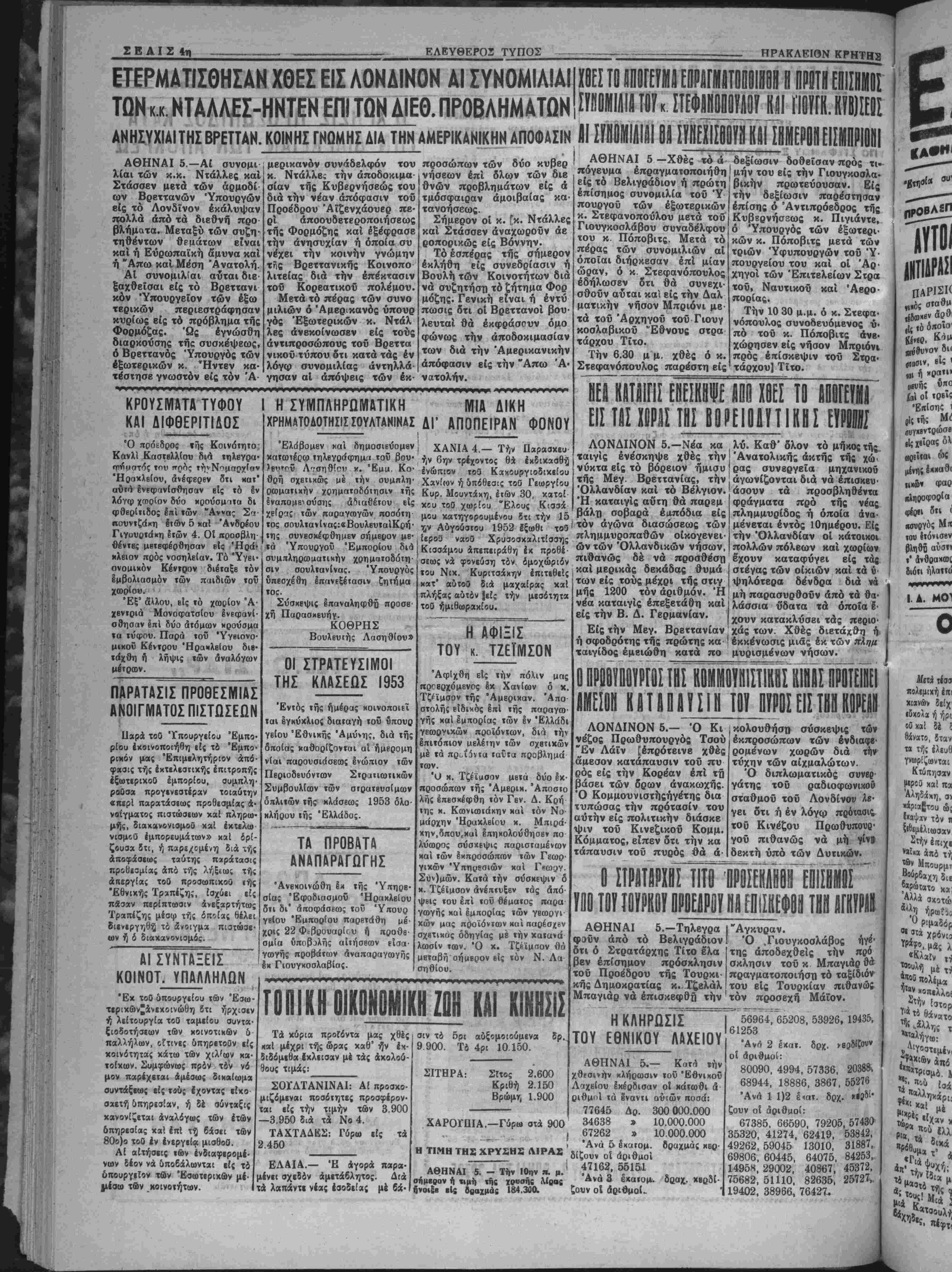 καί μέχρι τής ώρας καθ ήν «><- ϊιδόμεθα ίκλεισαν μέ τάς άκολού- 9ους τιμάς: ΣΟΥΛΤΑΝΙΝΑΙ: Α! προσκο- μιζόμεναι ποσόΐητες προοφέρον- ται είς την τιμήν των 3.900 —3.950 διά τά Νο 4. ΤΑΧΤΑΔΕΣ: Γύρω είς 2.450 τα ΕΛΑΙΑ.— Έ άγορά παρα- μένει σχεδόν άμετάβλητος. Διά τα λαπάντε νέας εσοδείας μέ 6ά· σιν τί 5ρι αύξομοιούμενα δρ. 9 900. Τά 4ρι 10 150. ΣΙΤΗΡΑ: Σΐτος 2.600 Κριθή 2.150 Βρώμη 1.900 ΧΑΡΟΥΠΙΑ.—Γύρω ατά 900 Η ΤΙΜΗ ΤΗ£ ΧΡΥΣΗ3 ΛΙΡΛΣ ΛΟΝΔΙΝΟΝ 5.-Νβα κα ταιγίς ενέσκηψε χθές την νύκτα είς τό βόρειον ήμισυ τής Μεγ. Βρεττανίας, την "Ολλανδίαν καί τό Βέλγιον. Ή καταιγίς αυτή θά παρεμ βάλη σοβαρά έαπόδια είς τόν άγώνα διασώσβως των πλημμυροπαθών οίκογενει- ών των Όλλανδικών νήσων, πιθανώς δέ νά προσθέση καί μερικάς δεκάδας θυμά των είς τούς μέχρι τής στιγ μης 1200 τόν αριθμόν. Ή νβα καταιγίς έπεξβτάθη καί είς την Β. Δ. Γερμανίαν. Είς την Μεγ. Βρβττανίαν ή σφοδρότης τής πρώτης κα ' ταιγίδος εμειώθη κατά πό λύ. Καθ' δλον τό μήΉοςτή; Άνατολικής άκτής τής χώ ρας συνβργεΐα μηχανικόν άγωνίζονται διά νά έπισκβυ- άσουν τά προσβληθέντα φράγματα πρό τής νέας πλημμυρίδος ή όποία άνα· μένεται έντός Ιθημέρου. Είς την "Ολλανδίαν οί κάτοικοι πολλών πόλεων καί χωρίων έχουν καταφύγει είς τάς στενάς των οίκιών καί τά ύ· ψηλότερα δένδρα διά νά μή παρασυρθοΰν άπό τα θα· λάσσια ΰδατα τά όποία ί· χούν κατακλυσει τάς πβριο· χάς των. Χθές διβτάχθΐι τ>