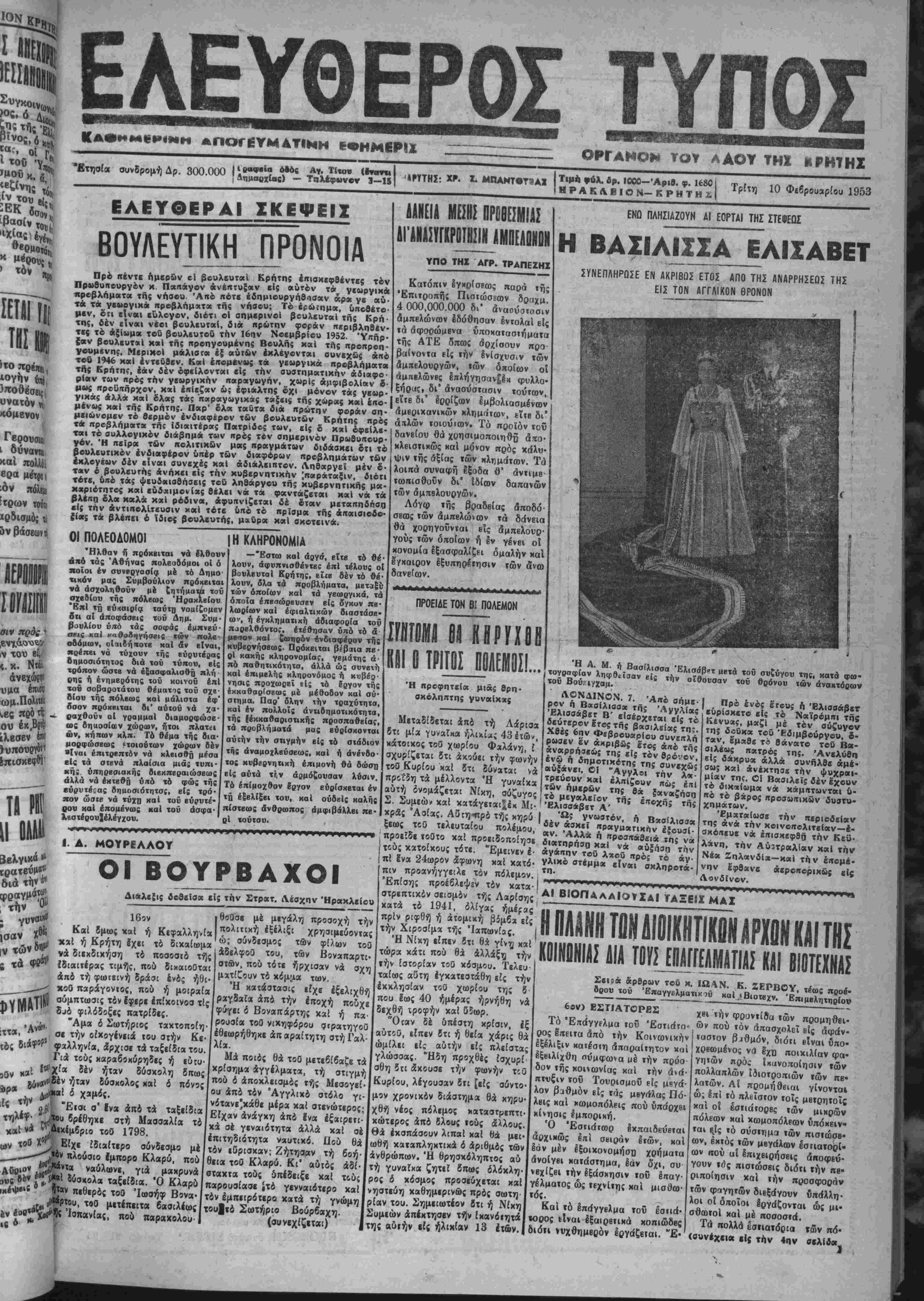 Πρωθυπουργόν κ. Παιτάγον *νίιττυξ<χν είς βύτβν τ* νεωί «ρββλήμ«τοτ τής νηοβυ Άηο ηότβ έδημιουργήθησαν άρί ν« αύ τ« τ« γ«Μρνικ« ηροβλήμ*τ« τής νήοβυ; Το έρώτημα, όιτοθέτο' μ«ν, 6π *1ν«ι κΰλογον. διότι οί σημβρινοΐ βουλευτού τής Κοή· της, δέν είναι νίβι βουλευτού, διά πρώτην φοςάν πϊριβληθίν τις το άξίωμα τοΰ βουλευτού την 16ην Νοεμβριού 1952 Ύπήο· ϊαν βουλευτού χ*1 τής προηγουμένης Βουλής καί τής ποοποοη- γουμενπί. Μβρικοί μάλιστα έξ αυτών έκλέγονται συνβχδί Ι«β τβΰ 1946 κ«1 εντεύθεν. Κ αί επομένας τά γεωργικά προβλήματ» της Κρήτης, έαν δέν όφϊίλονται είς την συστηματικήν αδιαφο¬ ρίαν των ηρός την γεωργιχπν παραγωγήν, χωρι; αμφιβολίαν ί· "-< «τρουκήρχον. μ«1 ■■>Ι«ς«ν ώ; έφ.αλτπ; βχ, μόνον ?ά.,„,.