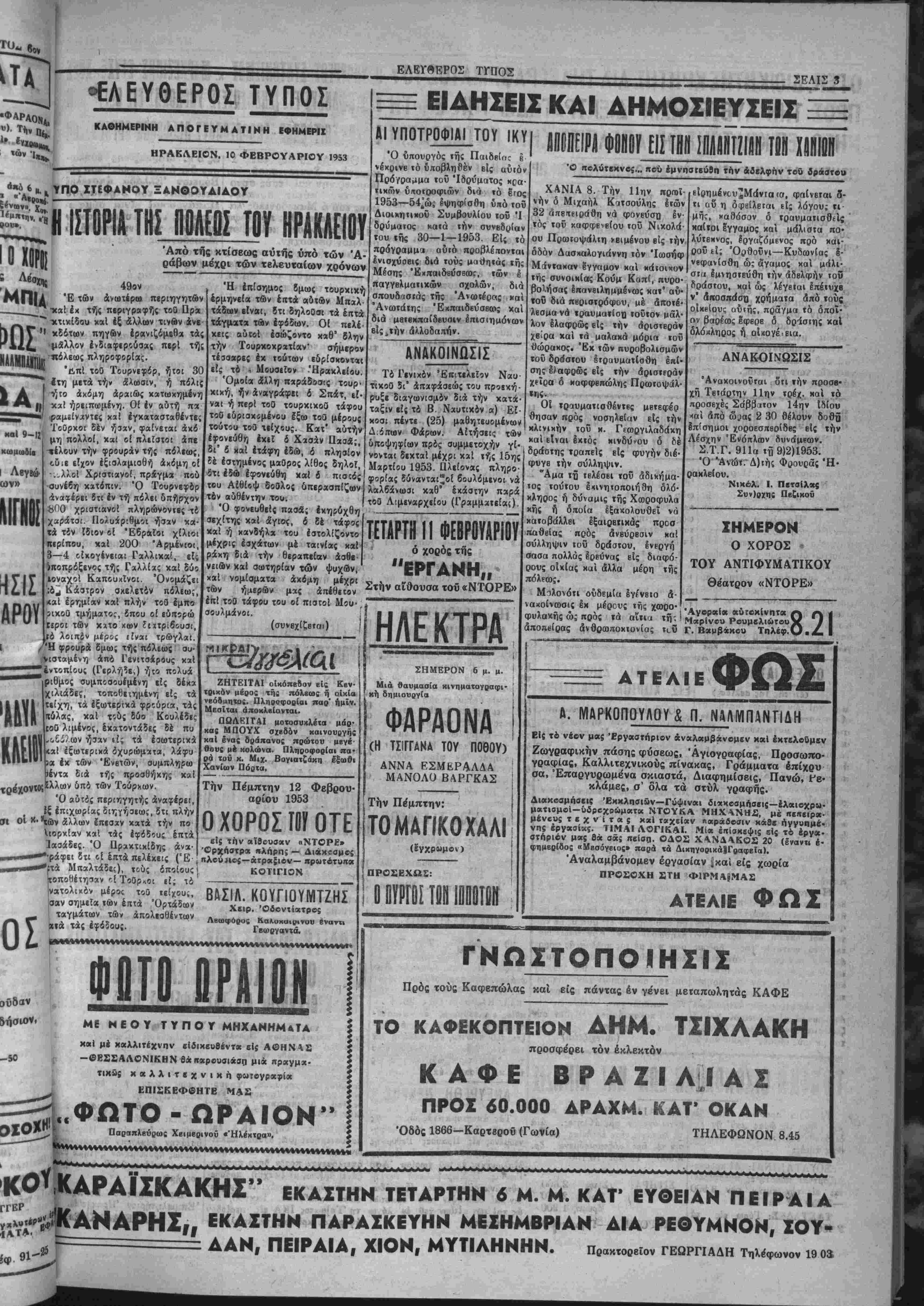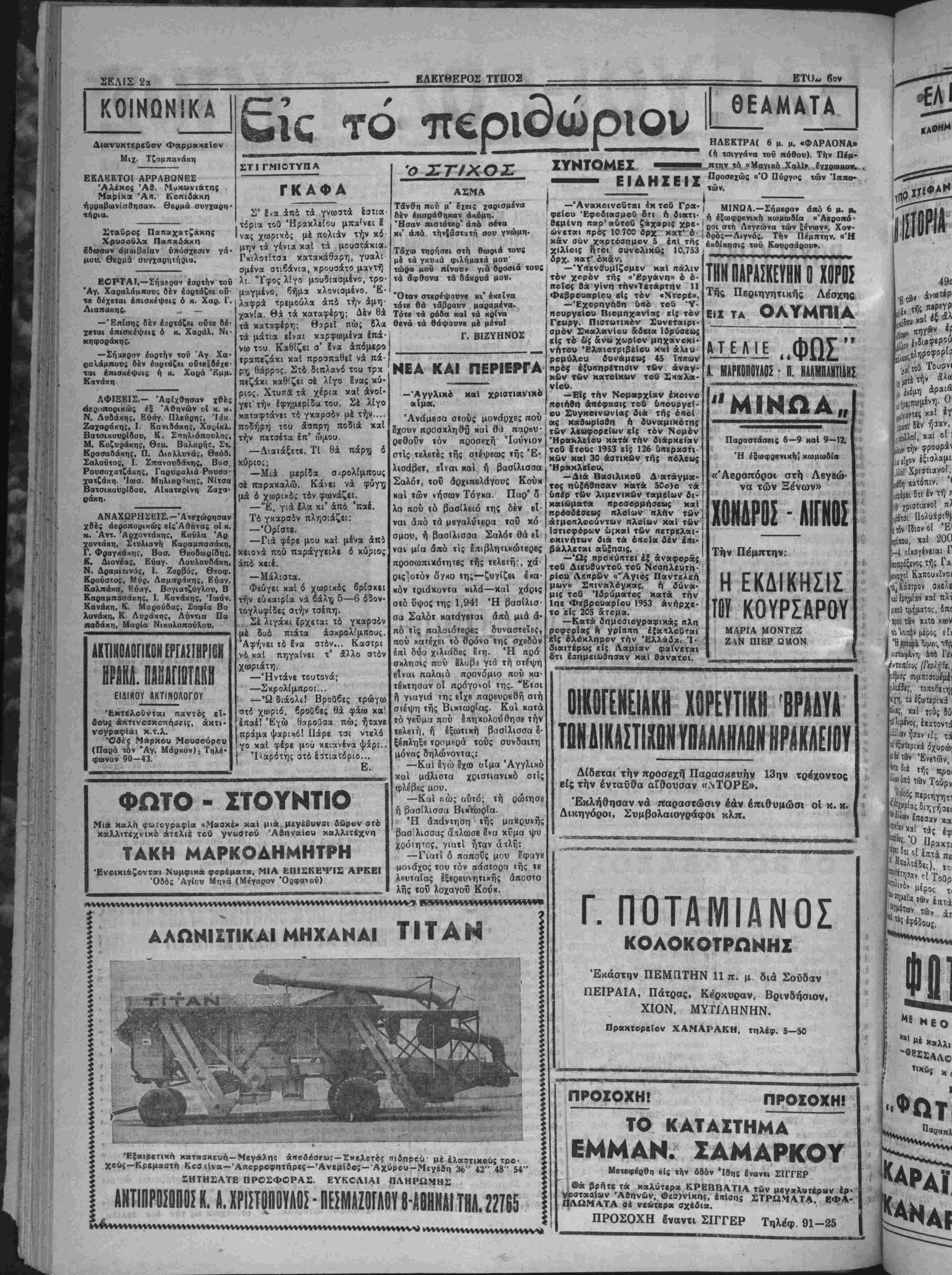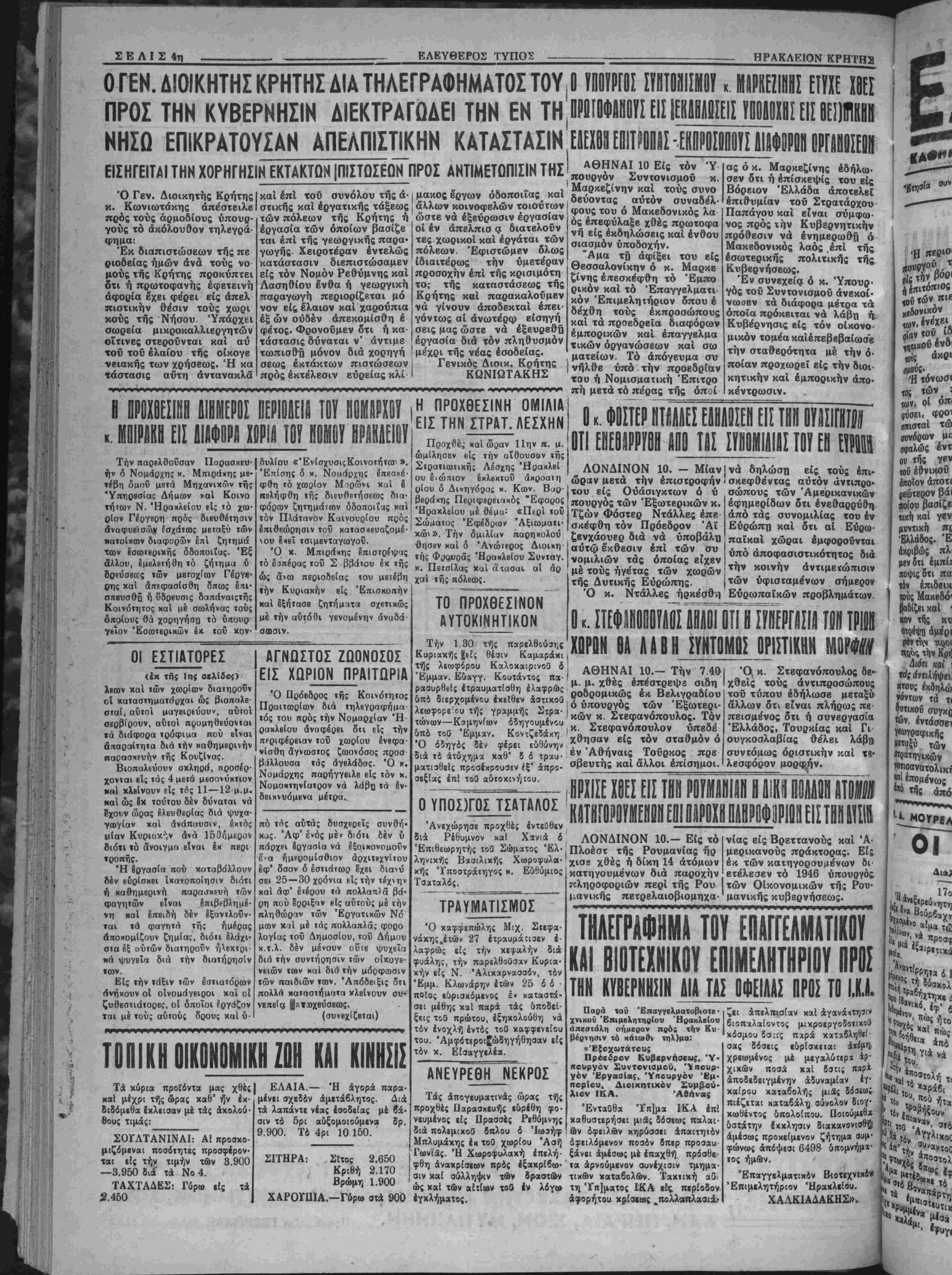 ίλβσεν < ΪΙιΤ II 01 ΠΟΛΕΟΔΟΜΟΙ Ήλθον η πρόκϊΐται νά έλθουν ύχό τάς Αθήνας πολεοδόμοι οί ό Χοίοι έν συνεργασίαν μέ τό Δημο τικόν μας Συμβούλιον πρόκειται νά άσχοληθοΰν μέ ζητήματι* τοΰ σχ«Β(ου τής πόλεως "Ηρακλείου "Επί τή εύκαιρίςτ. ταύτη νομίζομεν δα αί αποφάσει! τού Δημ. Συμ- βανλίου υπό τάς σοφάς έμπνεύ- αρι( χαΐ κπθοοηγήο'βις *»ν πολβ- οβόμων, οΙαιβήκοτΕ καί &ν είναι, χο,έπβι νά τύχουν τής ευρυτέρας βημοσιότητος διά τού τύπον, εί; τρόπον ώστβ νά εξασφαλισθή πλή οης ή ένημεοόιης τοϋ κοινοϋ επί χον σοβαροτάτου θέματος τοΰ σχβ· Βίον τής πόλεως καί μάλιστα έφ" δσον πρόχβιται βι' αυτού νά χα· βαχθοϋν αί γραμμαί βιαμορφώσε- ως δημοσίαν χώροαν, ήτοι πλοΤίΐ ών, κήϊΐων κλπ. Τό Θέμα τής δια μορφώσεως ^τοιούτων χώοων δέν Ίναι έπιτρβπτόν νά κλεισθή μέσα Είς τά σΐβνά πλαίσια μιάί τυπι· κή; ύπηρβσιακής Βιεχπεραιώσβως άλλά νά έκτβθά υπό τό ςρώς της βύρυτέΐίας Βημοσιότητσ;, εί£ τρό¬ πον ώσΐβ νά τύχο χαί τού βύρυτέ- ρου καί επομένας παί τοϋ άσφα- λβστέρου]έλέγχου. [Η ΚΛΗΡΟΝΟΜΙΑ —Έστω καί άργά, είτε τό θε- λουν, άφυπνιοθέντεΐ επί τέλους οί βονλευταΐ Κρήτης ρϊιβ δέν τό θέ· βονλευταί Κρήτης, εϊιε δέν τό θε λουν, δλα τά προβλήματα, μετίξΰ των οποίων καί τά γεωργικά, τα όποΐα έίΐβίτώρβυσΕν είς δγκυν πβ· (αν καί έφιαλτιχών διαστάσκ- ών, ή έγχληματική άβιαφορία τοΰ π^ρΕλθοντο^, ετέθησαν υπό τό ά μβιον καί ζωηρόν Ενδιαφέρον τή: κυβερνήσεωΕ· Πρόκειται βίβαια πε· ρΐ χαχή; κληρονομίαί, γεμάτης ά πό παθητικότητσ, άλλά ώ; συνβνη χαΐ επιμελώς κληρονόμος ή κυβέρ¬ νησις προχώρει είς τό έργον τής εκκαθαρίσεως μέ μέθοδον καί ού- στημα. Παο' όλην την τραχύτητα, χαί έν πολλοίί άντιΒημοτιχότητα, τής Ιέκχαθαριστικής προσπαθείαί, τά προβλήιιατά μας Ευρίσκονται αύ(ήν την στιγμήν είς τό στάδιον τής άναμοχλβύσεως, χαί ή άνένδο- τος χνββρνητιχή έπιμονή θά δώση είς αύτά την αρμόζουσαν λύσιν. Τό £π(μοχθον έργον ευρίσκεται έν τή έίελίξβι του, καί ουδείς καλής πίστεως άνθρωπος άμφιβάλλει πβ- ρΐ τούτου. ΔΑΙΕΙΛ ΜΒΗ! ΟΡ00ΕΣΜΙ1! >Ι'ΑΙΙ!ΙΓ(ΡΟ2Η2ΙΐηΐΜΠΕΛ1ΝΟΝ
