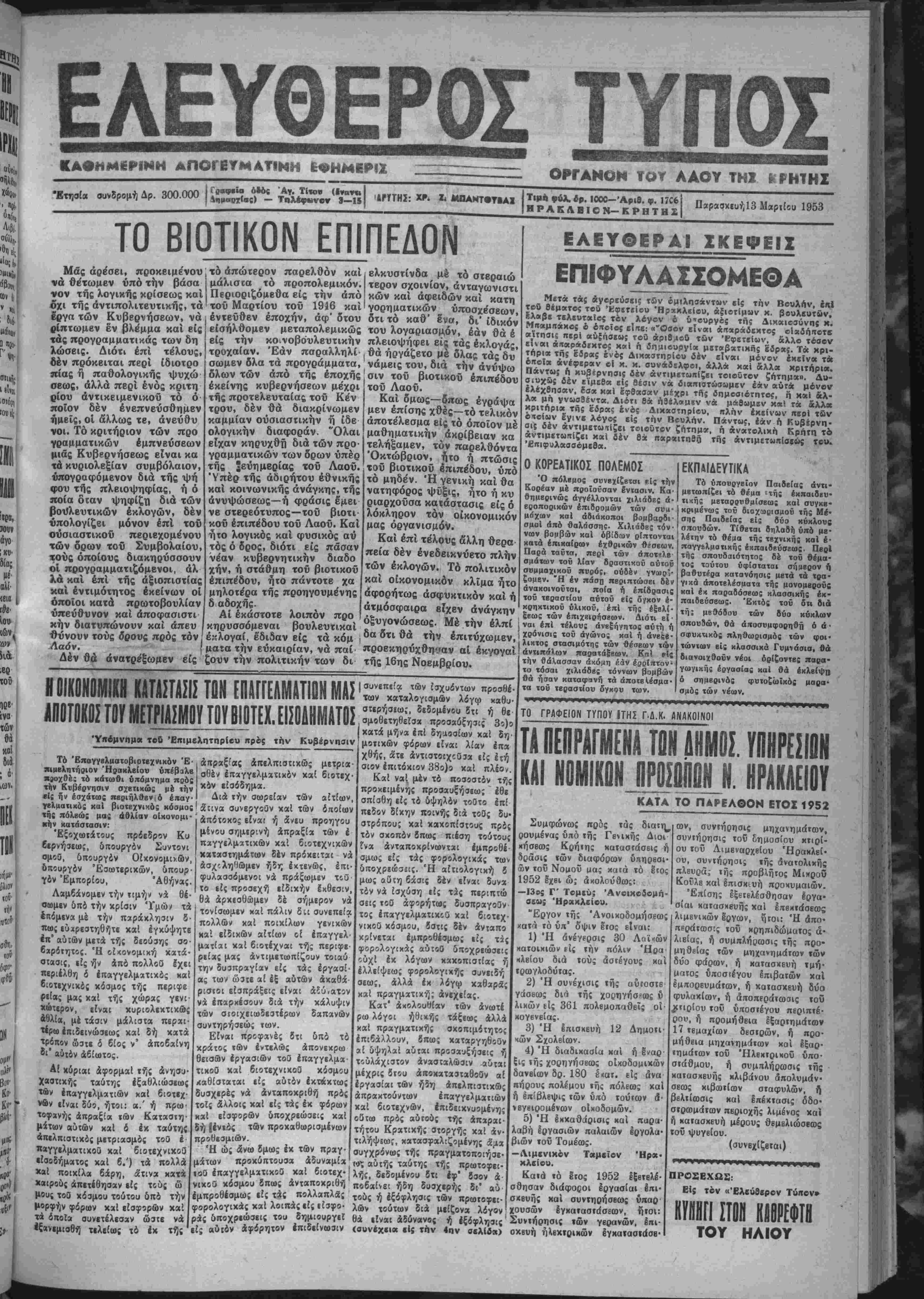 άνυψώσεως—ή <ρράσις εμει νέ στβρεότυπος—τού βιοτι· κου έπιπέδου τοΰ Λαοΰ. Καί ήτο λογικάς καί φυσικάς αύ τος ό δρος, διότι είς πάσαν νέαν κυβερνητικήν διαδο χήν, ή στάθμη τοΰ βιοτικοΰ έπιπέδου, ήτο πάντοτε χά μηλοτέρα τής προηγουμένης δ,αδοχής. Αί εκάστοτε λοιπόν προ κηρυσσόμεναι βουλευτικαί εκλογαί, έδιδον είς τα κόμ ματα την ευκαιρίαν, νά παί ζουν την πολιτικήν των δι βλκυστίνδα μέ τό στεραιώ τερον σχοινίον, άνταγωνιστι κων καί άφβιδών καί κατη γορηματικών ύποσχέσβων, δτι τό καθ" Ινα, δι" ιδικόν τού λογαριασμόν, εάν θά έ πλειοψήφει είς τάς εκλογάς, Ι θα ήργάξβτο μβ όλας τάς δυ νάμβις τού, διά την άνύψω σιν τοΰ βιοτικοΰ επίπεδον τοΰ Λαοΰ. Καί δμως—δπως έγράψα μέν επίσης χθές-τό τρλικόν αποτελεσμα είς τό οποίον μέ μαθηματικήν ακρίβειαν κα τελήξαμεν, τόν παρελθόντα "Οκτώβριον, ήτο ή πτώσις τοΰ βιοτικοΰ έπιπέδου, υπό τό μηδέν. Ή γενική καί θα νατηφόρος ψϋξις, ήϊ0 ή κυ ριαρχοϋσα κατάστασις είς ό λόκληρον τόν οικονομικόν μας οργανισμόν. Καί επί τέλους άλλη θερα πεία δέν ένεδεικνύετο πλήν των έκλογών. Τό πολιτικόν καί οικονομικόν κλίμα ήτο άφορήτως άσφυκτικόν καί ή άτμόσφαιρα βϊχεν ανάγκην όξυγονώσεως. Μέ την έλπί δα δτι θά την επιτύχωμεν, προβκηρΰχθτκ·αν αί έκγογαί τής 16ης Νοεμβριού. ΕΛΕΥΘΕΡΑ» ΣΚΕΨΕΙΣ ΕΠΙΦΥΛΑΣΣΟΜΕΟΑ Μετά τάς Αγορεύσει; των ομιλησάντων «Ις την Βουλήν, έιχ! τοθ Θέματος τού 'ΚφεΤίίου Ηρακλείου, αξιότιμον κ. ββυλεοτών, Ελαβε τκλϊυτκΐος τον λόγον 6 6*ουργος της Δικαιοσΰνης κ. Μιταμιτάκο; ό οποίος εΐπε: «"Οσον Είναι άκαράδεκτος οιαδήποτε αίτησις περί αύξησιν; τού άριθ,ιβυ των Έφβτβίων, αλλο τόσον είαι άηαραδίχτβ; κ»Ι ή ίπμιουργί* μβταβχτικής εδρα;. Τα κρι- τπρια τή; έδρας ενός Διχαστηρίου δέν είναι μόνον έκεϊνα τά- όιτοΐκ άνέφεραν οί κ. κ. συναδελφοι, άλλά κα) αλλα κριτπρια. Πάντως η κυβέρνησις δέν άντιμετωιτΐζει τοιούτον ζήτημα». Δυ· σιυχΰς δέν είμεθα είς θέσιν νά διαιτιστώσ&ιμεν εάν αύτά μόνον ελέχθησαν, δσα καί έφθασαν μέχρι τή; δημοσιότητο;, ή καί αλ¬ λα μή γνωσθέντα. Διότι θά ή3έλαμεν νά μάθωμεν καί τα άλλκ κριτήρια τή; εδρα; ενός Δικαστηρίου, πλήν εκκίνων ιτβρΐ των ο/ΐοίων έγινε λόγος εί; την Βουλην. Πάντως, εάν η Κυβέρνη¬ σις δέν άντιμετωπτίζει τοιούτον ζπτημ», ή άνατολική Κρητη Τώ άντιμίτωπίζει καί δέν θά παραιτηθή Τής άντιμετωιτίσίώς τού. ΊΕπΐφυλασσομβθα. Ο ΚΟΡΕΑΤΙΚΟΣ ΠΟΛΕΜΟΣ ΙΟΙΚΟΝΟΜΙΧΗ ΚΑΤΑΣΤΑΣΙΣ ΤΟΝ ΕΠΑΤΓΕΑΜΑΤΙΟΝ ΜΑΣ ΑΟΟΤΟΧΟ! ΤΟΥ ΜΕΤΡΙΑΙΜΟΥ ΤΟΥ ΒΙΟΤΕΧ. ΕΙΣΟΛΗΜΛΤΟΣ Ύπβμνημα τοθ Επιμελητηρίω πρός την Κυβέρνησιν Τό ΈπαγγΒλματοβιοτεχνικόν "Ε- χιμελητήριον Ηρακλείου υπέβαλε ΧΒοχθέ; τό κάτωθι ύπόμνημα ποός την Κυβέρνησιν σχετικώς μέ την -'- ήν εσχάτως περιήλθεν ά έιαγ' «πραξία; άπελπισΐικώς μετρια όθεν ΐπαγγελματιχδν χαί βιοτεχ χον ε£σόδημα. _Λ___. _,,„..„„ ο..·./·· Διά την σωρείαν των αίτίων κός καί βιοτεχνικό: κόομος! α*ίΐνα συνεργοθν χαί των οποίω1 κην χατάστασΐν' ^^ ο1κονο|"' «πότοχος είναι ή δνευ προηγου ΈςΌχωΐάτους πρόεδρον Κυ ξχς ρόεδρον Κυ βερνήαεως, υπουργόν Συντονι σμοθ, υπουργόν Οίχονομιχων, δπουργδν Έσωτερικών, υπουρ γόν Έμπορίου, Αθήνας. Λαμβάνομεν την τιμήν νά θέ· σωμεν δπό την κρίσιν 'Υμώ/ τα έπόμενα μέ την παράκλησιν 8 πως εύ*ρεστηθήτε καί έγκύψητ. έ*π' αίιιών μετά τής δεούσης σο βαρότητος. Έ οίκονομική χατά σΐασις, είς ή"ν άπό πολλοθ έχε περιέλθη δ έπαγγελματικδς χά 6ιοτεχνικο; κόσμος τής περιφε Ρ'Ιας μας χαι τής χώρας γενι χώτερον, είναι κυριολεκτικώς άθλία, μέ τάσιν μάλιστα περαι¬ τέρω επιδεινώσει!); καί δή χατά τρόπον ώστε ό