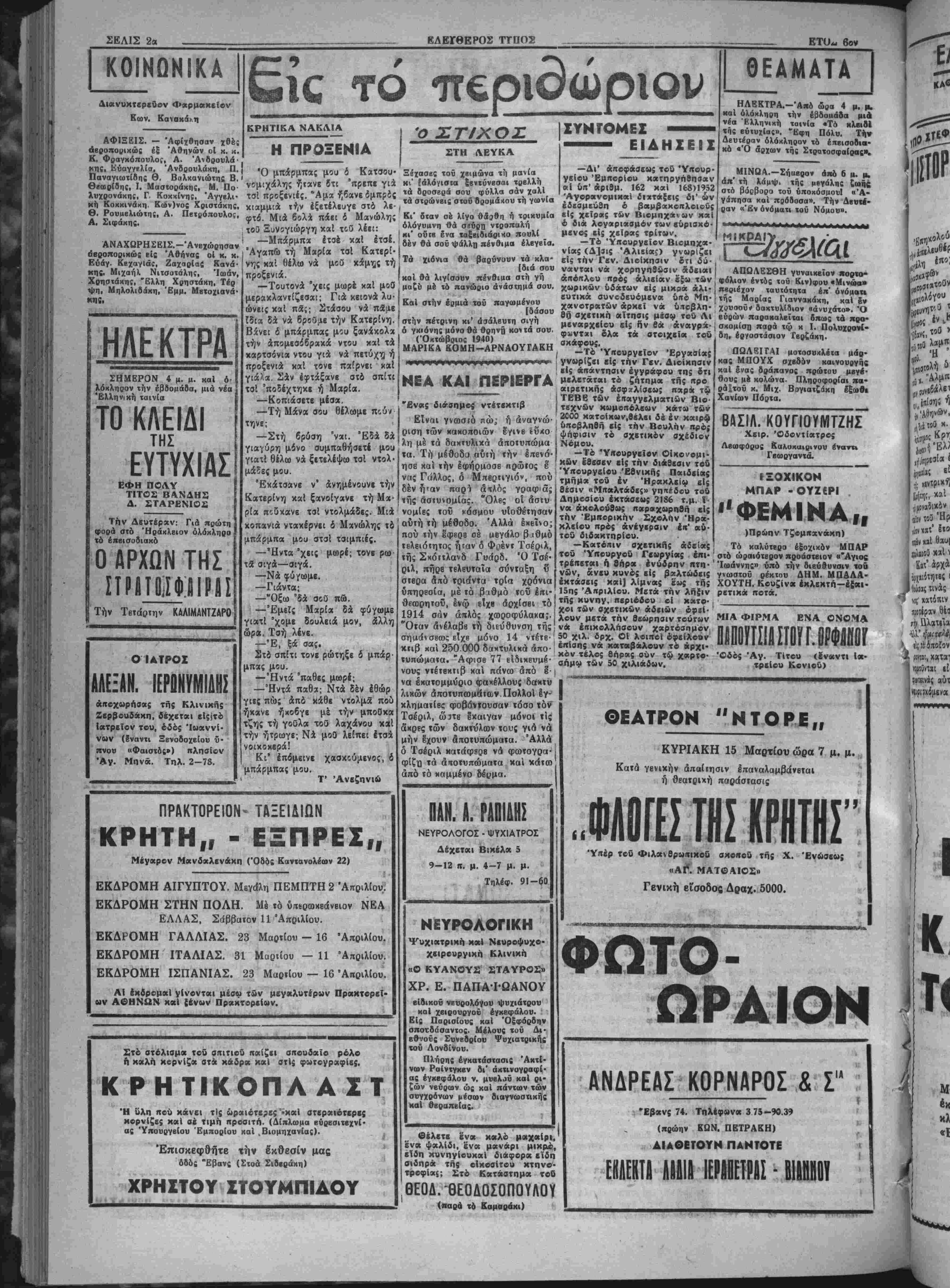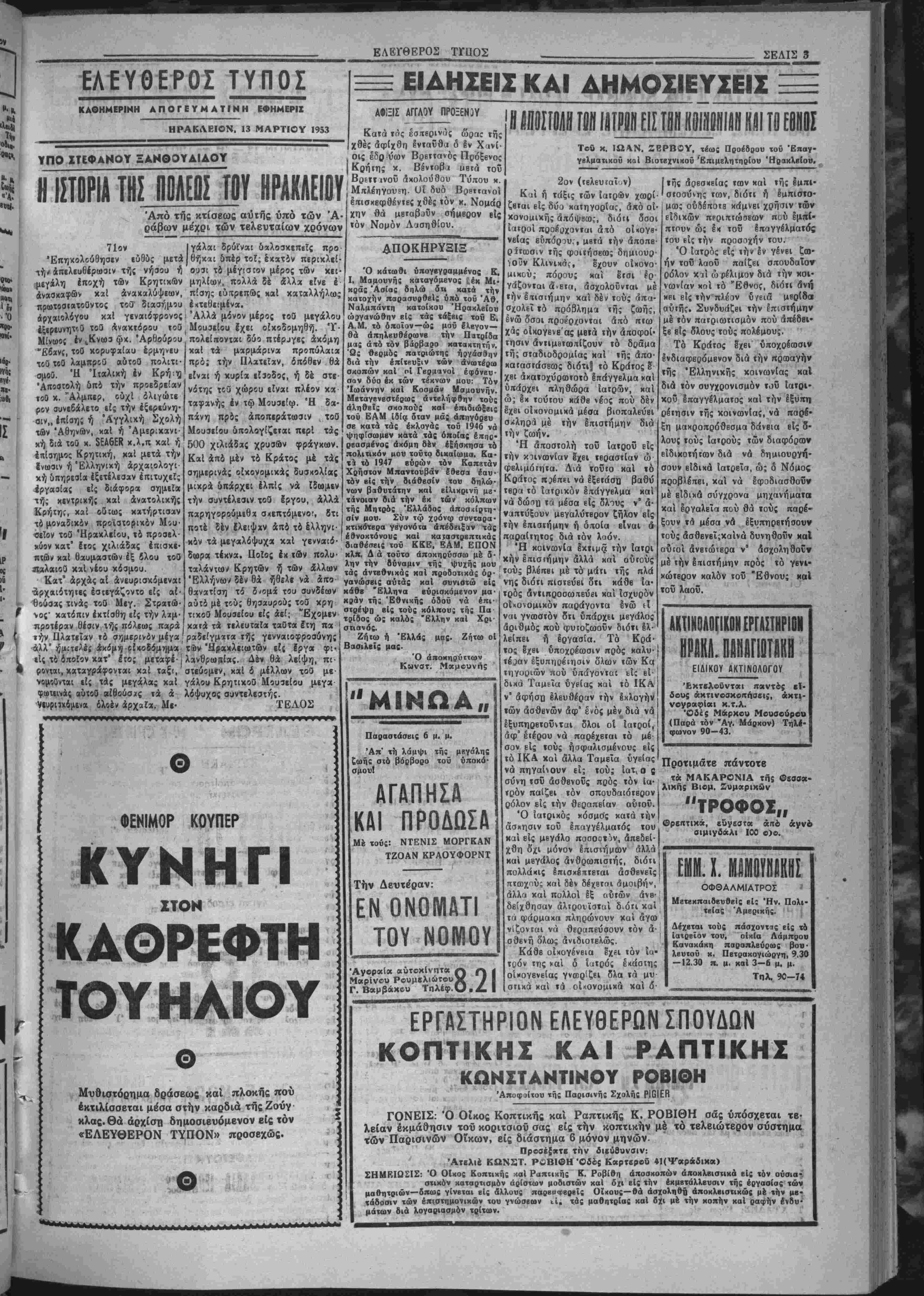 λήλως.θά Ινβργηθυ διά των άνα< διοργανουμένοον Γραφβίοαν Εύρε σεως Εργασίας καί άπογραφή τής άνβργίας, ούτως ώστβ Ιπί τή βάσει άκριβών στοιχβίων τό υ¬ πουργείον Εργασίας να ηροβη είς την Ινδεδβιγμένην οργάνωσιν τής άπασχολήσεως τοΰ Ιργατικοΰ δυναμικοϋ τής χώρας. ΟΙ ΧΑΙΡΕΤΙΣΜΟΙ — Σημϊρον ό Σββ. Μητροπο· λίτης Κρήιης κ. Εύγένιος θά αναγνώση, ιήν.Δ' στάσιν των Χαιρβτισμδν τής θβοτόκου Ιν τφ ΙΈρφ Ναώ τής Άγίας Τριά- δος κατά την πρώτην ακολουθίαν 5 μ.μ. —Οί χαιρβΐισμοΐ τής Θβοτό· κου είς τόν ίβρόν Ναόν τοϋ Ά- γίου ΔημητρΙου θά άναγνωσθώ- σι υπό τοΰ Πανασιολ. Άρχιμαν- δρίτου τής Ίβρά; Μητροηόλεω; κ. ΔημητρΙου δστις θά χηρύξχι χαί τόν θβϊον λόγον. ΟΙΝΟΠΝΕΥΜΑΤΟΠΟΙΗΣΙΙ ΤΩΝ ΧΑΡΟΥΠΙΩΝ Ελάβομεν χθές τό κατωτίρωί τηλεγράφημα τοθ τέως δπουργοθ καί βουλευτοθ Λασηθίου χ. Έ. Κοθρή σχετικώς μέ την οίνο- πνευματοποίησιν των χβρουπίων: Εφημερίδα «'Ελεύθιροί Τύιχο(» "Ηράκλειον «Σημιρινή σύσκιψις μετά ί»· πουργοθ Έμπορίου διετύπωσα- μέν αίτήματα διατηρηθή ίαχύου- σα τιμή οίνοπνιυματοποιήοιιος χαρουπίων. Οίνοπνευματοποιη^ ποσότης 8 χιλιάδων τόννων ά«4 έργοστάσια 'ϋλλάδος. "Αρχίσΐϊ οίνοπνευματοποίησις 15 Μαρτί¬ ου. Ματαιωθη" απόφασις άναθί- σιως έμποροσυγκεντρώσεως χα- ρουπίων είς ΑΣΣΟ. 'Υηουργδς ϊκρινε αίτήματα λογικά δπεσχέ· θη φροντίση αποδοχήν παρά χυ· βερνήσεως. "Υπεσχέθη ένίσχυοι» πιστοδοτήσεως έπαρχιακοθ Ιμπο· ρίου παρά Τραπεζών. ΚθβΡΗΣ». ΤΟ ΒΑΛΚΑΝΙΚΟΝ ΘΑ ΥΠΟΒΛΗΘΗ ΠΡΟΣ ΚΥΡΟΣΙΝ ΑΘΗΝΑΙ 13.—Ό ύπουργός των "Εξωτερικών κ. Στεφανό- πουλος ήρχισε την σύνταξιν τής είσηγητικής εκθέσεως έηί τοΰ νομοσχβδίου πβρί χυρώσεως τρι- μβροϋς συνθήκης μβταξύ Ελλά¬ δος, Τουρκίας καί Νοτιοσλαβίας^ Τό νομοσχέδιον θά ΰποβληθχί την προσέχη έβδομάδα είς ιήν- Βουλήν.